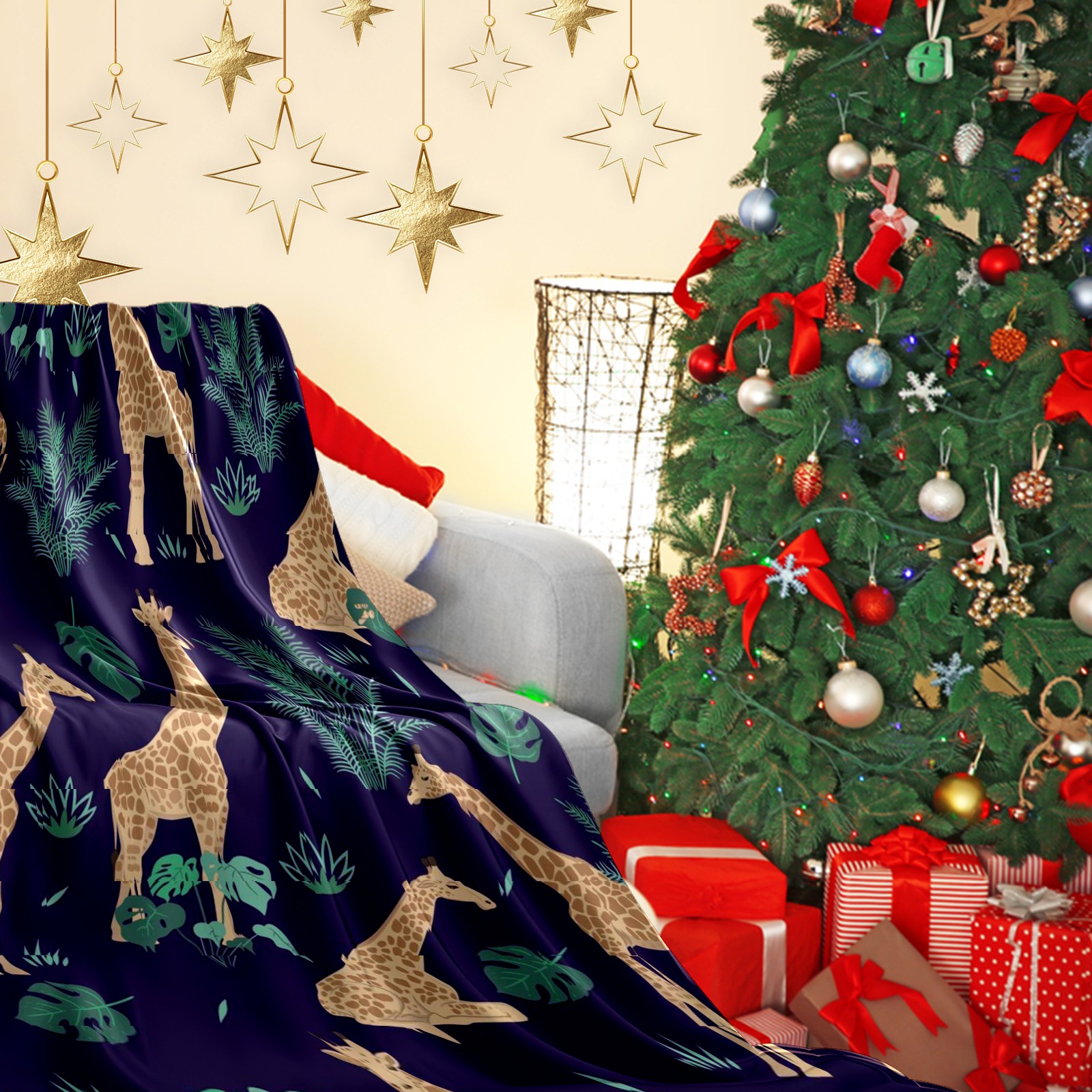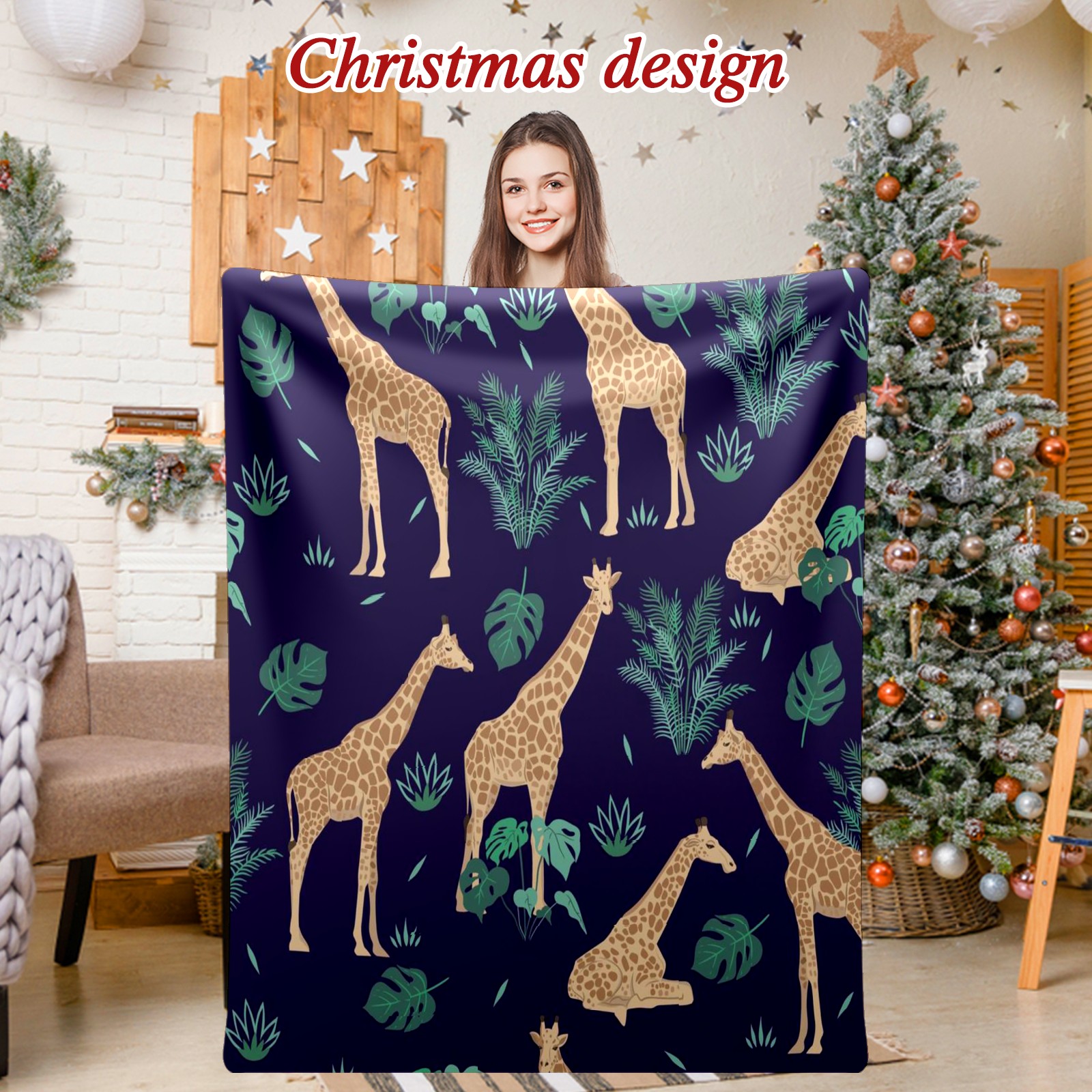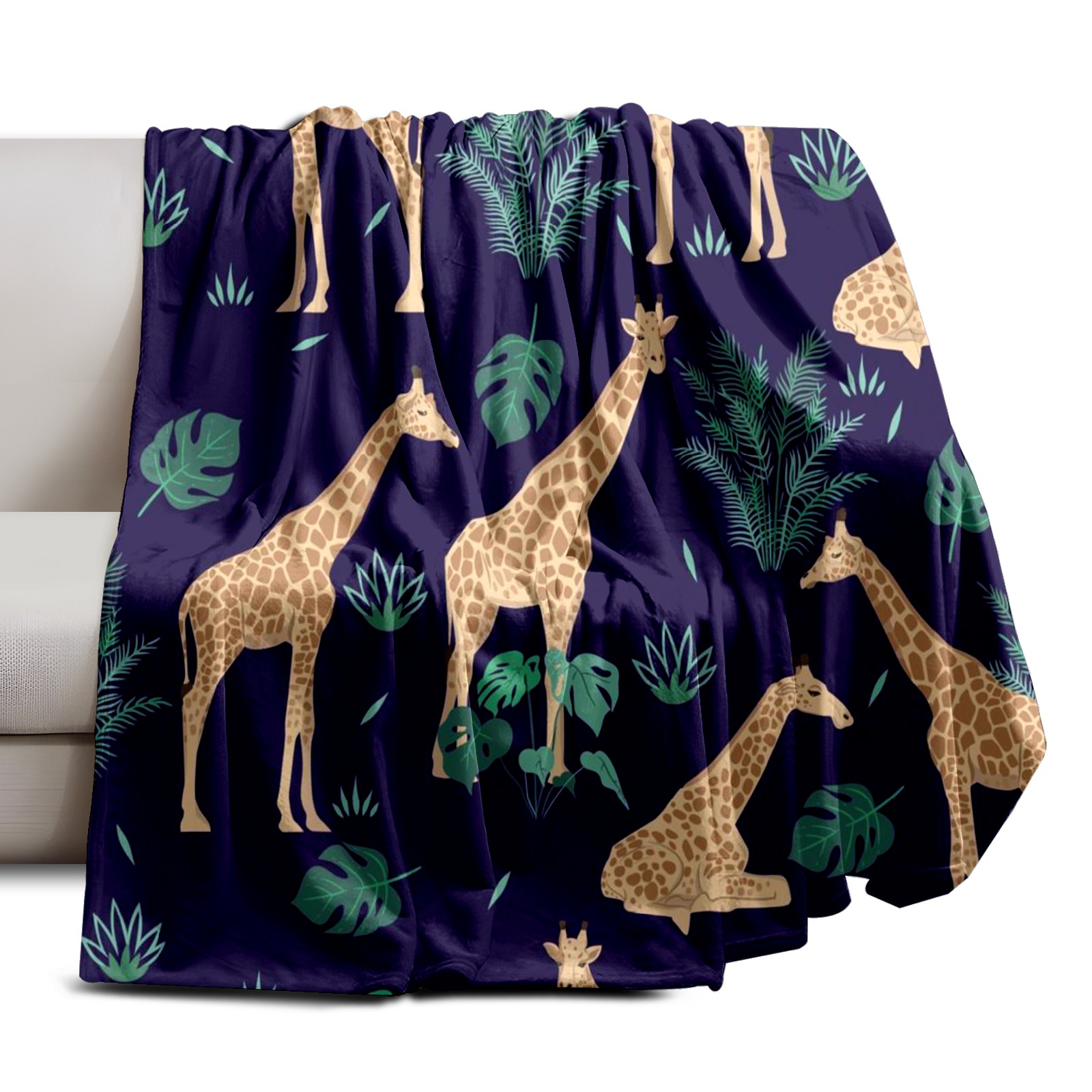 Премиальная фланелевая одеяло Khaki Giraffes Tropical Leaves