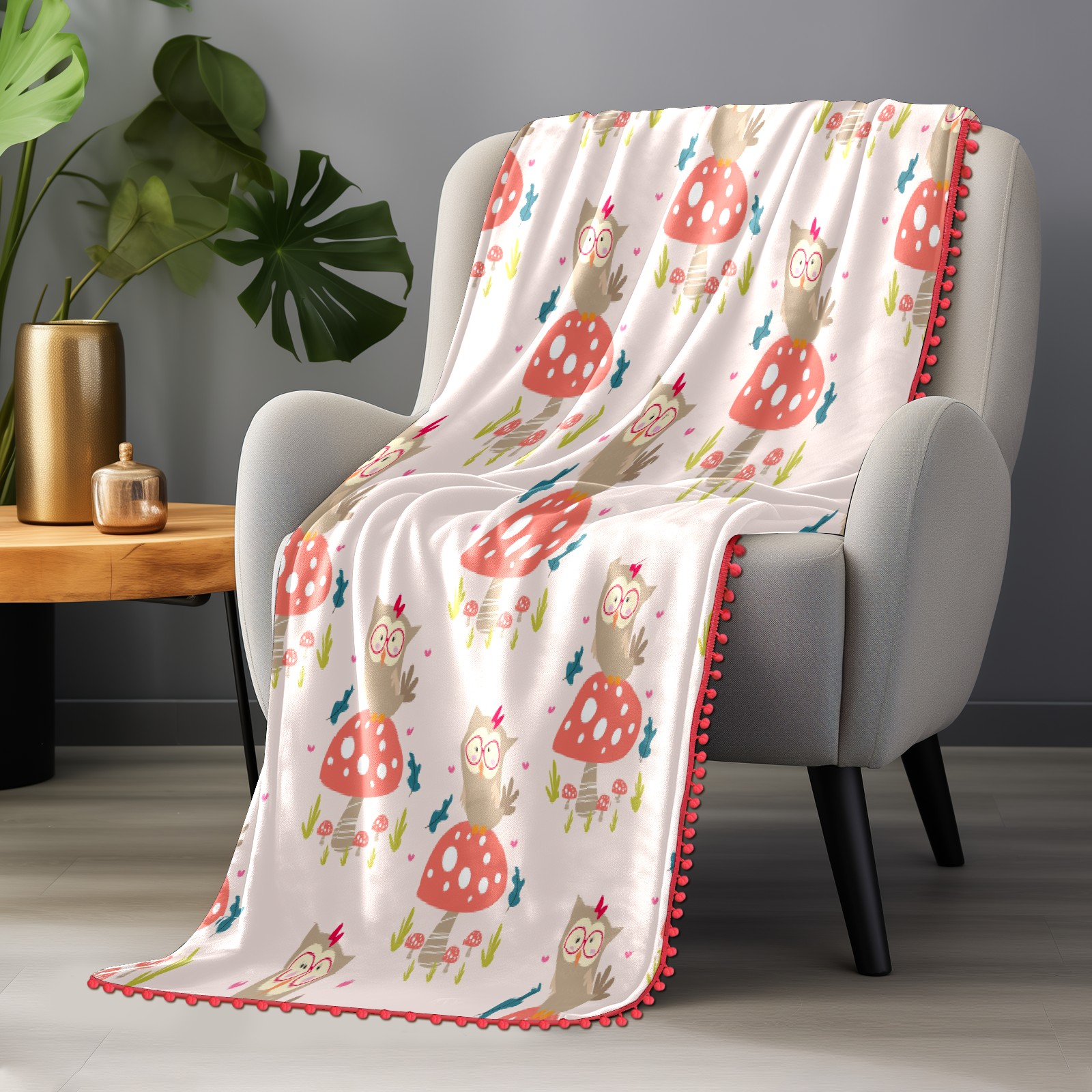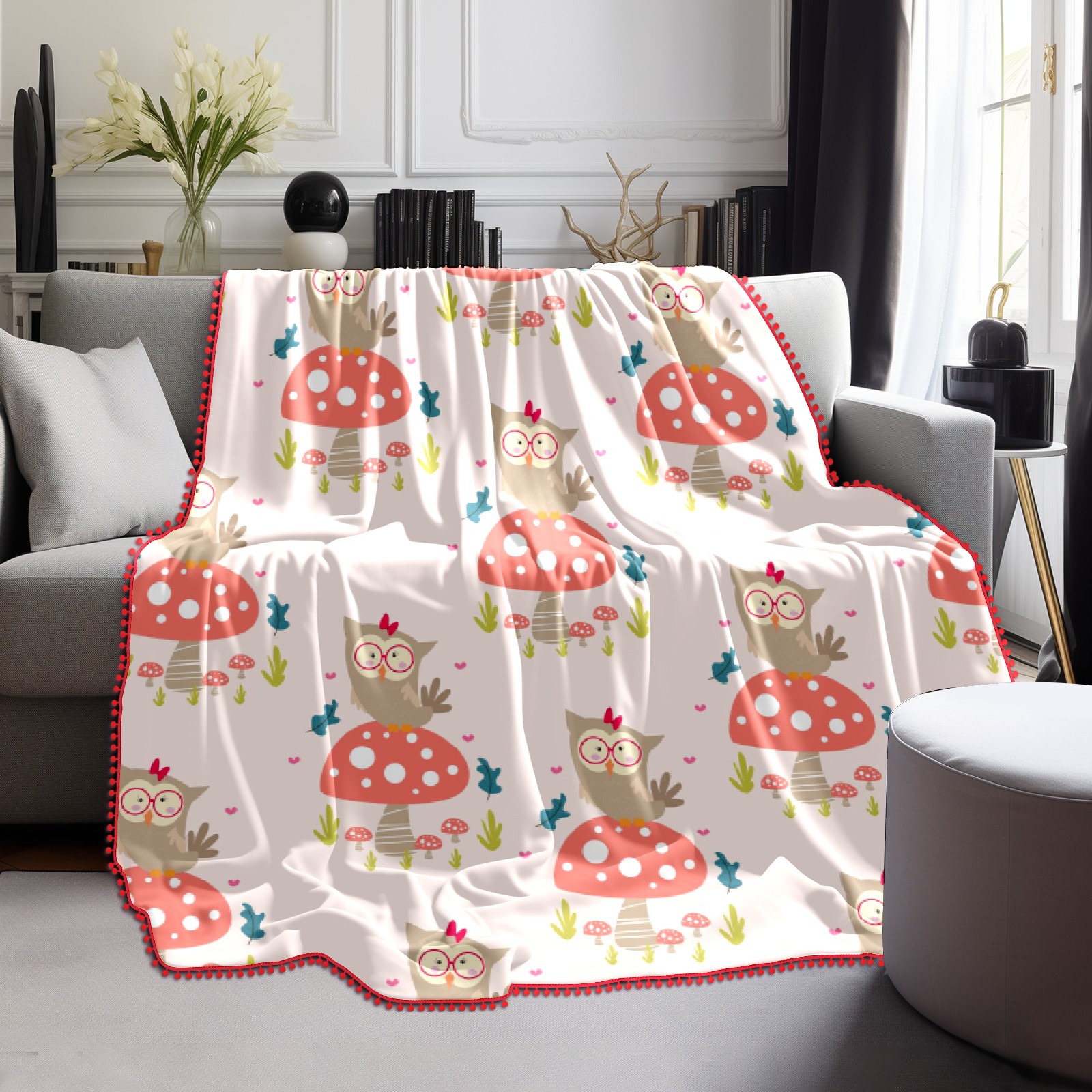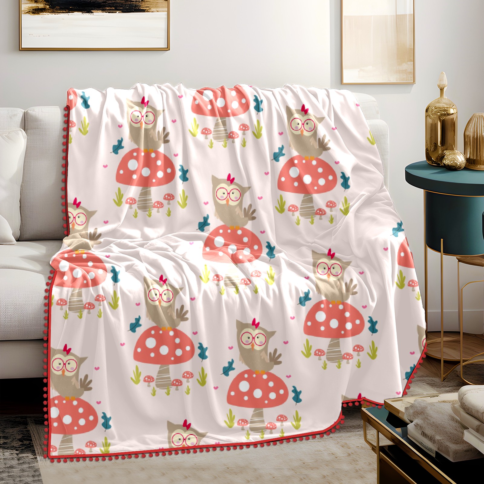 流苏毛毯 Cute Animal Cartoons Owl Mushroom