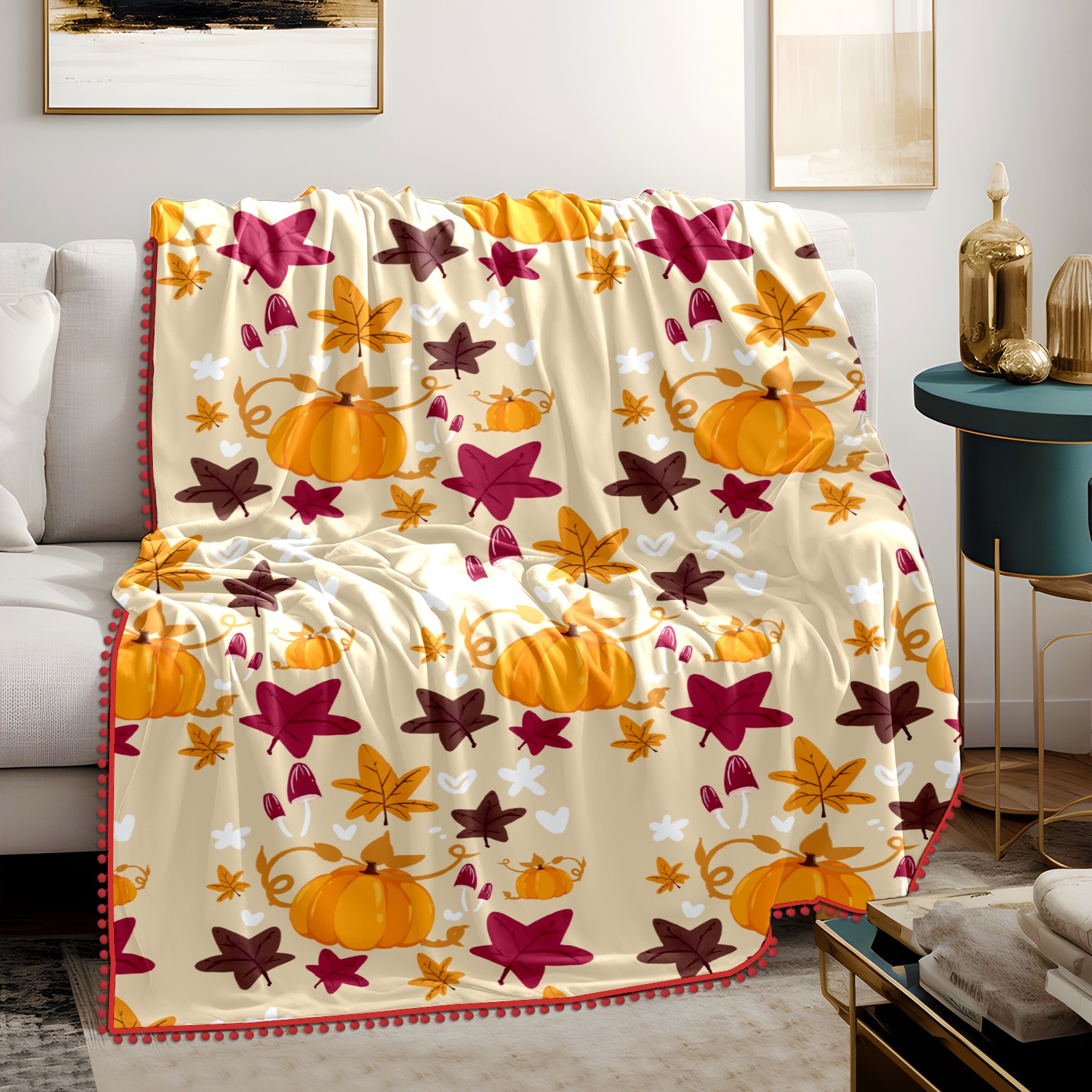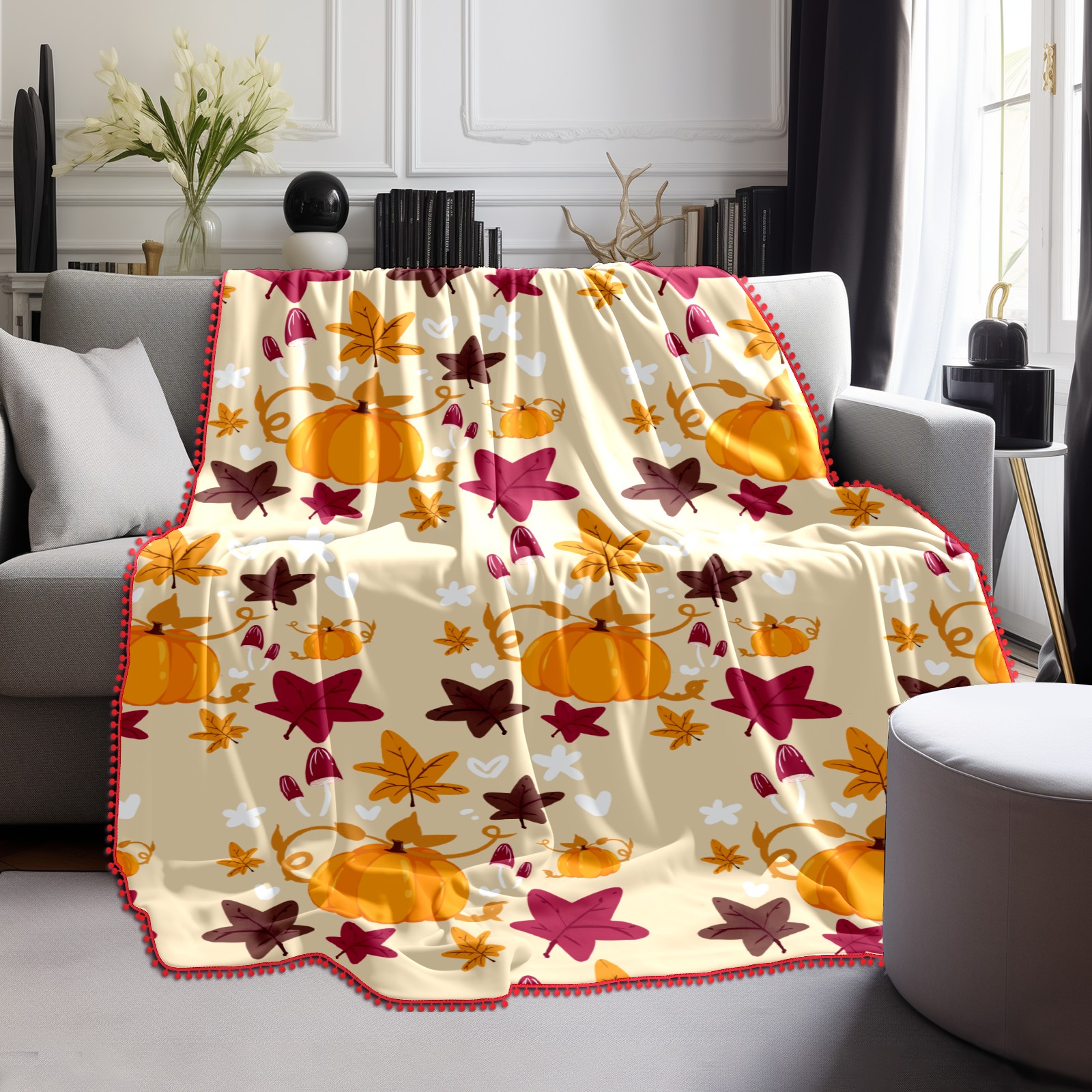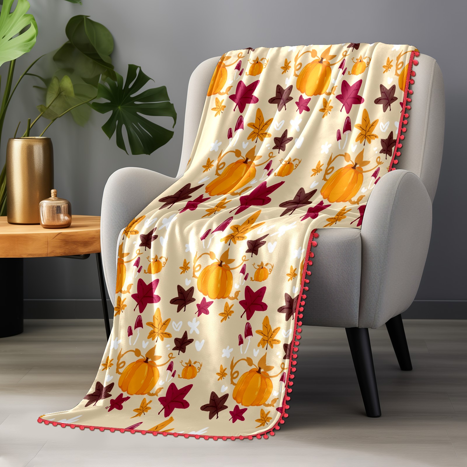 流苏毛毯 Cute Cartoon Pumpkin Mushroom Leaves