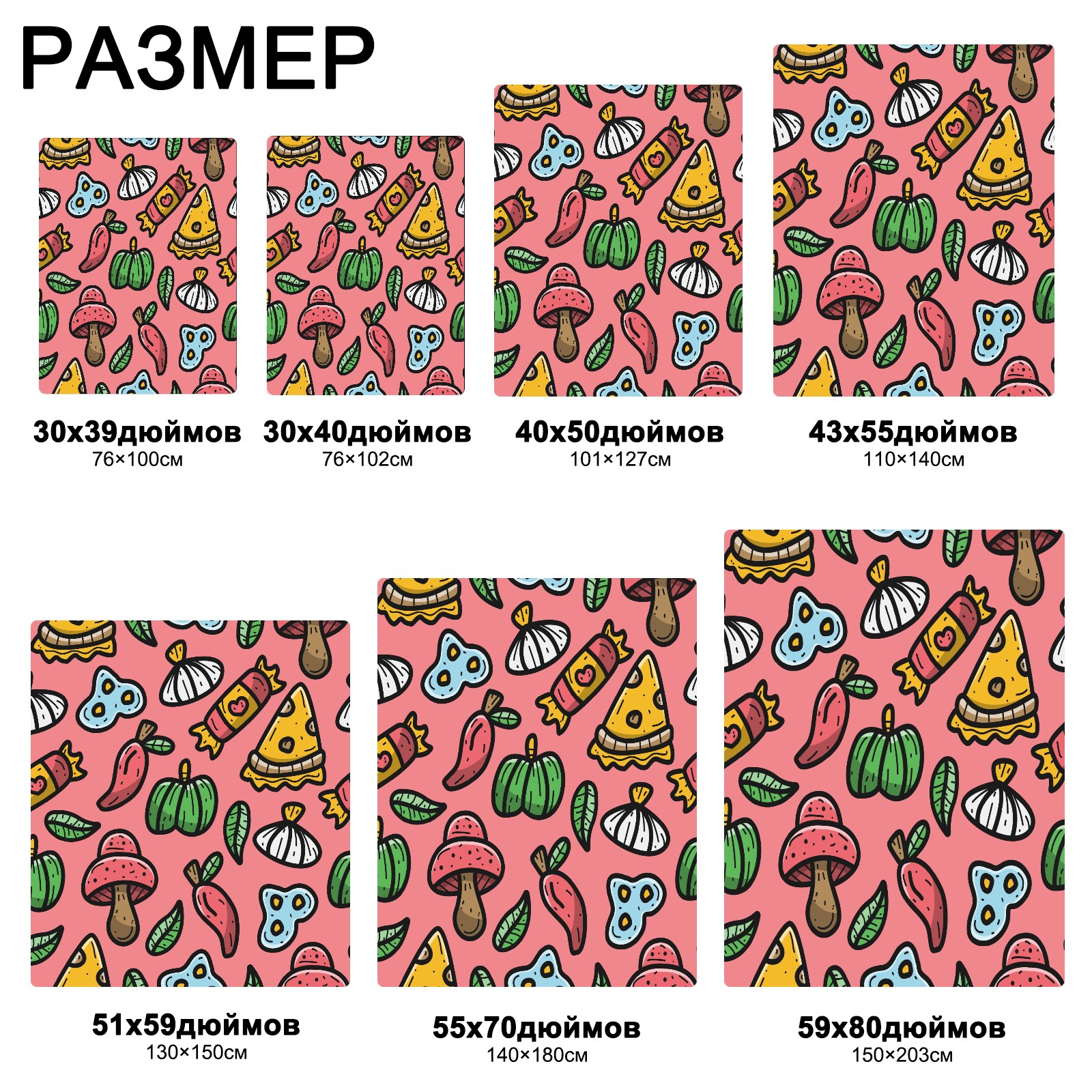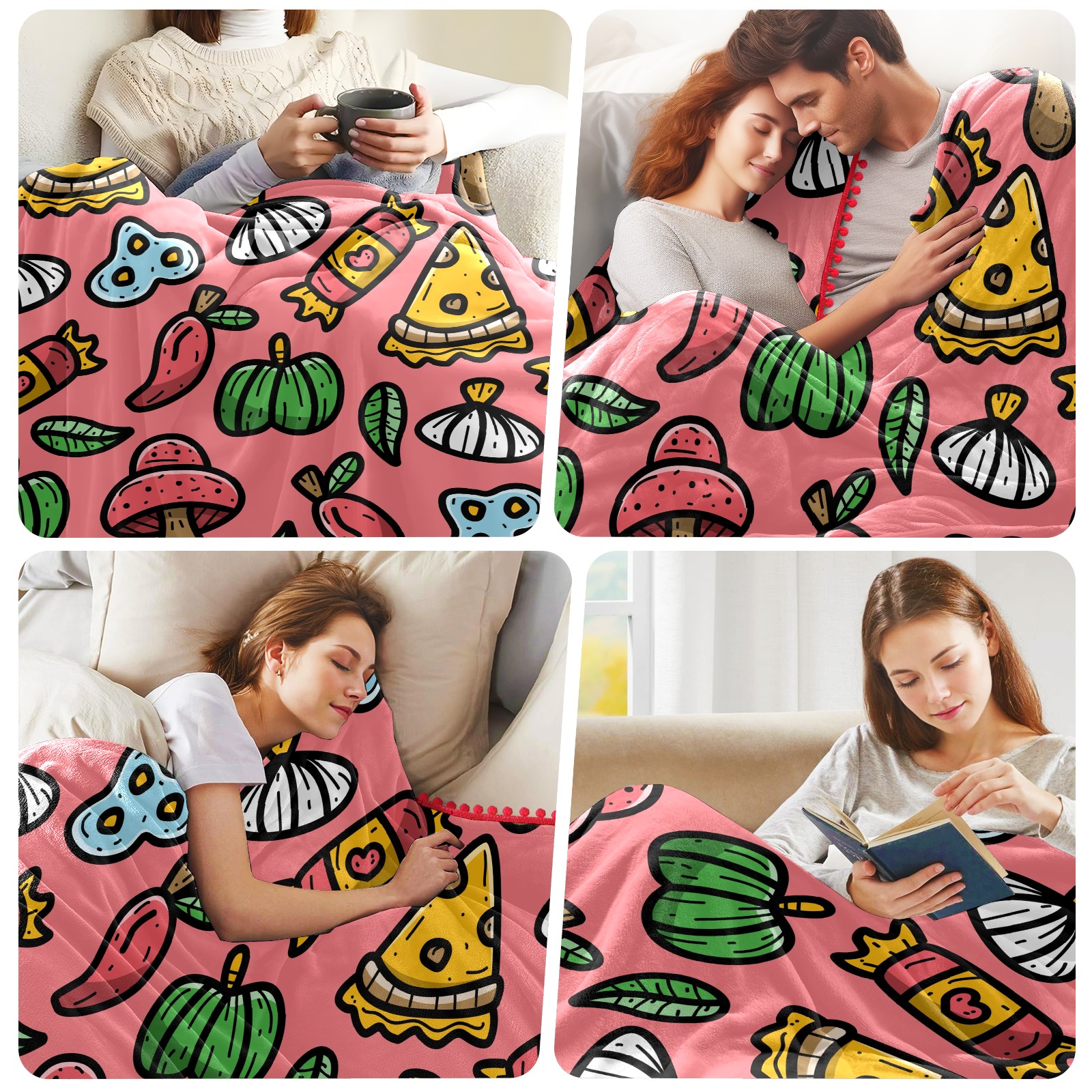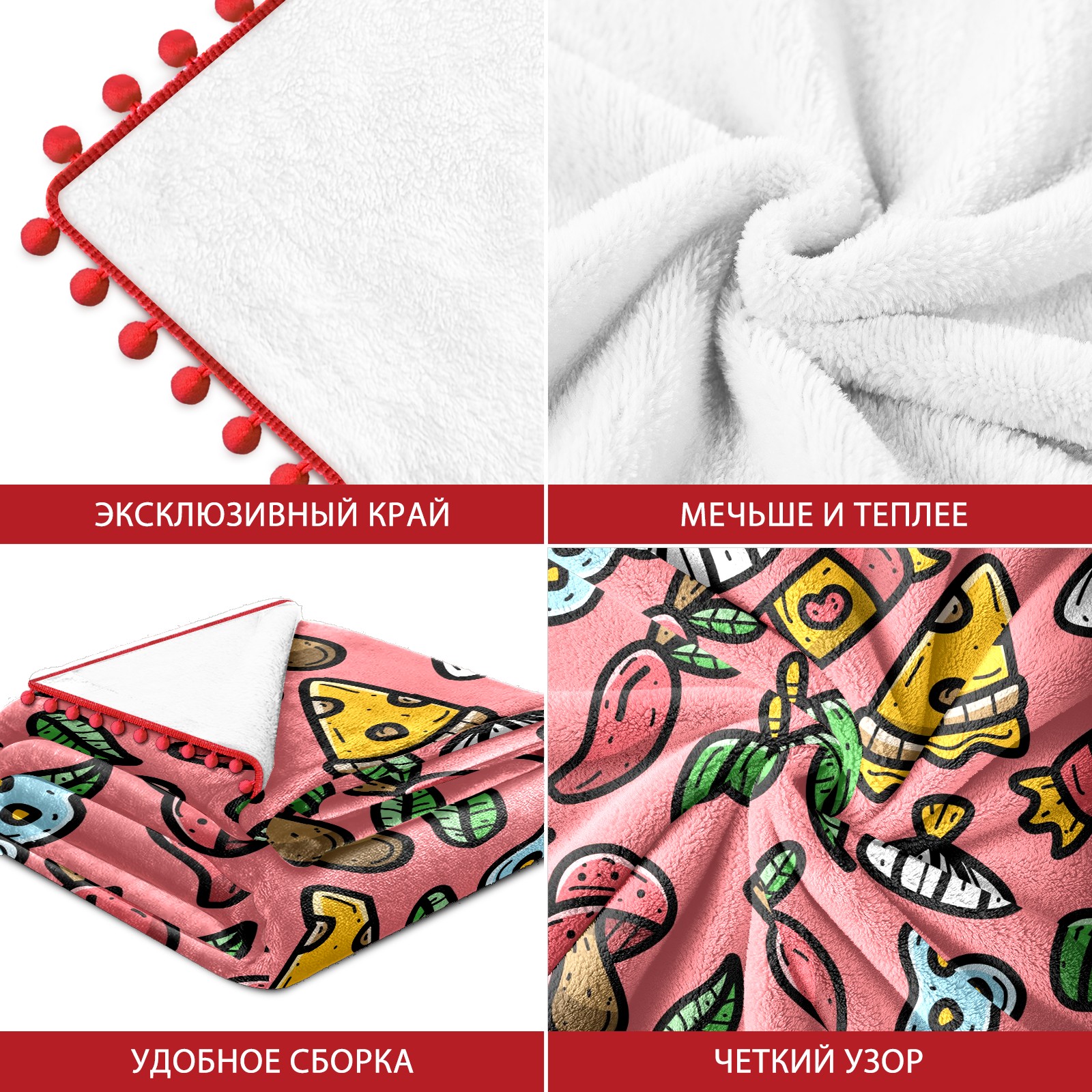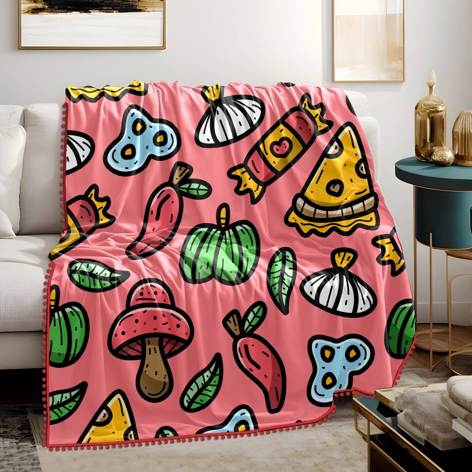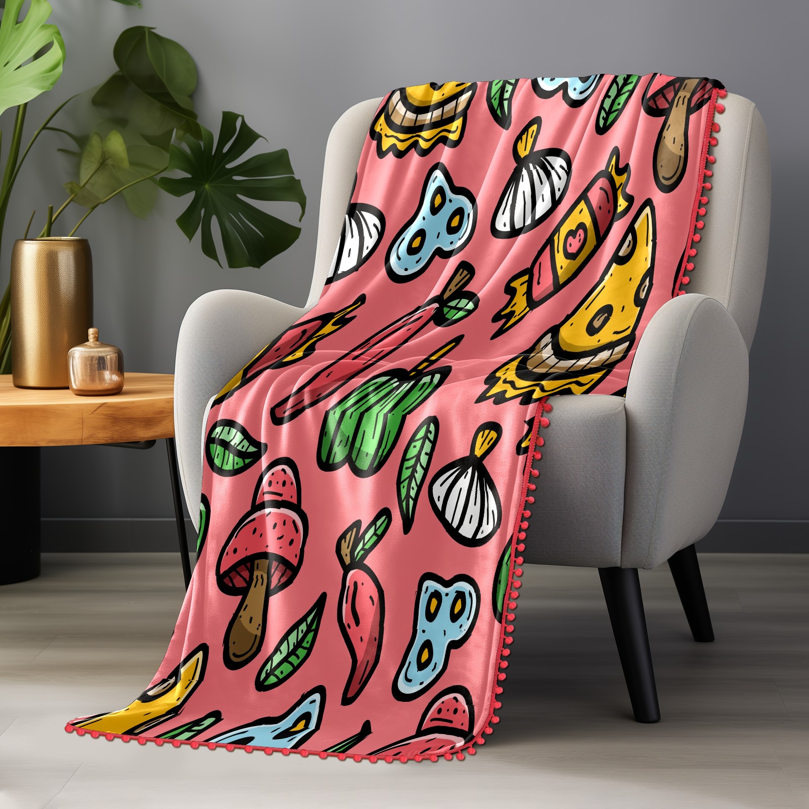 流苏毛毯 Red Cute Doodle Cartoon Pizza - Food Mushroom Vegetables
