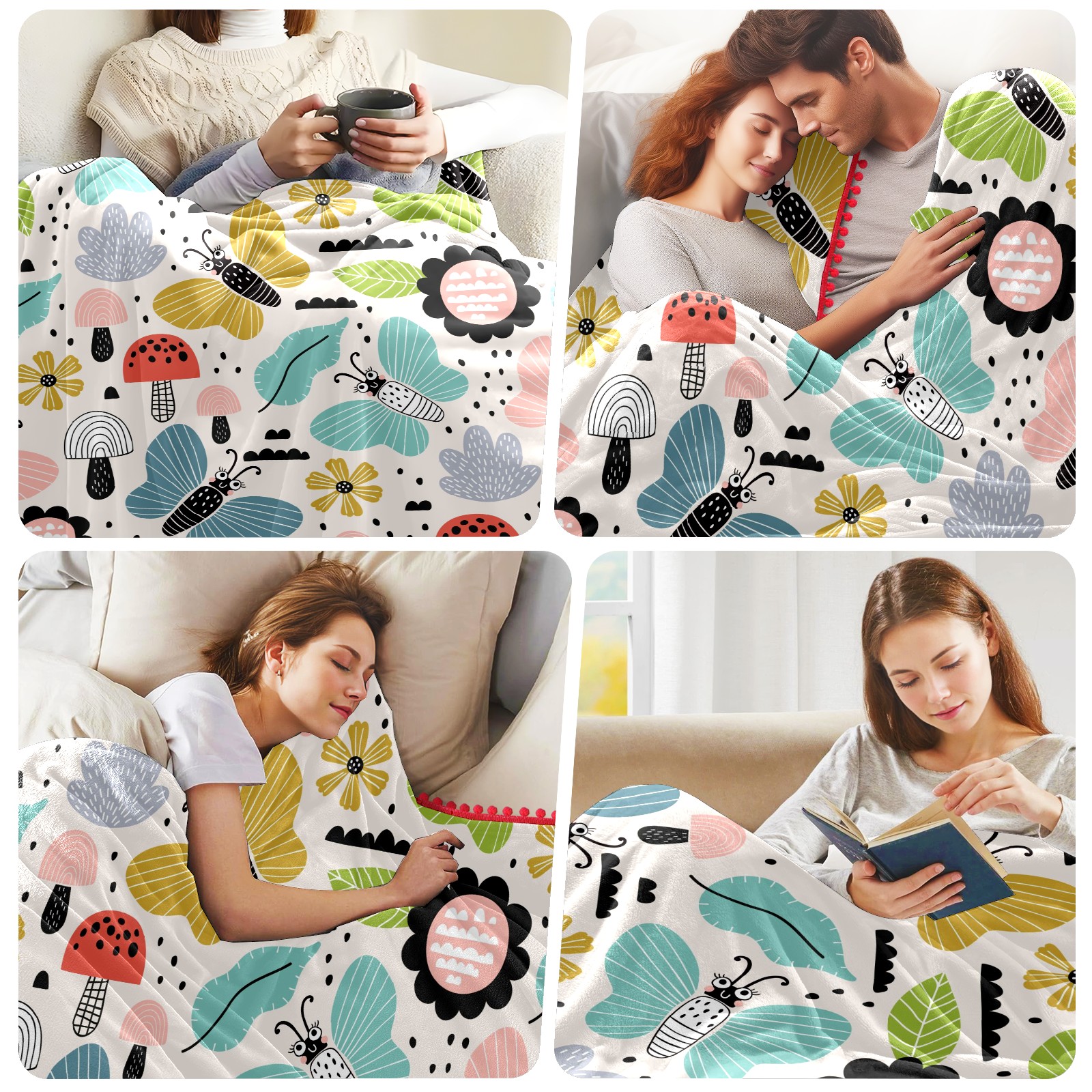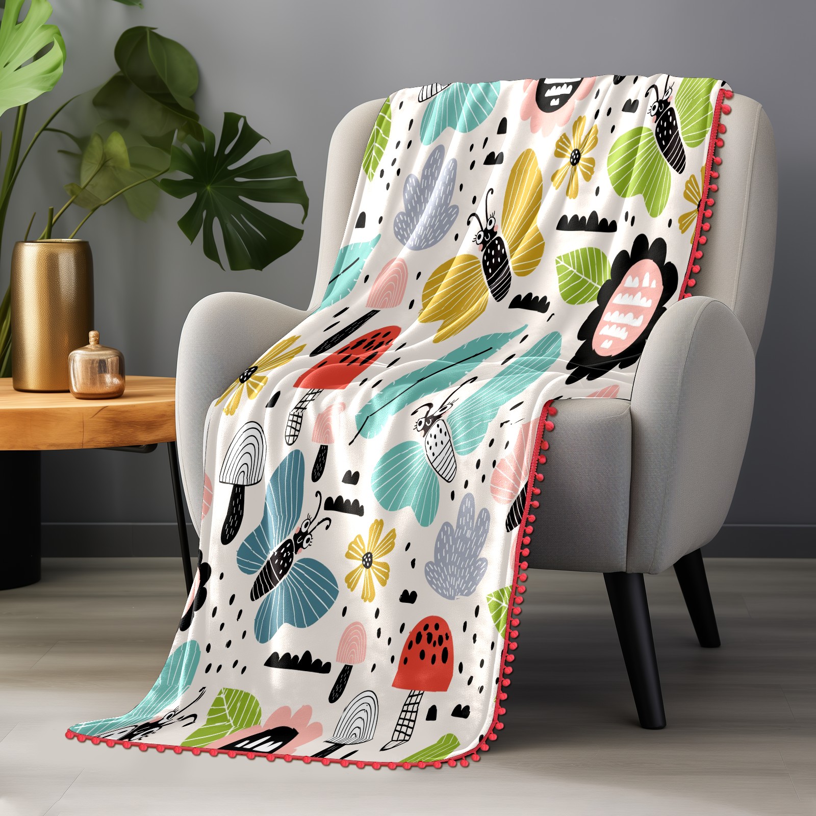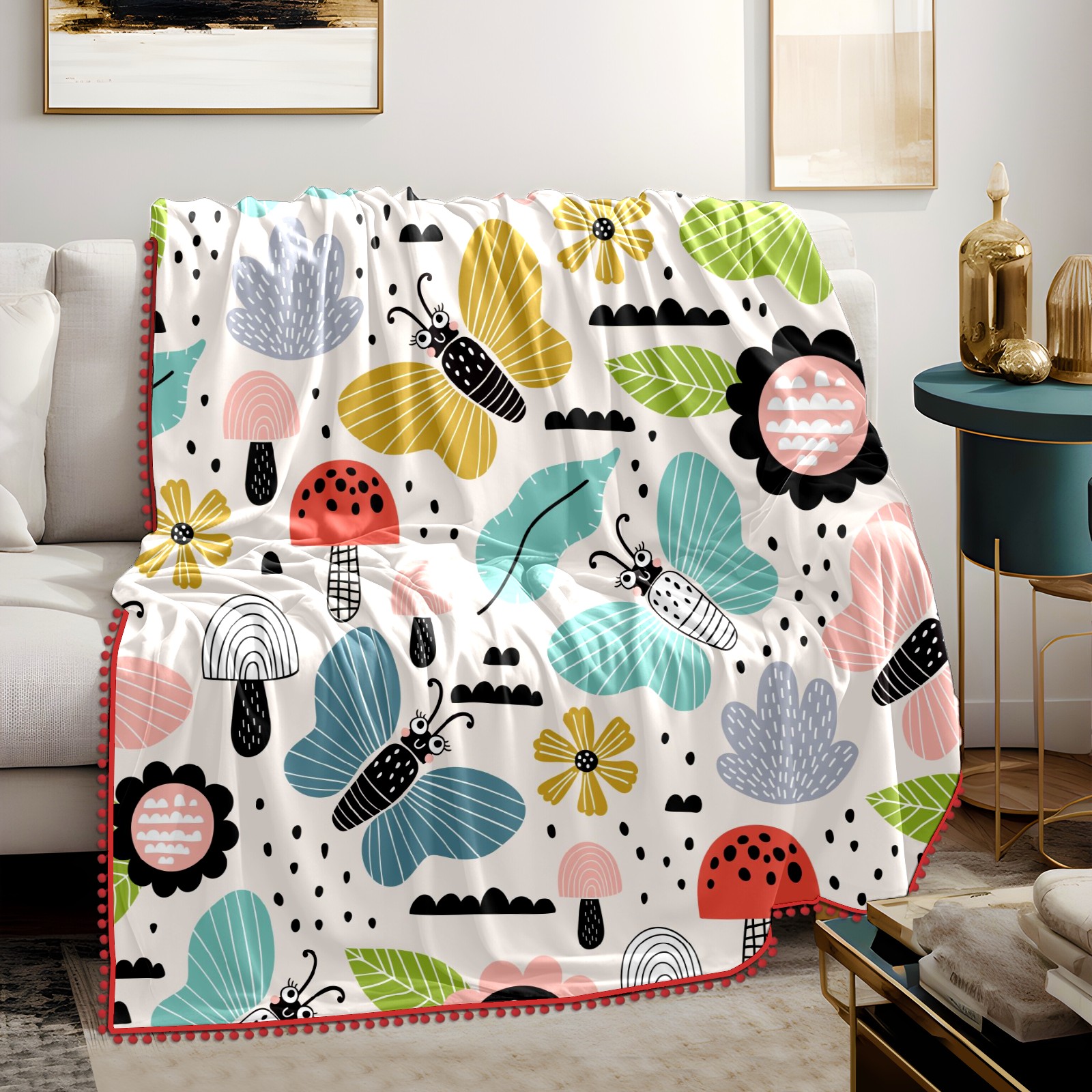 流苏毛毯 Butterfly Flowers Mushroom - Hand Drawn Colorful