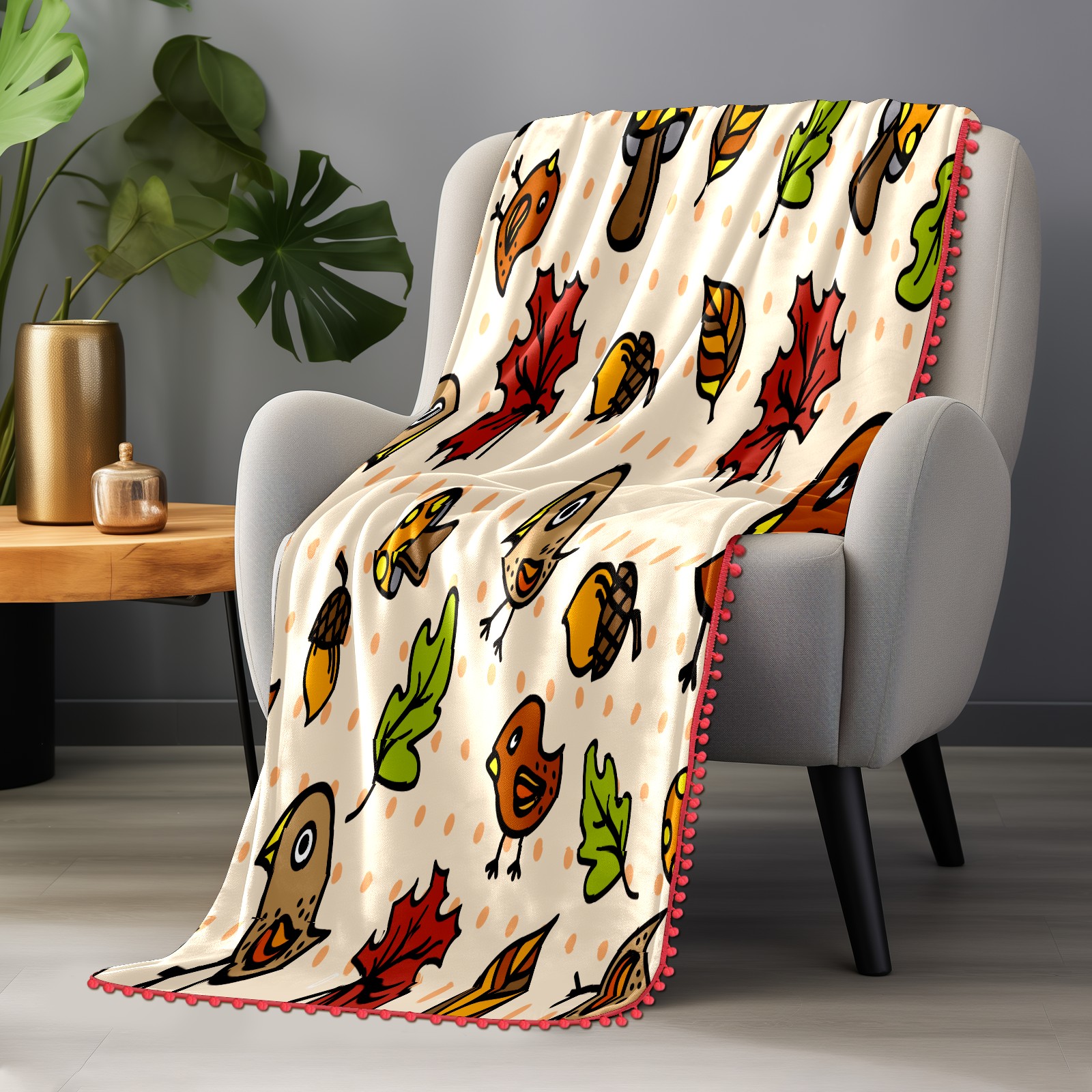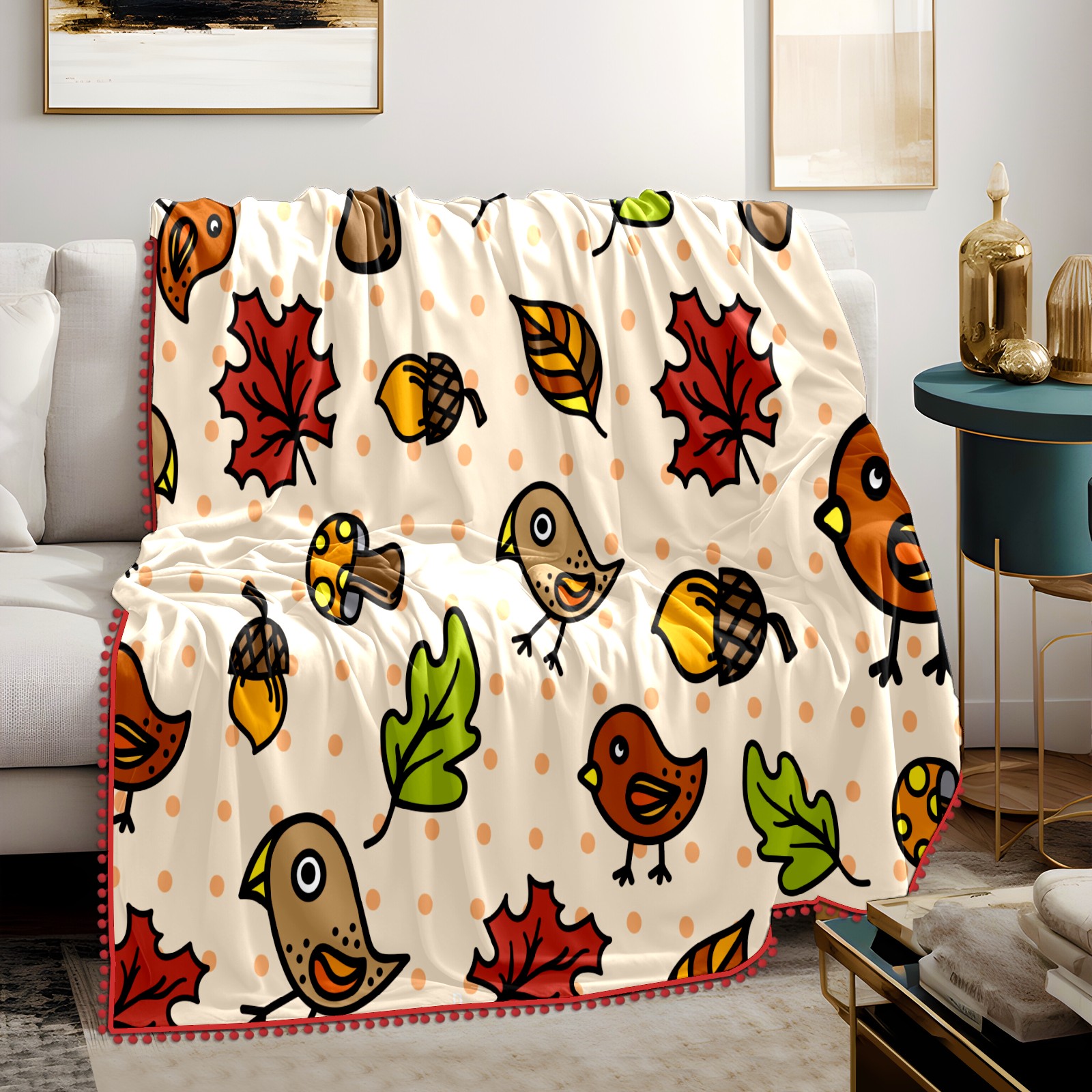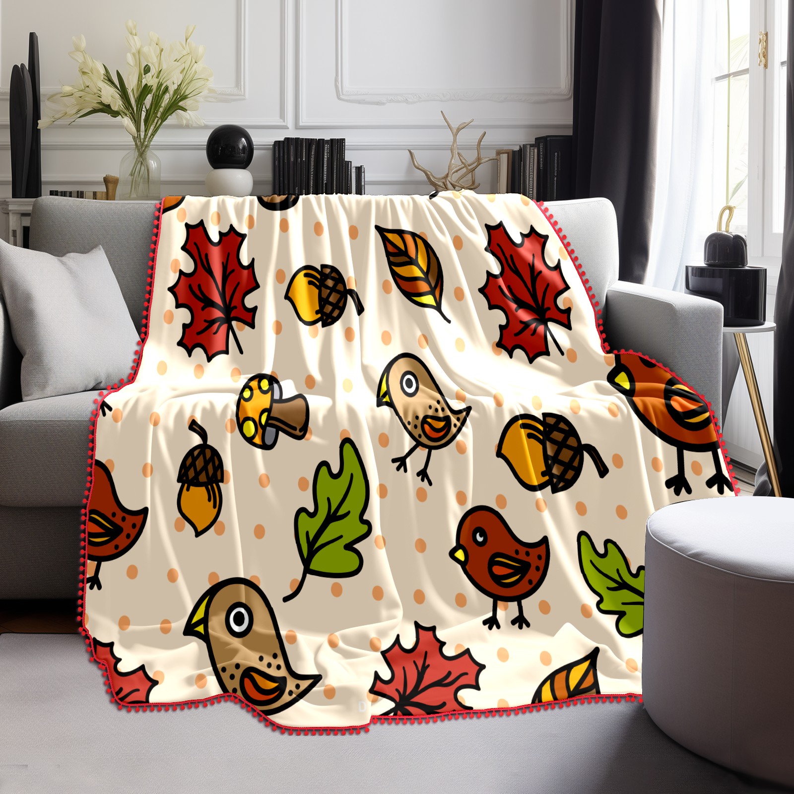流苏毛毯 Autumnal Cute Birds Mushrooms