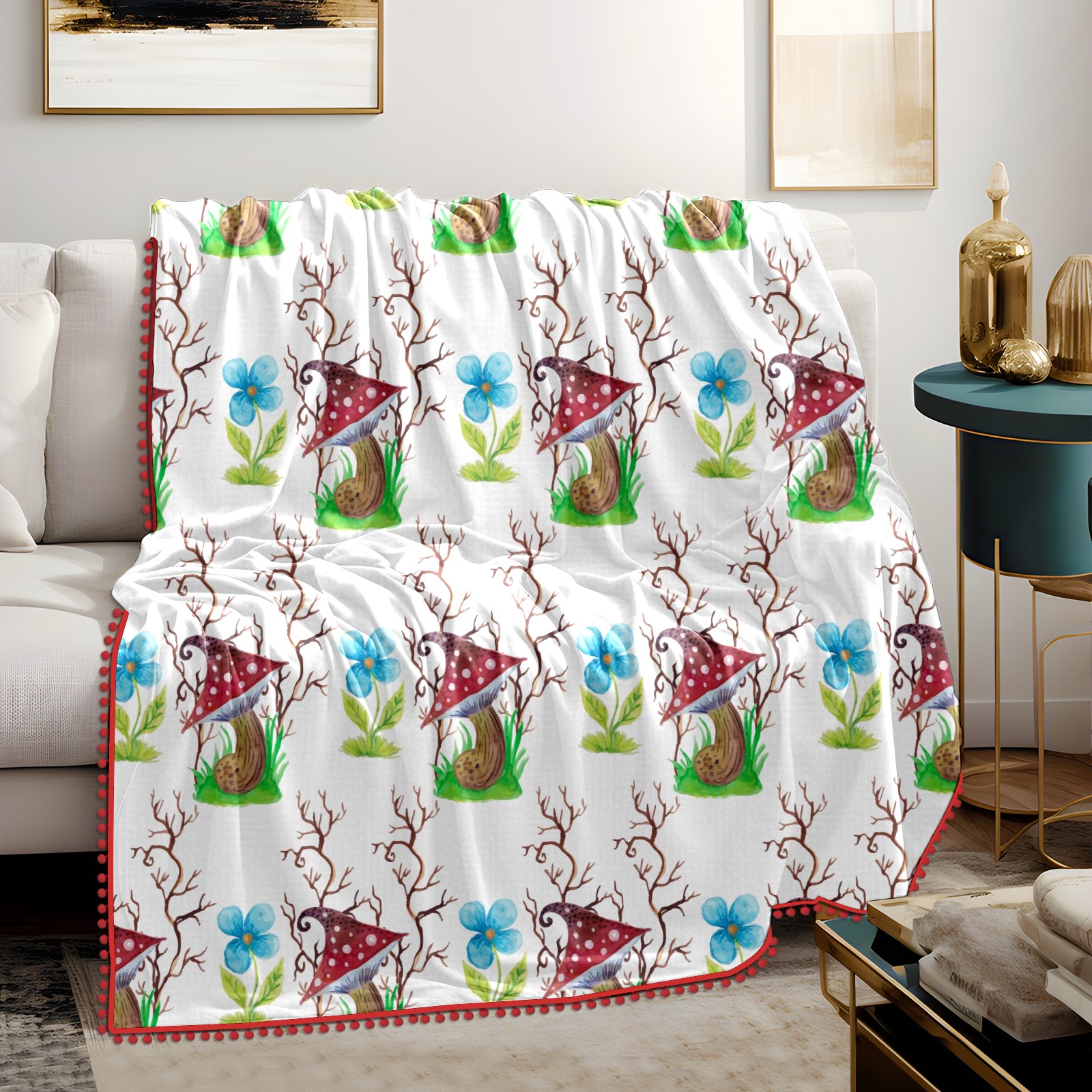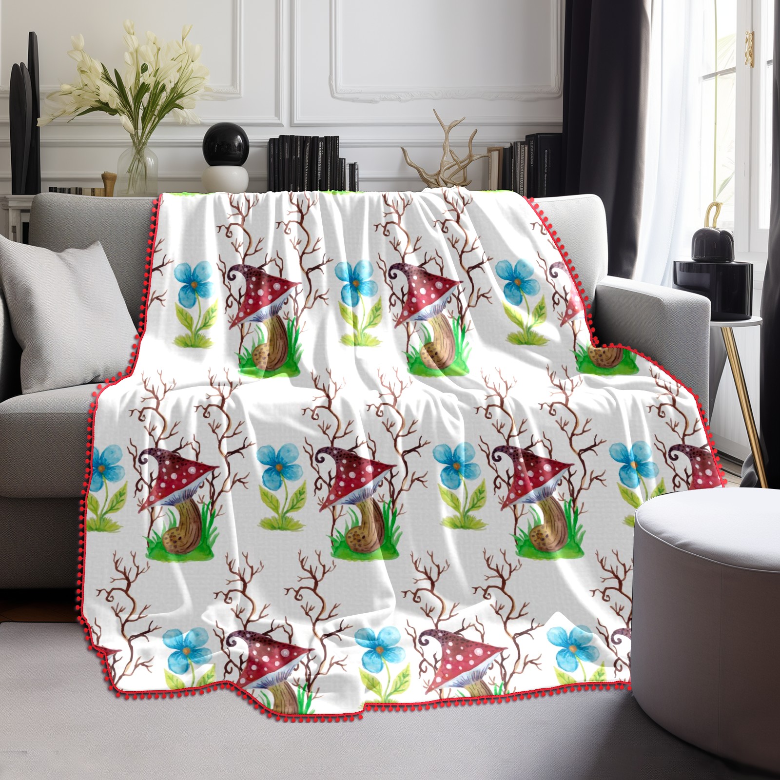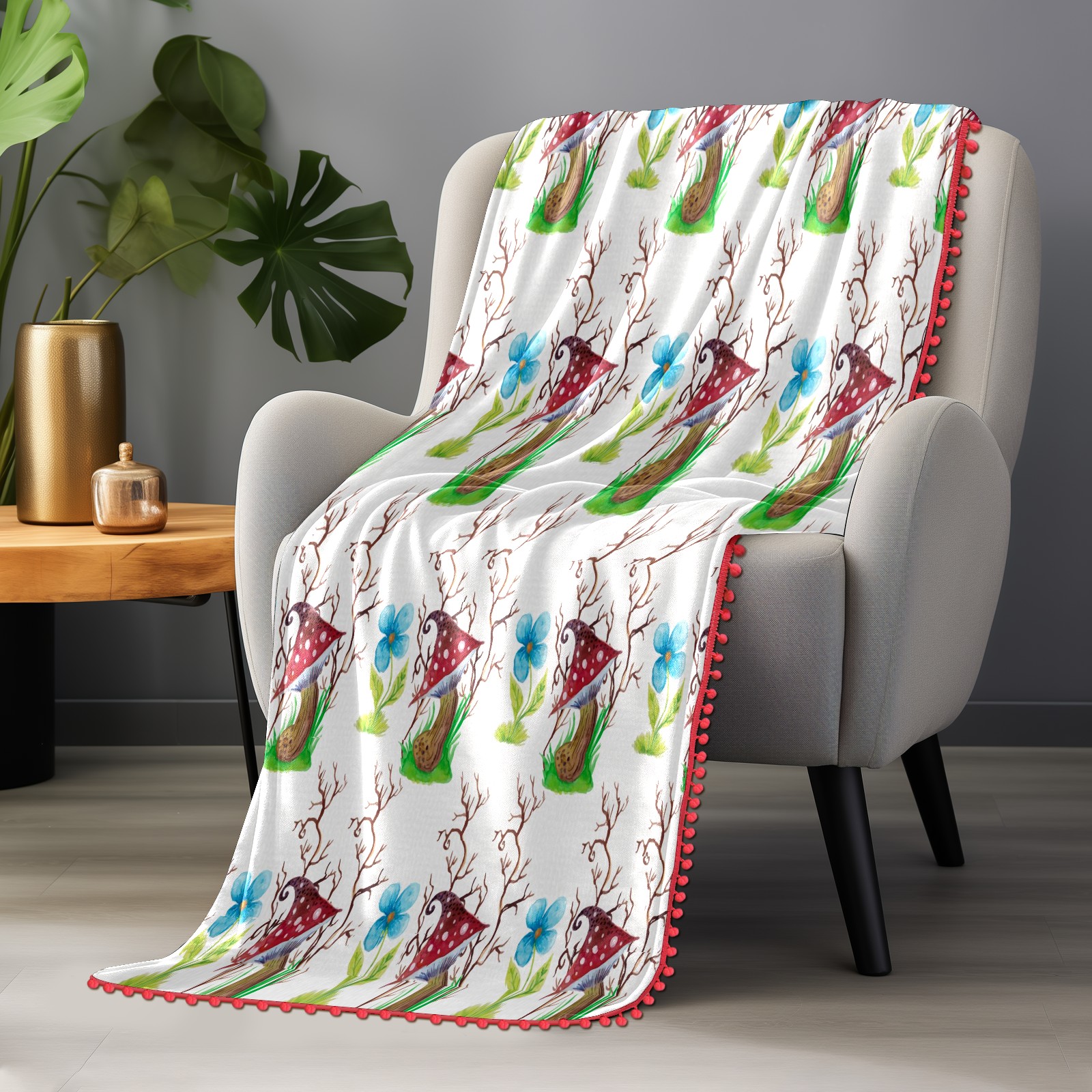 流苏毛毯 Mushrooms Watercolor Flowers