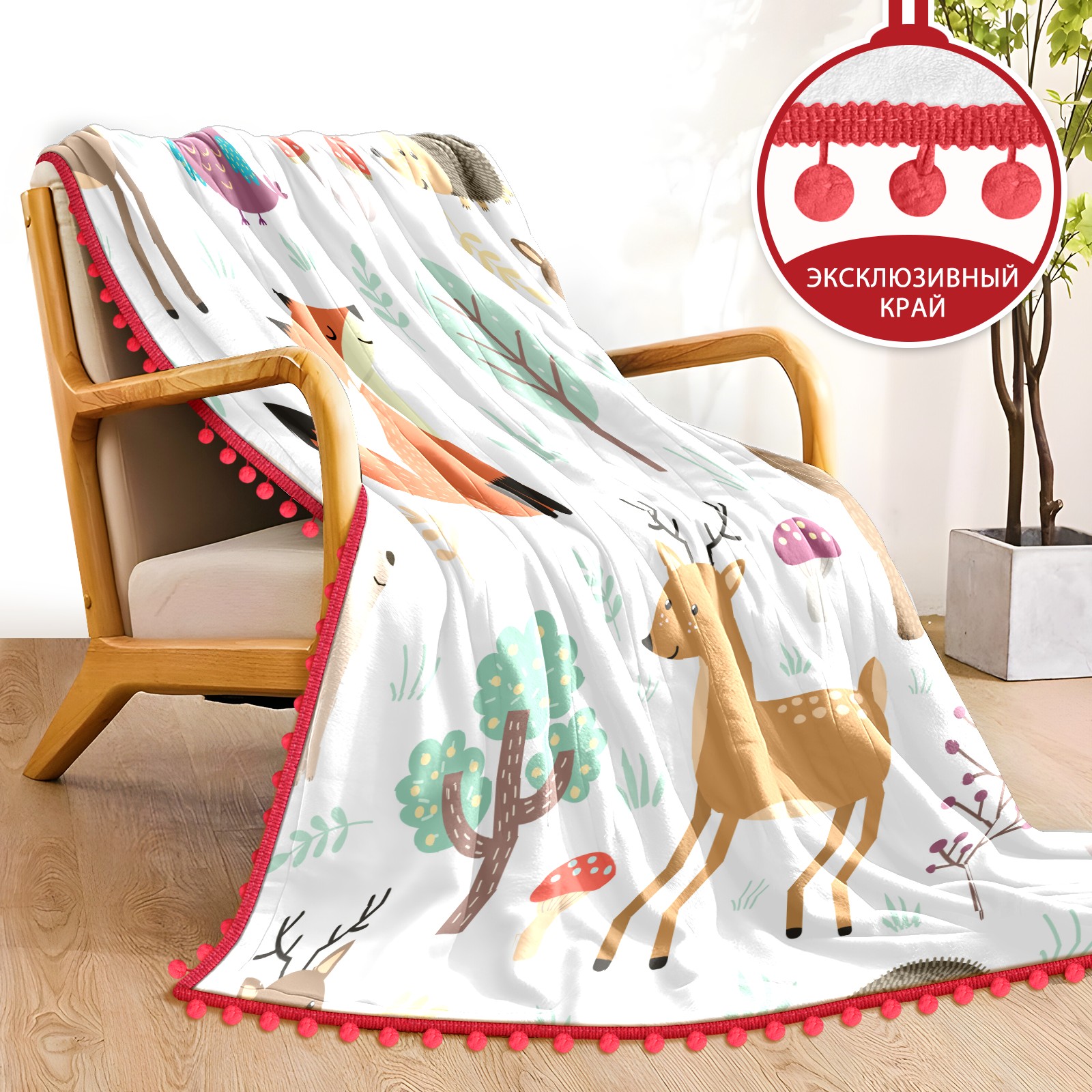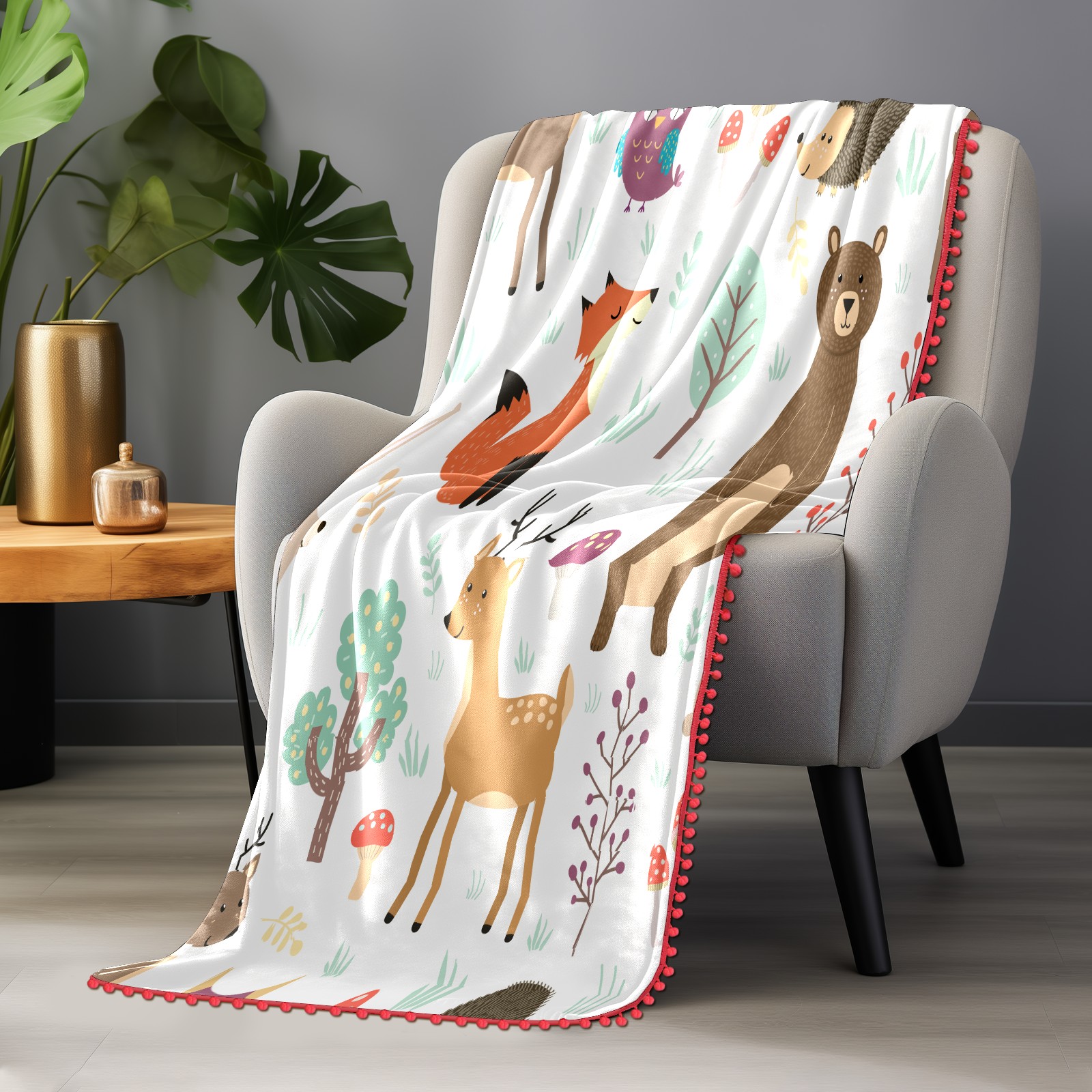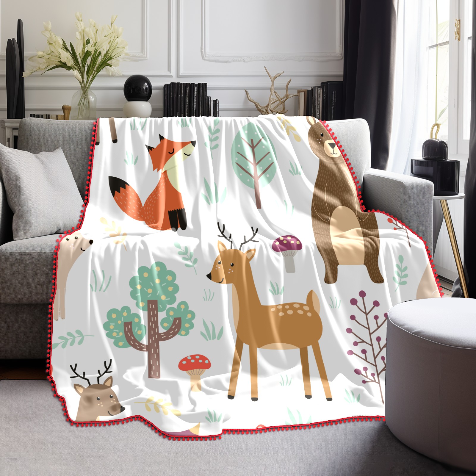 流苏毛毯 Forest Animal Fox Deer Rabbit Hedgehog Owl Mushroom