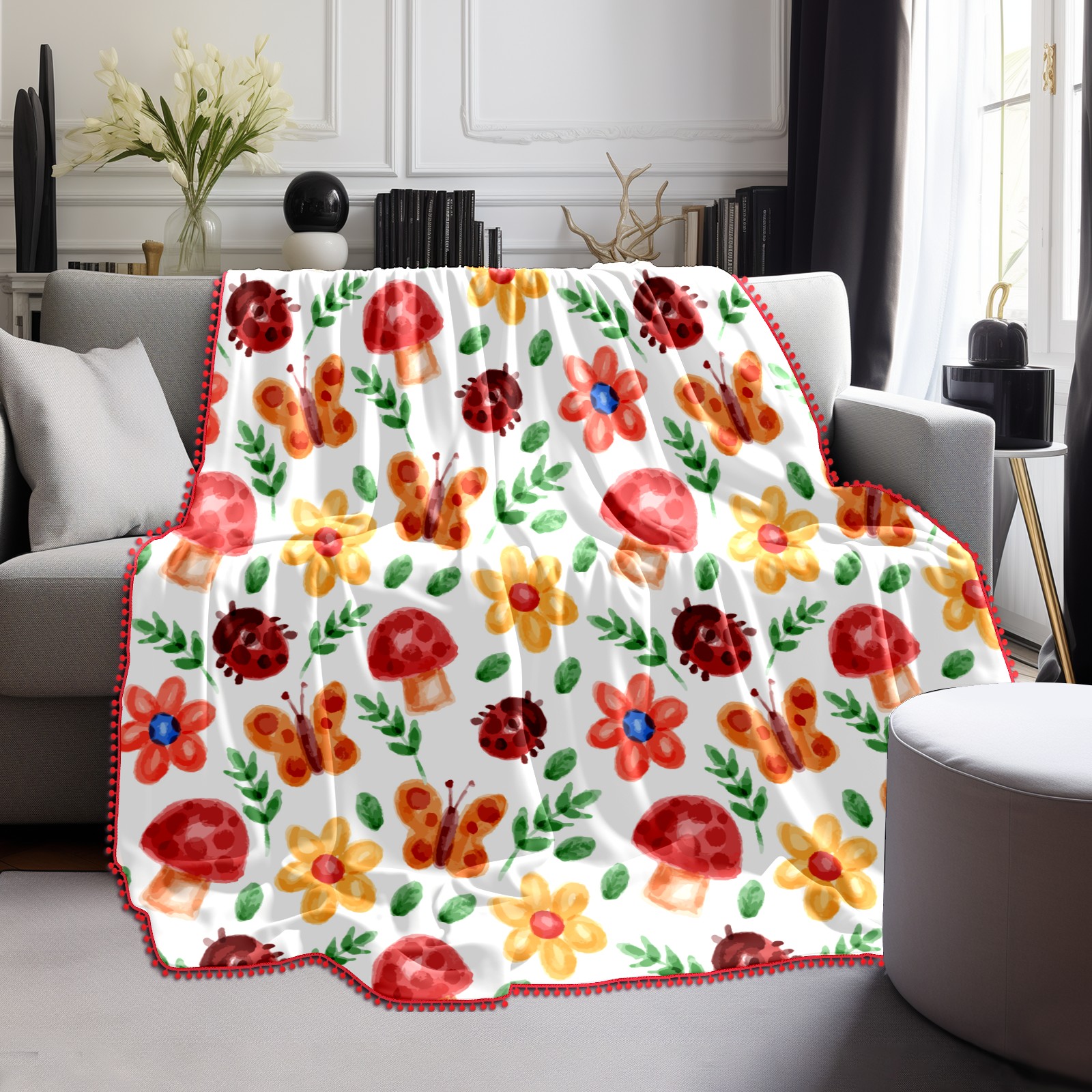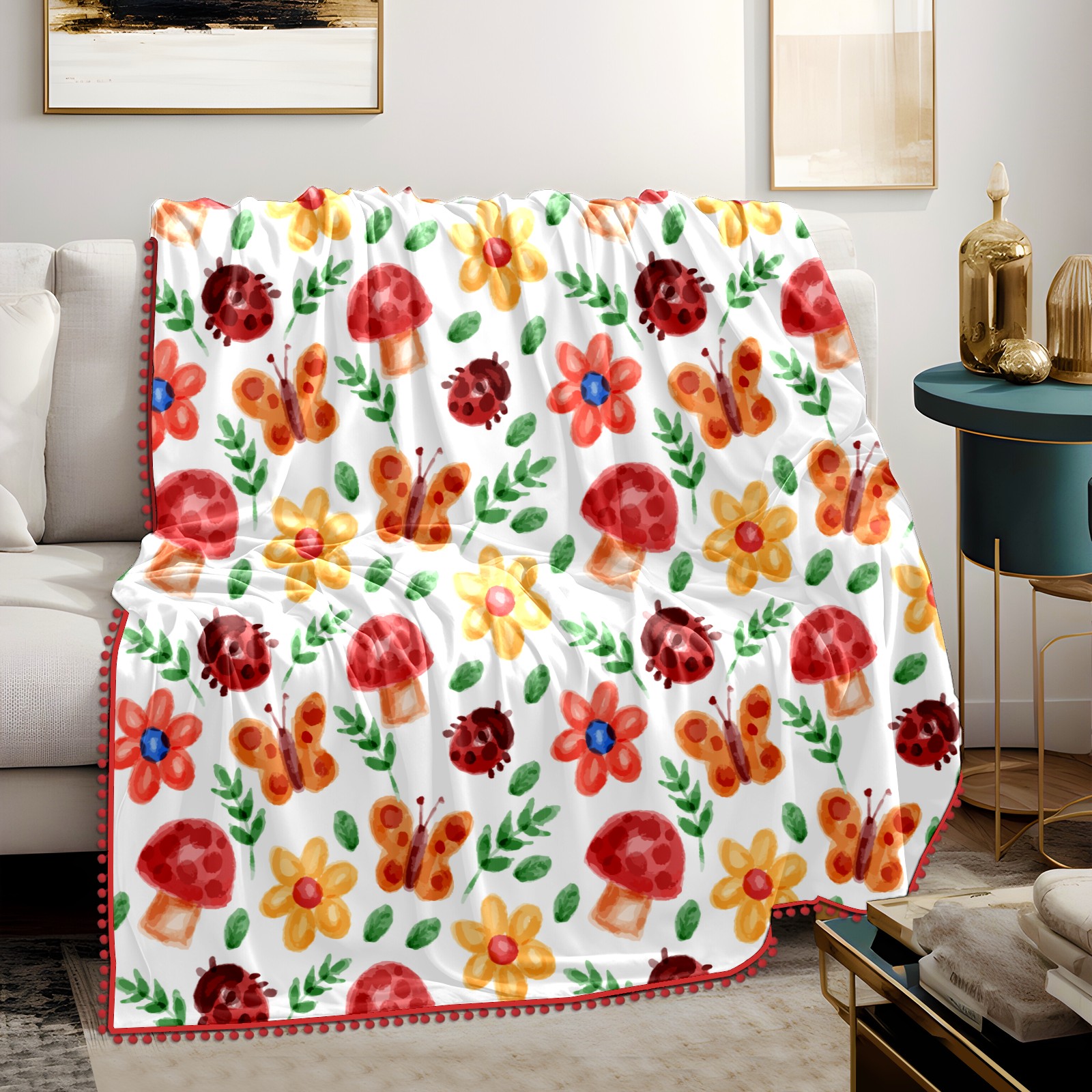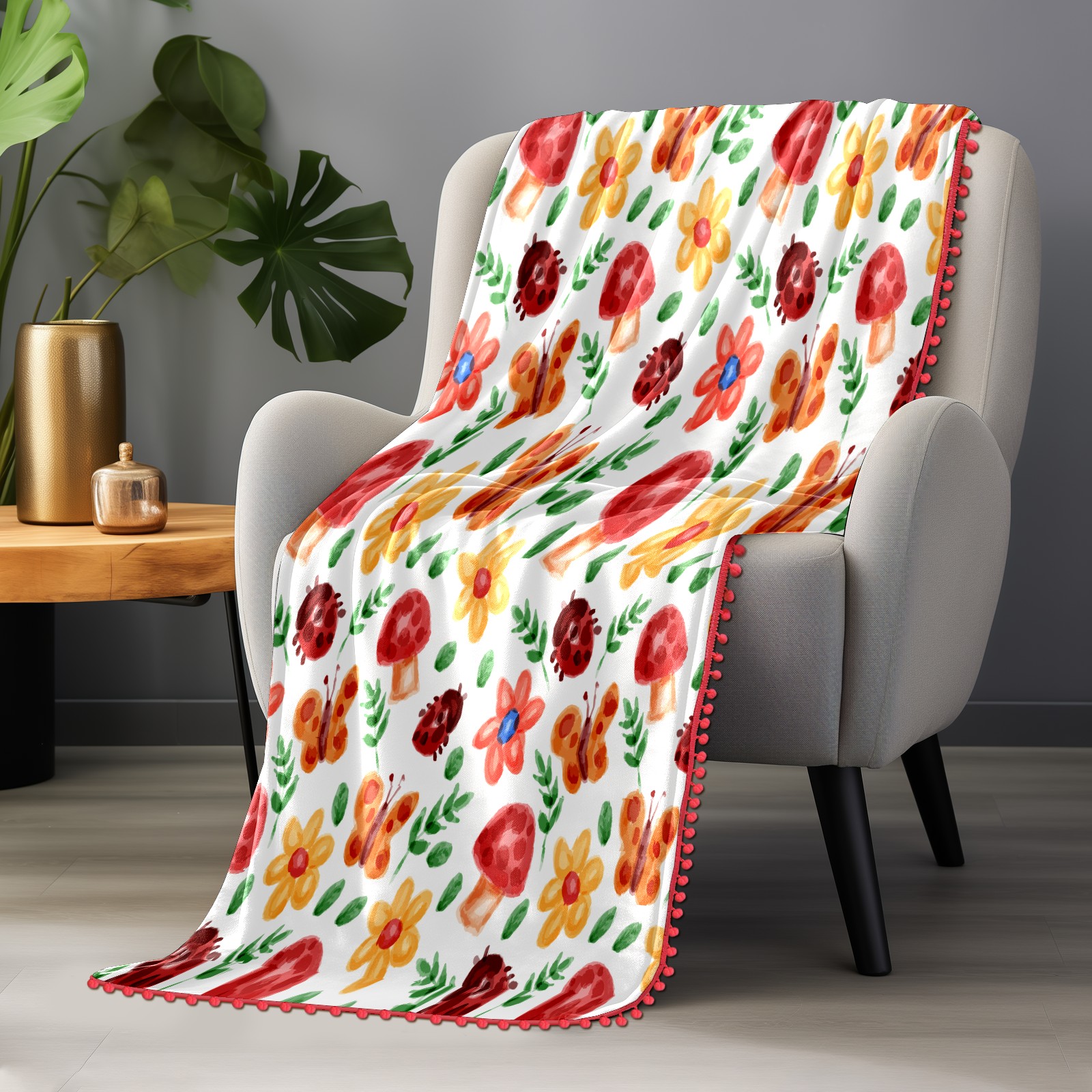 流苏毛毯 Watercolor Ladybird Mushroom Butterfly Floral
