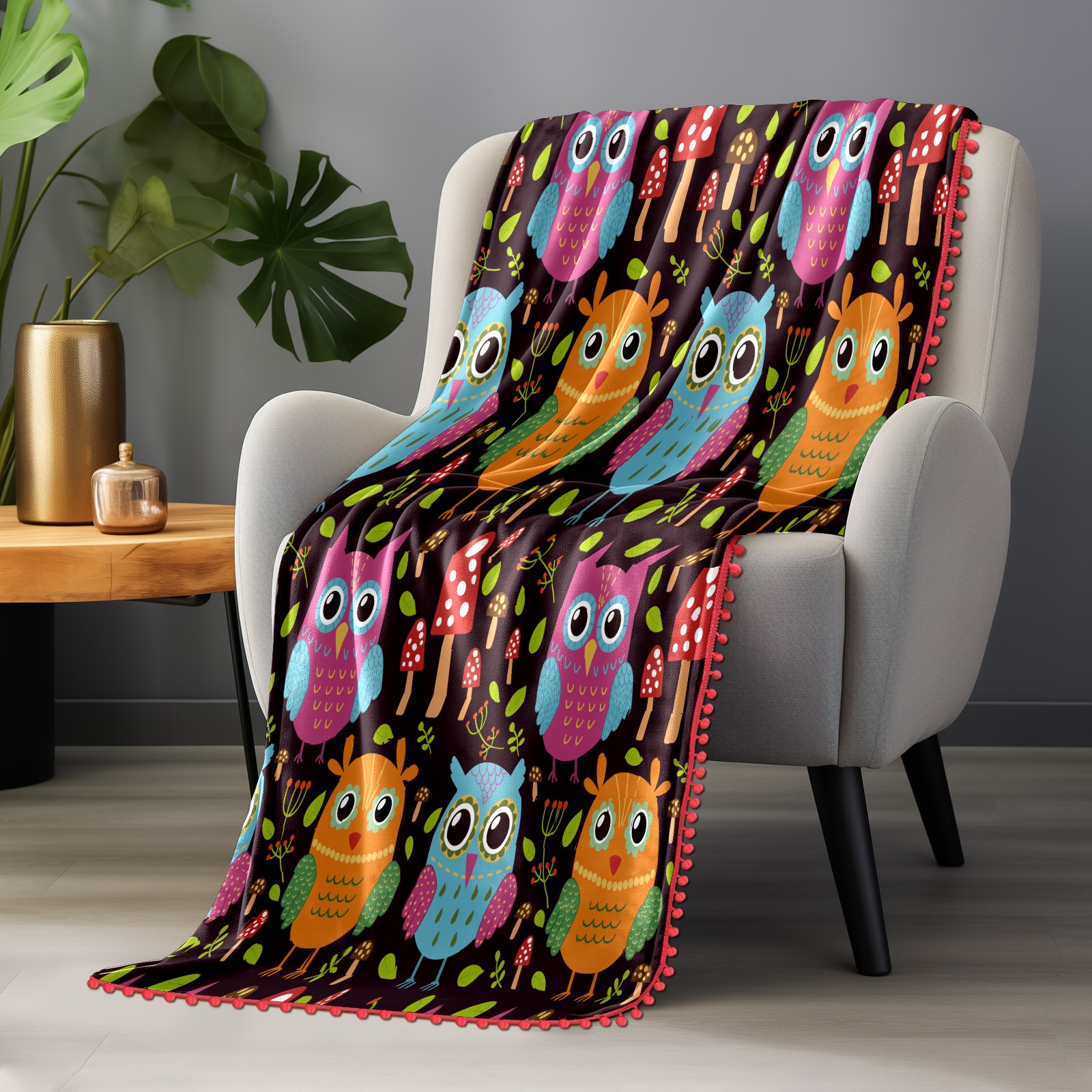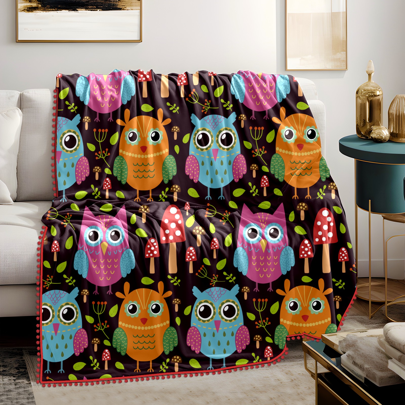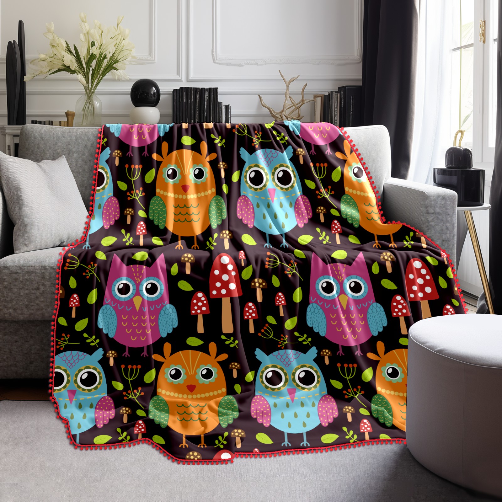 流苏毛毯 Colorful Owl Mushroom Pattern
