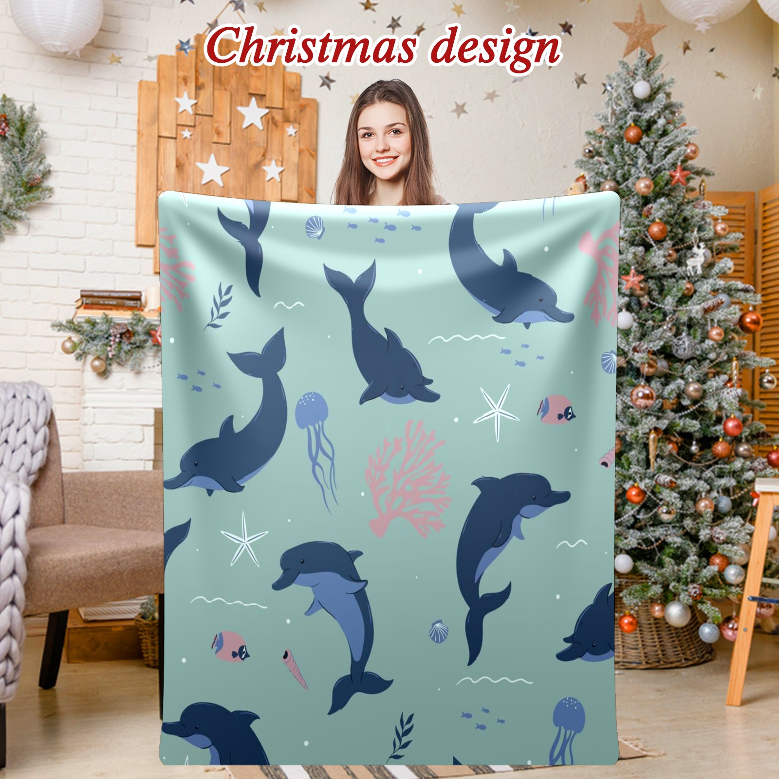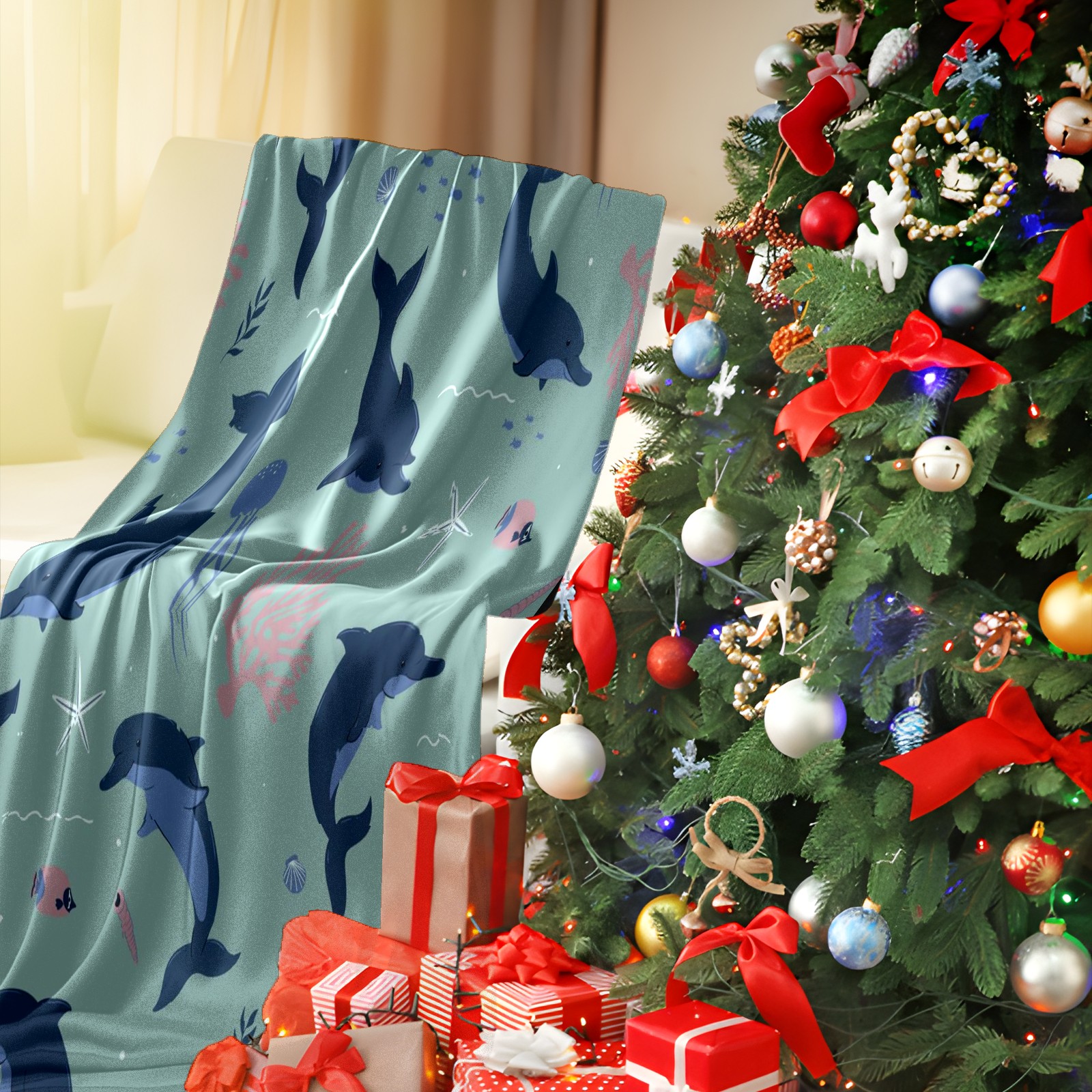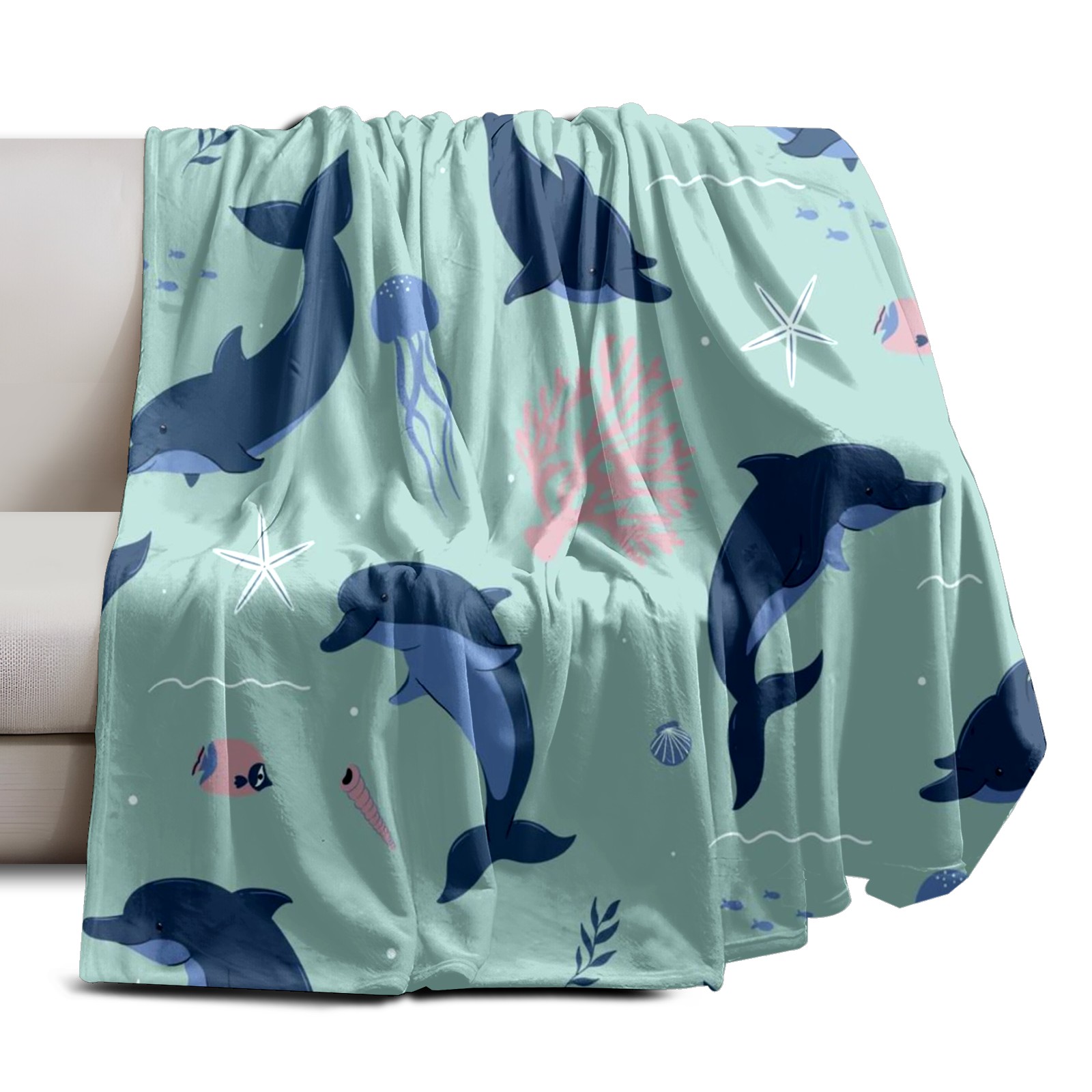 Премиальная фланелевая одеяло Navy Blue Dolphins