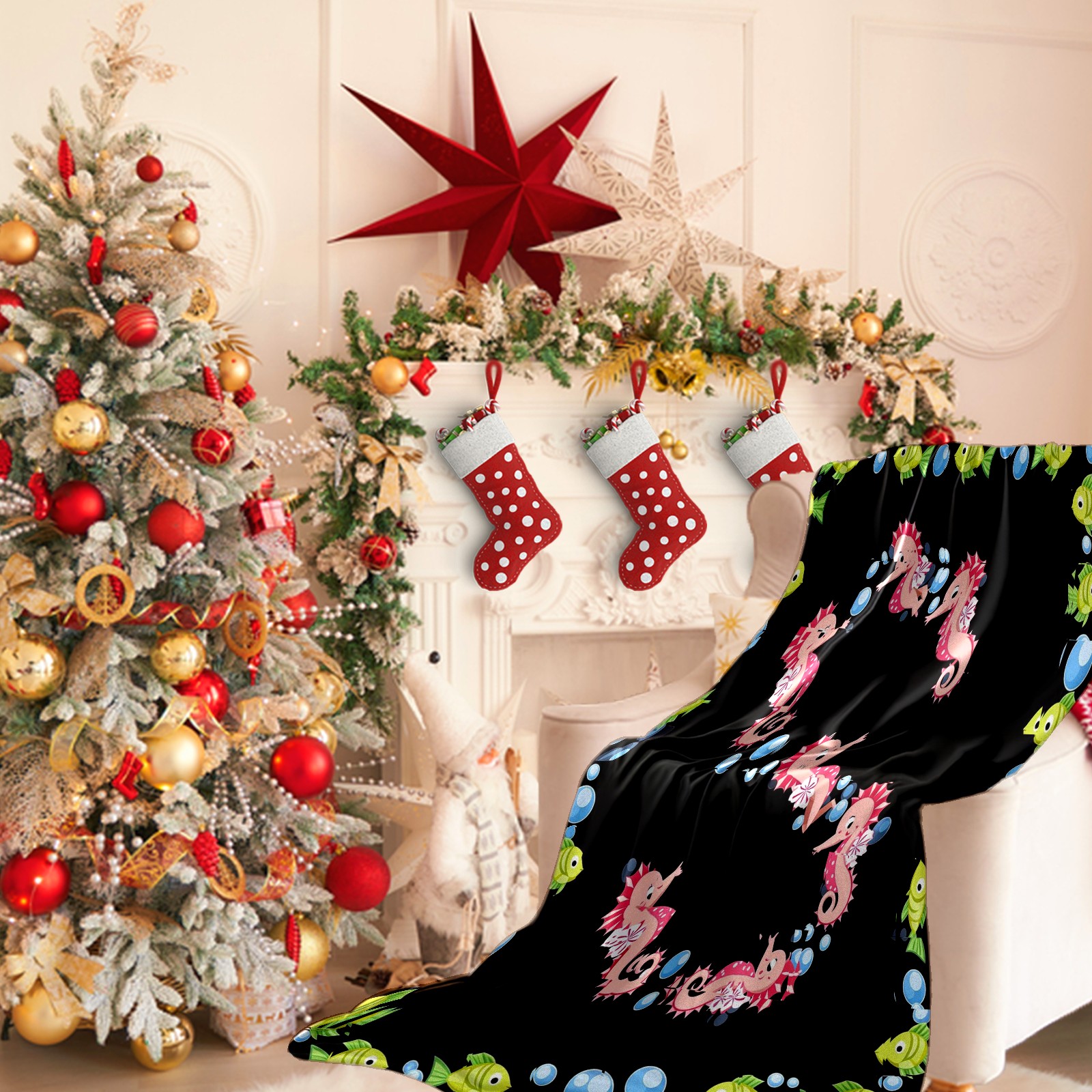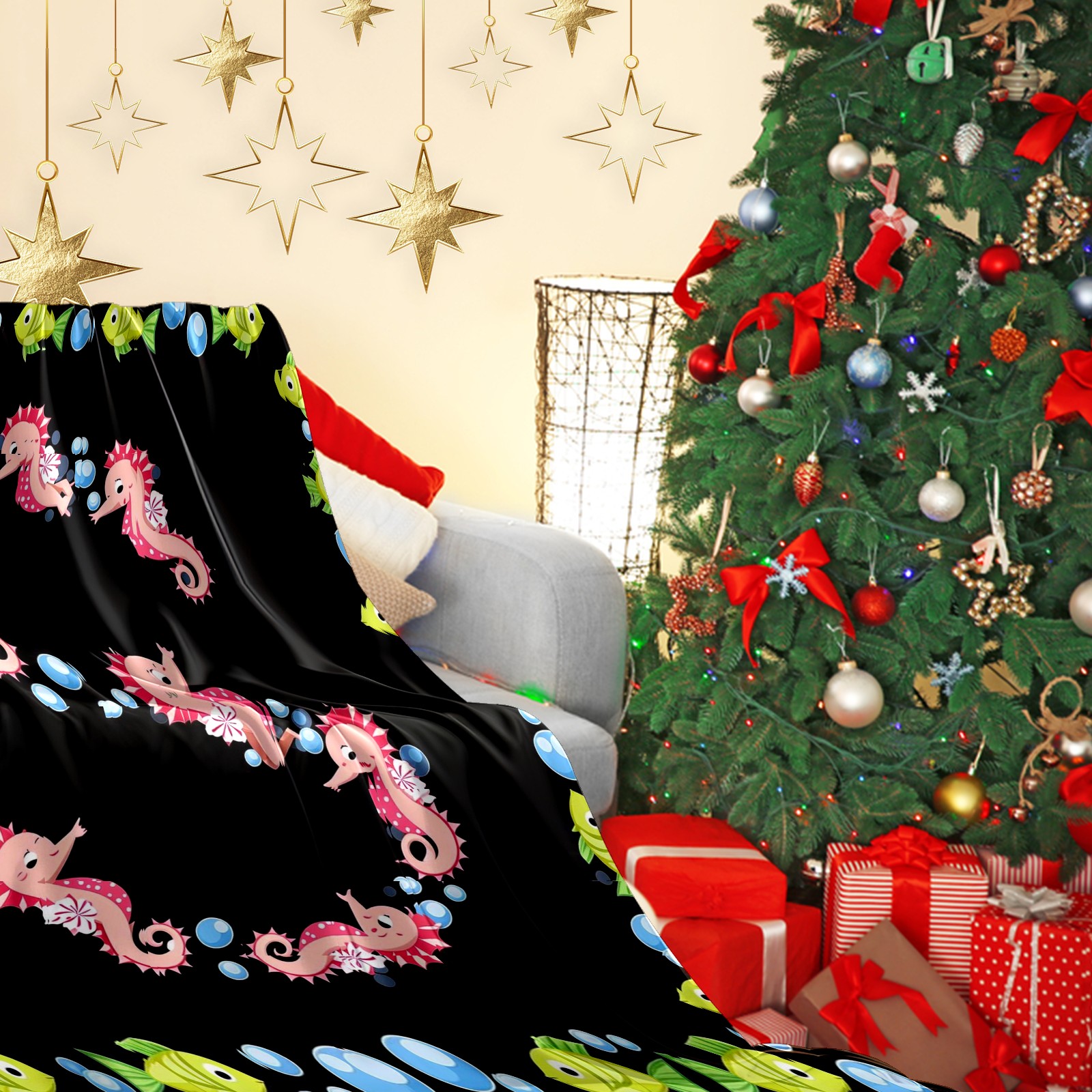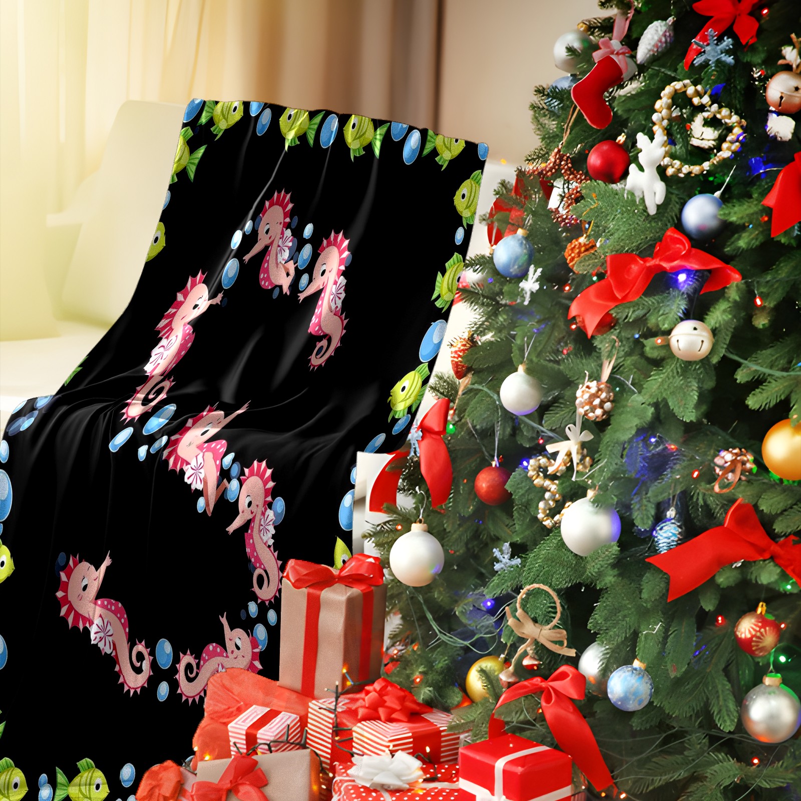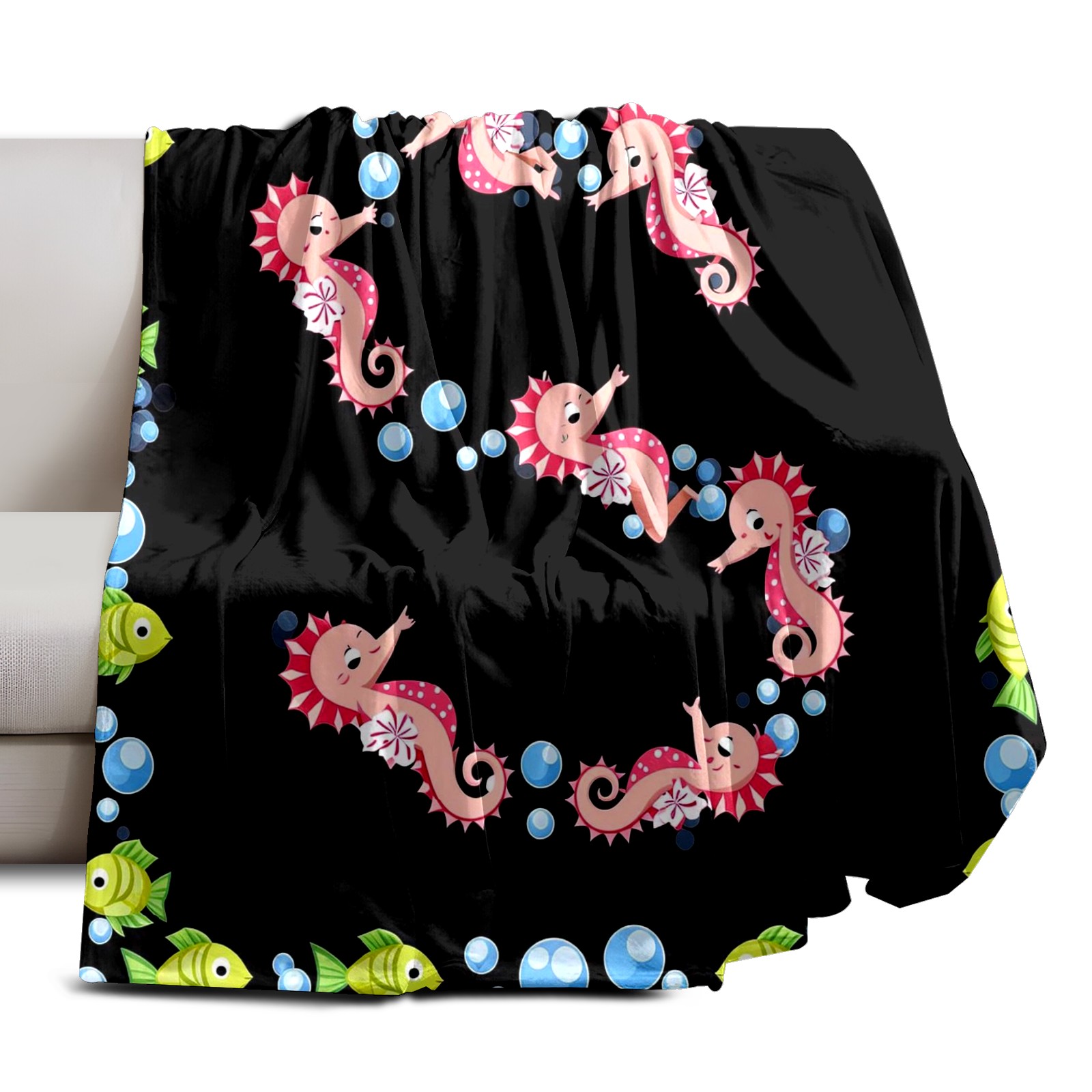 Премиальная фланелевая одеяло Seahorse Fish Black