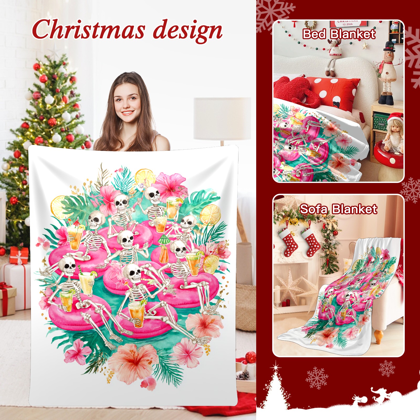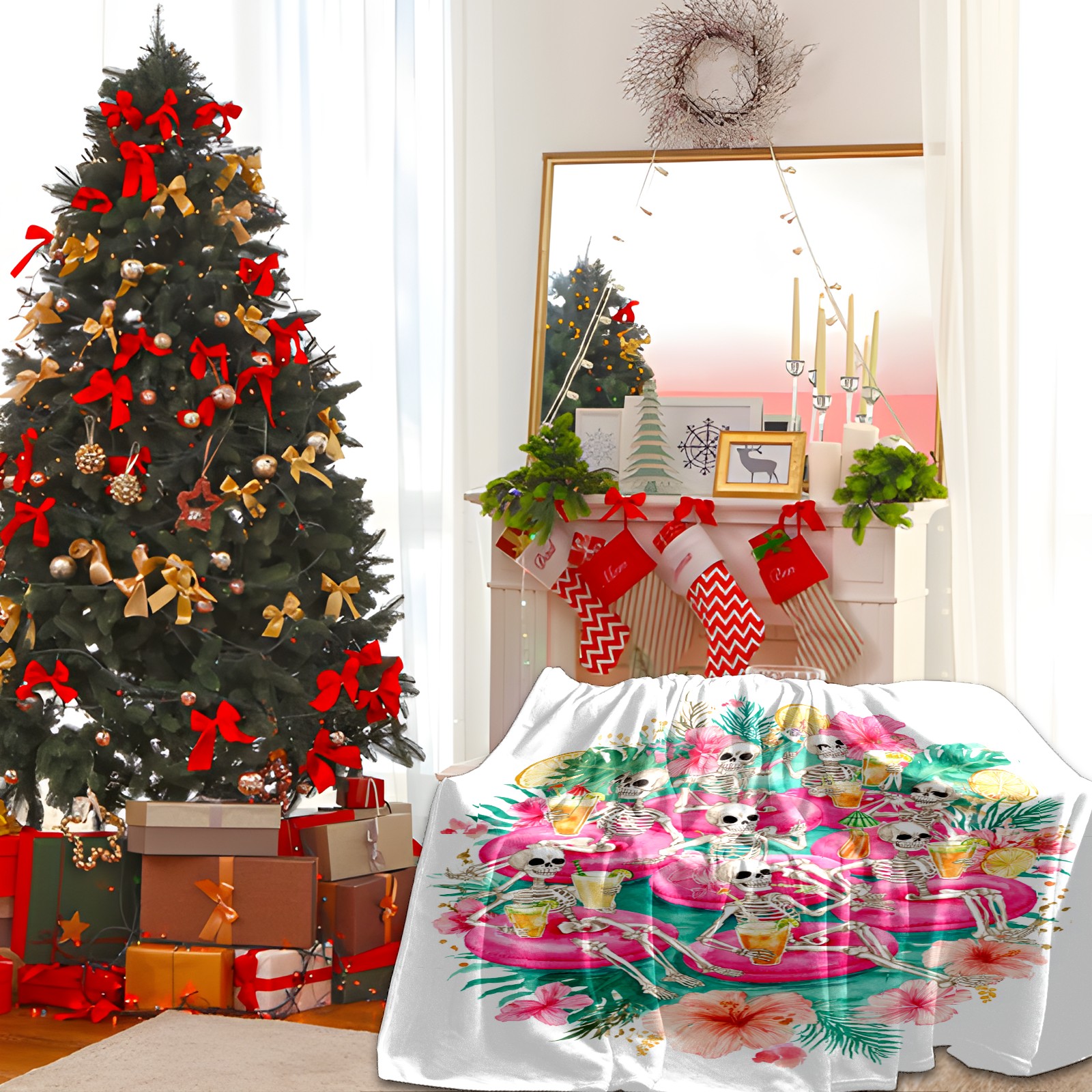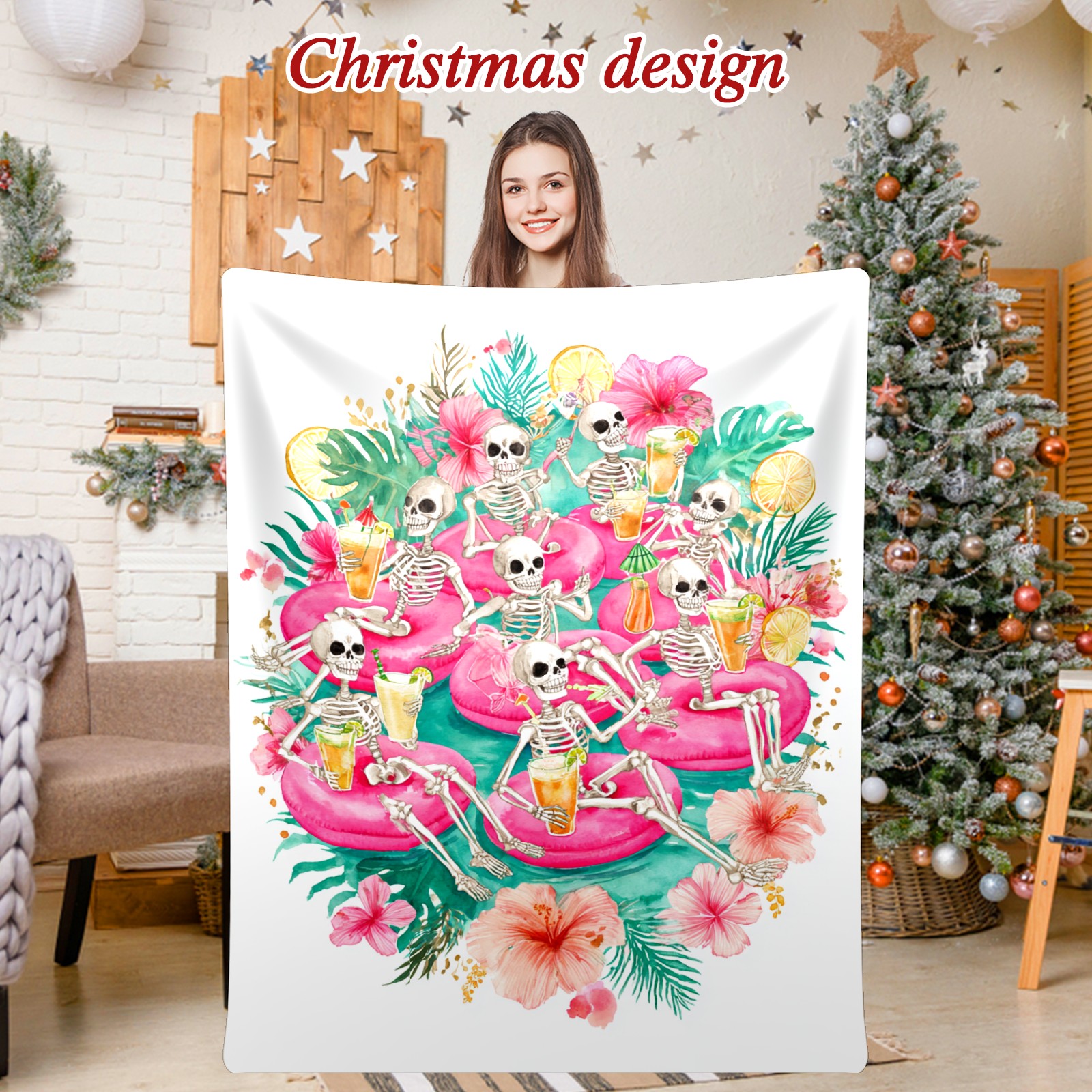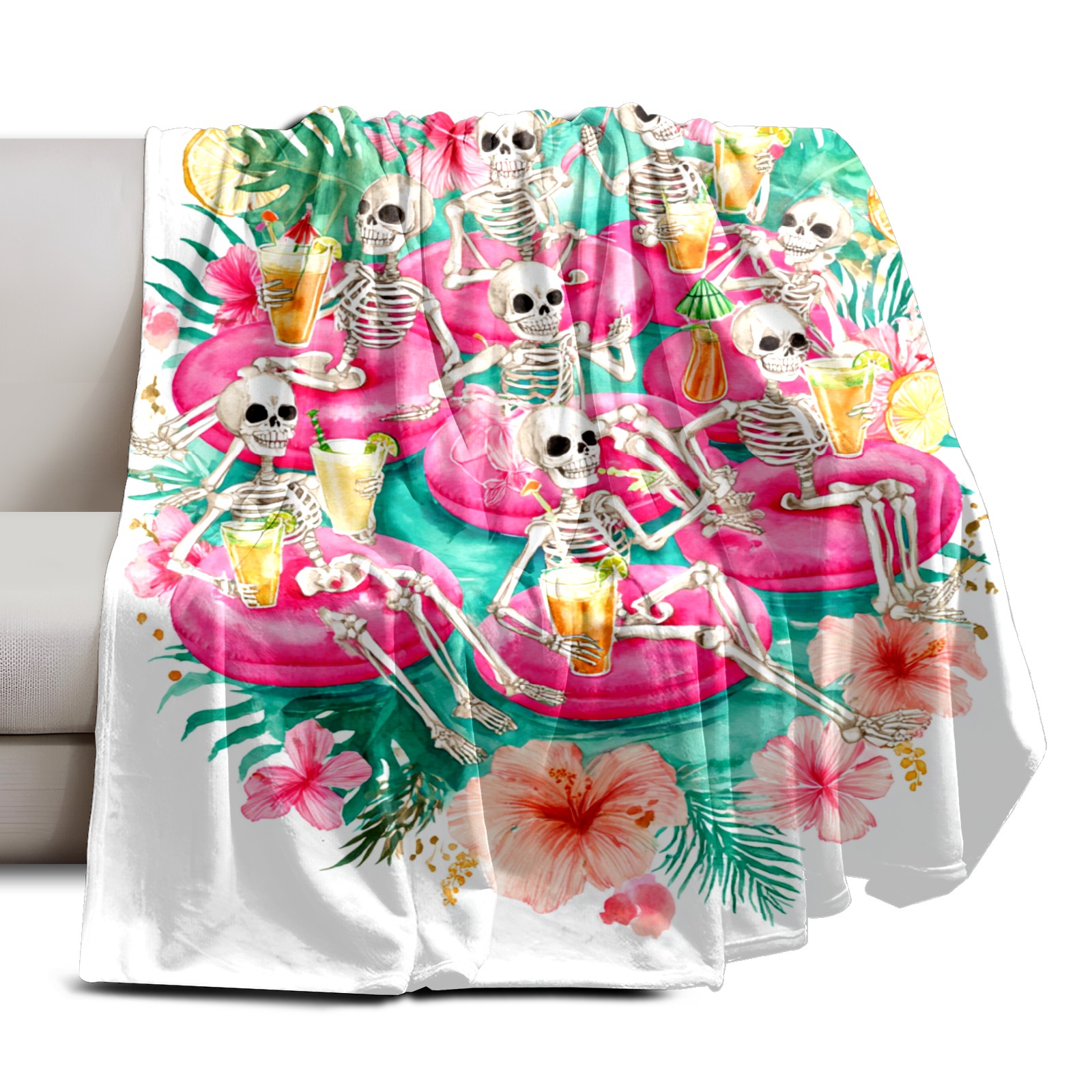 Премиальная фланелевая одеяло Skeleton Flamingo Pink