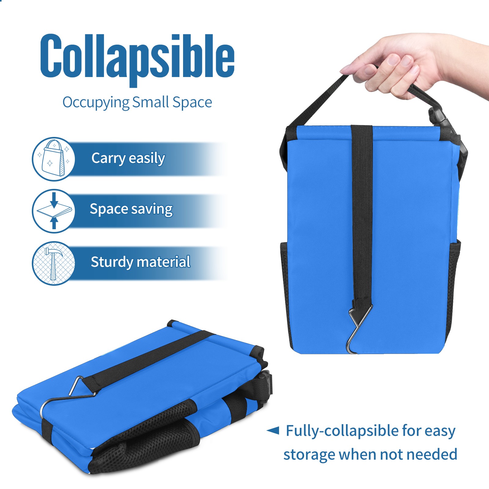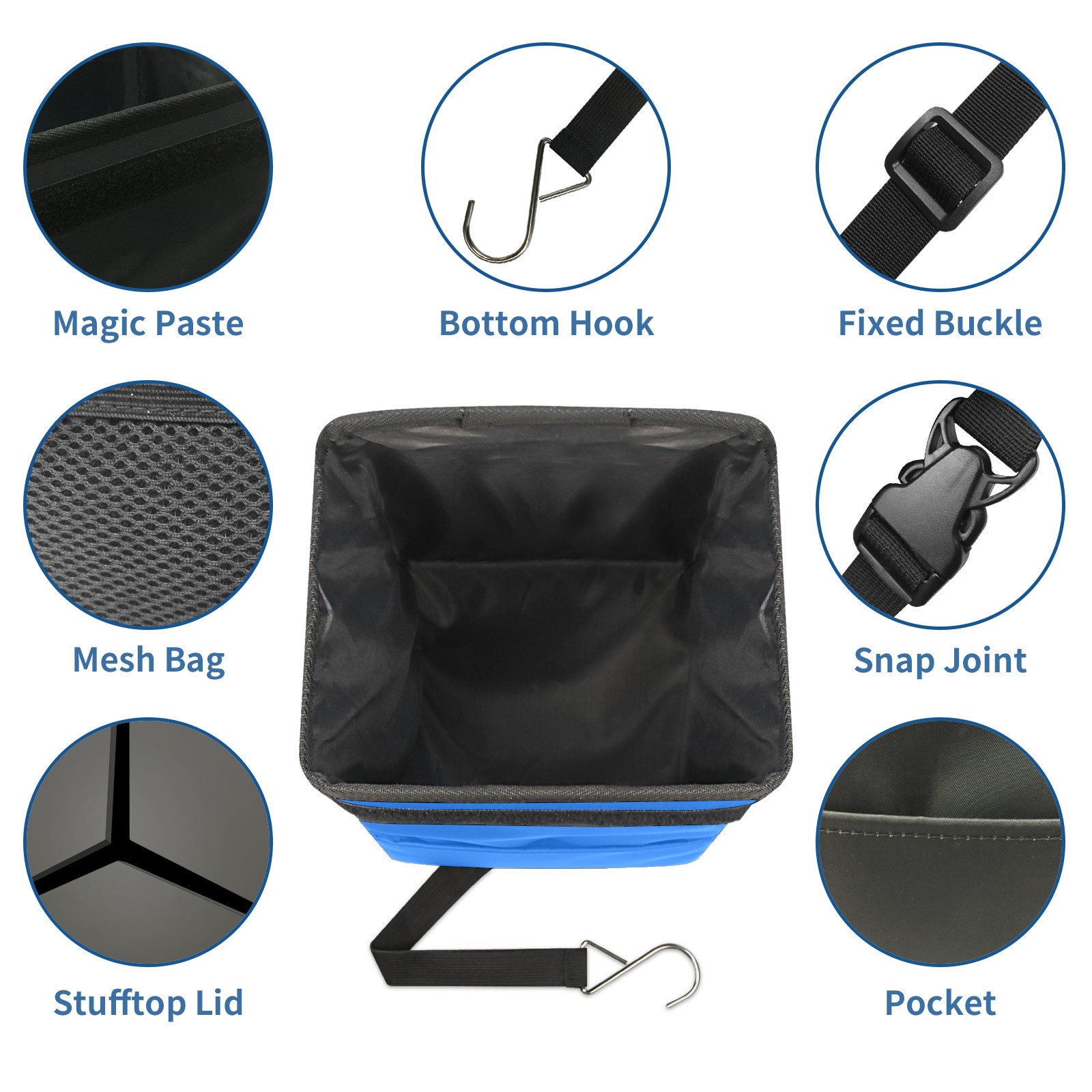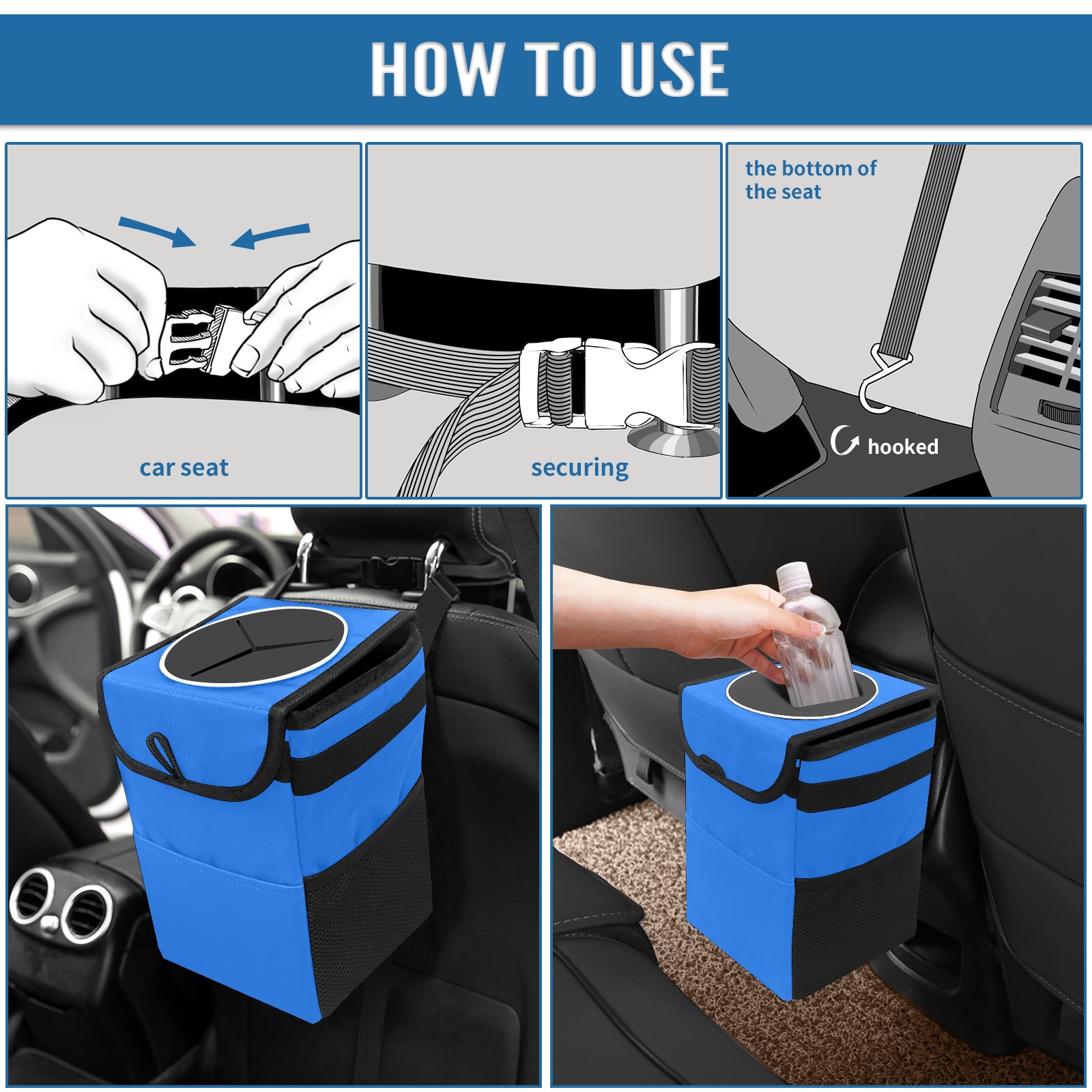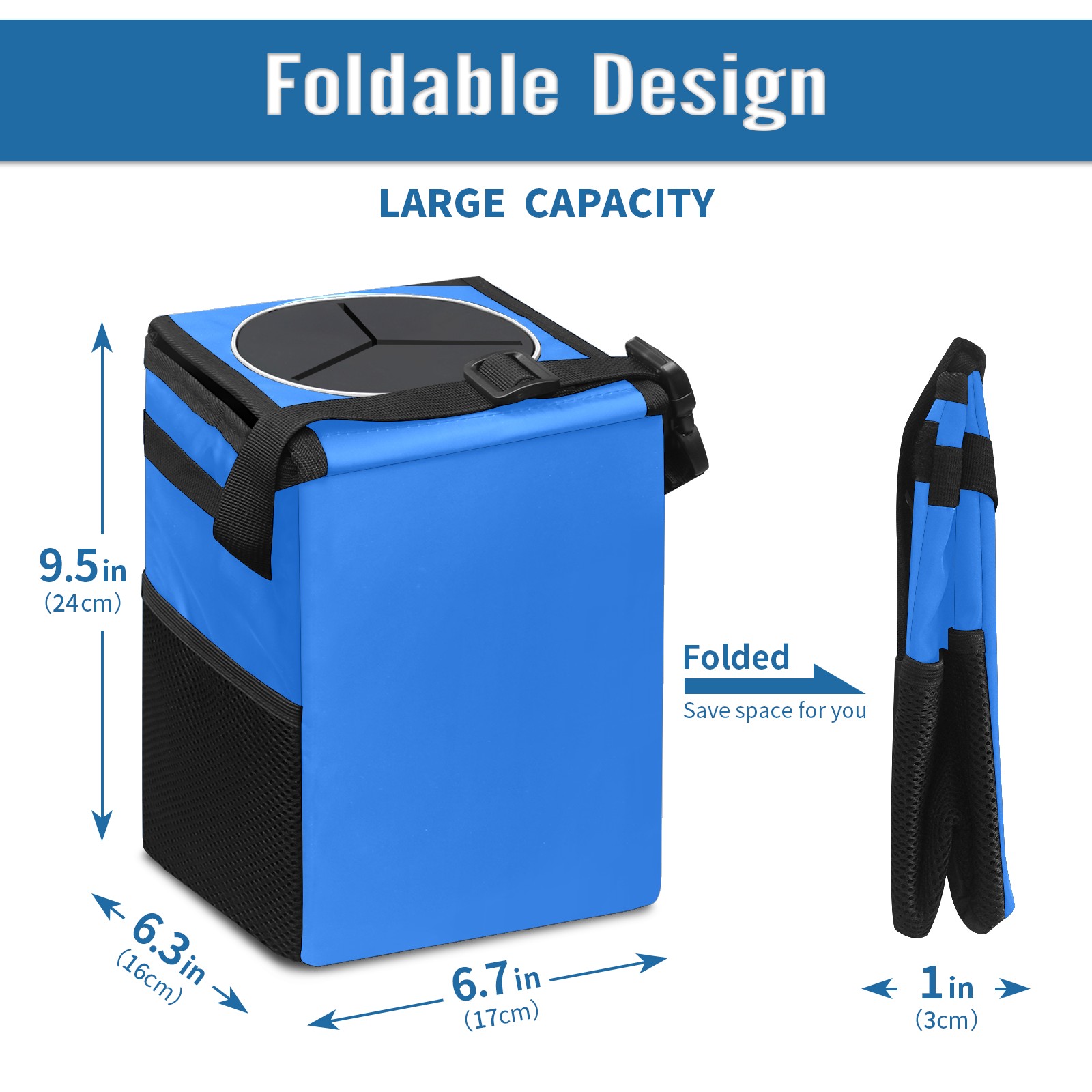 • <p>【FOLDABLE &amp; SPACE-SAVING】</p> <p>✔ Compact 9.5"×6.7"×6.3" size fits perfectly in any vehicle space.</p> <p>✔ Instantly folds flat when not in use - stores effortlessly under seats or in door pockets.</p> <p>【MULTI-FUNCTION ORGANIZER】</p> <p>✔ Large main compartment holds bottles, wrappers and tissues.</p> <p>✔ Additional pockets for wet wipes, masks or small accessories.</p> <p>【WATERPROOF &amp; LEAKPROOF】</p> <p>✔ Made with premium leak-proof polyester material.</p> <p>✔ Contains messy spills from drinks, snacks, and food. </p> <p>✔ Wipe-clean surface resists stains and eliminates odors.</p> <p>Package Includes:</p> <p>1× Car Trash Can</p>