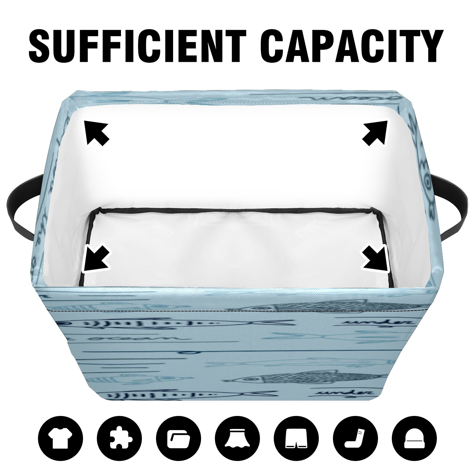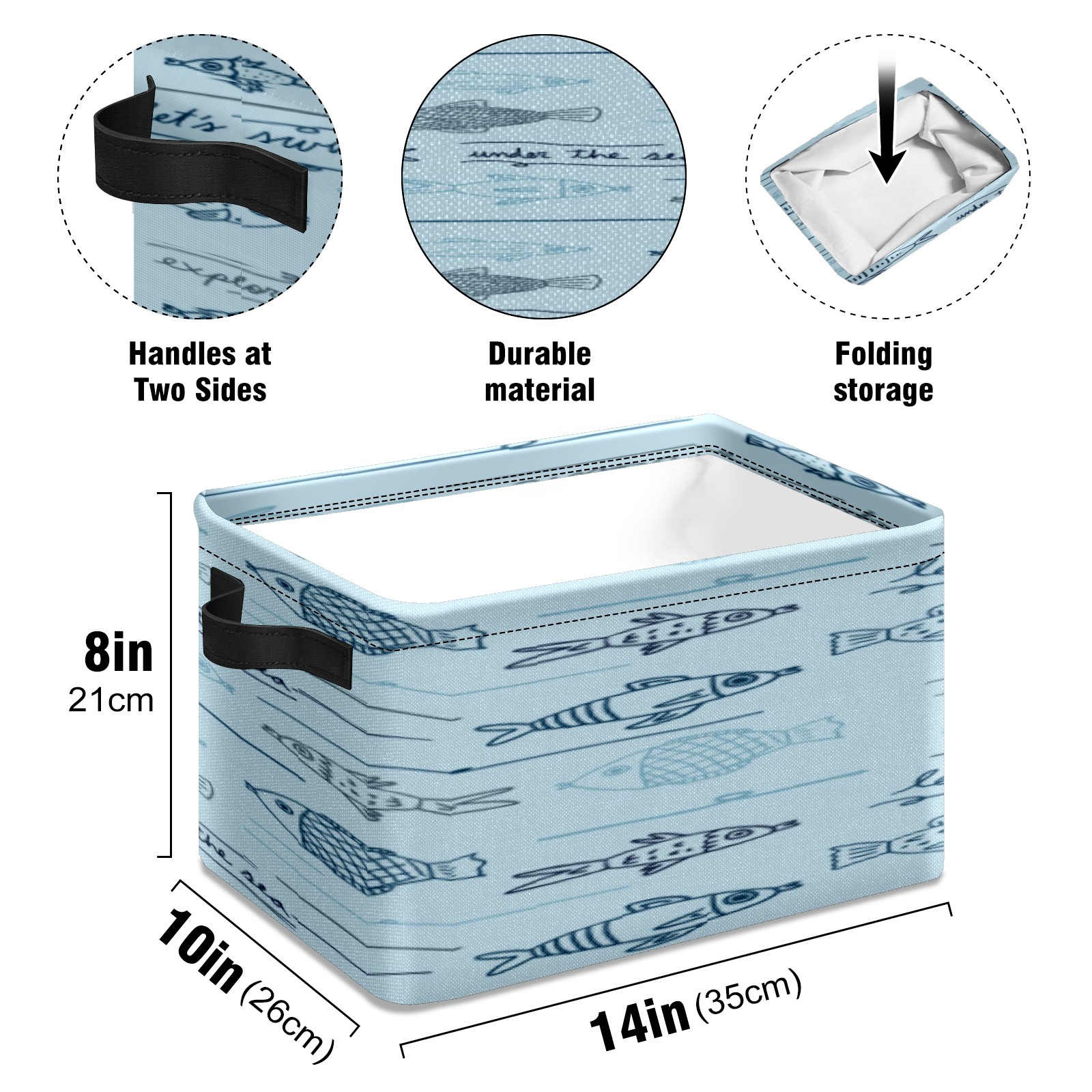 【Материал】Оксфордская ткань из полиэстера 600D; ручки изготовлены из полиэстера. 【Описание материала】Внешняя ткань: Оксфордская ткань полотняного переплетения высокой плотности 300D (ПВХ); Подкладка: белая ткань 750D; Ручки: черная композитная ткань 290T. 【Размер】26x35x21 см (10x14x8 дюймов) 【Описание продукта】Эта корзина для хранения с ручками с обеих сторон предлагает достаточно места для хранения предметов разных размеров, что делает ее подходящей для различных случаев, таких как дом, офис и школа. Ручки с обеих сторон закреплены гвоздями для долговечности. Прочный металлический каркас окружает корзину, поддерживая ее форму. Складная корзина для хранения: Наши корзины для хранения легко складываются, когда не используются. Эти ящики для хранения изготовлены из легко моющейся оксфордской ткани и при необходимости могут быть аккуратно протерты мягким мылом и водой. Из-за внутреннего металлического каркаса и жесткого дна машинная стирка не рекомендуется. 【Подходящие сценарии использования】Дом, офис и школа 【Инструкции по стирке】Рекомендуется ручная стирка; избегайте длительного воздействия прямых солнечных лучей.