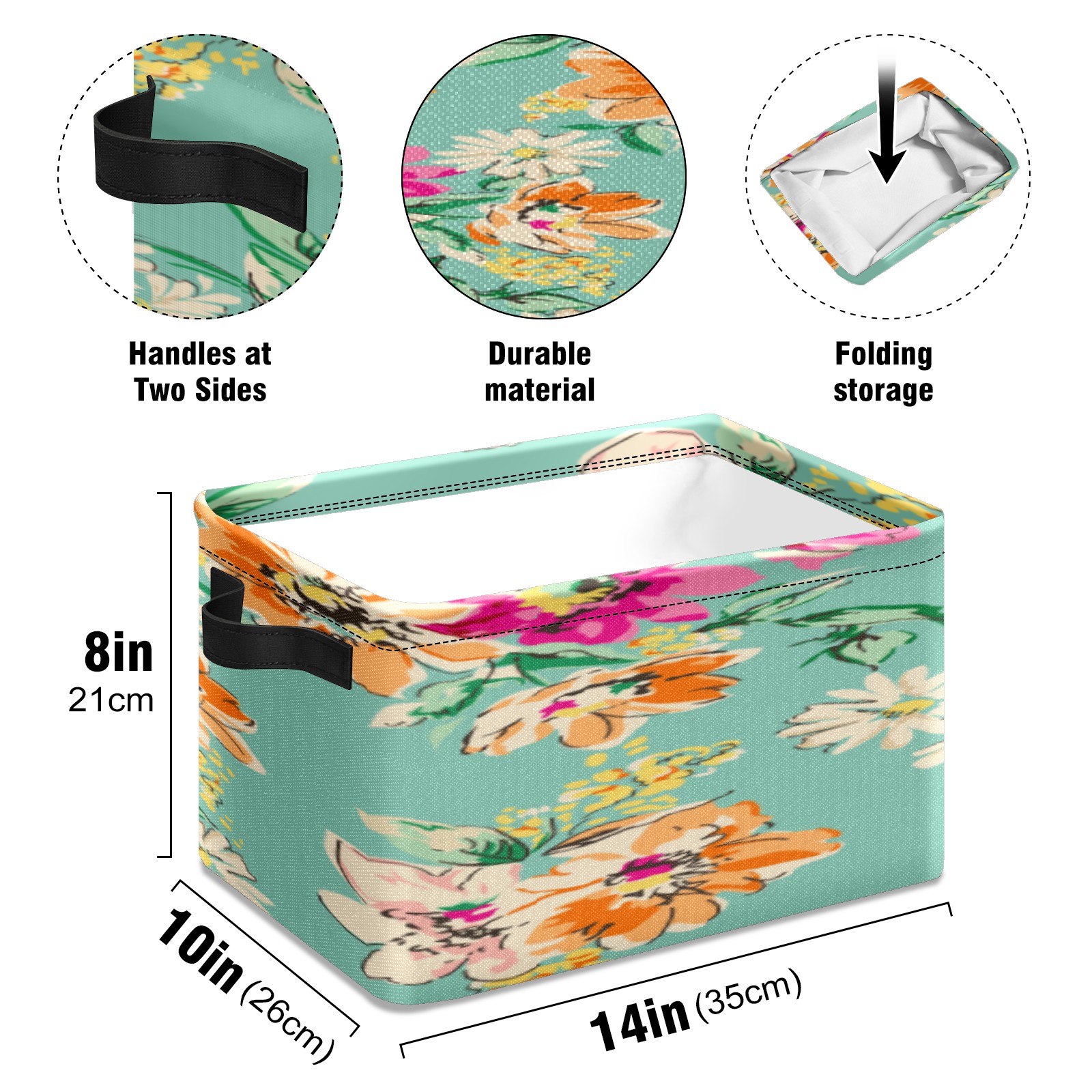 【Материал】Оксфордская ткань из полиэстера 600D; ручки изготовлены из полиэстера. 【Описание материала】Внешняя ткань: Оксфордская ткань полотняного переплетения высокой плотности 300D (ПВХ); Подкладка: белая ткань 750D; Ручки: черная композитная ткань 290T. 【Размер】26x35x21 см (10x14x8 дюймов) 【Описание продукта】Эта корзина для хранения с ручками с обеих сторон предлагает достаточно места для хранения предметов разных размеров, что делает ее подходящей для различных случаев, таких как дом, офис и школа. Ручки с обеих сторон закреплены гвоздями для долговечности. Прочный металлический каркас окружает корзину, поддерживая ее форму. Складная корзина для хранения: Наши корзины для хранения легко складываются, когда не используются. Эти ящики для хранения изготовлены из легко моющейся оксфордской ткани и при необходимости могут быть аккуратно протерты мягким мылом и водой. Из-за внутреннего металлического каркаса и жесткого дна машинная стирка не рекомендуется. 【Подходящие сценарии использования】Дом, офис и школа 【Инструкции по стирке】Рекомендуется ручная стирка; избегайте длительного воздействия прямых солнечных лучей.