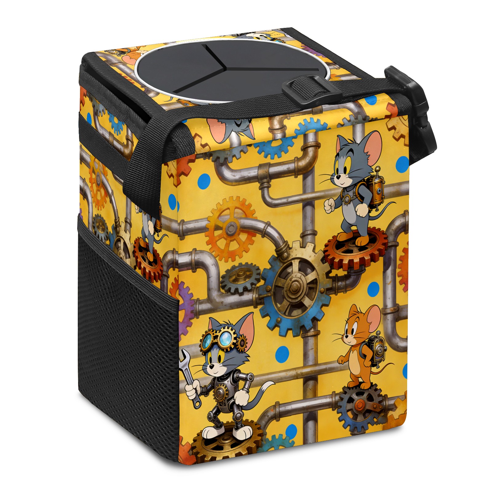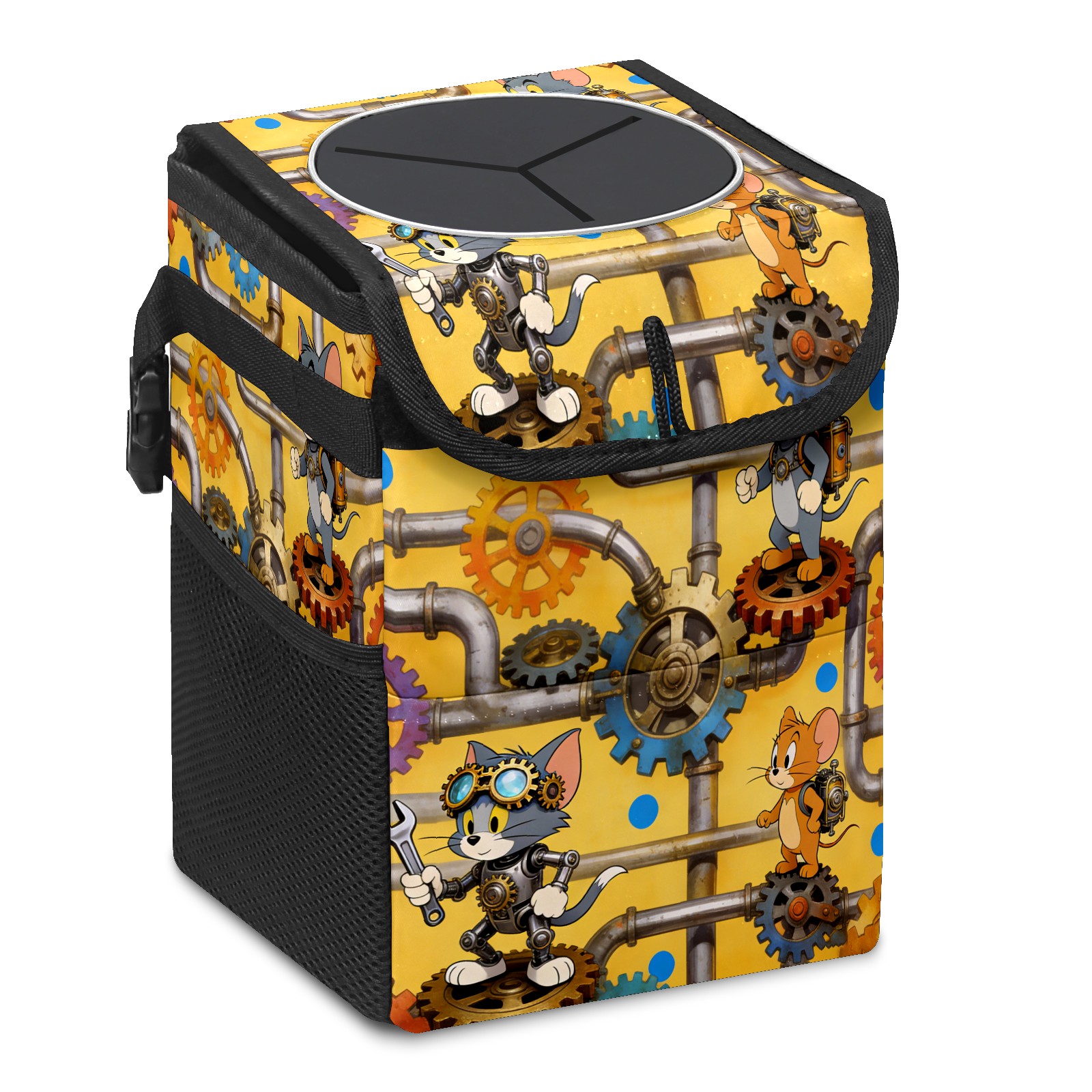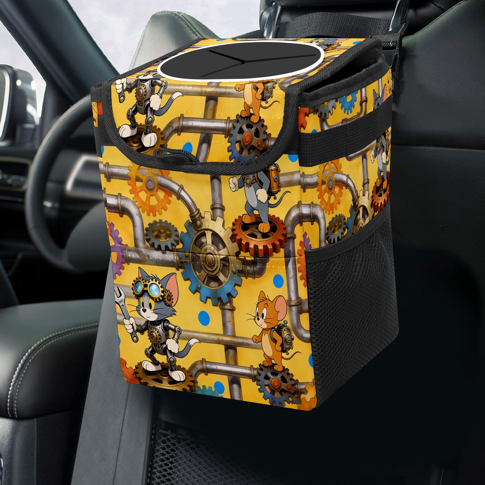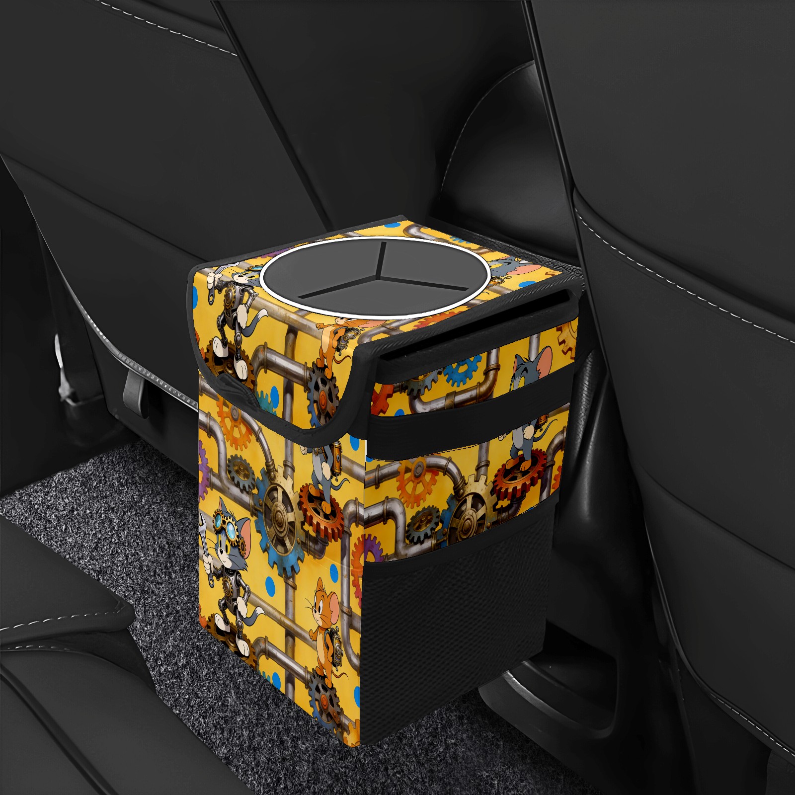• Эта многофункциональная автомобильная мусорная корзина отличается стильным принтом, сочетающим в себе практичность и эстетику. Изготовленная из высококачественной саржевой ткани с плетеными ремнями, она прочная, долговечная и износостойкая. Размеры корзины составляют 24×17×16 см (9,5×6,7×6,3 дюйма). Верхнее отверстие имеет прорезиненное покрытие для удобной утилизации мусора; боковые сетчатые карманы и передний карман обеспечивают удобное хранение закусок, телефонов и других мелких предметов.