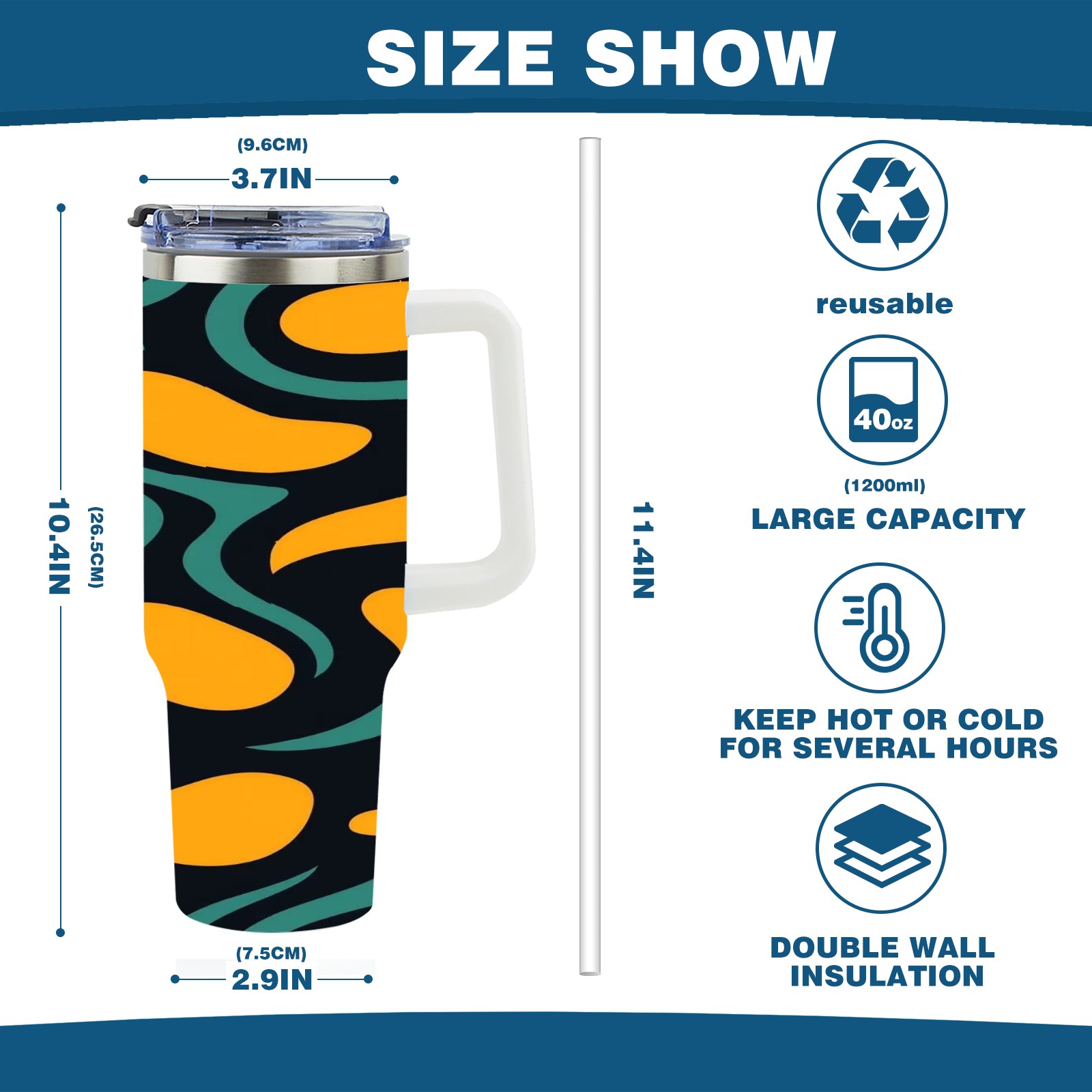 • С большой емкостью 40 унций, он обеспечивает вас гидратацией в течение всего дня, идеально подходит для воды, кофе, сока или других напитков. Эргономичный дизайн идеально вписывается в автомобильные держатели для бутылок, а прочный, герметичный колпачок предотвращает утечки во время передвижения. Путешествие. Антискользящее основание обеспечивает устойчивость, а гладкие поверхности делают уборку легкой — просто мойте вручную или кладите в посудомоечную машину (рекомендуется верхний поддон).