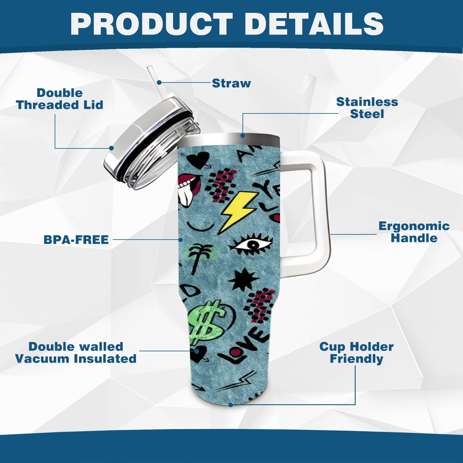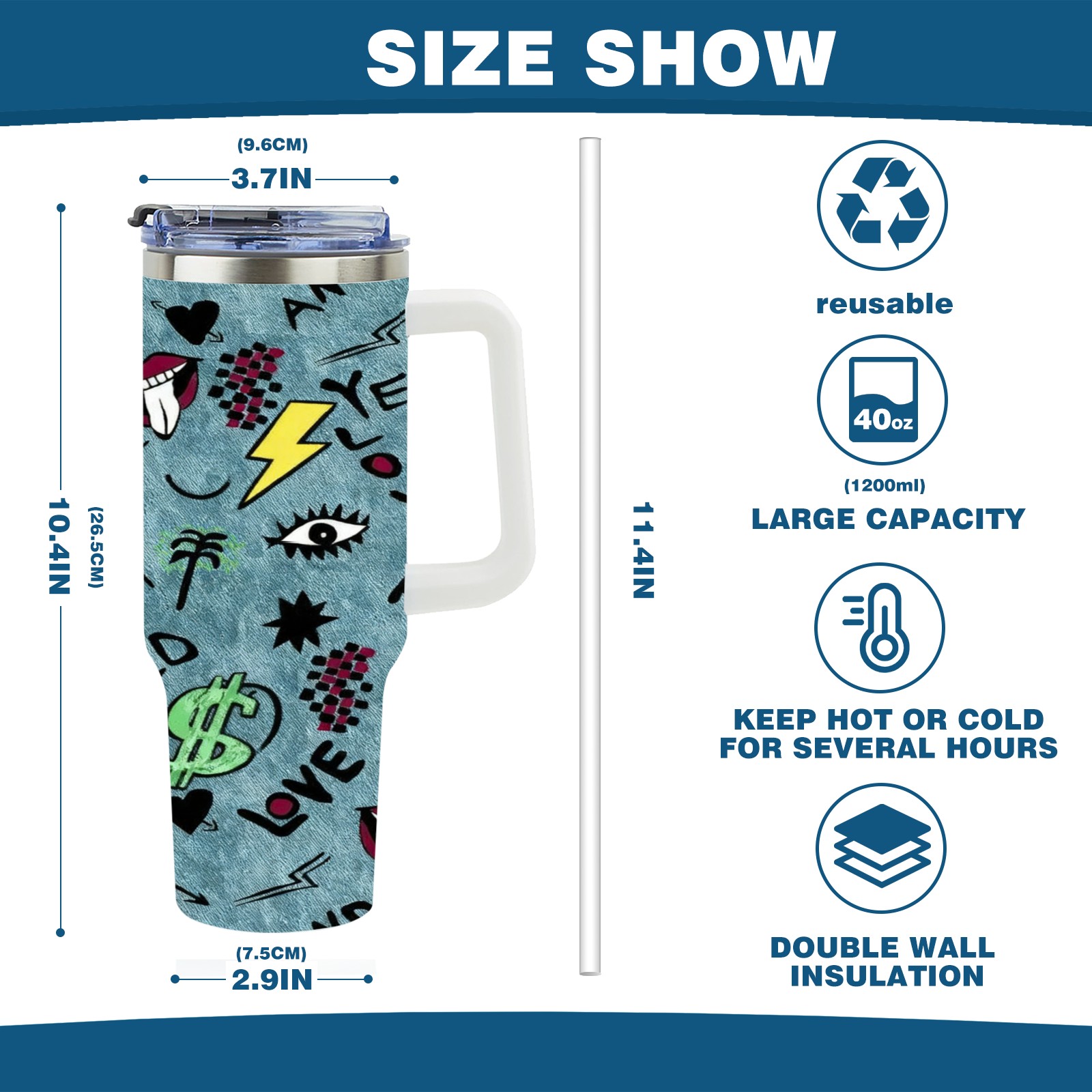 • С большой емкостью 40 унций, он обеспечивает вас гидратацией в течение всего дня, идеально подходит для воды, кофе, сока или других напитков. Эргономичный дизайн идеально вписывается в автомобильные держатели для бутылок, а прочный, герметичный колпачок предотвращает утечки во время передвижения. Путешествие. Антискользящее основание обеспечивает устойчивость, а гладкие поверхности делают уборку легкой — просто мойте вручную или кладите в посудомоечную машину (рекомендуется верхний поддон).