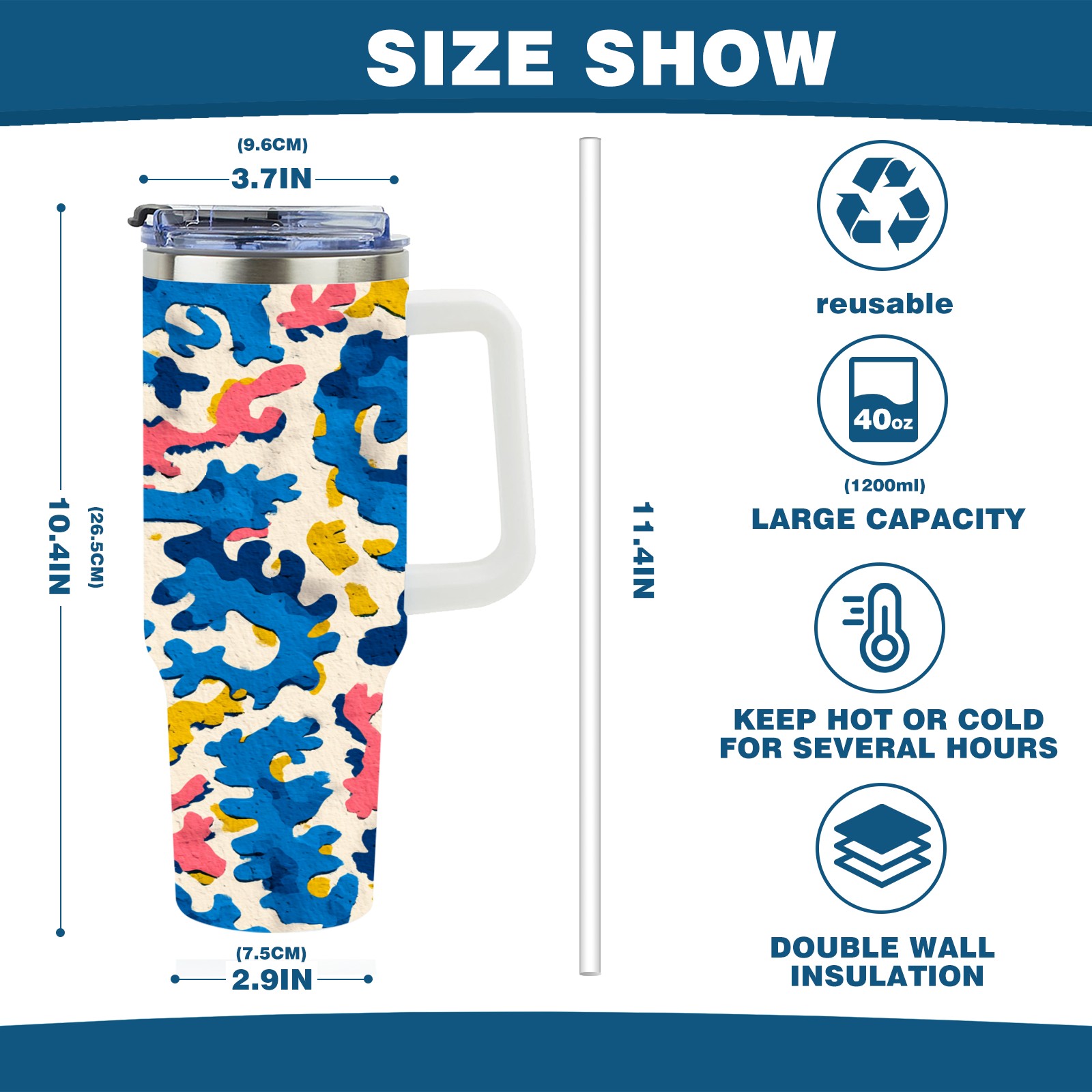 • С большой емкостью 40 унций, он обеспечивает вас гидратацией в течение всего дня, идеально подходит для воды, кофе, сока или других напитков. Эргономичный дизайн идеально вписывается в автомобильные держатели для бутылок, а прочный, герметичный колпачок предотвращает утечки во время передвижения. Путешествие. Антискользящее основание обеспечивает устойчивость, а гладкие поверхности делают уборку легкой — просто мойте вручную или кладите в посудомоечную машину (рекомендуется верхний поддон).