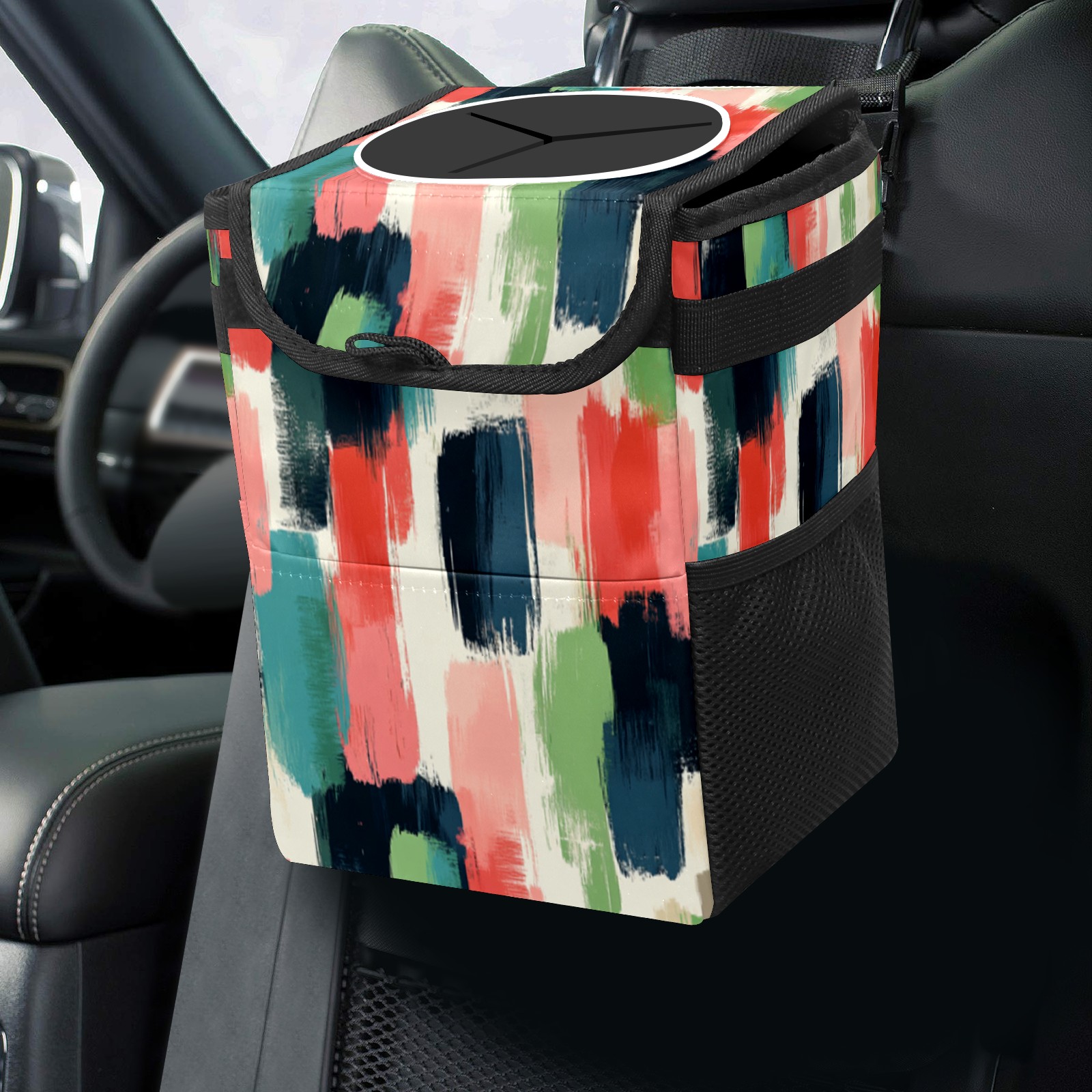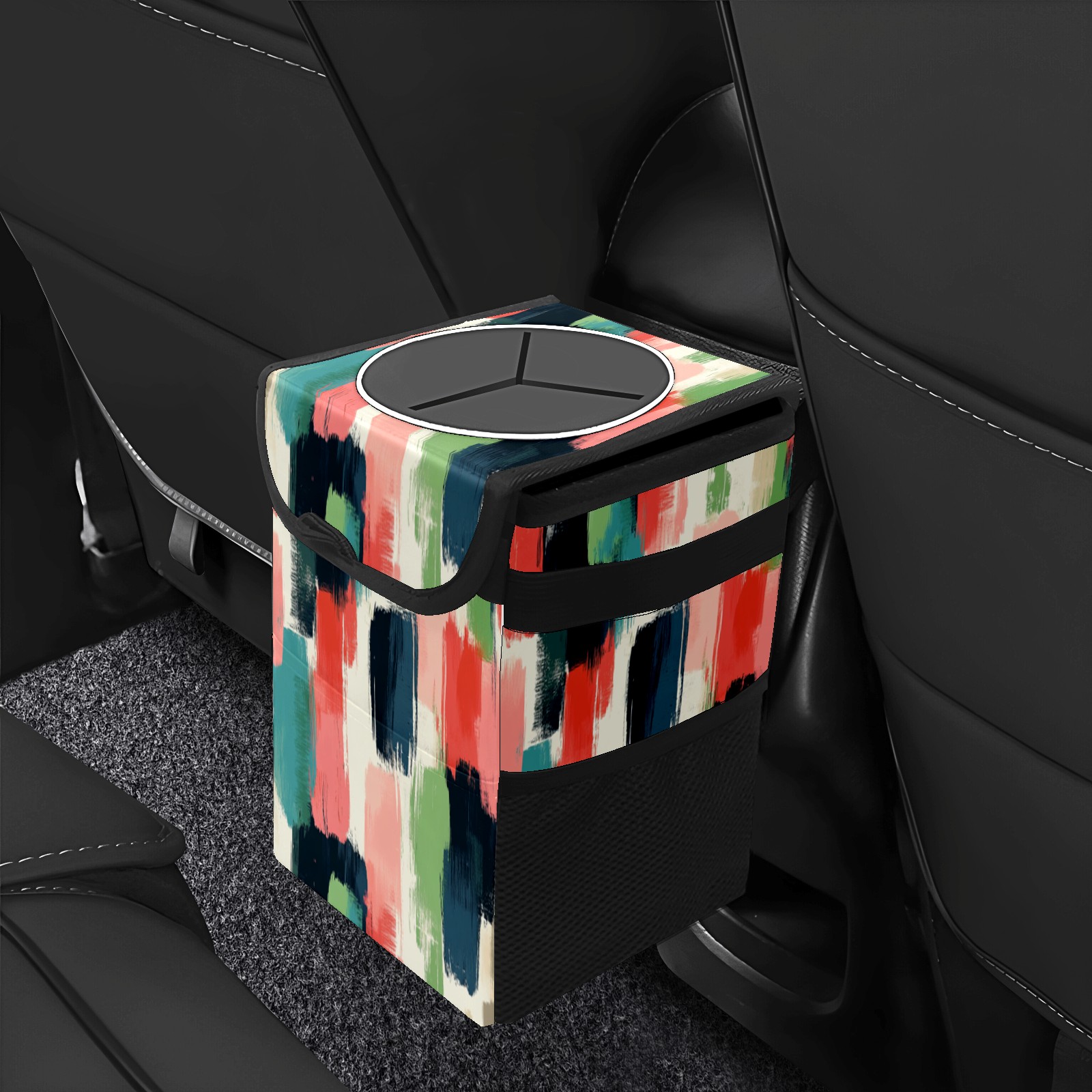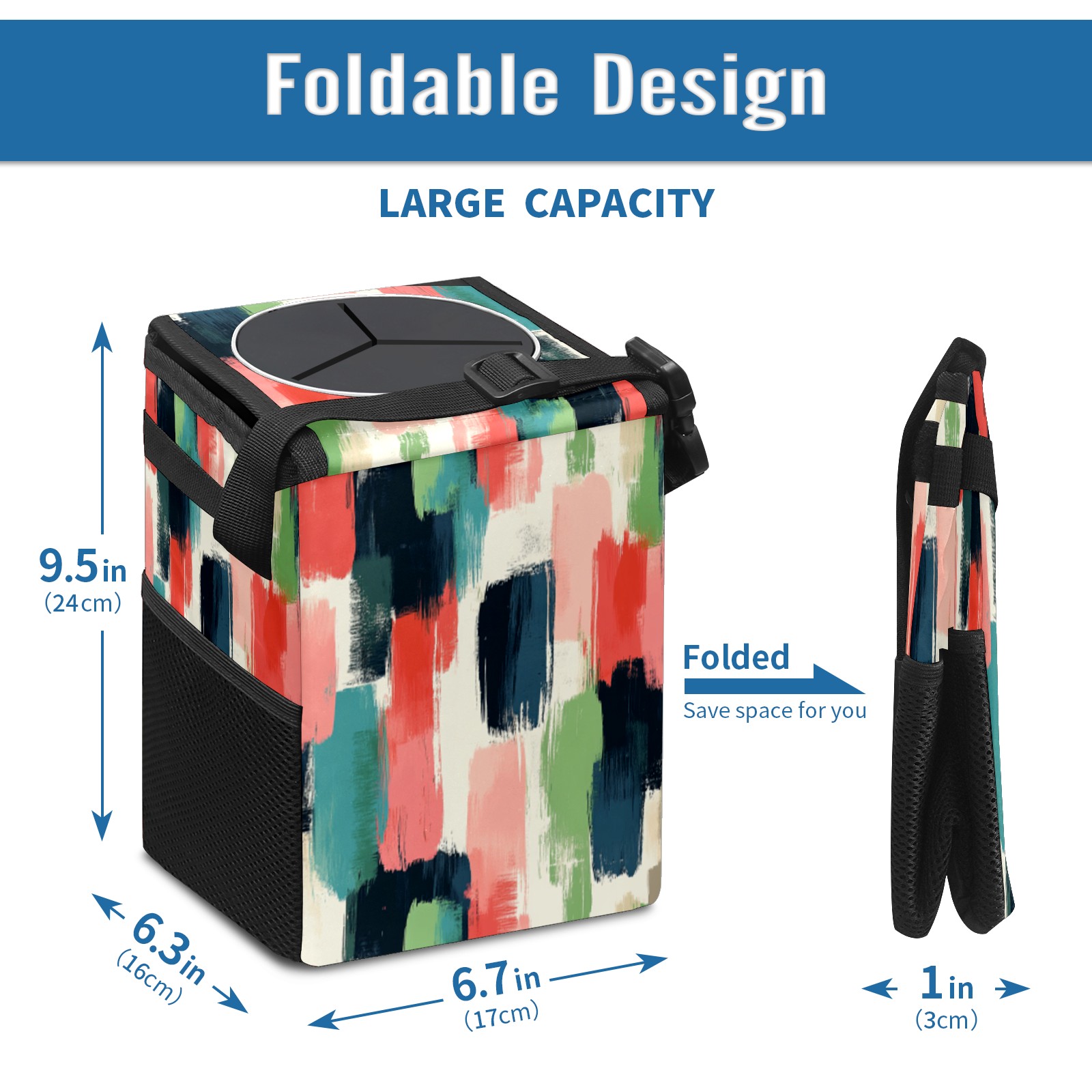 • Эта многофункциональная автомобильная мусорная корзина отличается стильным принтом, сочетающим в себе практичность и эстетику. Изготовленная из высококачественной саржевой ткани с плетеными ремнями, она прочная, долговечная и износостойкая. Размеры корзины составляют 24×17×16 см (9,5×6,7×6,3 дюйма). Верхнее отверстие имеет прорезиненное покрытие для удобной утилизации мусора; боковые сетчатые карманы и передний карман обеспечивают удобное хранение закусок, телефонов и других мелких предметов.