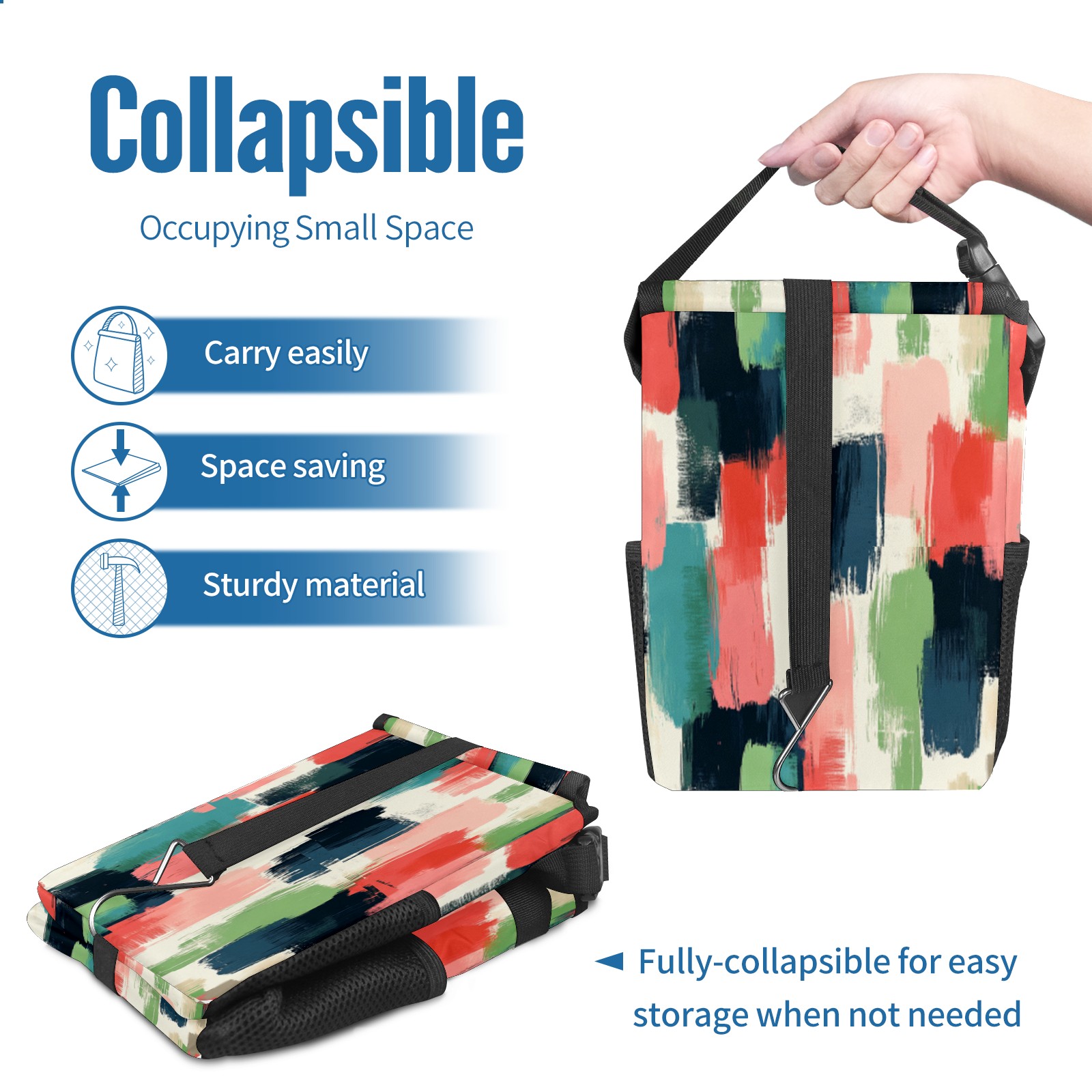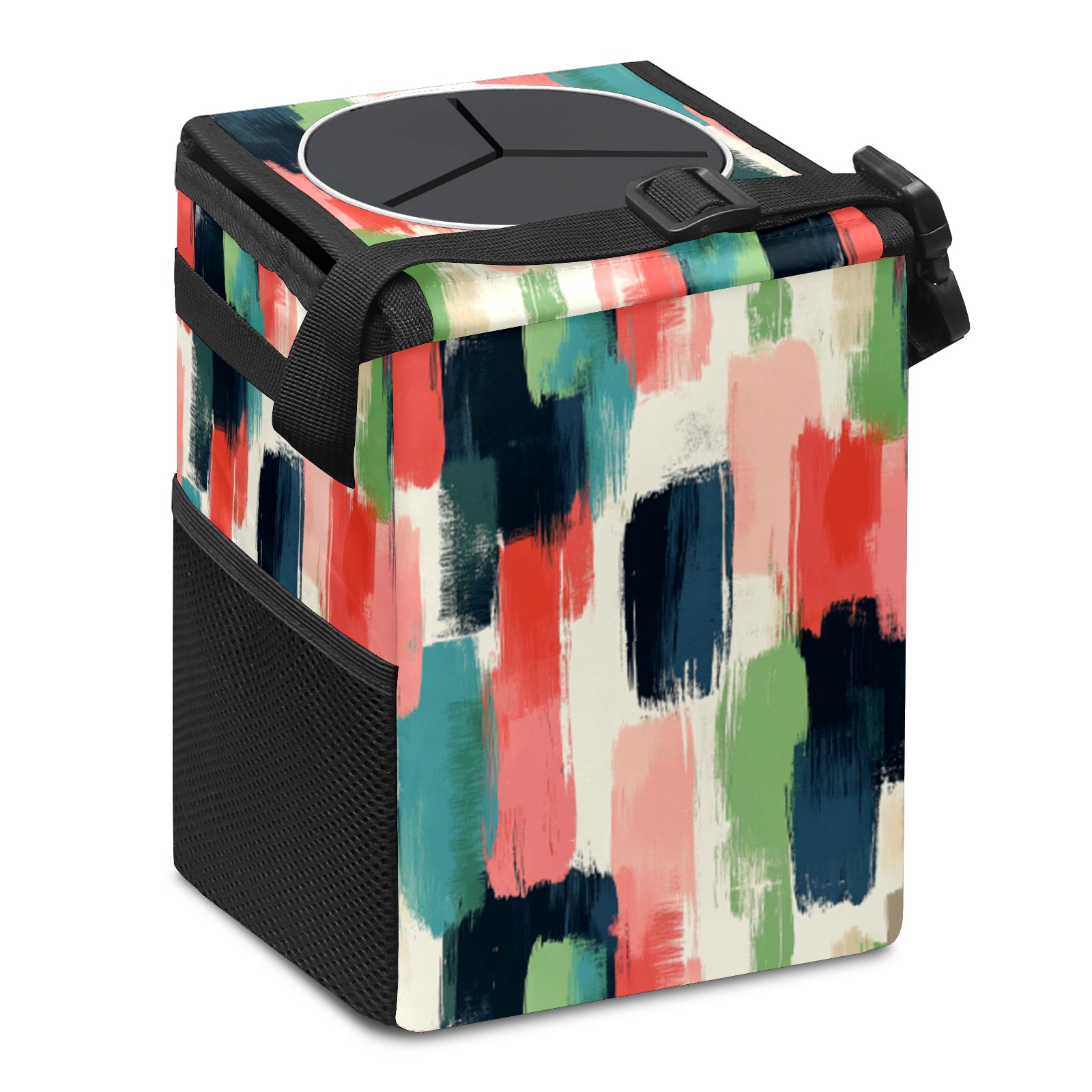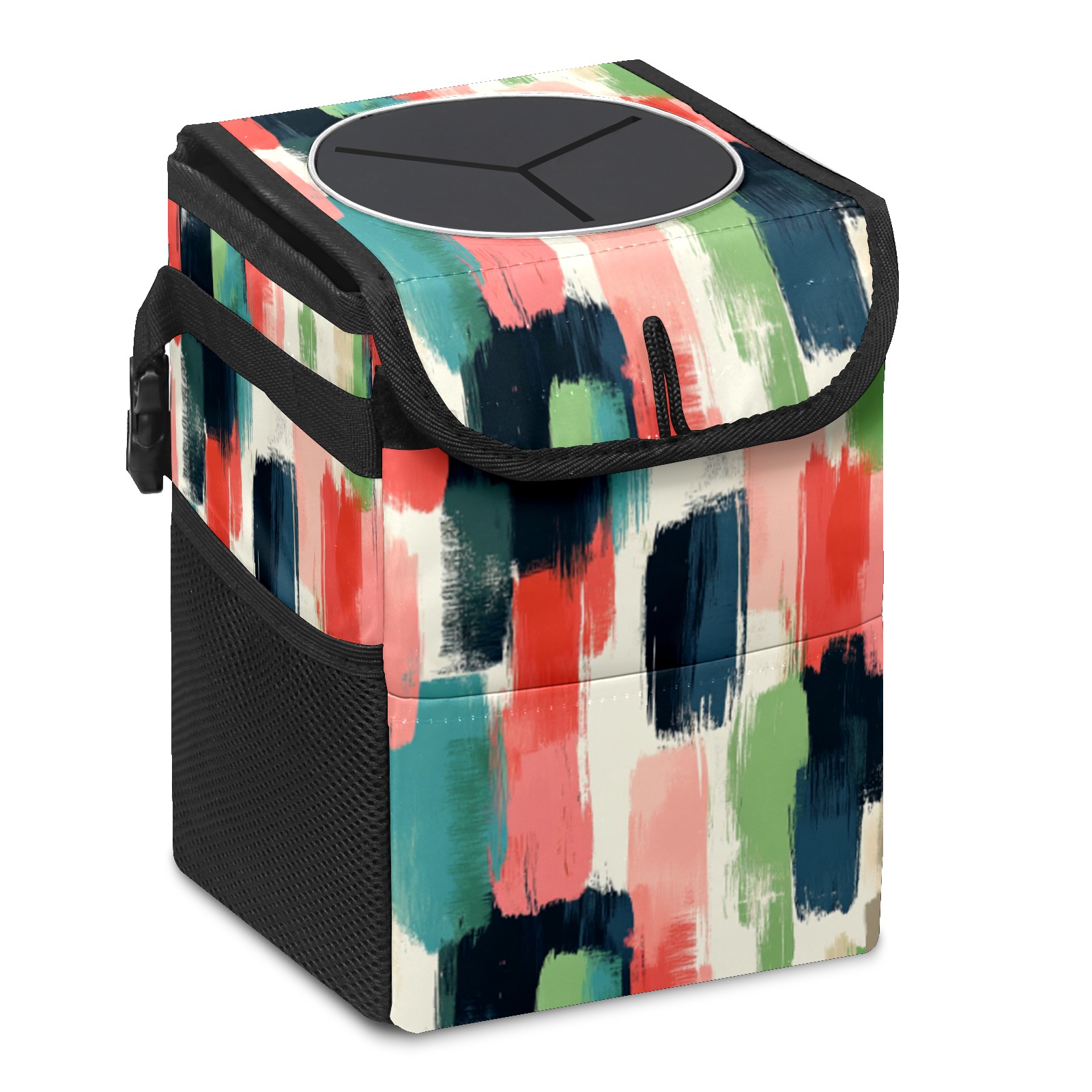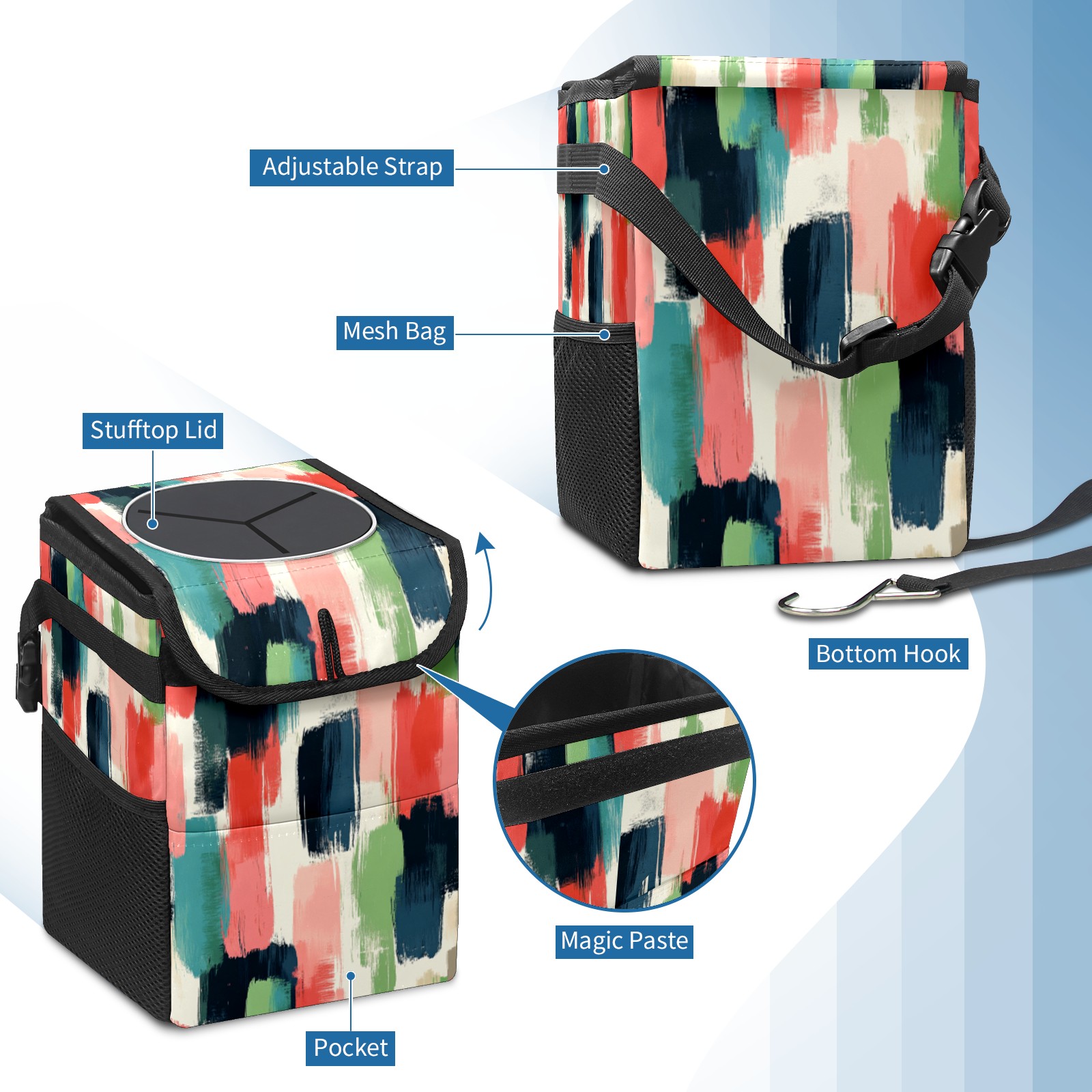 • Эта многофункциональная автомобильная мусорная корзина отличается стильным принтом, сочетающим в себе практичность и эстетику. Изготовленная из высококачественной саржевой ткани с плетеными ремнями, она прочная, долговечная и износостойкая. Размеры корзины составляют 24×17×16 см (9,5×6,7×6,3 дюйма). Верхнее отверстие имеет прорезиненное покрытие для удобной утилизации мусора; боковые сетчатые карманы и передний карман обеспечивают удобное хранение закусок, телефонов и других мелких предметов.