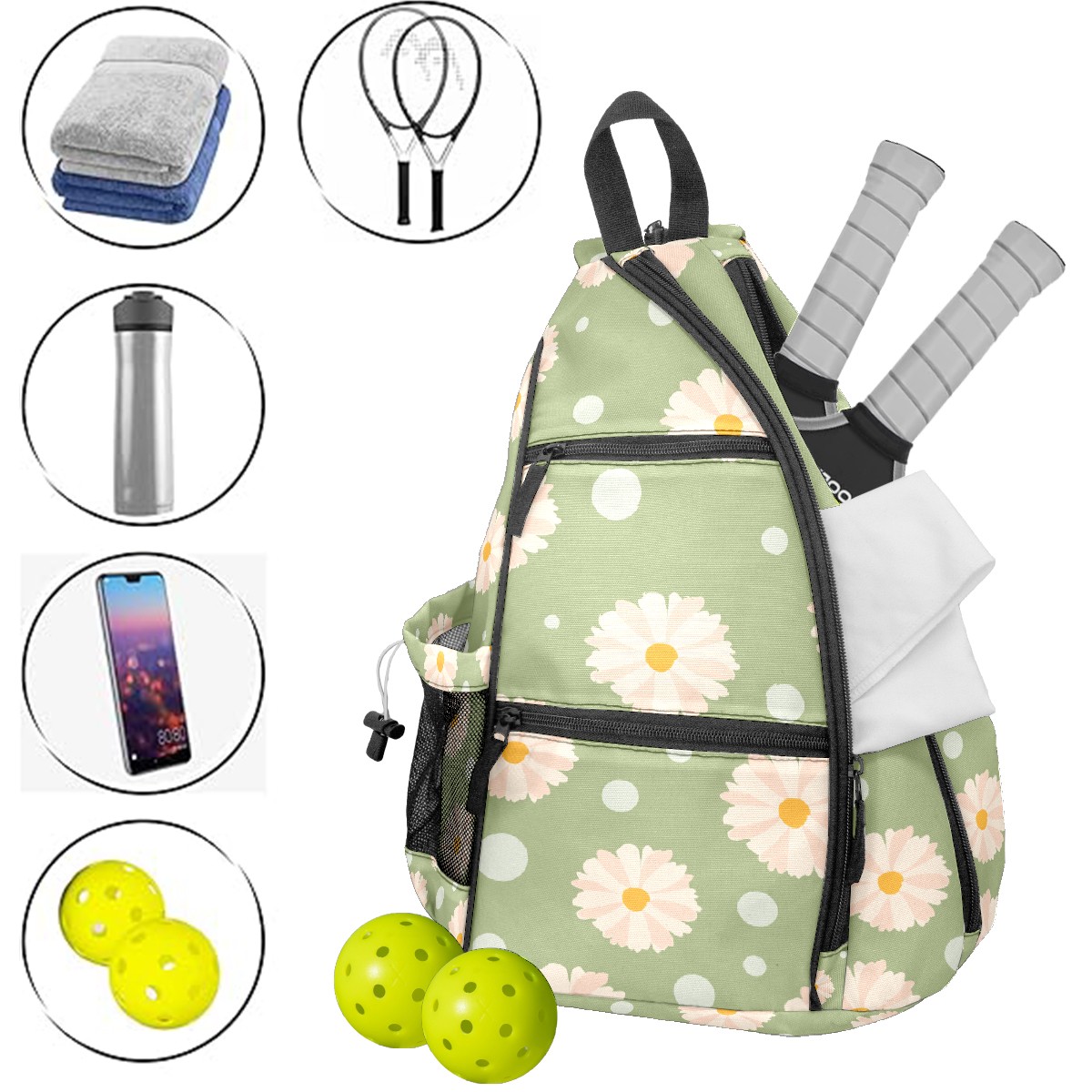 • ✅ Прочный материал Изготовлена из нейлоновой ткани + плетеного ремня + сетчатой корзины: гладкая на ощупь, приятная текстура, долговечная в использовании. ✅ Большой объем + много карманов Размер 153545см/6x13.8x17.7 дюймов, продуманная конструкция с несколькими карманами позволяет удобно разложить аксессуары для пикебола, не беспокоясь о нехватке места. ✅ Максимальный комфорт ношения Подушенное спинное отделение + регулируемые сетчатые плечевые ремни эффективно предотвращают растяжение мышц и боль в плечах, даже при длительном ношении. ✅ Универсальное использование Ремни выполнены по технологии съемного молния — регулируемый способ ношения. Подходит как повседневная поясная сумка для поездок, прогулок и других мероприятий, также является идеальным подарком для друзей и близких!