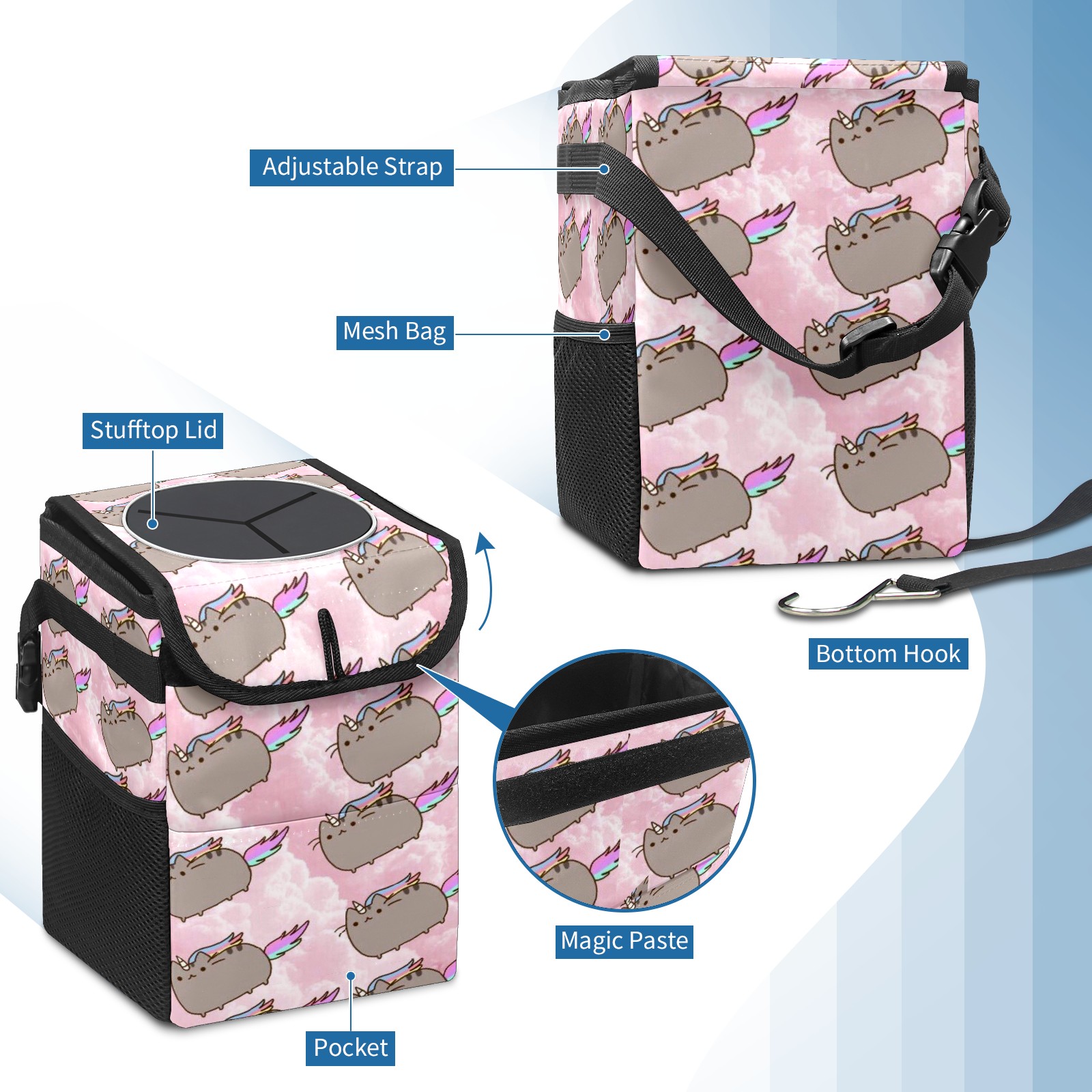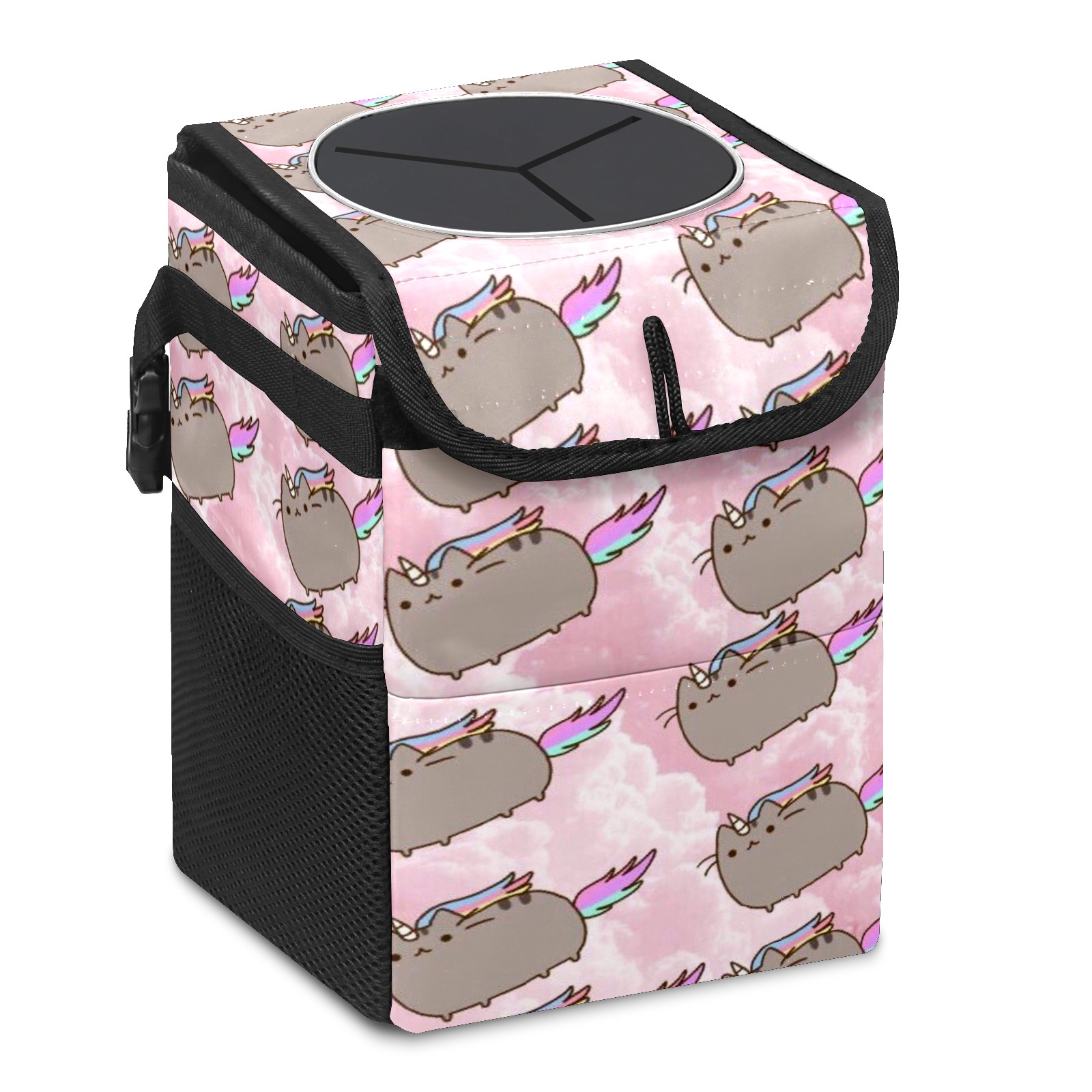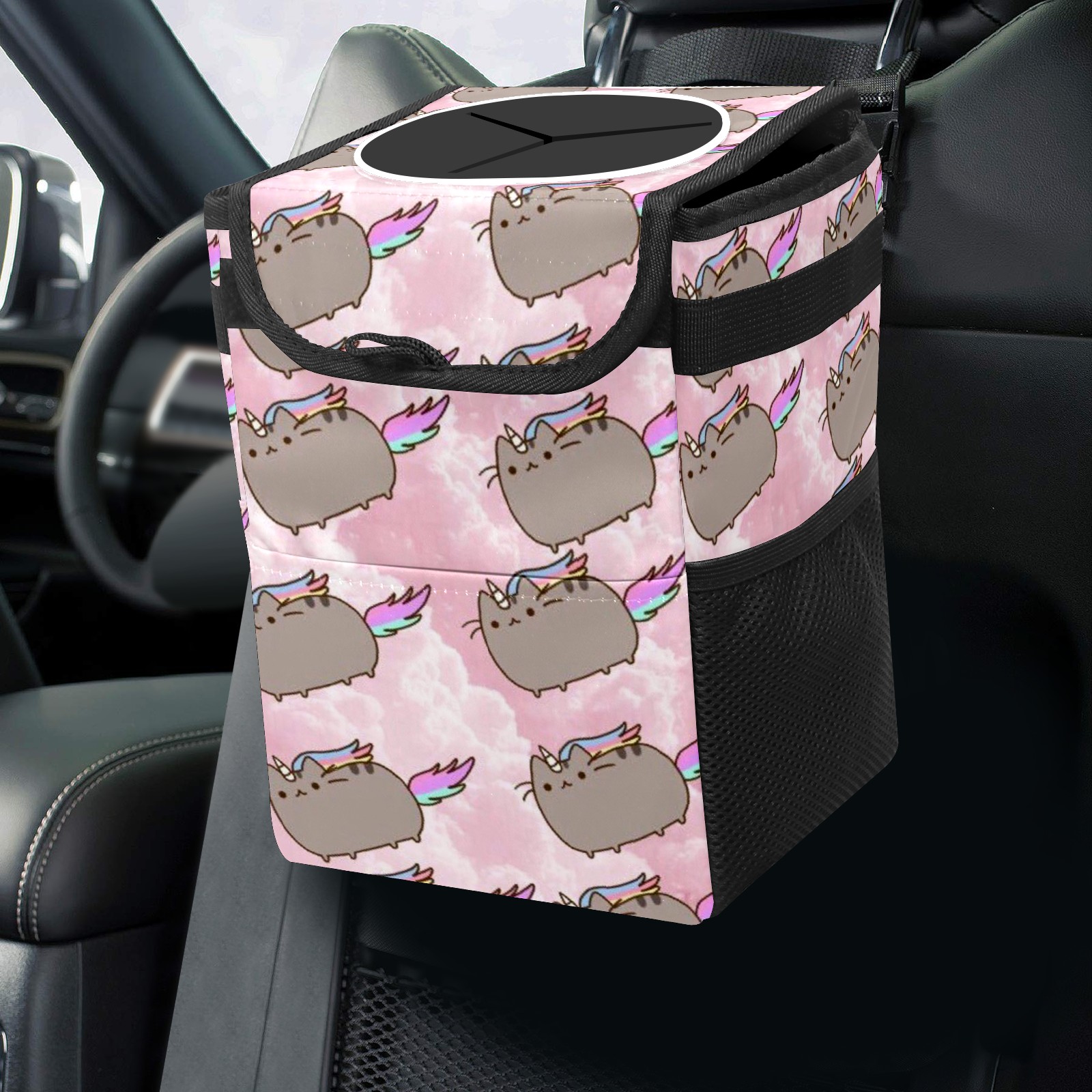 • Эта многофункциональная автомобильная мусорная корзина отличается стильным принтом, сочетающим в себе практичность и эстетику. Изготовленная из высококачественной саржевой ткани с плетеными ремнями, она прочная, долговечная и износостойкая. Размеры корзины составляют 24×17×16 см (9,5×6,7×6,3 дюйма). Верхнее отверстие имеет прорезиненное покрытие для удобной утилизации мусора; боковые сетчатые карманы и передний карман обеспечивают удобное хранение закусок, телефонов и других мелких предметов.