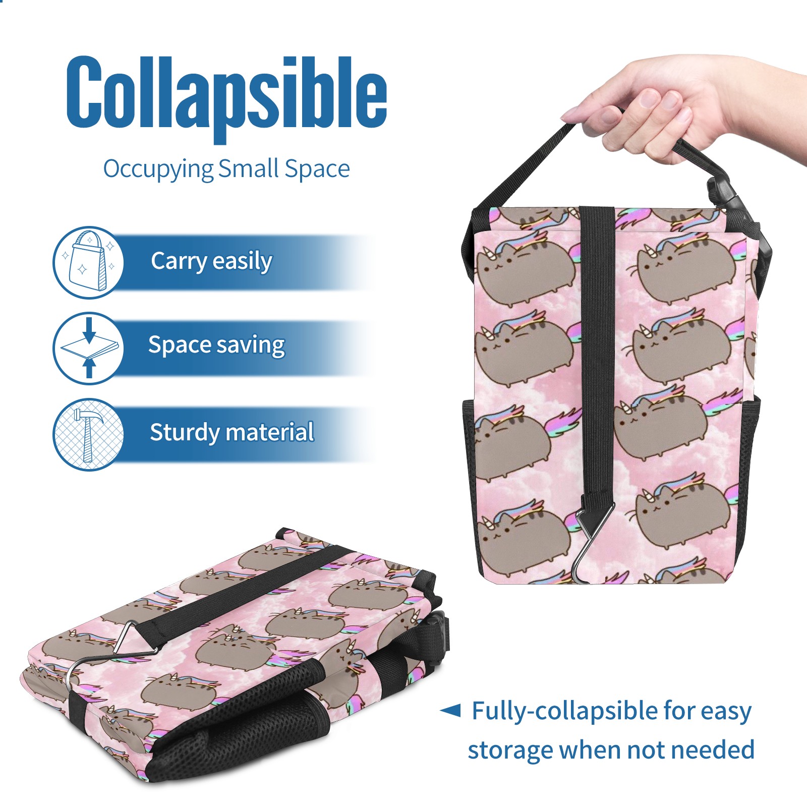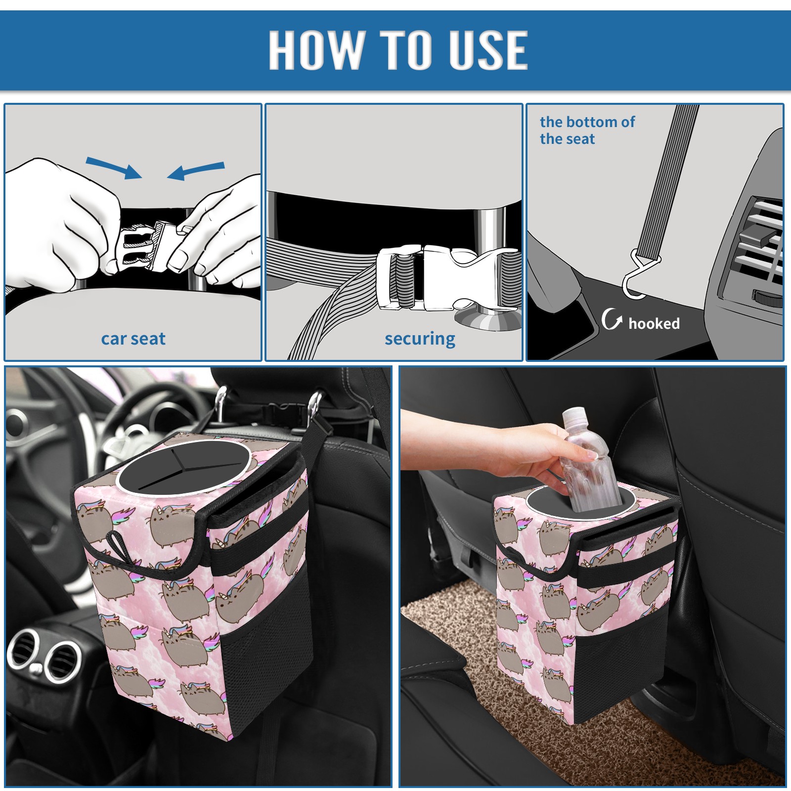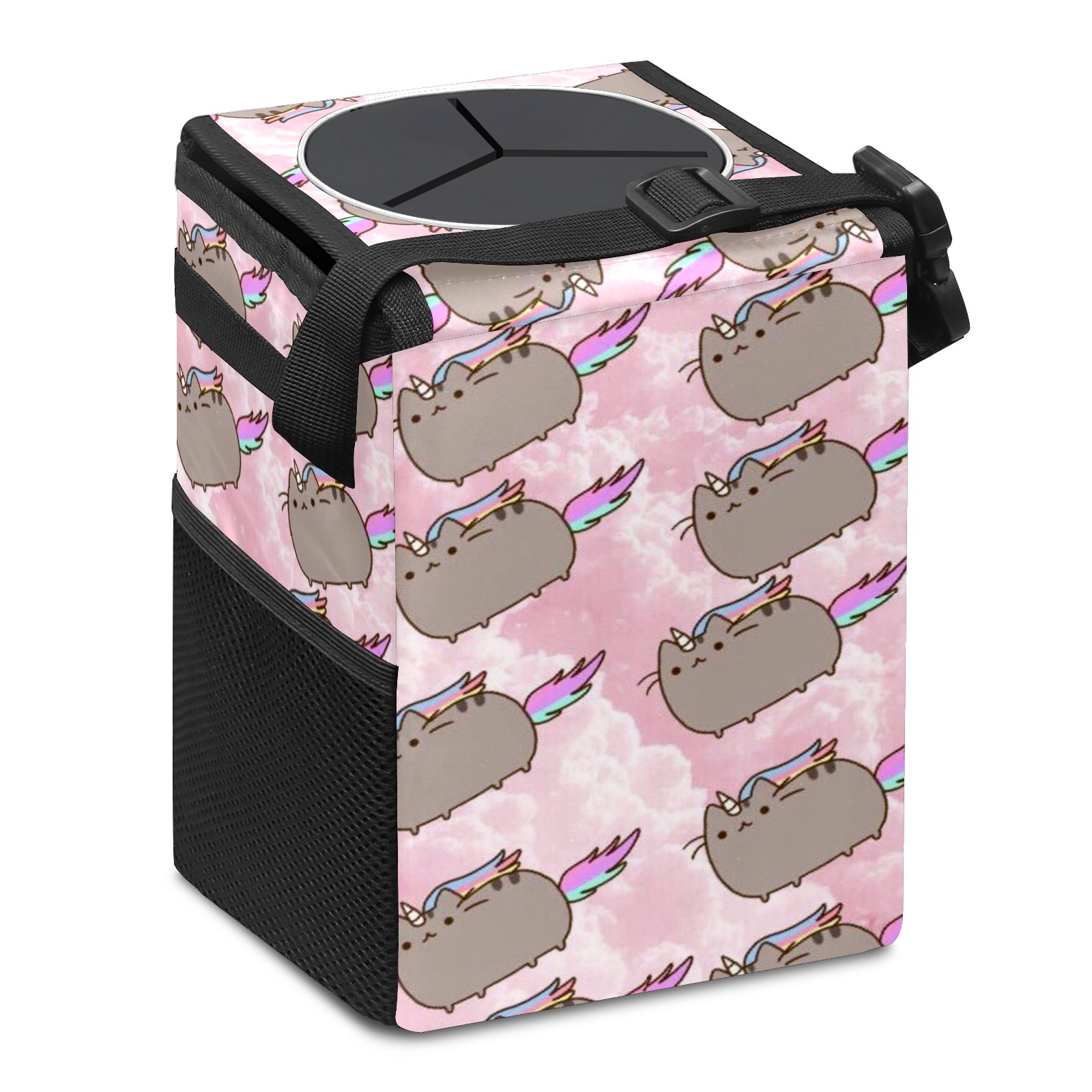 • Эта многофункциональная автомобильная мусорная корзина отличается стильным принтом, сочетающим в себе практичность и эстетику. Изготовленная из высококачественной саржевой ткани с плетеными ремнями, она прочная, долговечная и износостойкая. Размеры корзины составляют 24×17×16 см (9,5×6,7×6,3 дюйма). Верхнее отверстие имеет прорезиненное покрытие для удобной утилизации мусора; боковые сетчатые карманы и передний карман обеспечивают удобное хранение закусок, телефонов и других мелких предметов.