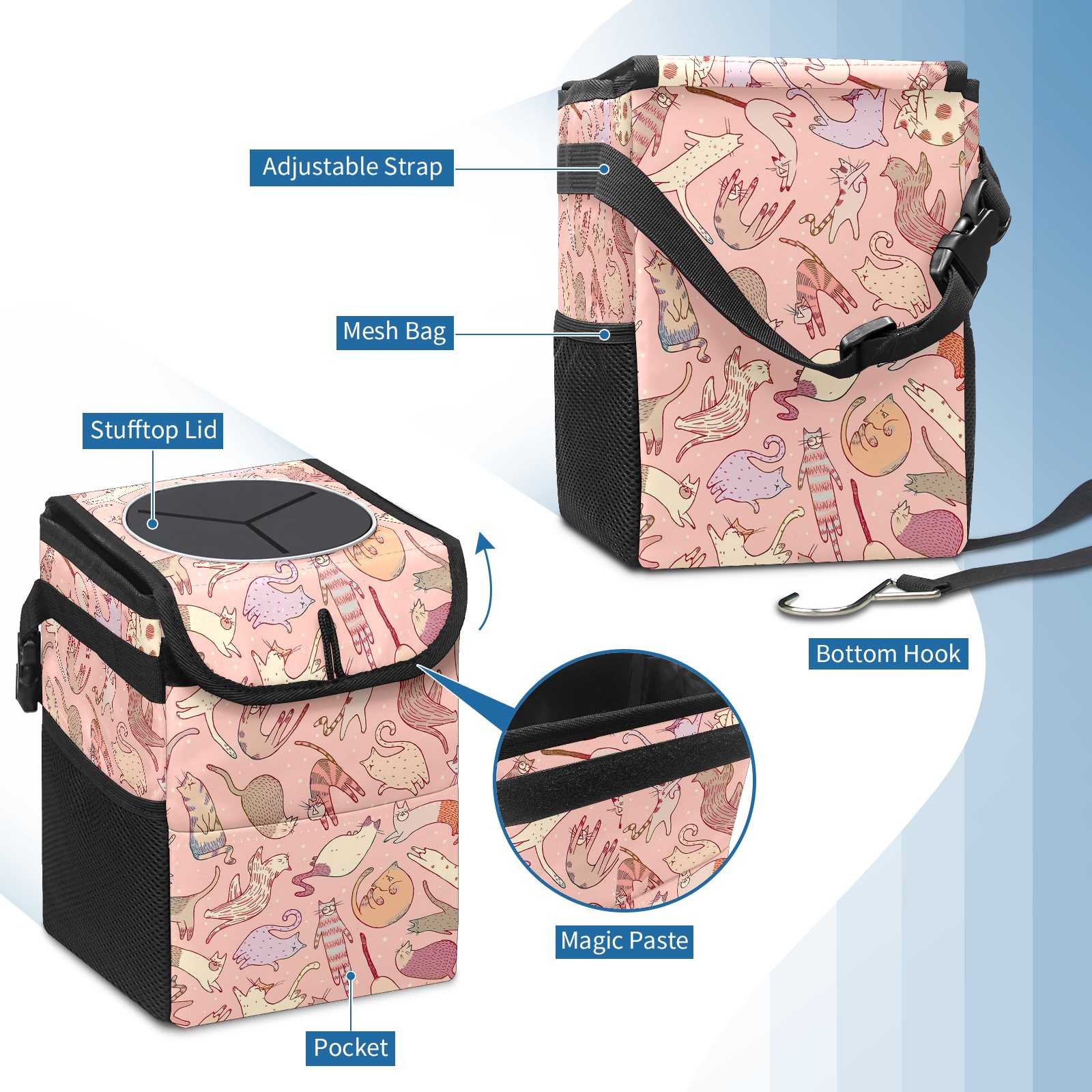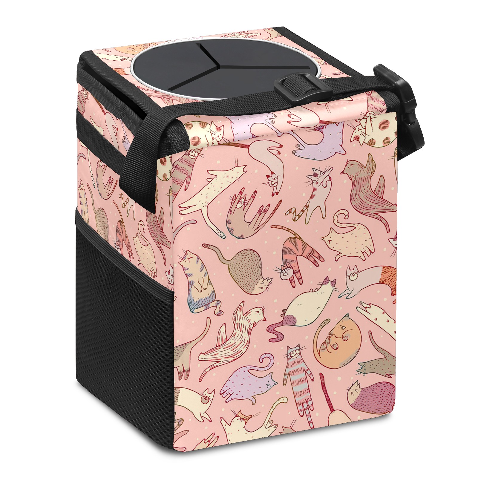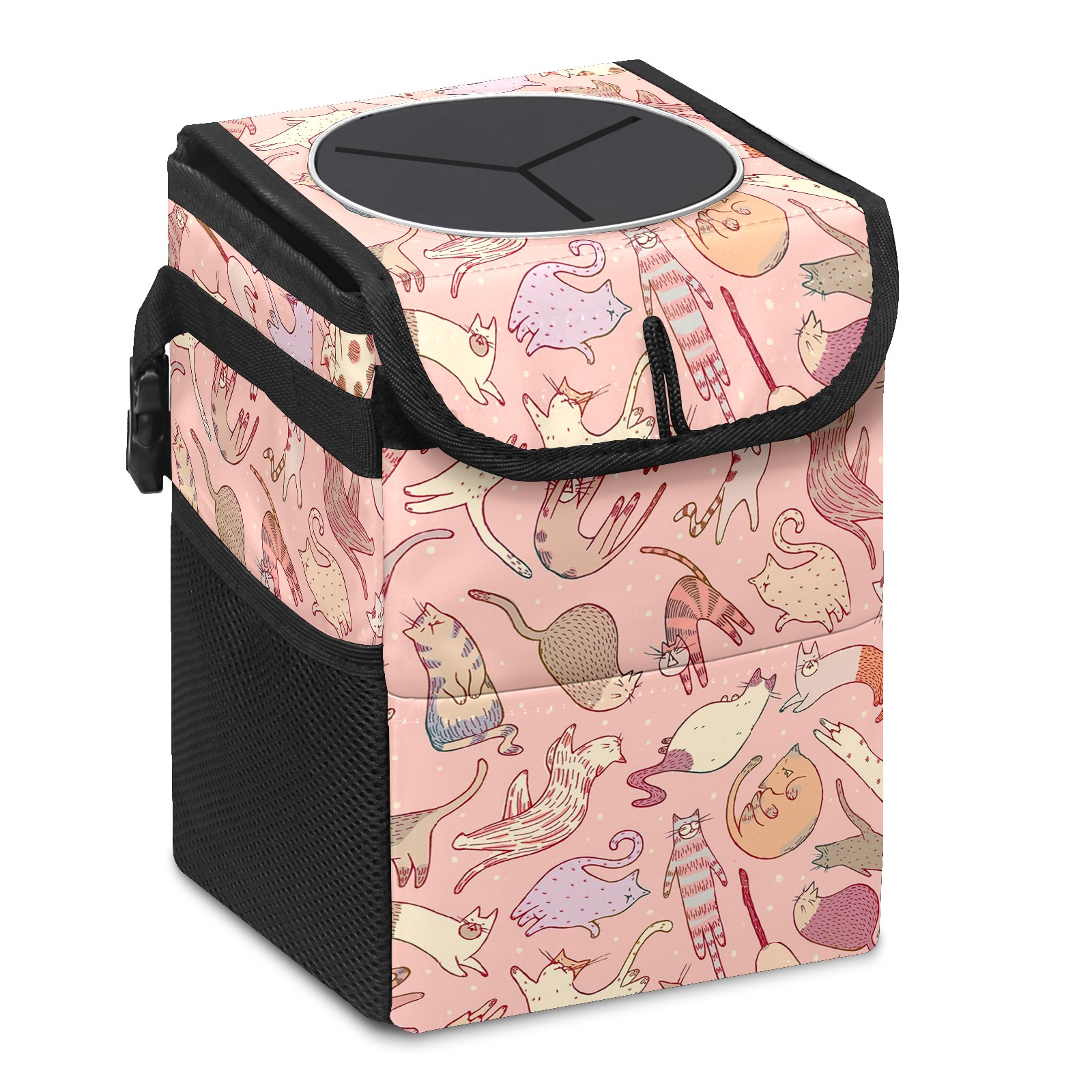 • Эта многофункциональная автомобильная мусорная корзина отличается стильным принтом, сочетающим в себе практичность и эстетику. Изготовленная из высококачественной саржевой ткани с плетеными ремнями, она прочная, долговечная и износостойкая. Размеры корзины составляют 24×17×16 см (9,5×6,7×6,3 дюйма). Верхнее отверстие имеет прорезиненное покрытие для удобной утилизации мусора; боковые сетчатые карманы и передний карман обеспечивают удобное хранение закусок, телефонов и других мелких предметов.