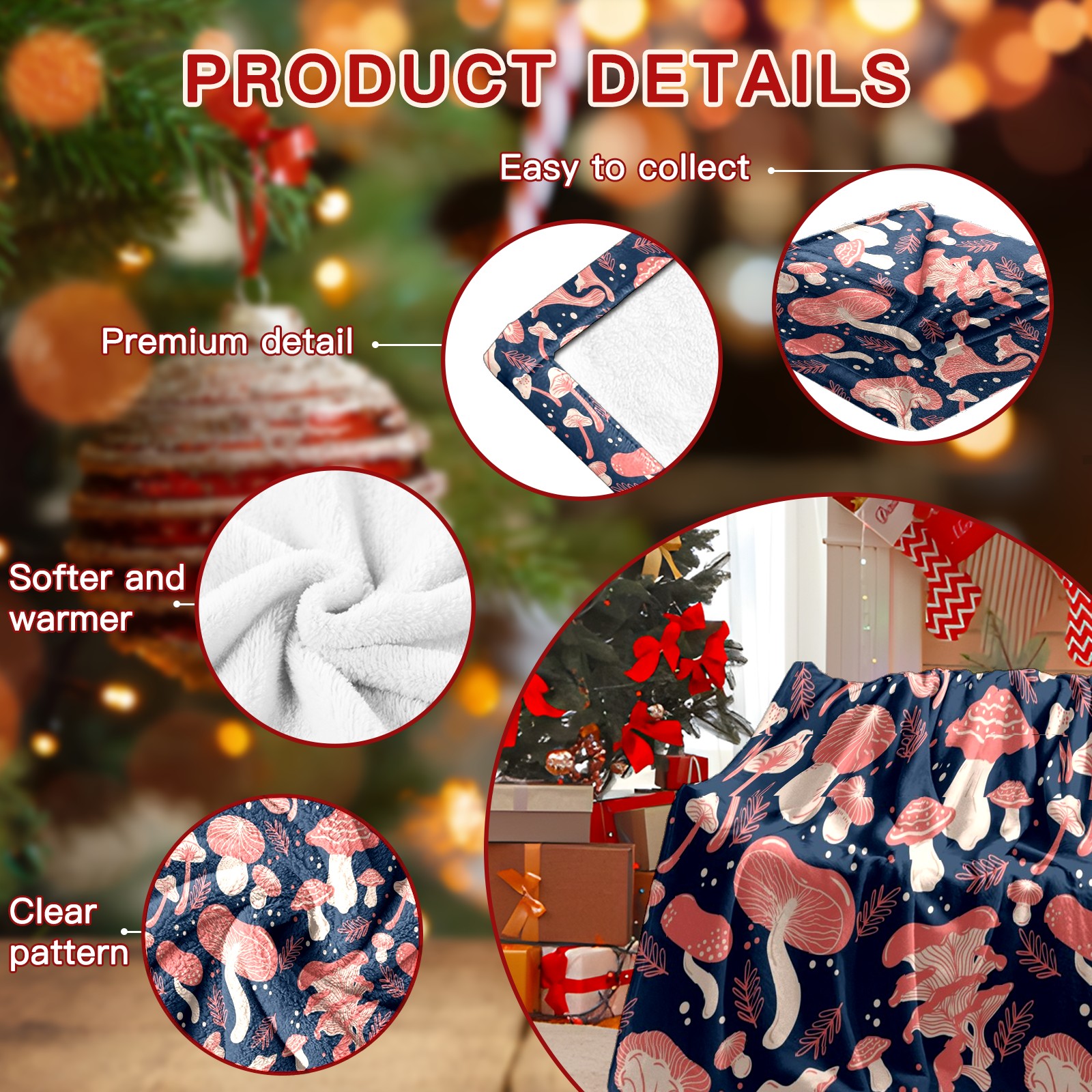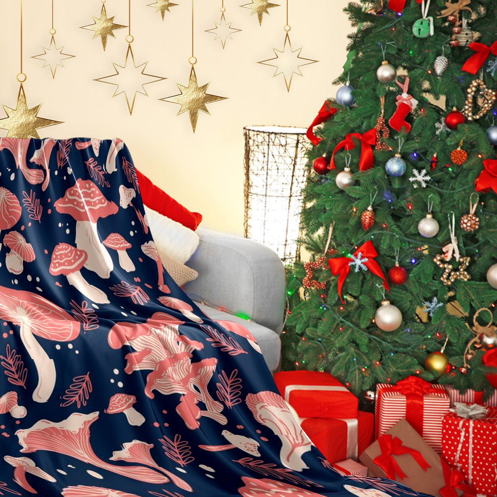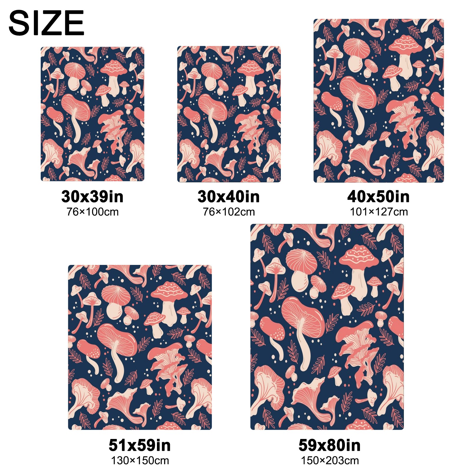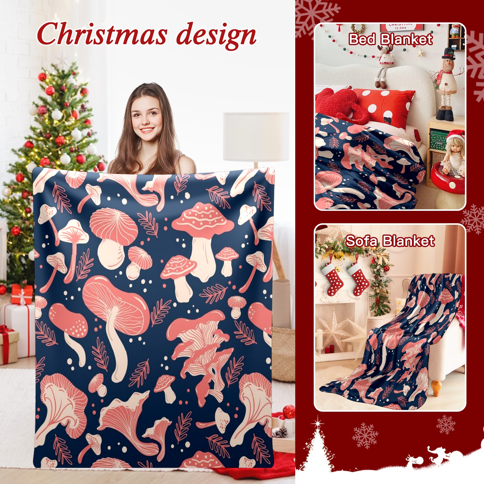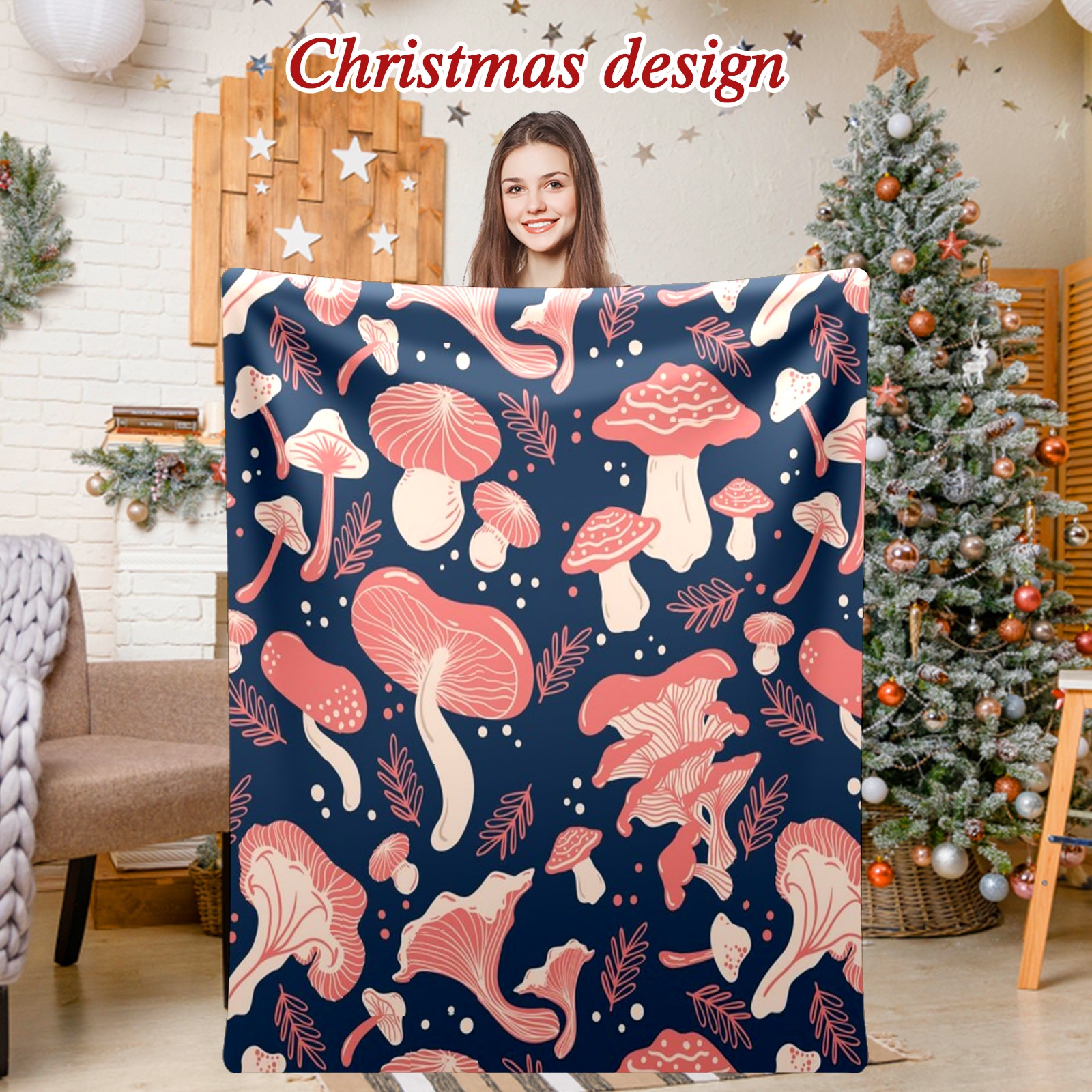 Премиальная фланелевая одеяло Navy Blue Pink Mushroom