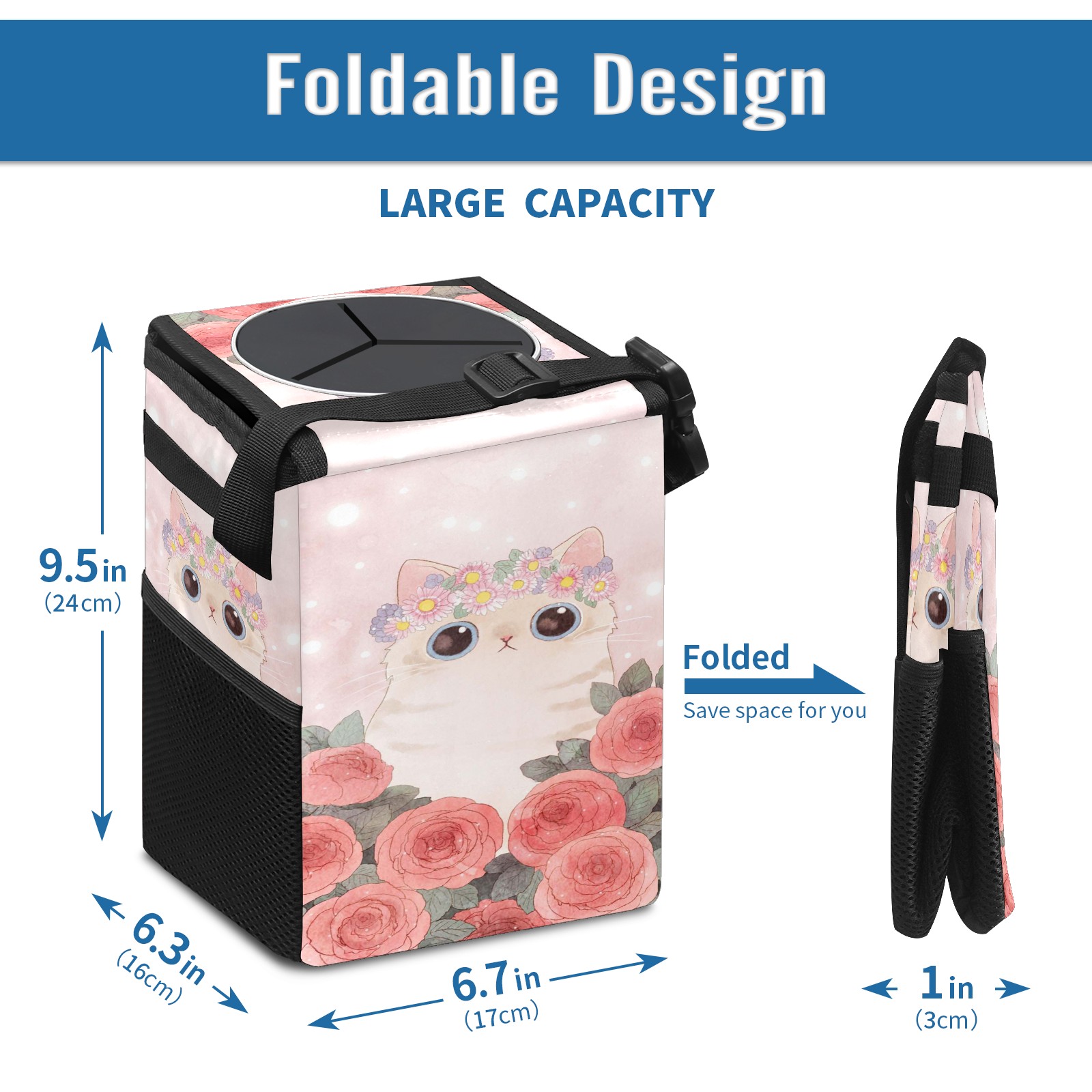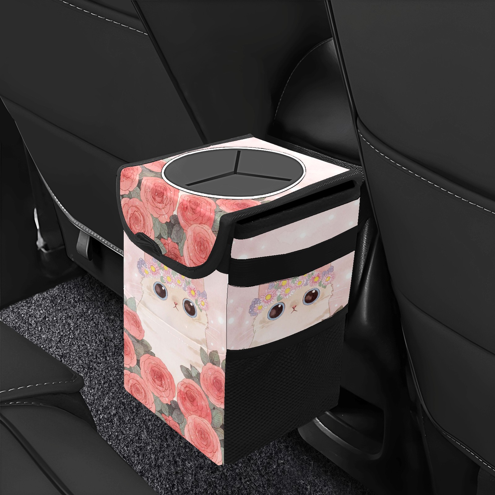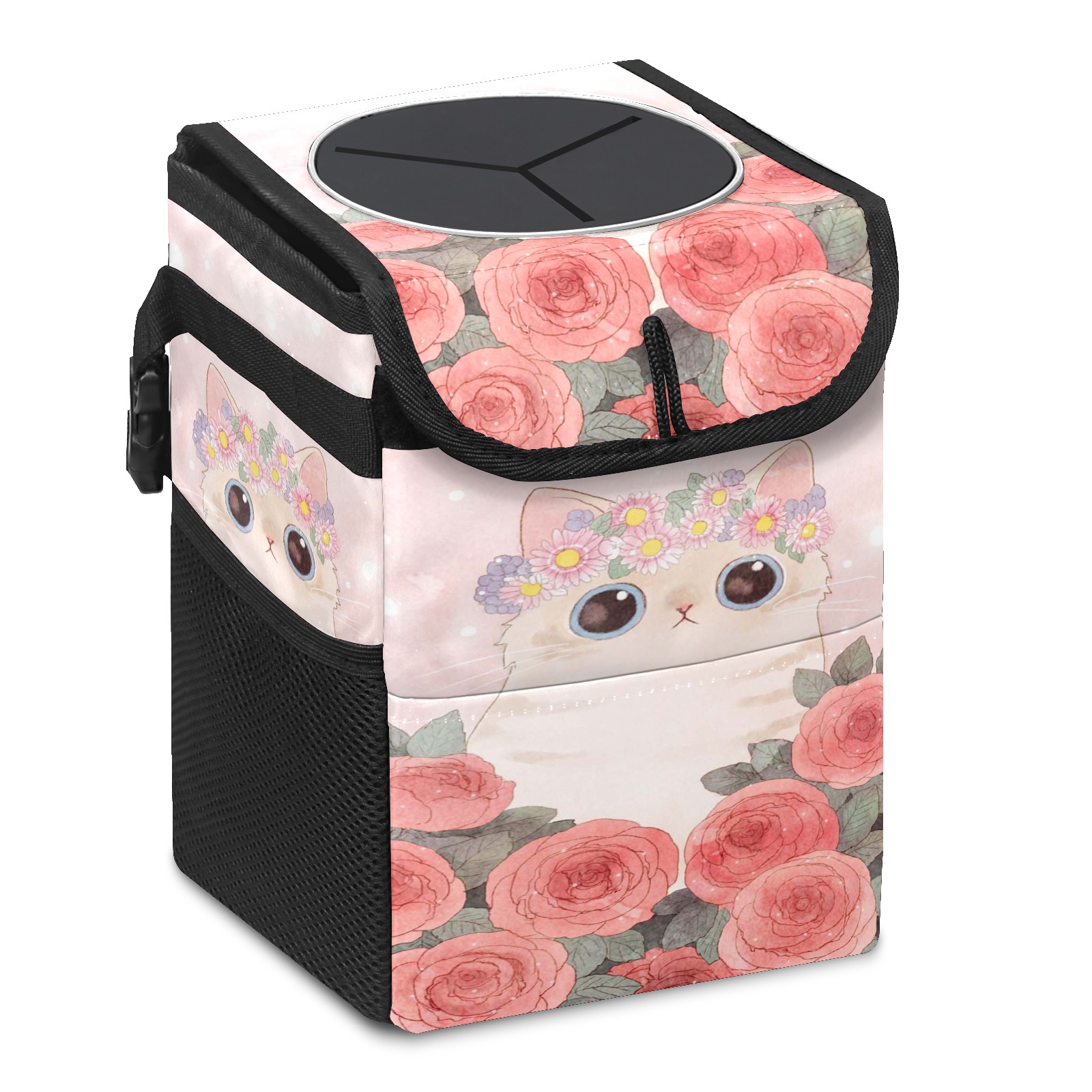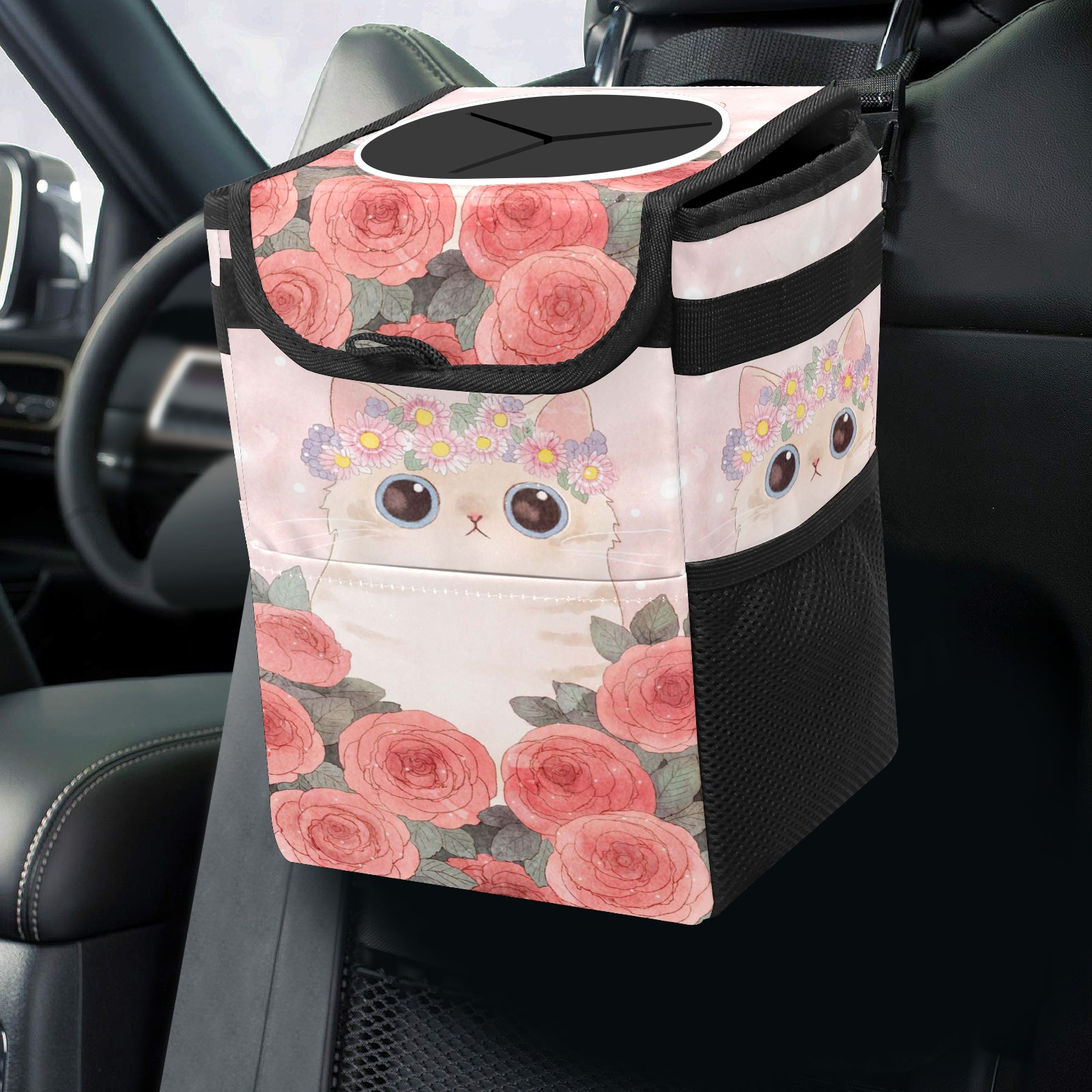 • Эта многофункциональная автомобильная мусорная корзина отличается стильным принтом, сочетающим в себе практичность и эстетику. Изготовленная из высококачественной саржевой ткани с плетеными ремнями, она прочная, долговечная и износостойкая. Размеры корзины составляют 24×17×16 см (9,5×6,7×6,3 дюйма). Верхнее отверстие имеет прорезиненное покрытие для удобной утилизации мусора; боковые сетчатые карманы и передний карман обеспечивают удобное хранение закусок, телефонов и других мелких предметов.