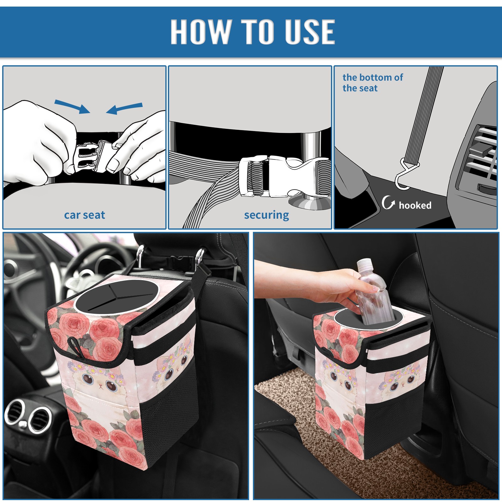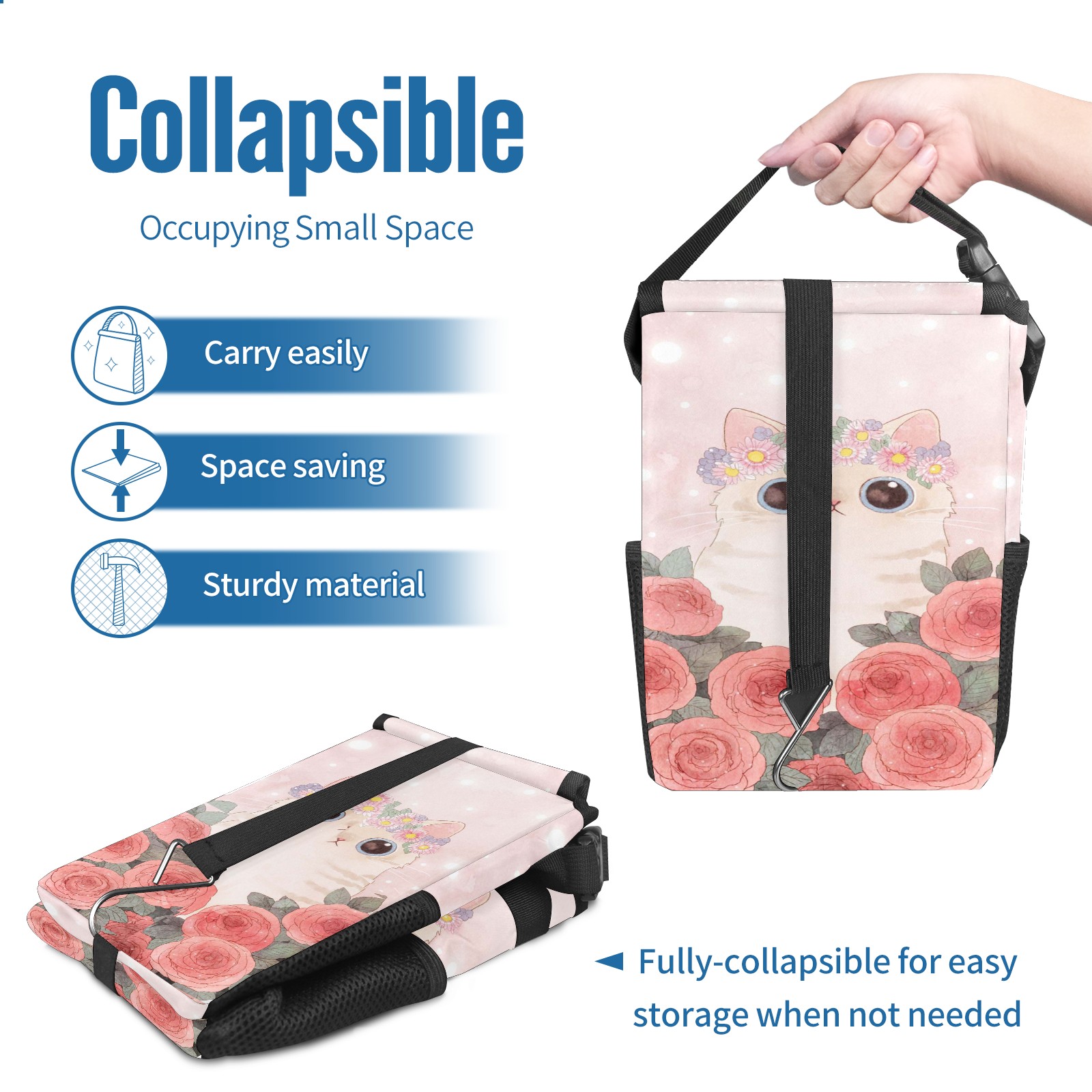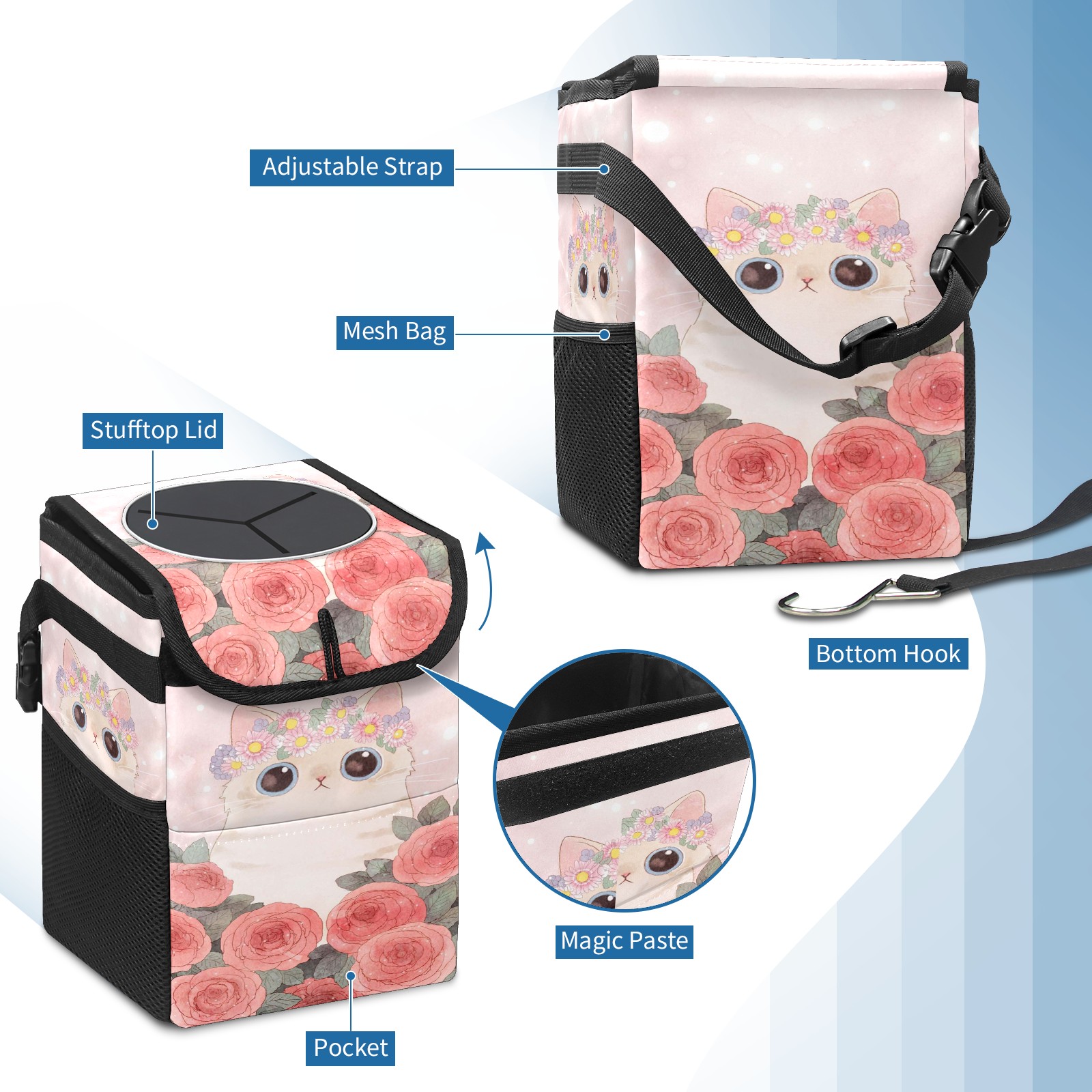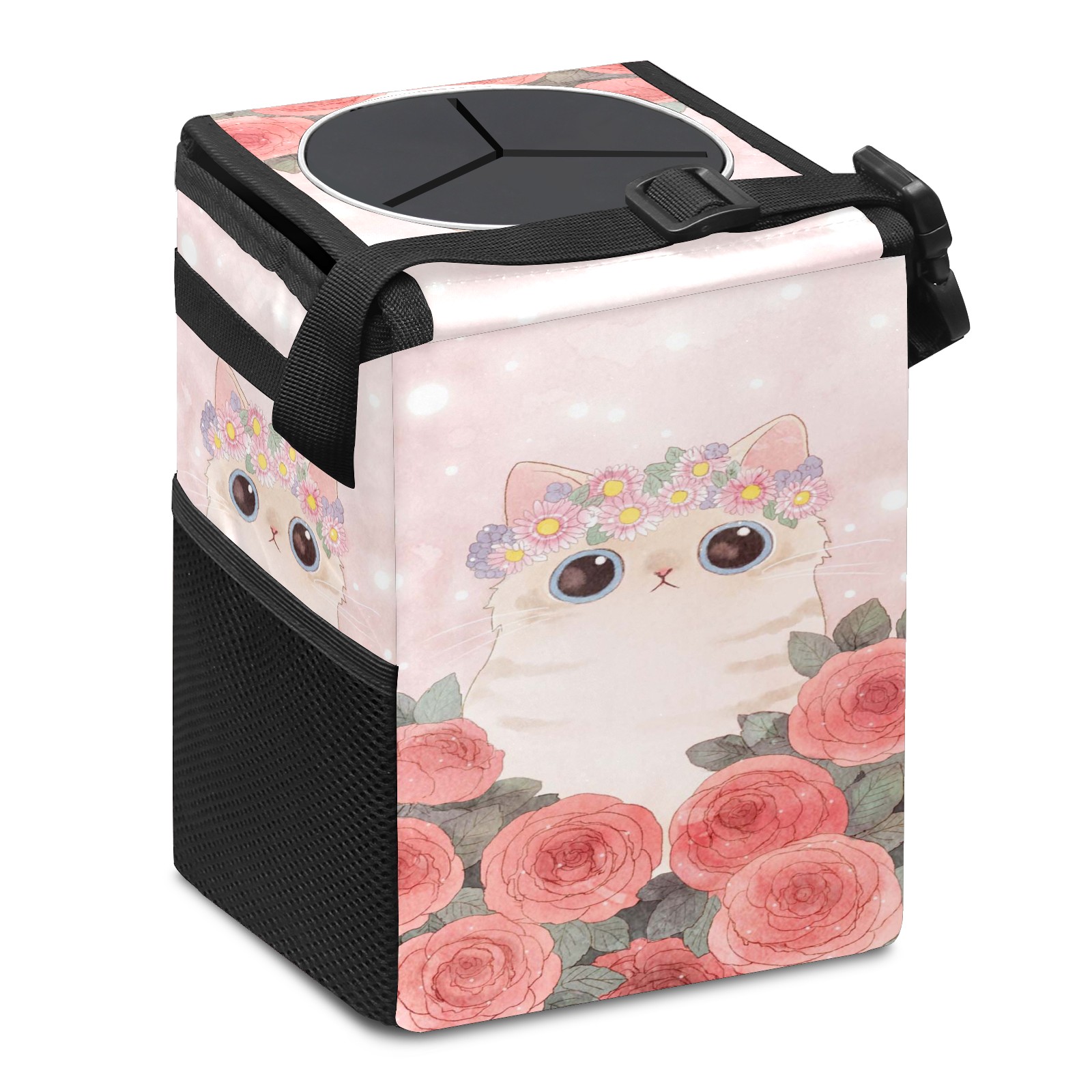 • Эта многофункциональная автомобильная мусорная корзина отличается стильным принтом, сочетающим в себе практичность и эстетику. Изготовленная из высококачественной саржевой ткани с плетеными ремнями, она прочная, долговечная и износостойкая. Размеры корзины составляют 24×17×16 см (9,5×6,7×6,3 дюйма). Верхнее отверстие имеет прорезиненное покрытие для удобной утилизации мусора; боковые сетчатые карманы и передний карман обеспечивают удобное хранение закусок, телефонов и других мелких предметов.
