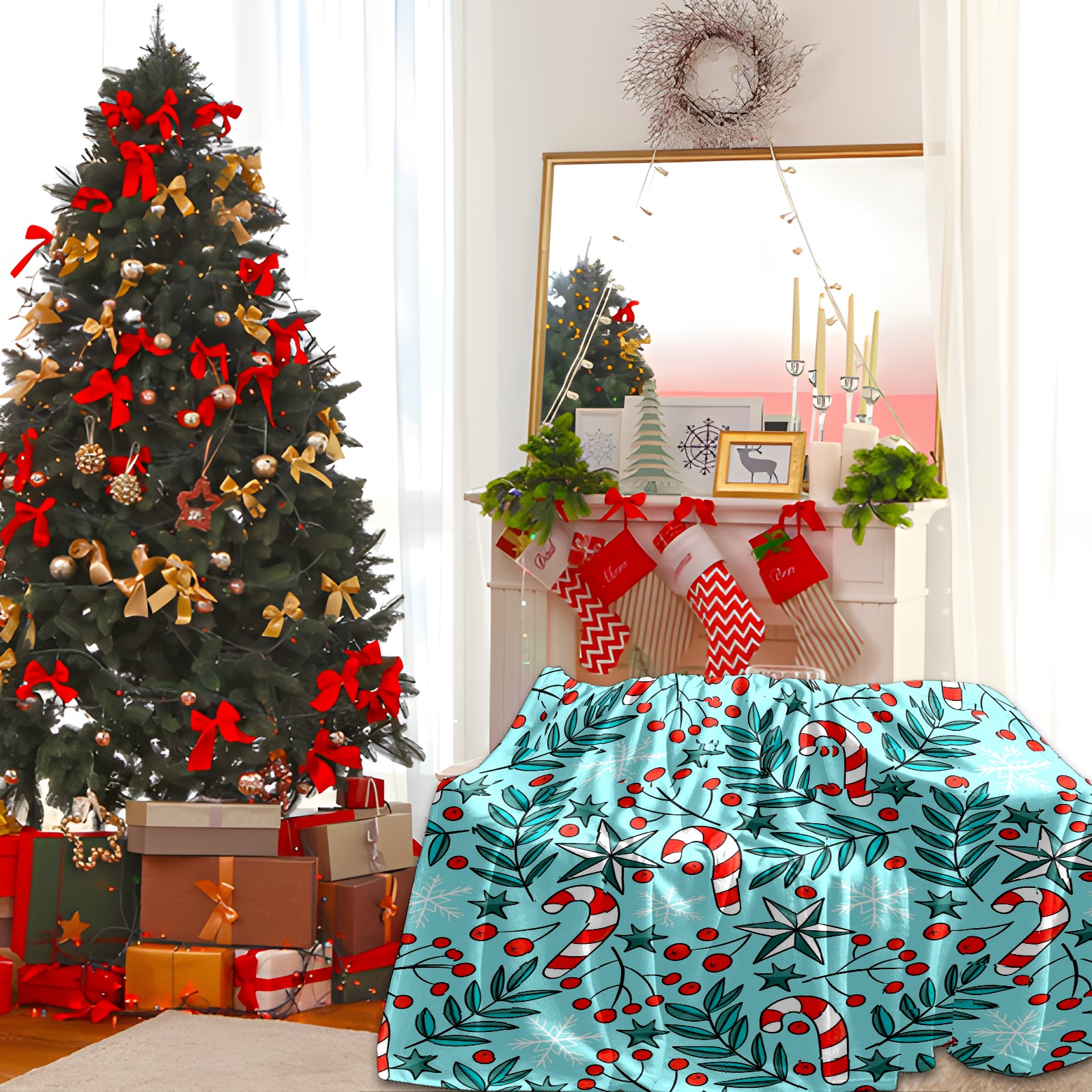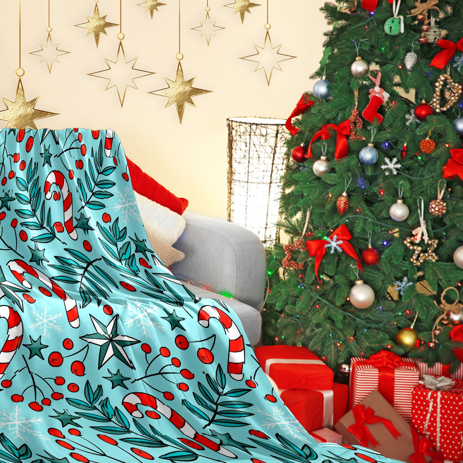 Премиальная фланелевая одеяло Blue Christams Leaves