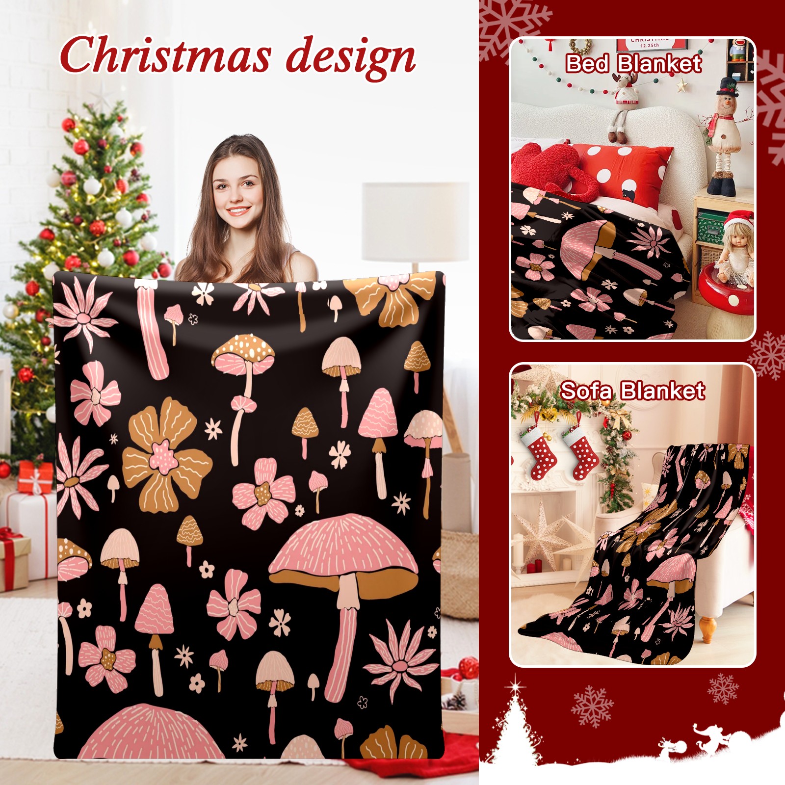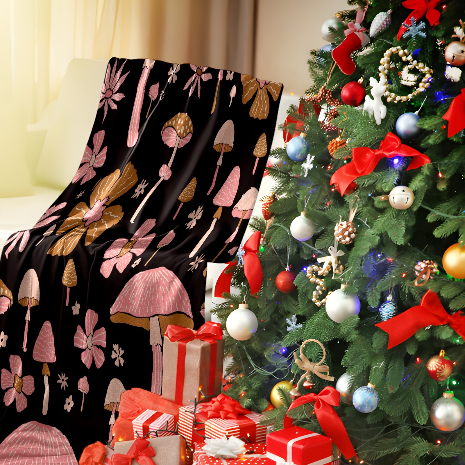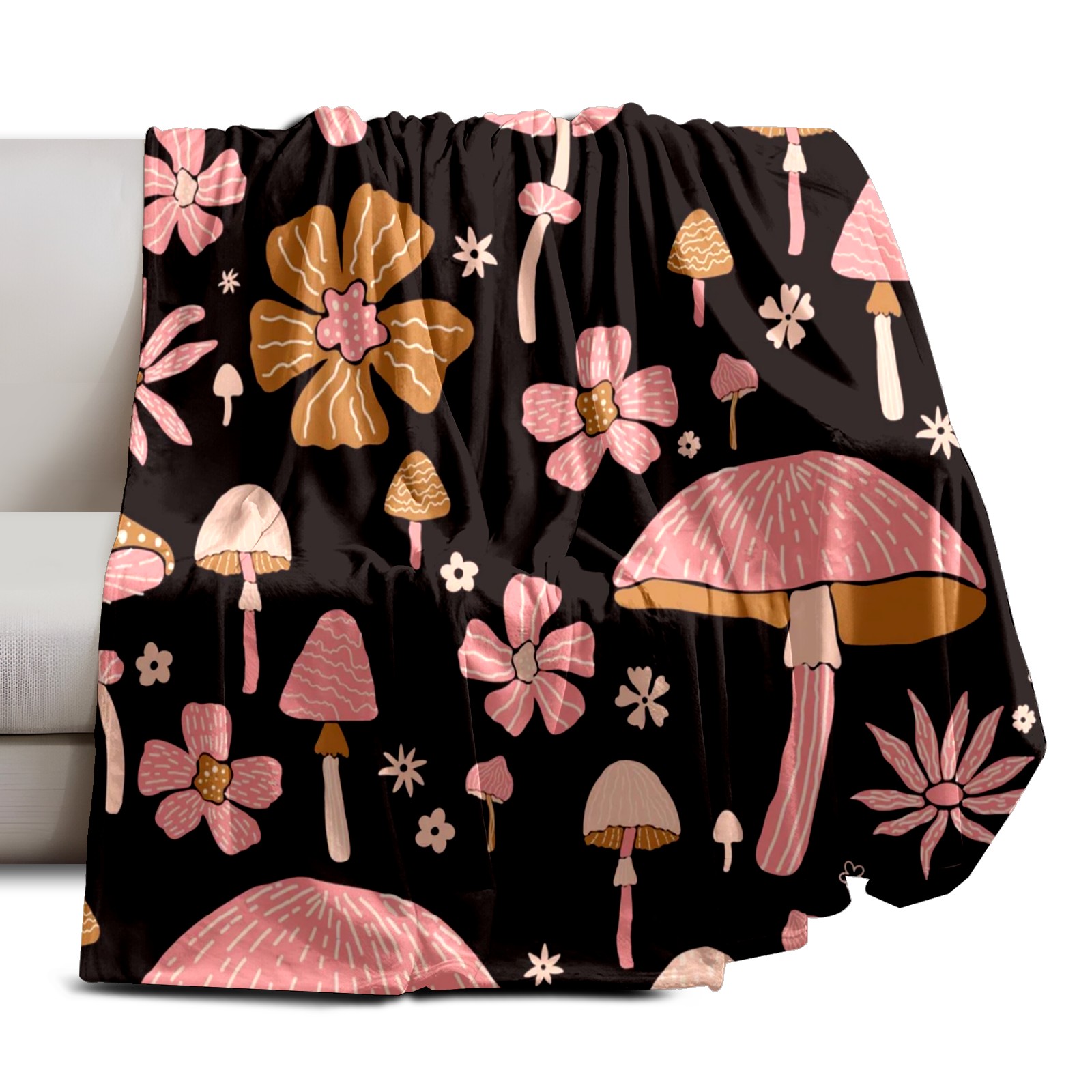 Премиальная фланелевая одеяло Black Pink Flowers Mushroom