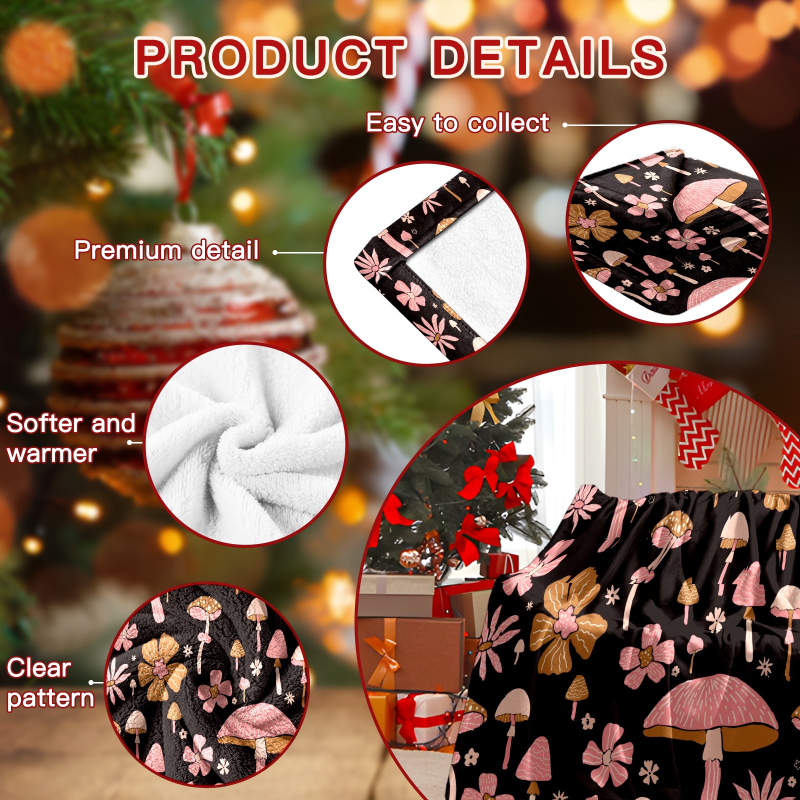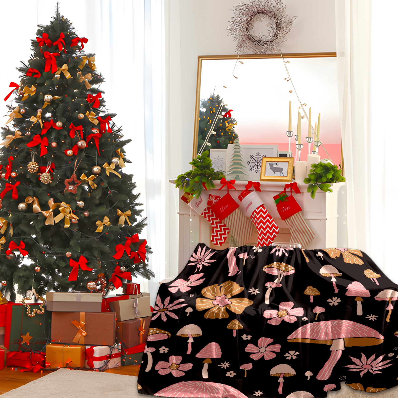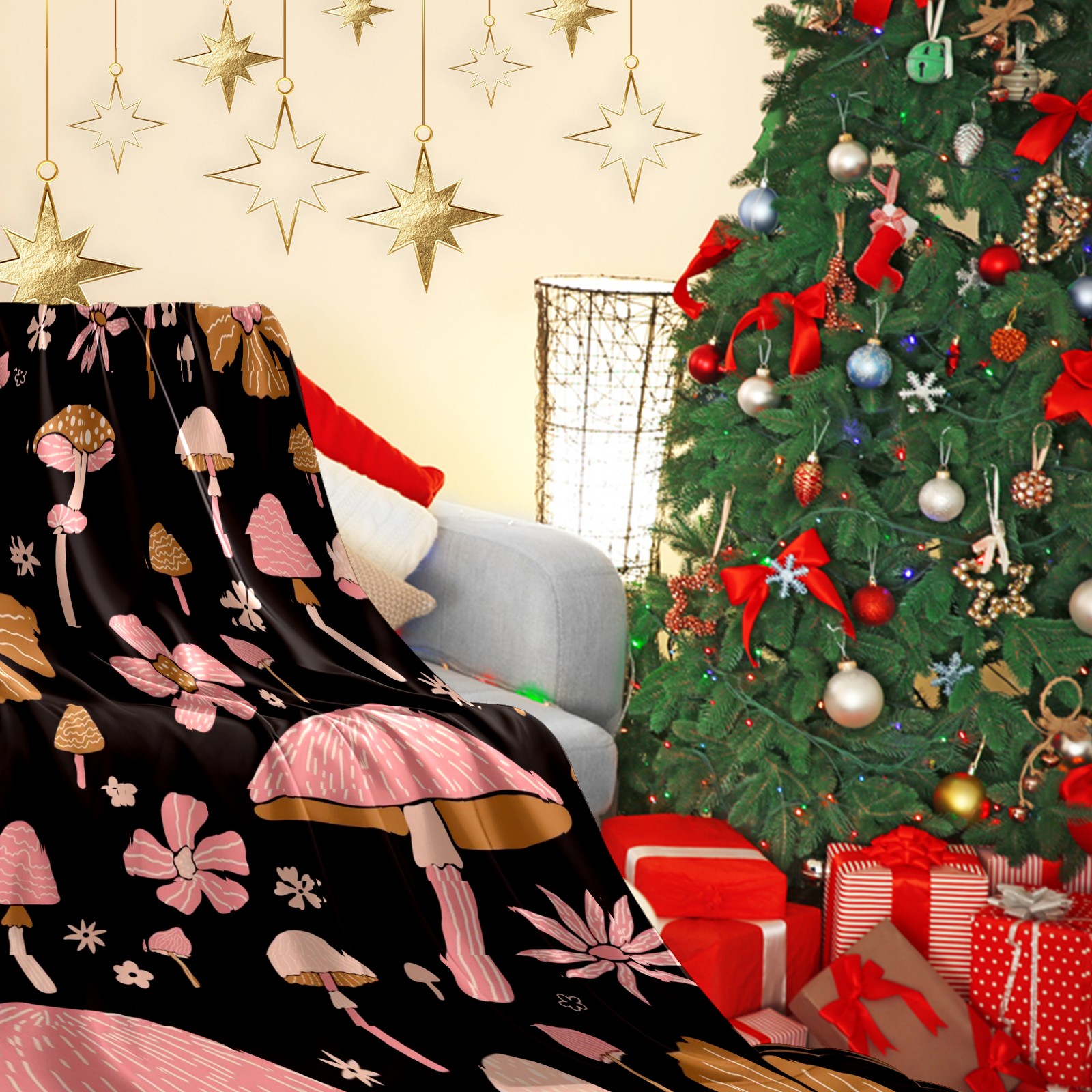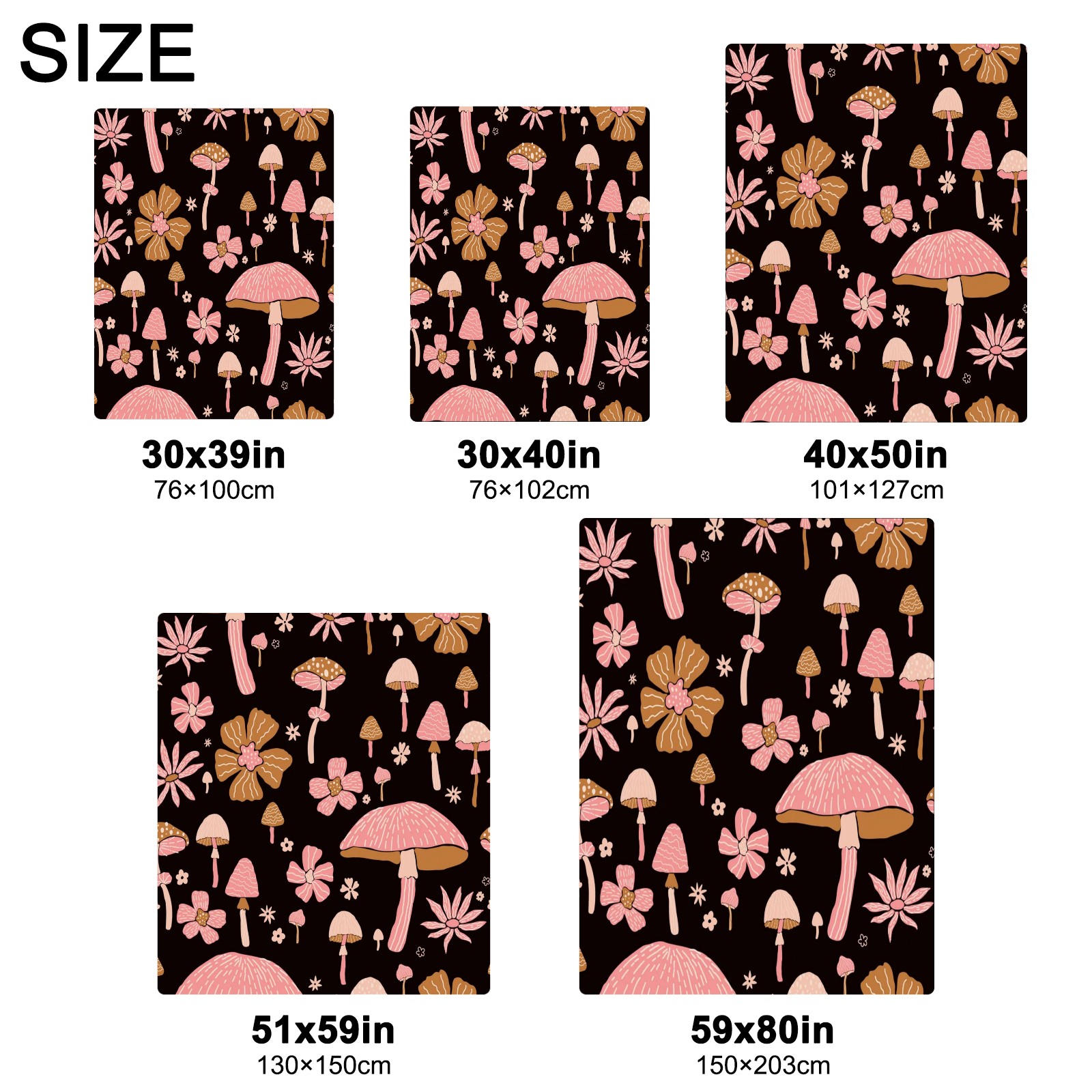 Премиальная фланелевая одеяло Black Pink Flowers Mushroom