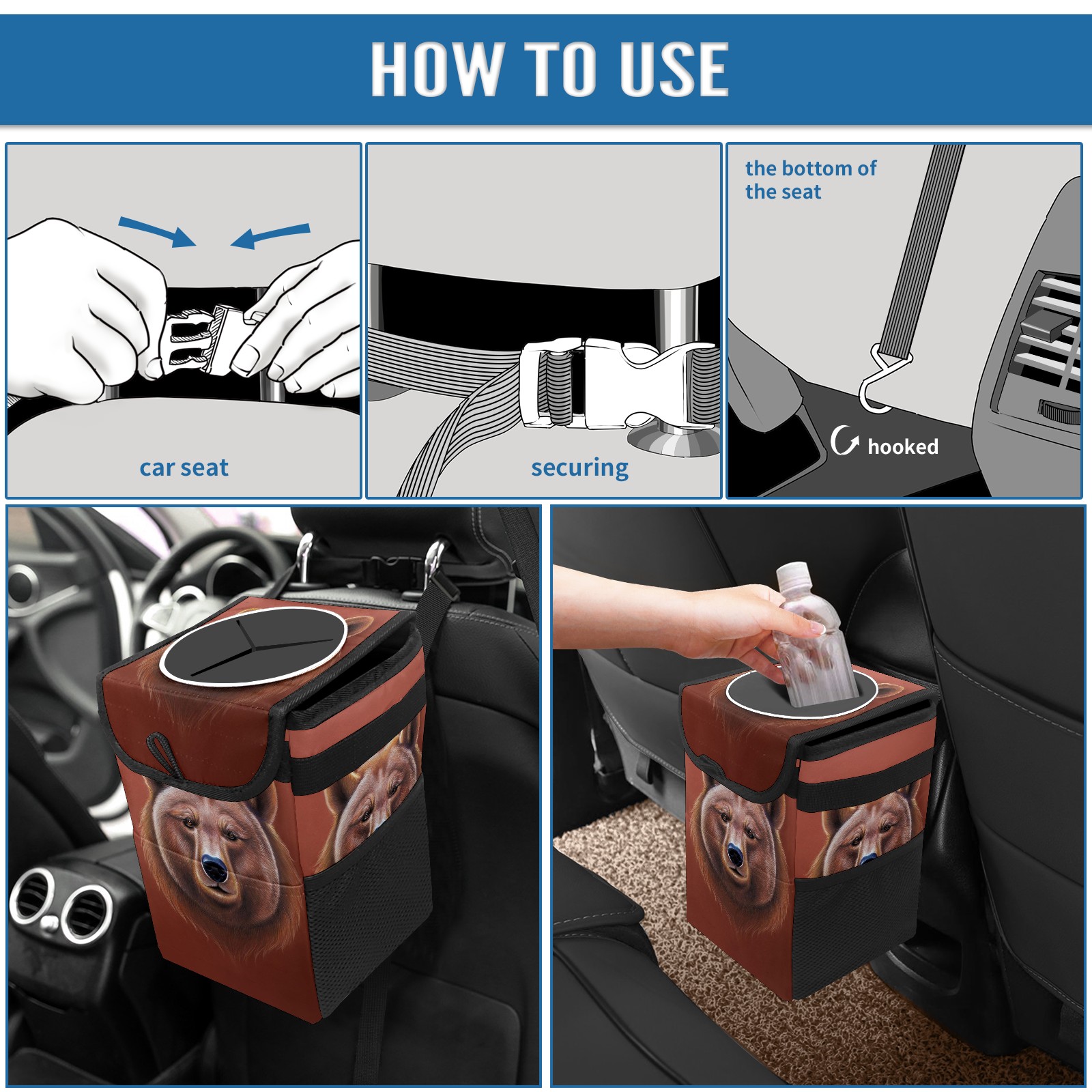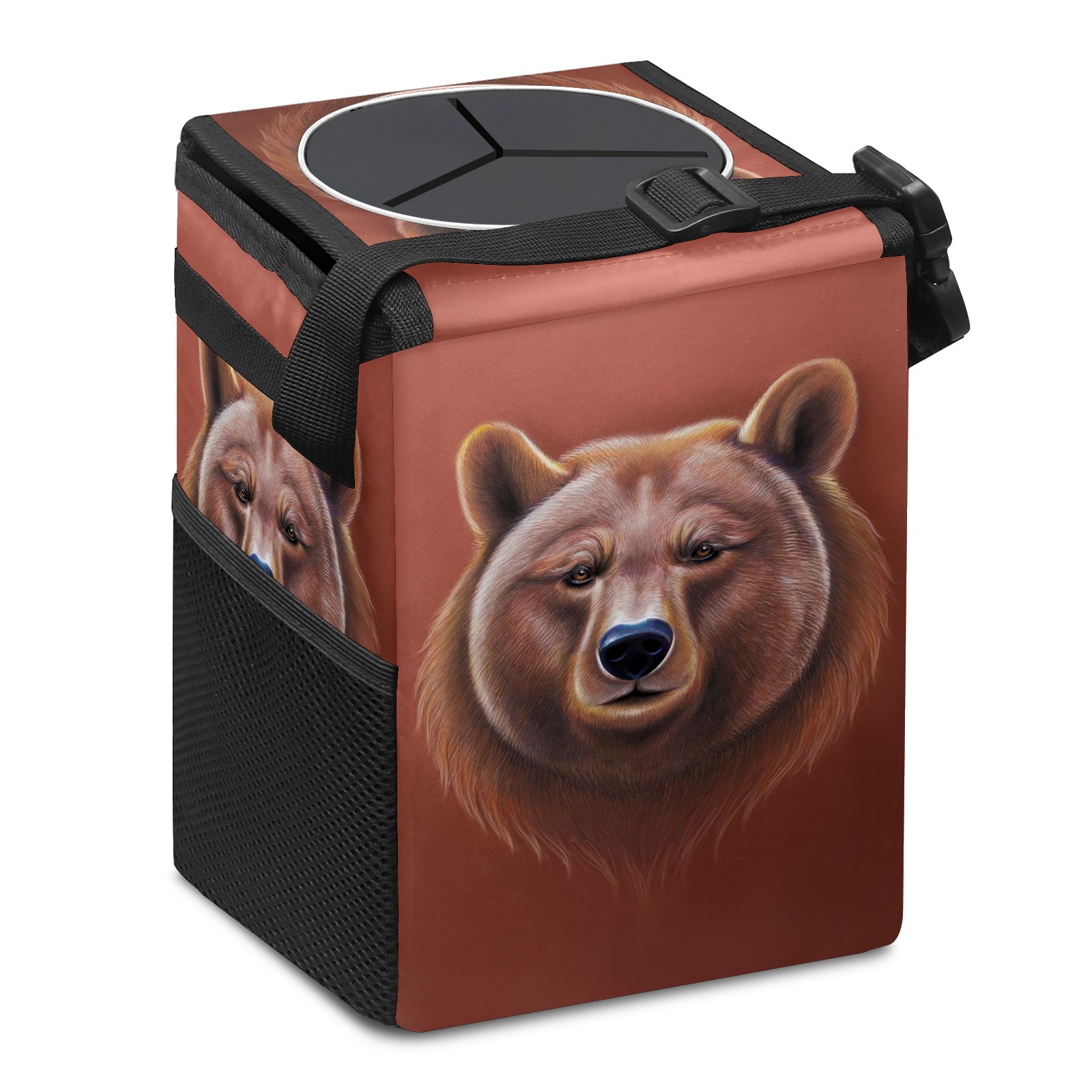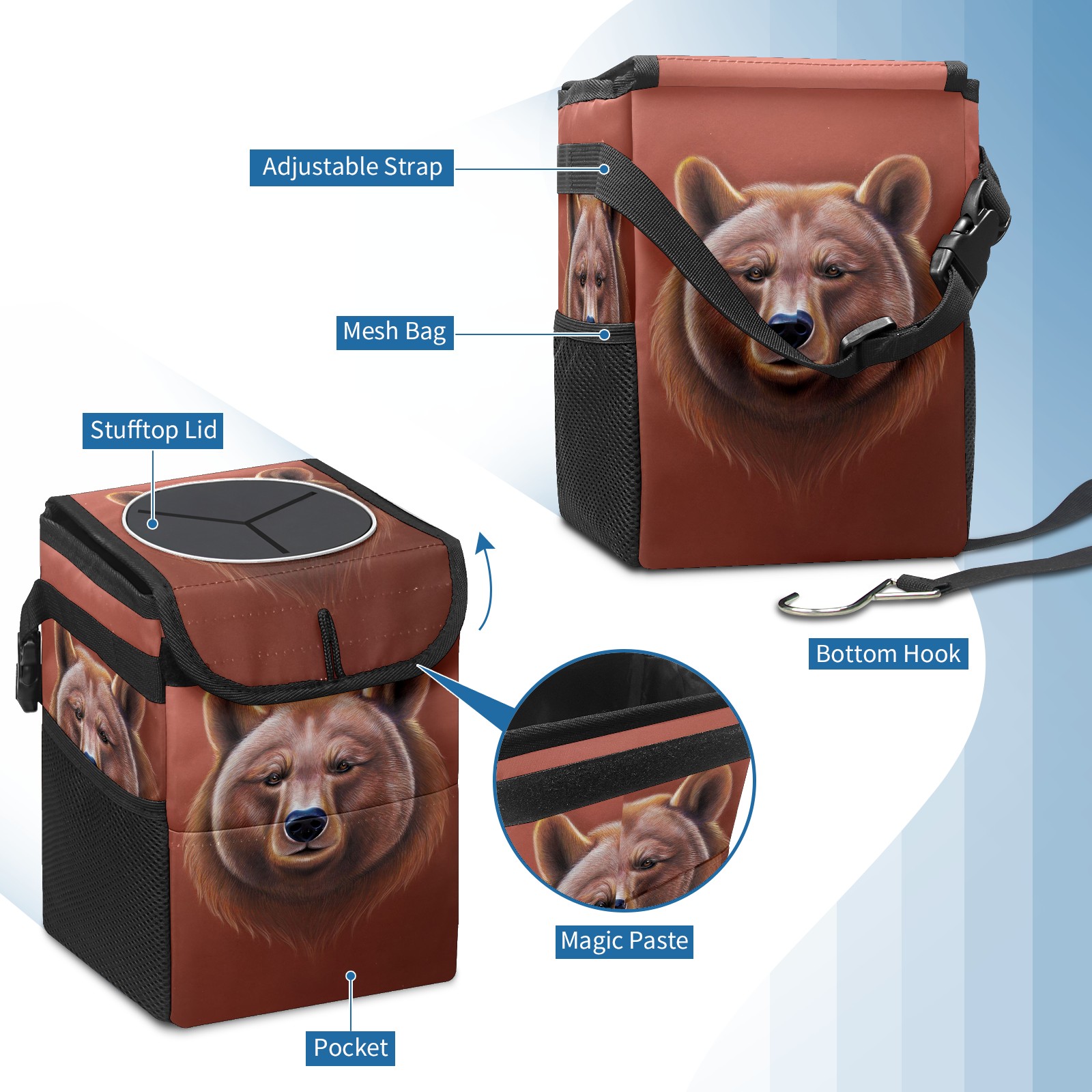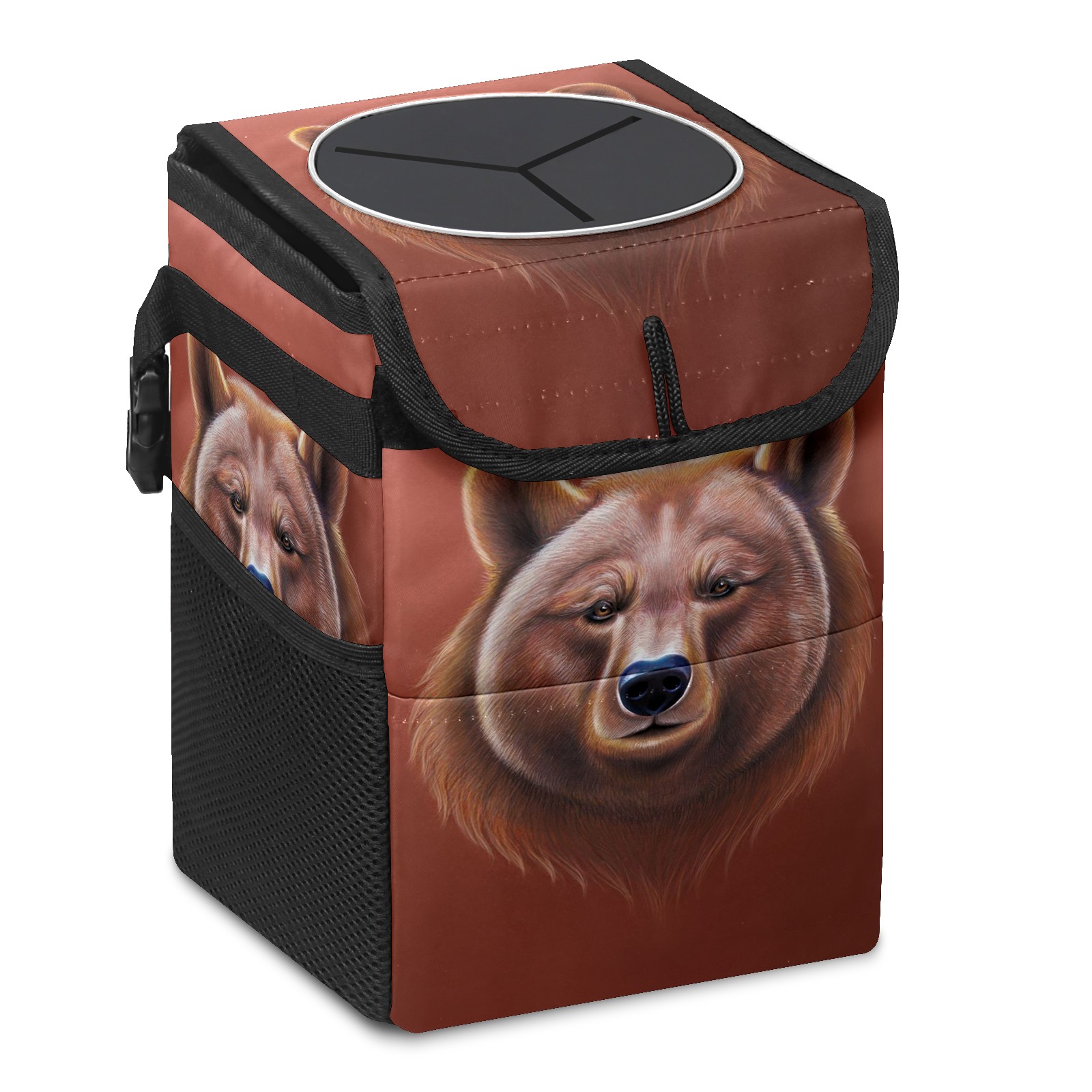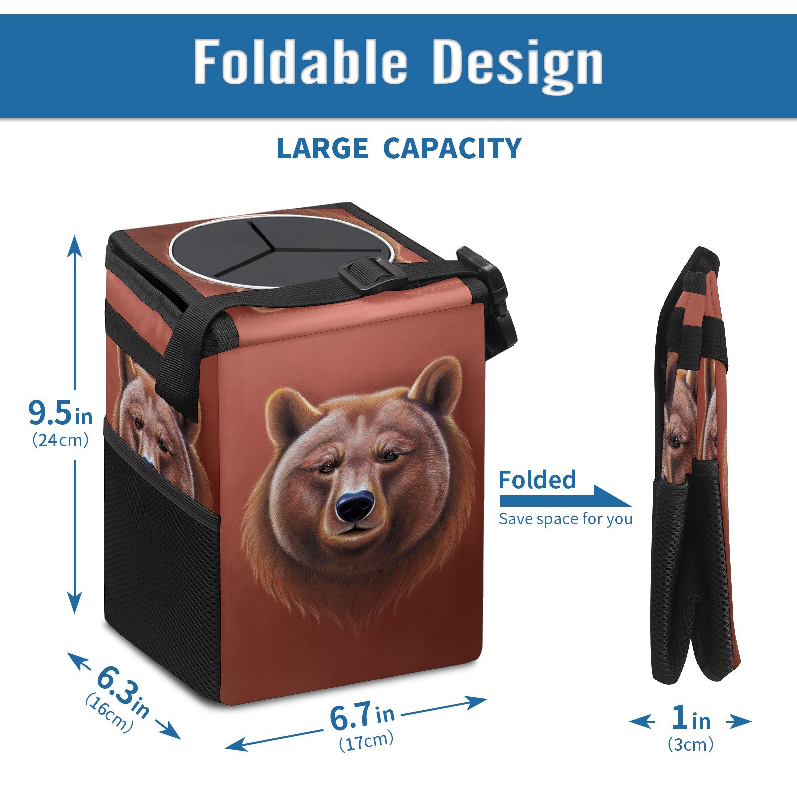 • Эта многофункциональная автомобильная мусорная корзина отличается стильным принтом, сочетающим в себе практичность и эстетику. Изготовленная из высококачественной саржевой ткани с плетеными ремнями, она прочная, долговечная и износостойкая. Размеры корзины составляют 24×17×16 см (9,5×6,7×6,3 дюйма). Верхнее отверстие имеет прорезиненное покрытие для удобной утилизации мусора; боковые сетчатые карманы и передний карман обеспечивают удобное хранение закусок, телефонов и других мелких предметов.