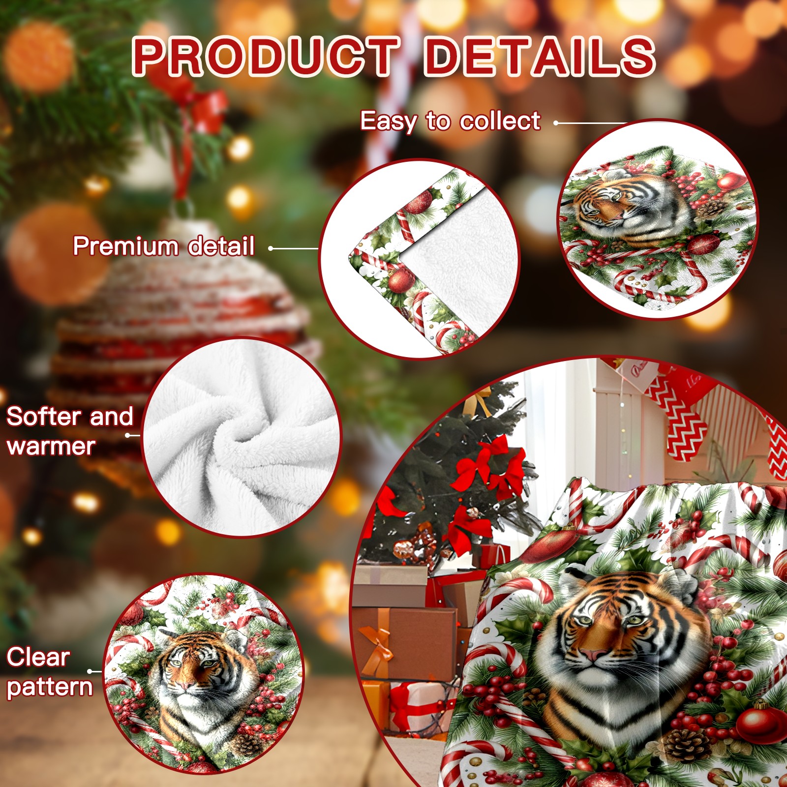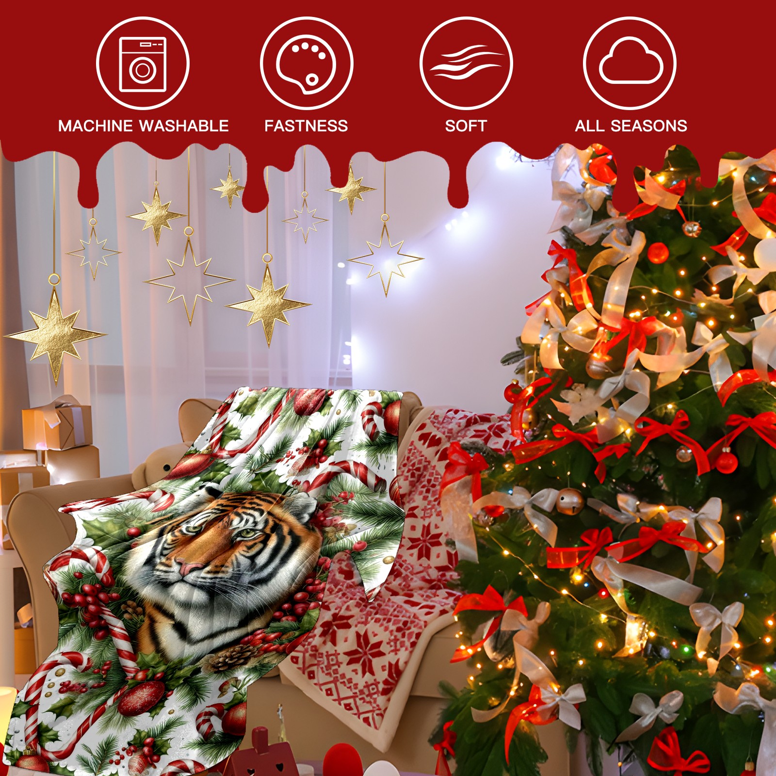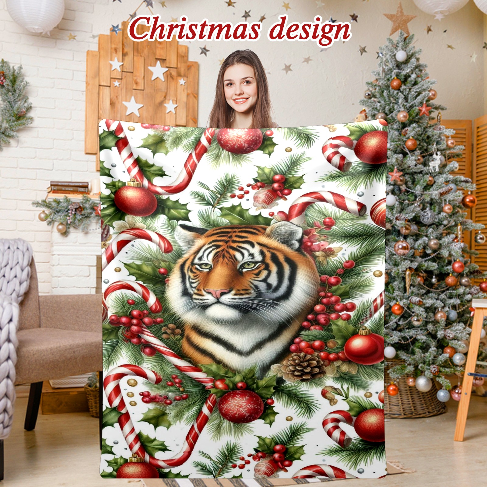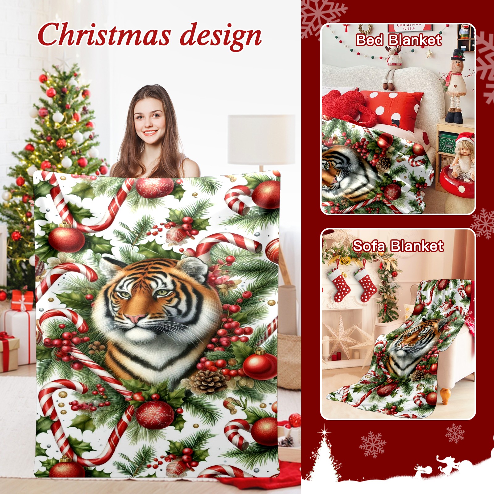 Премиальная фланелевая одеяло Red Christmas Tiger