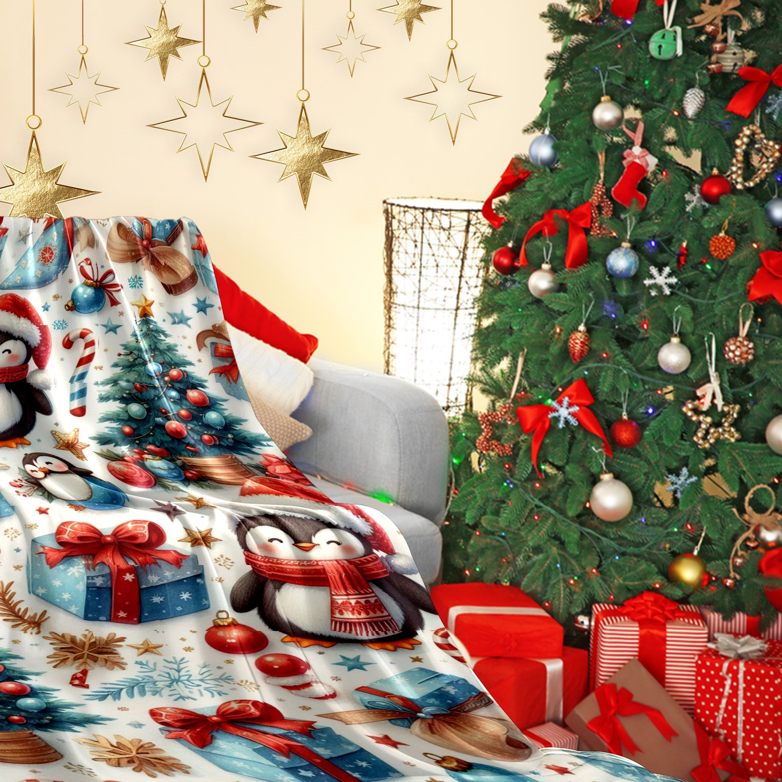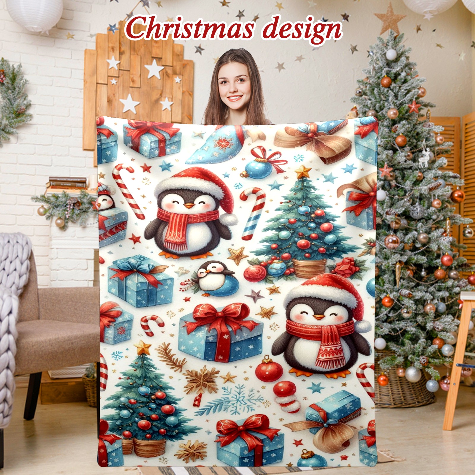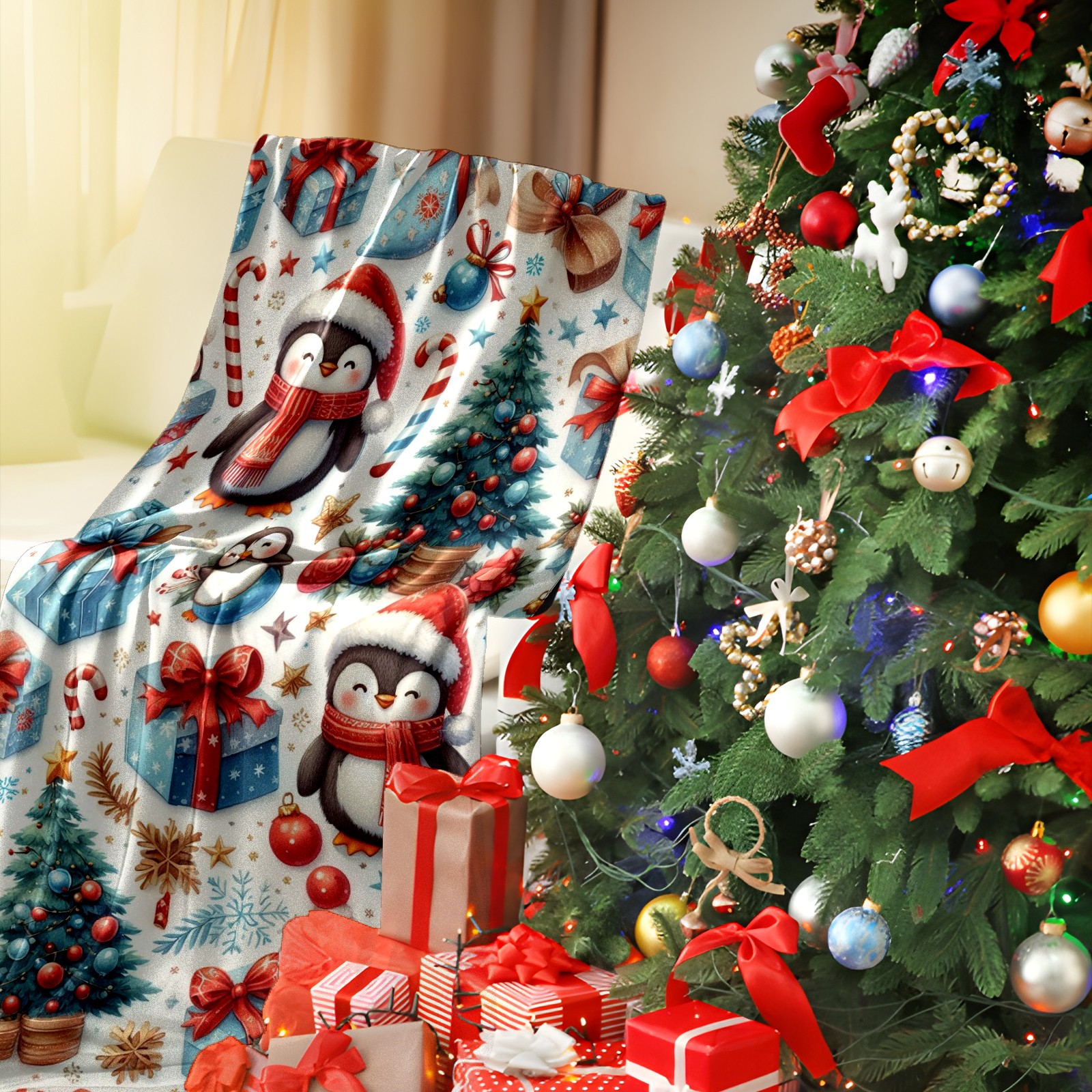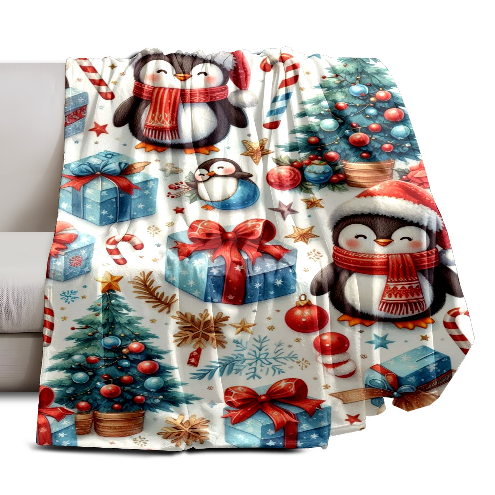 Премиальная фланелевая одеяло Blue Christmas Penguins Trees