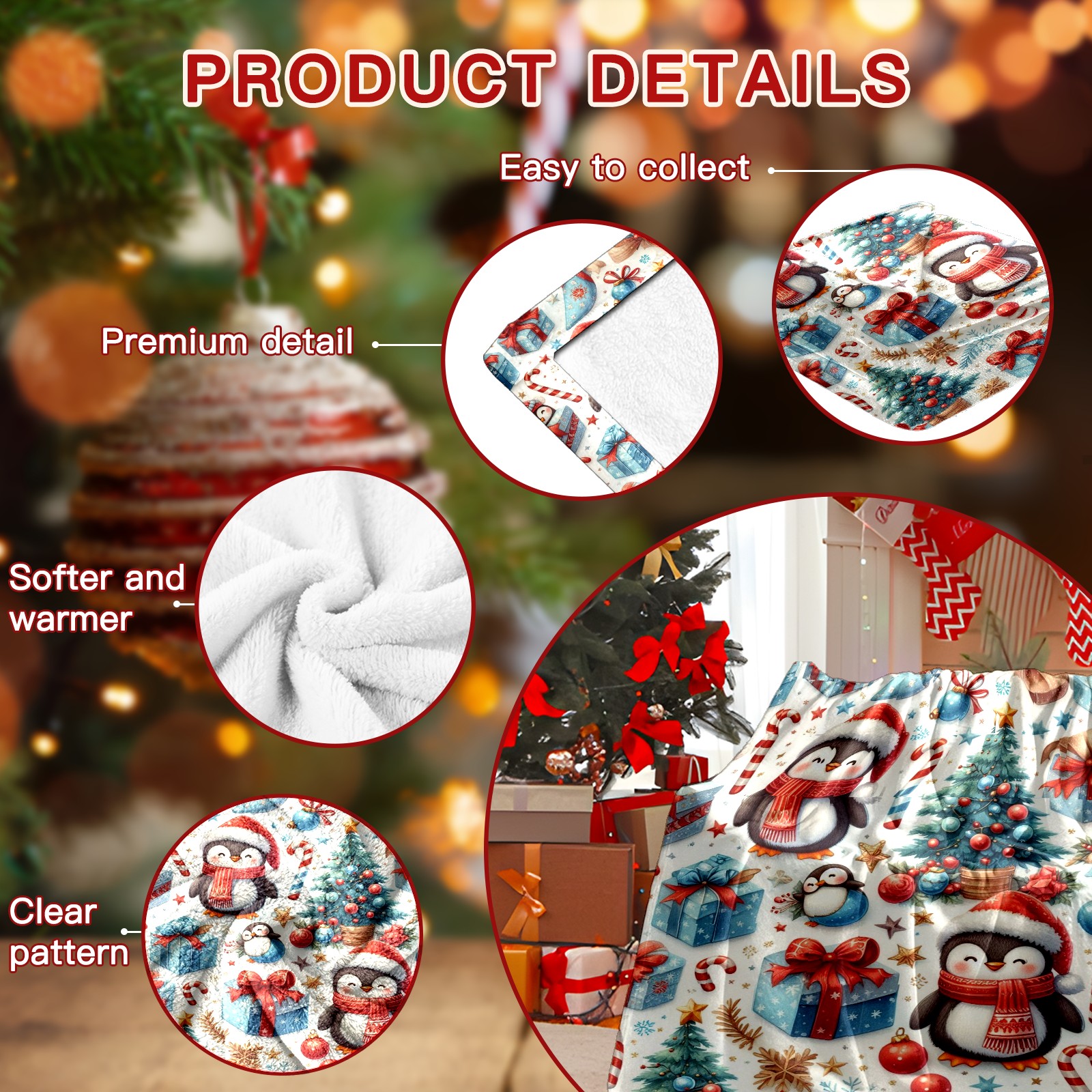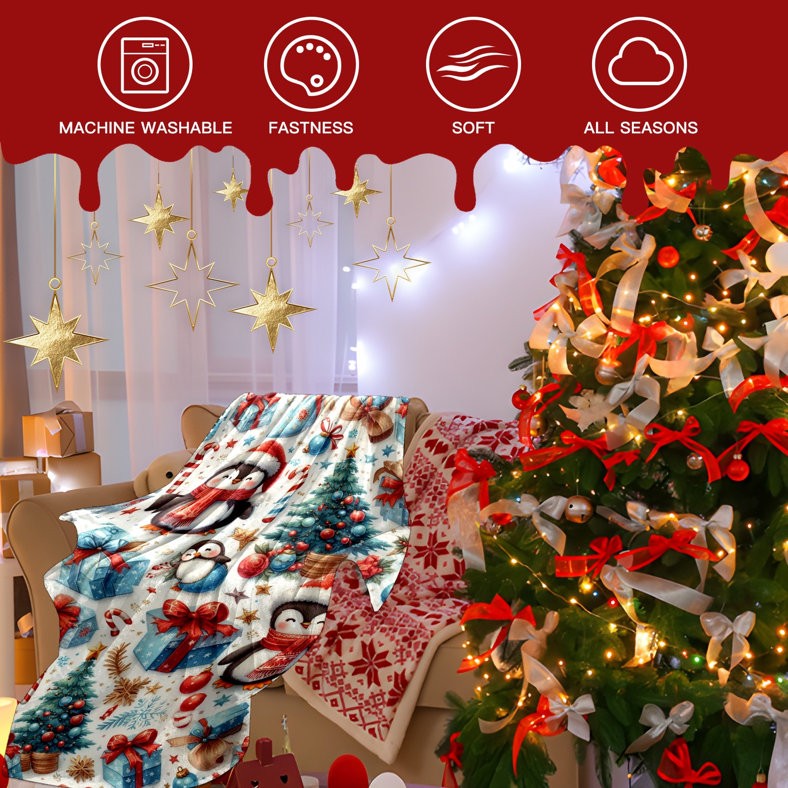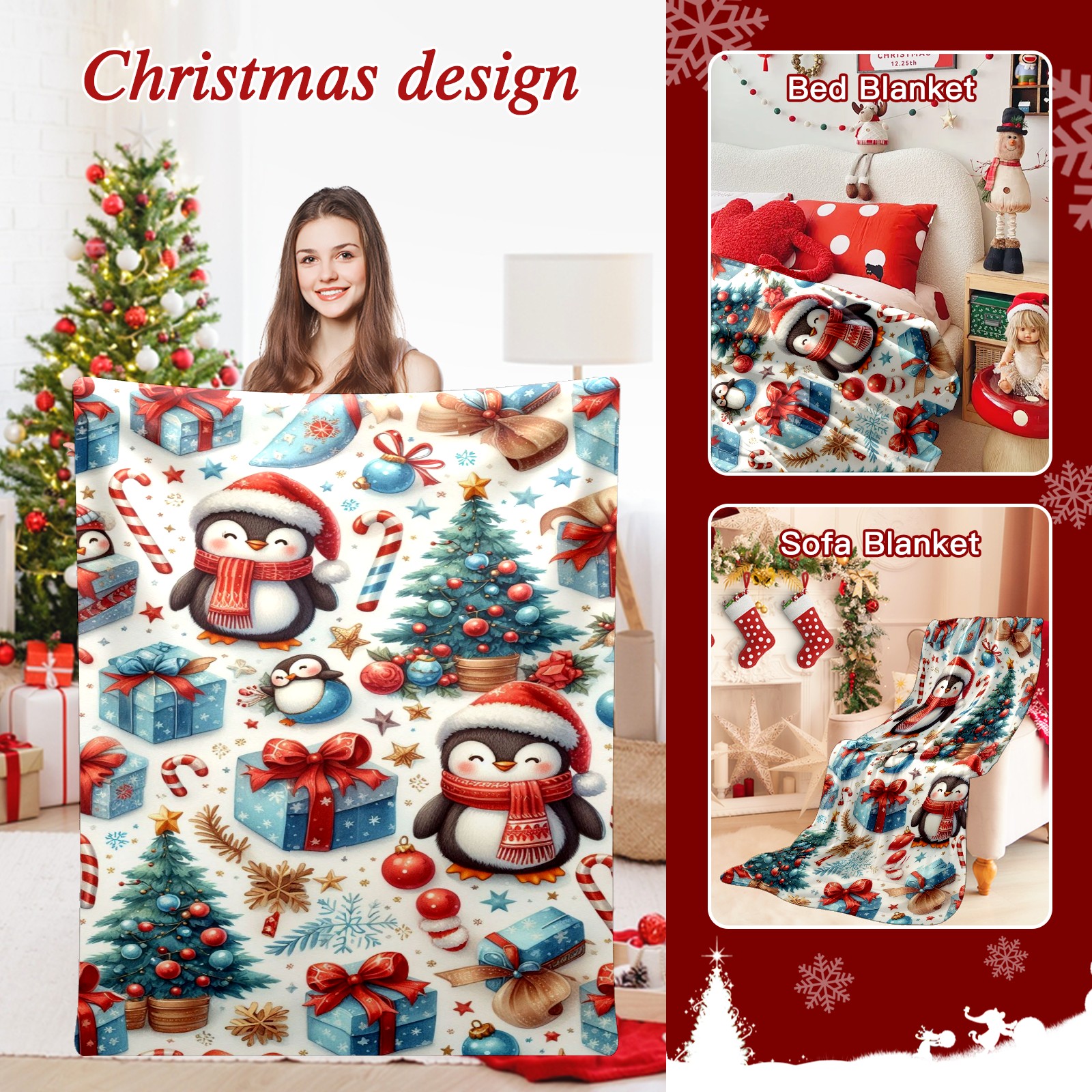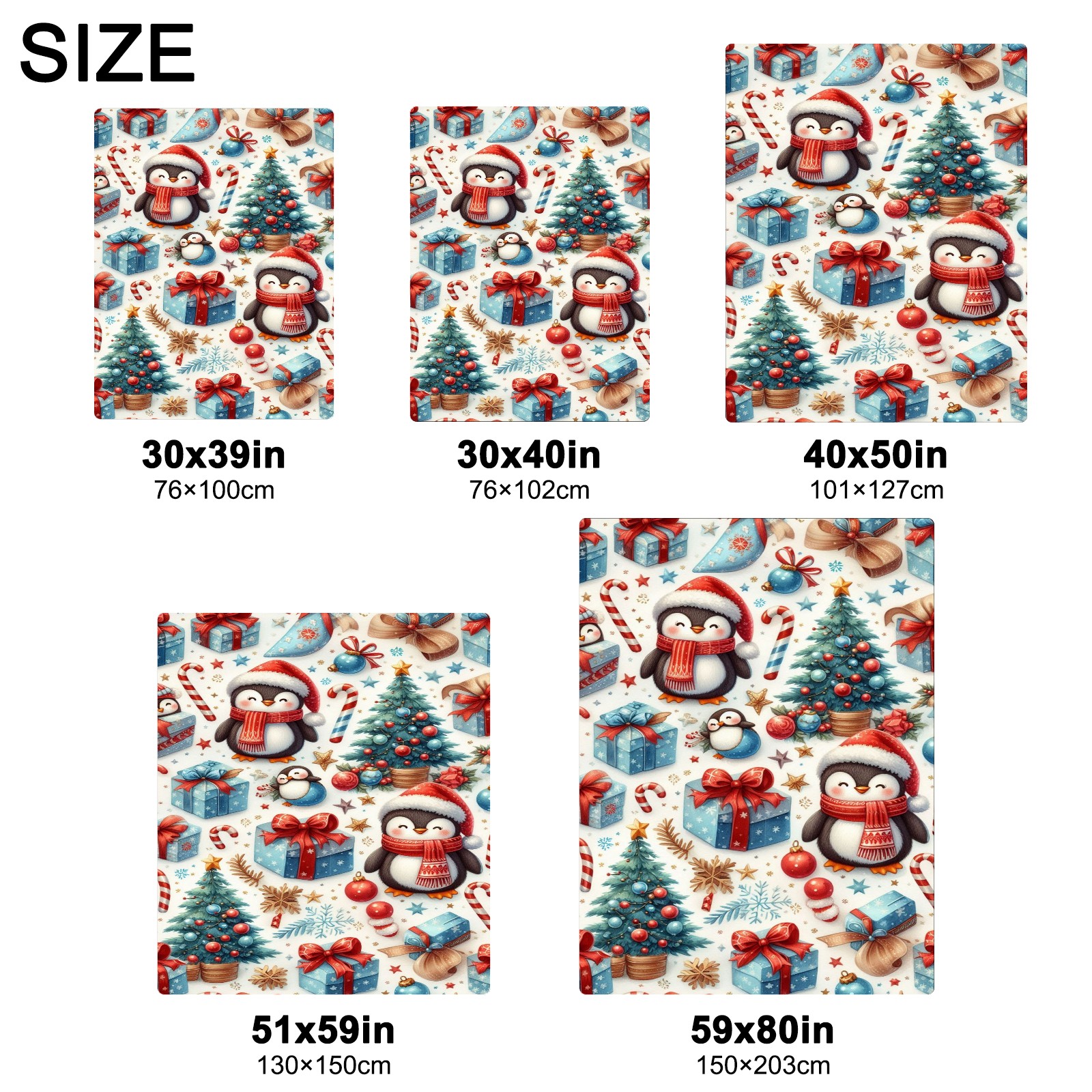 Премиальная фланелевая одеяло Blue Christmas Penguins Trees