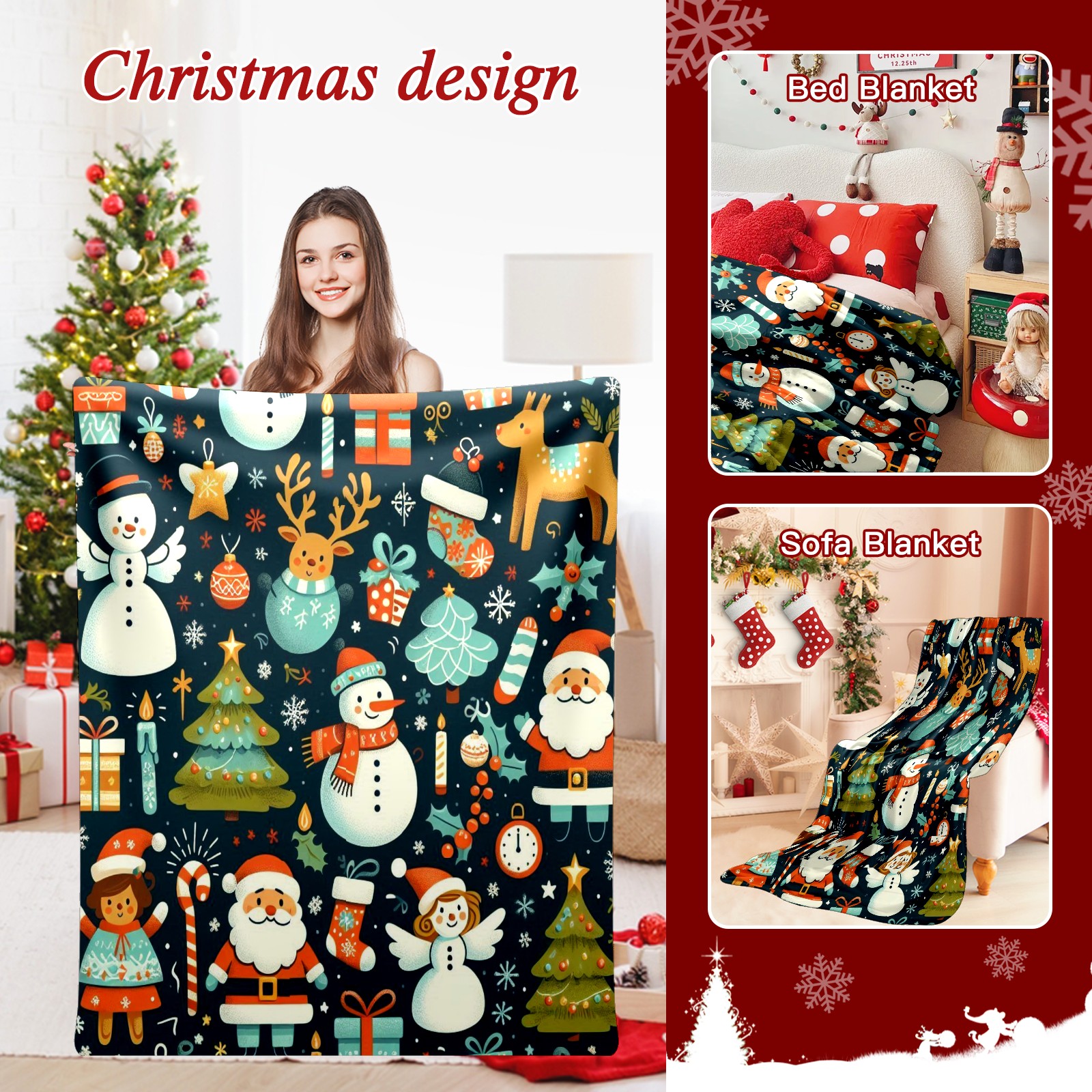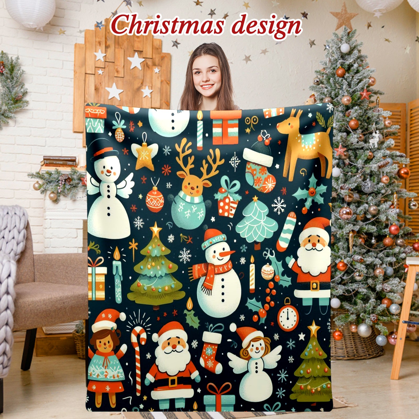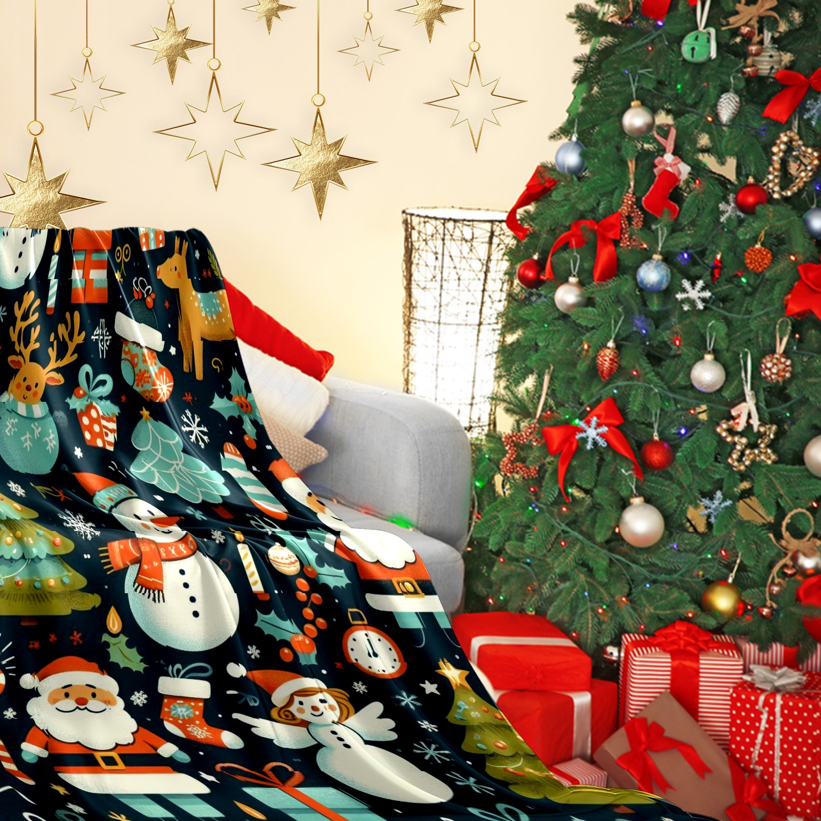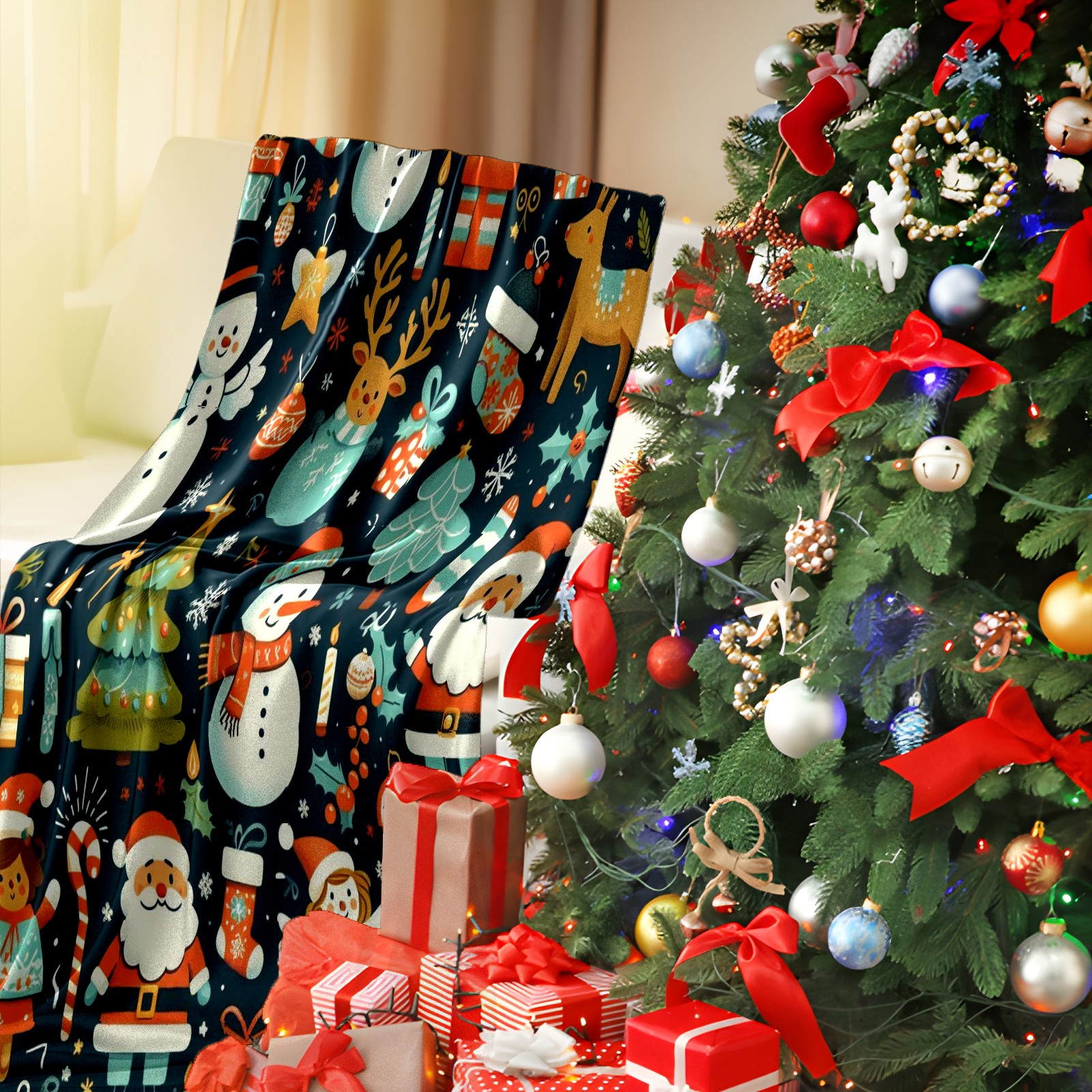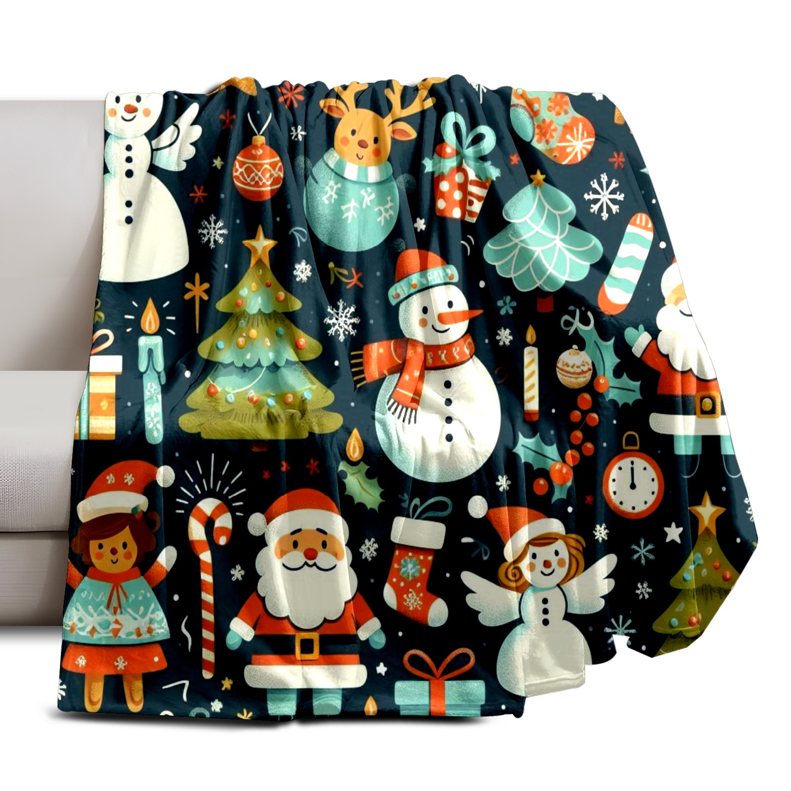 Премиальная фланелевая одеяло Dark Blue Christmas Snowman Deer