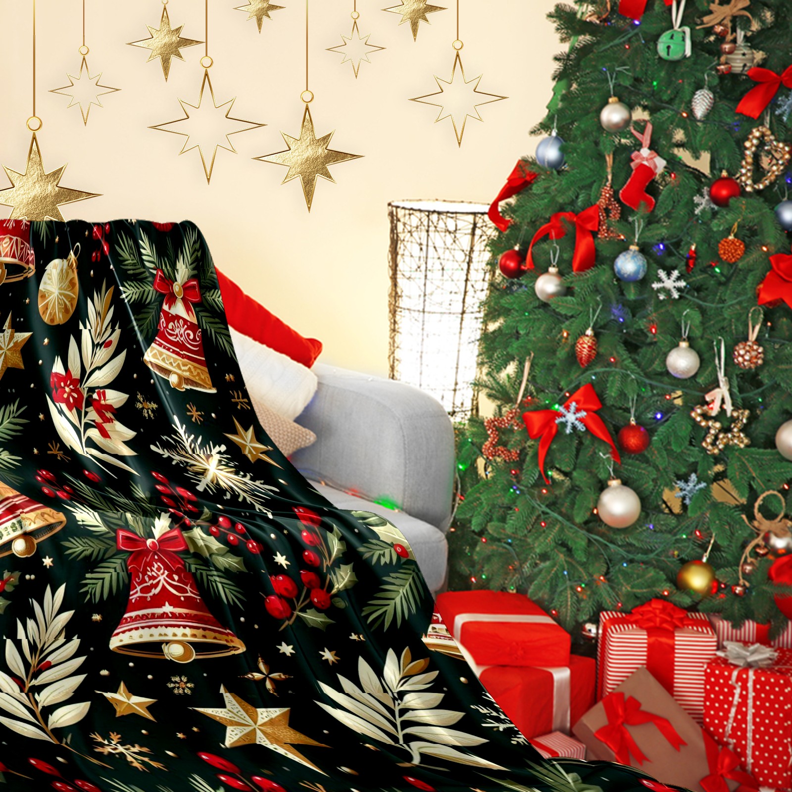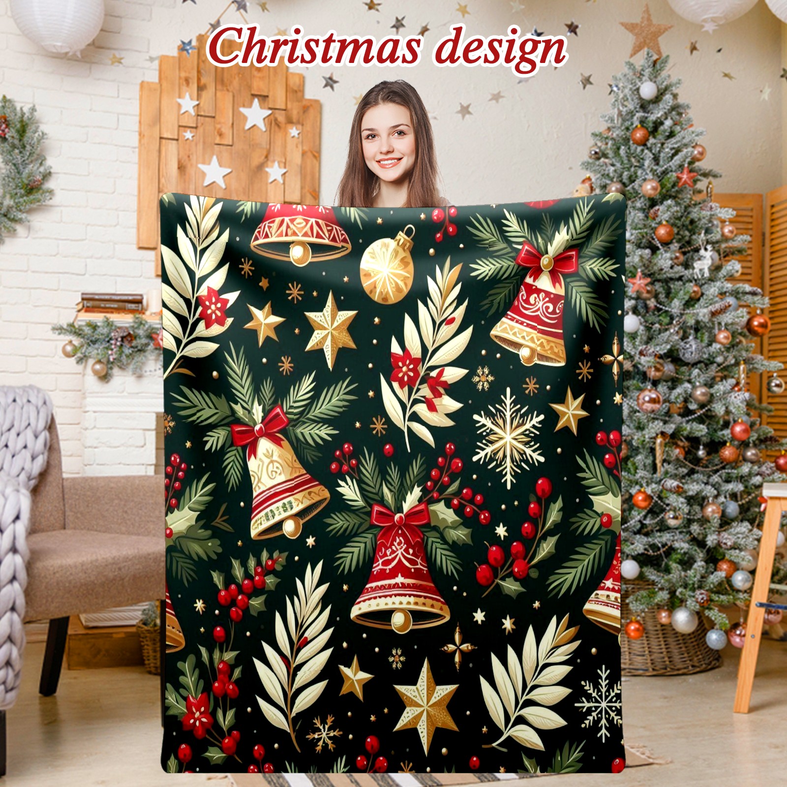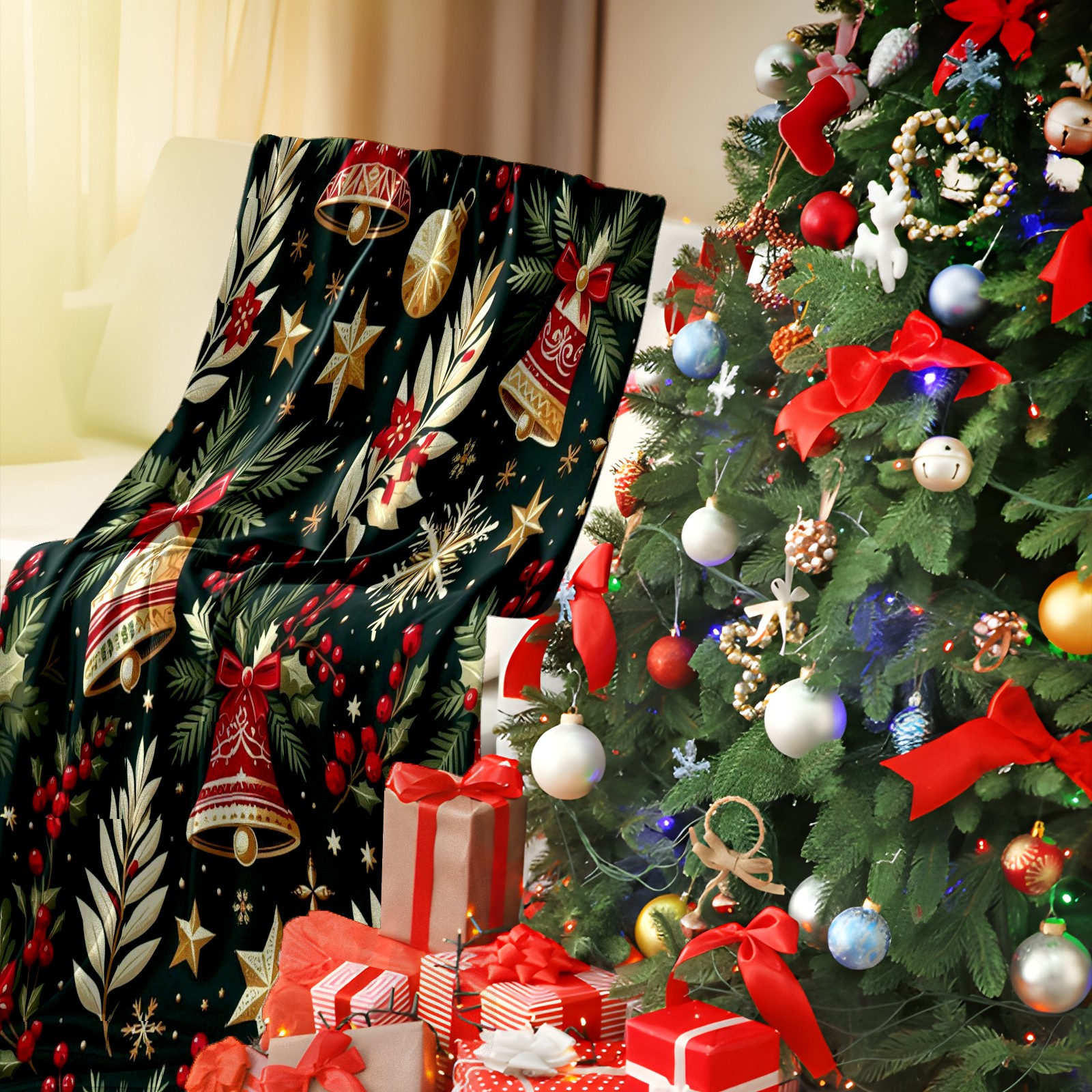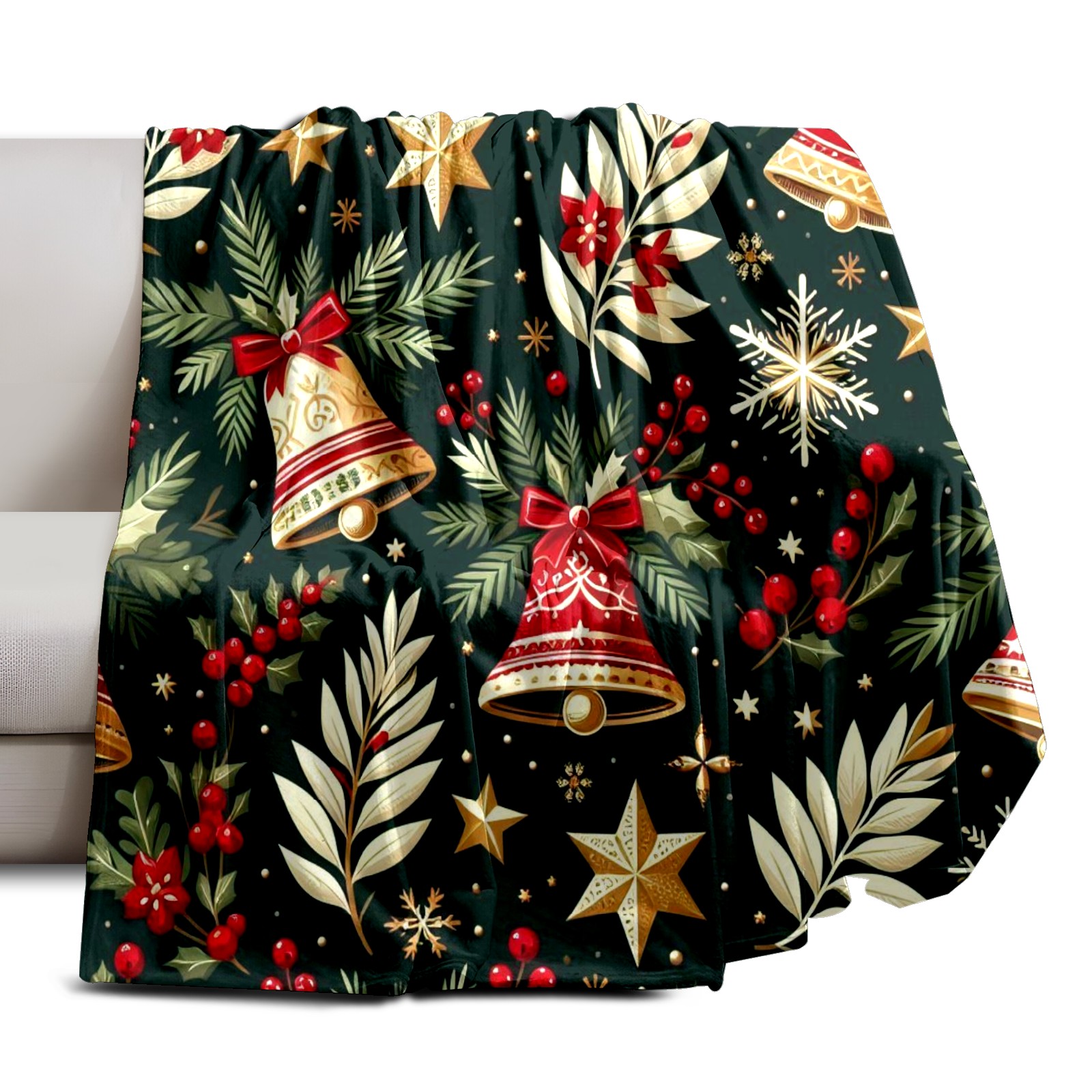 Премиальная фланелевая одеяло Dark Green Christmas Bells Stars