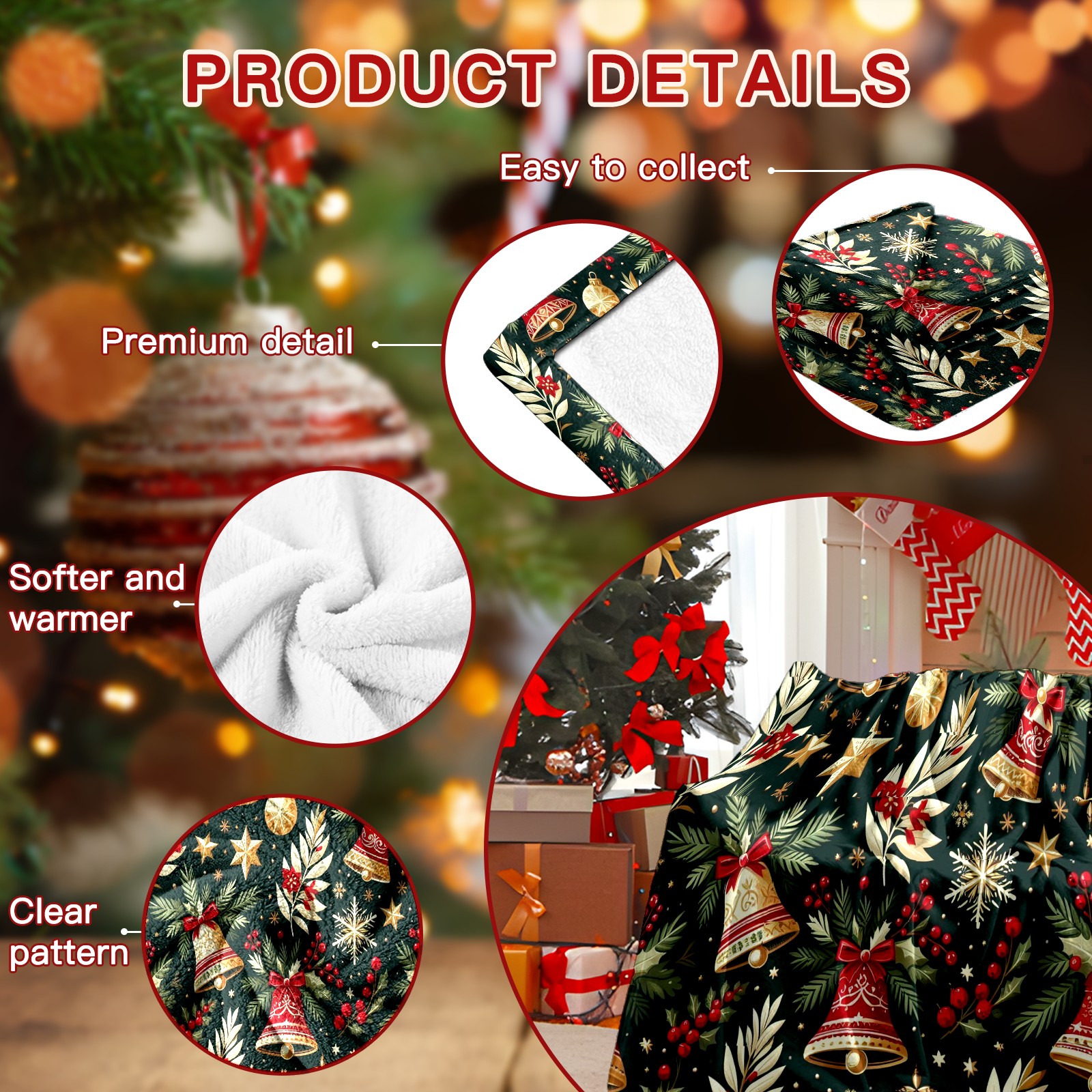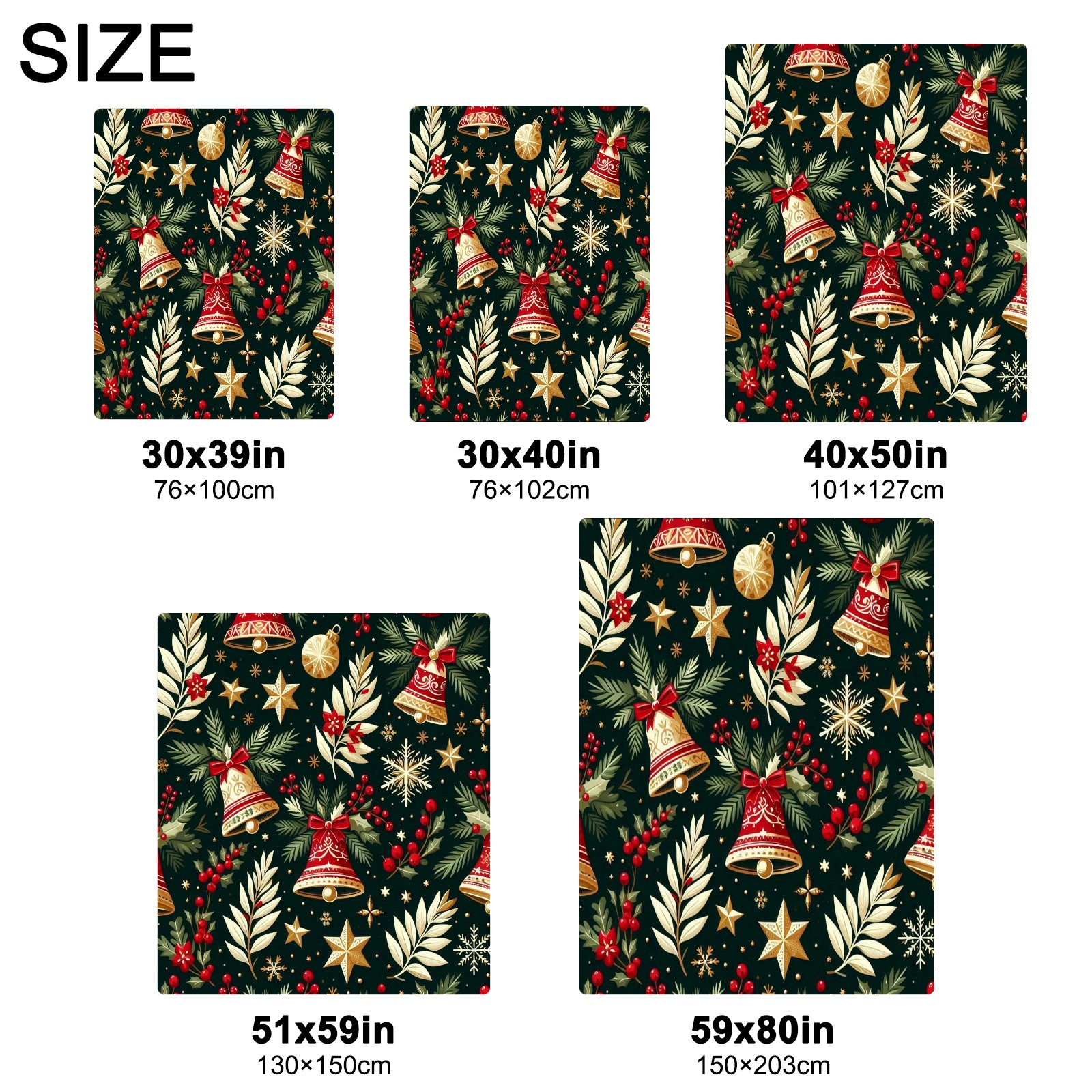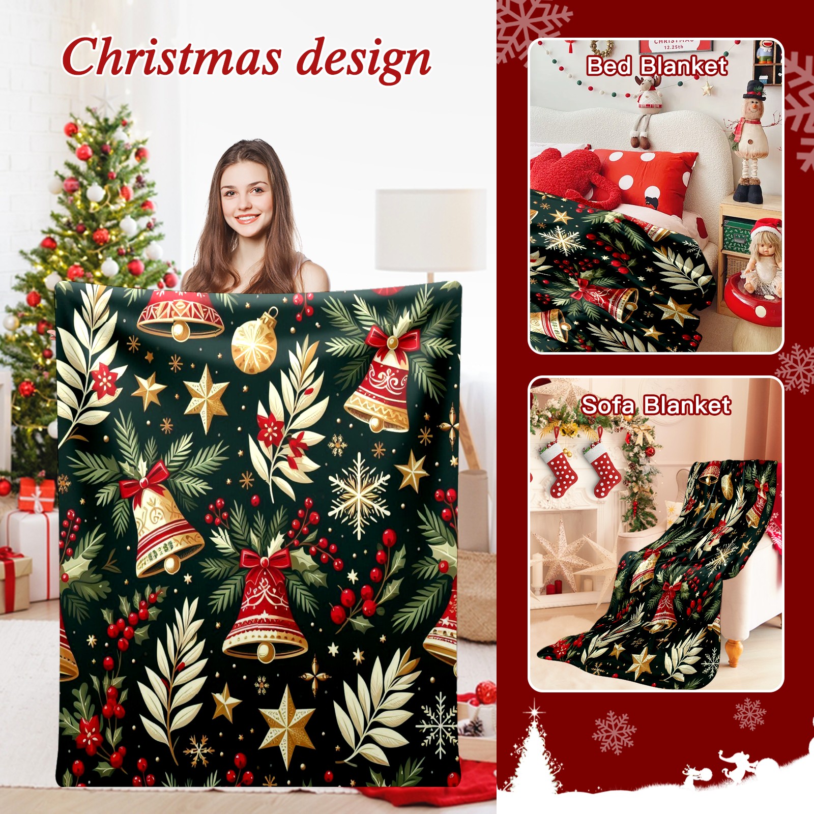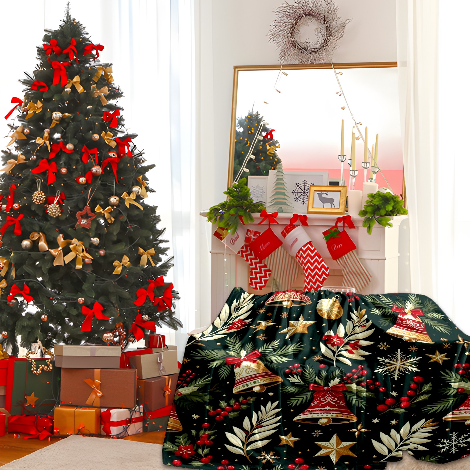 Премиальная фланелевая одеяло Dark Green Christmas Bells Stars