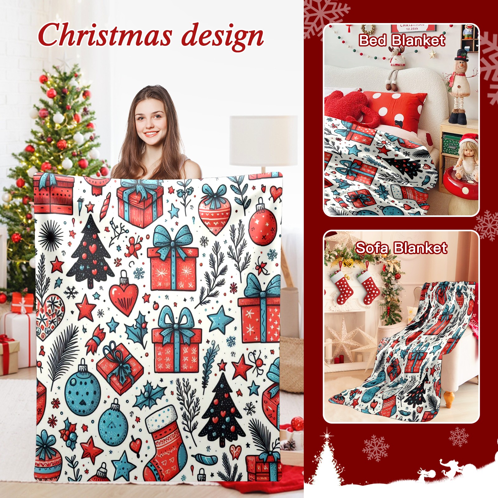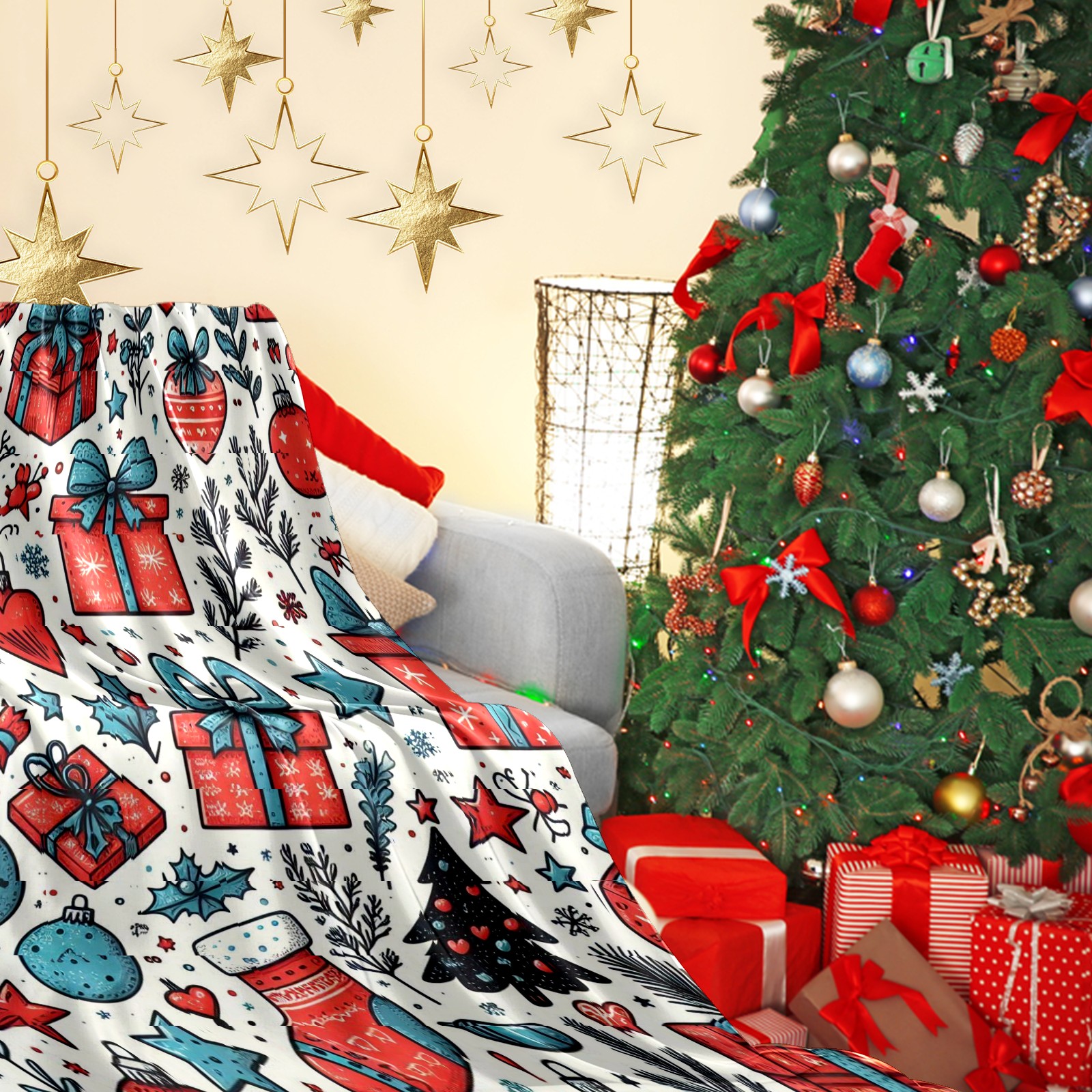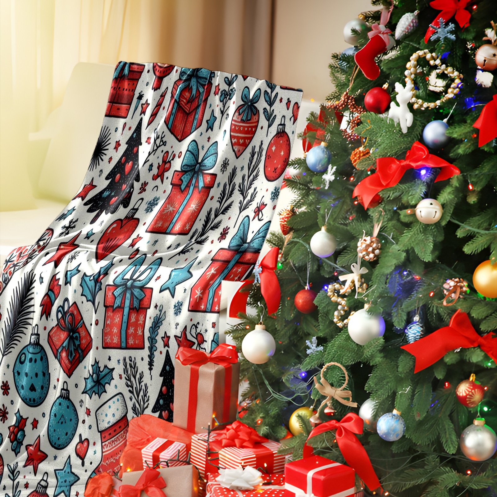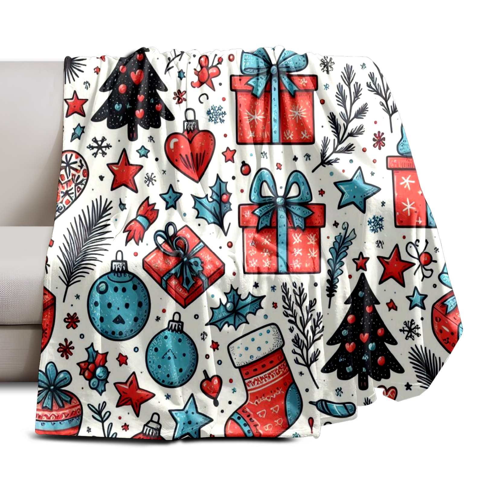 Премиальная фланелевая одеяло Blue Red Christmas Gifts Ornaments