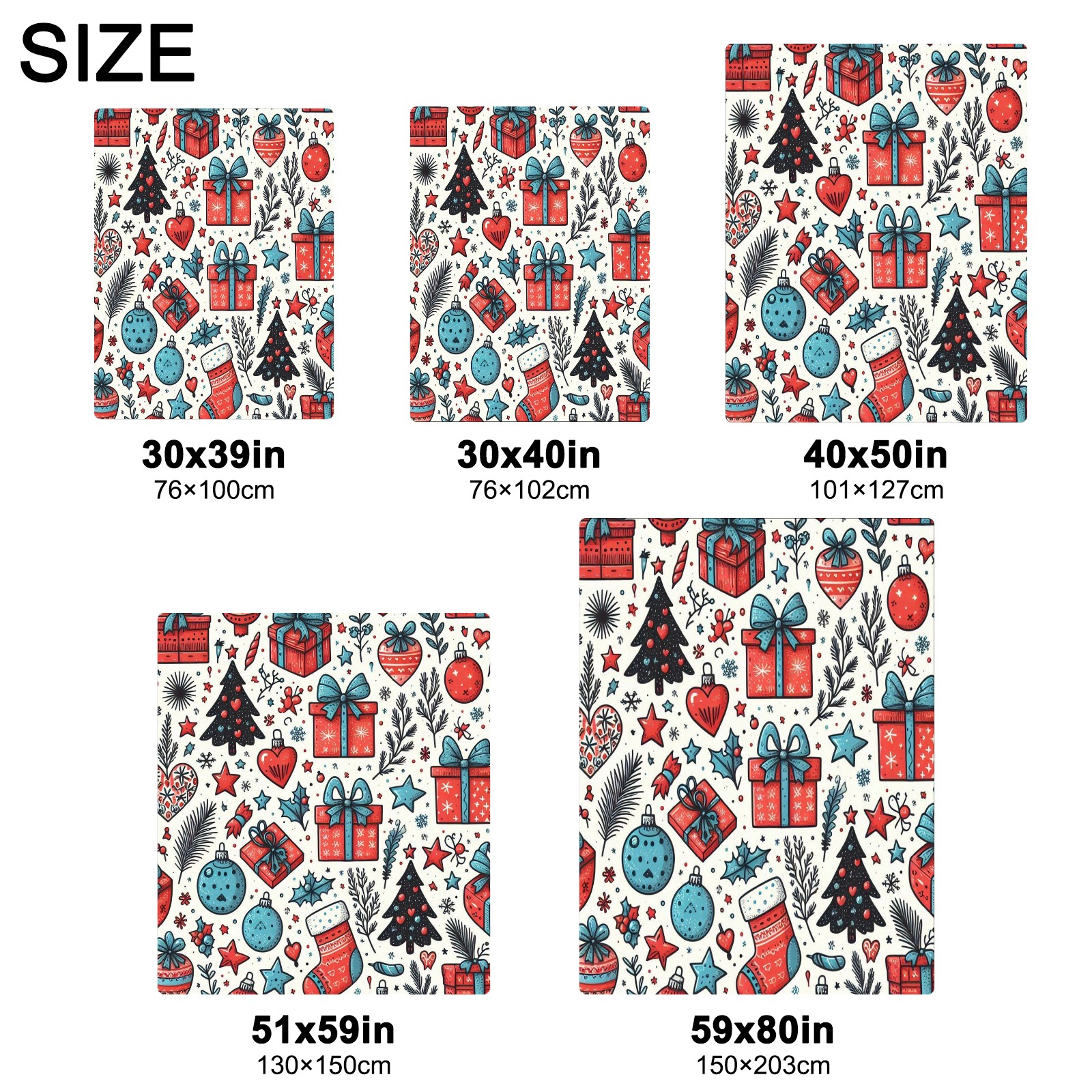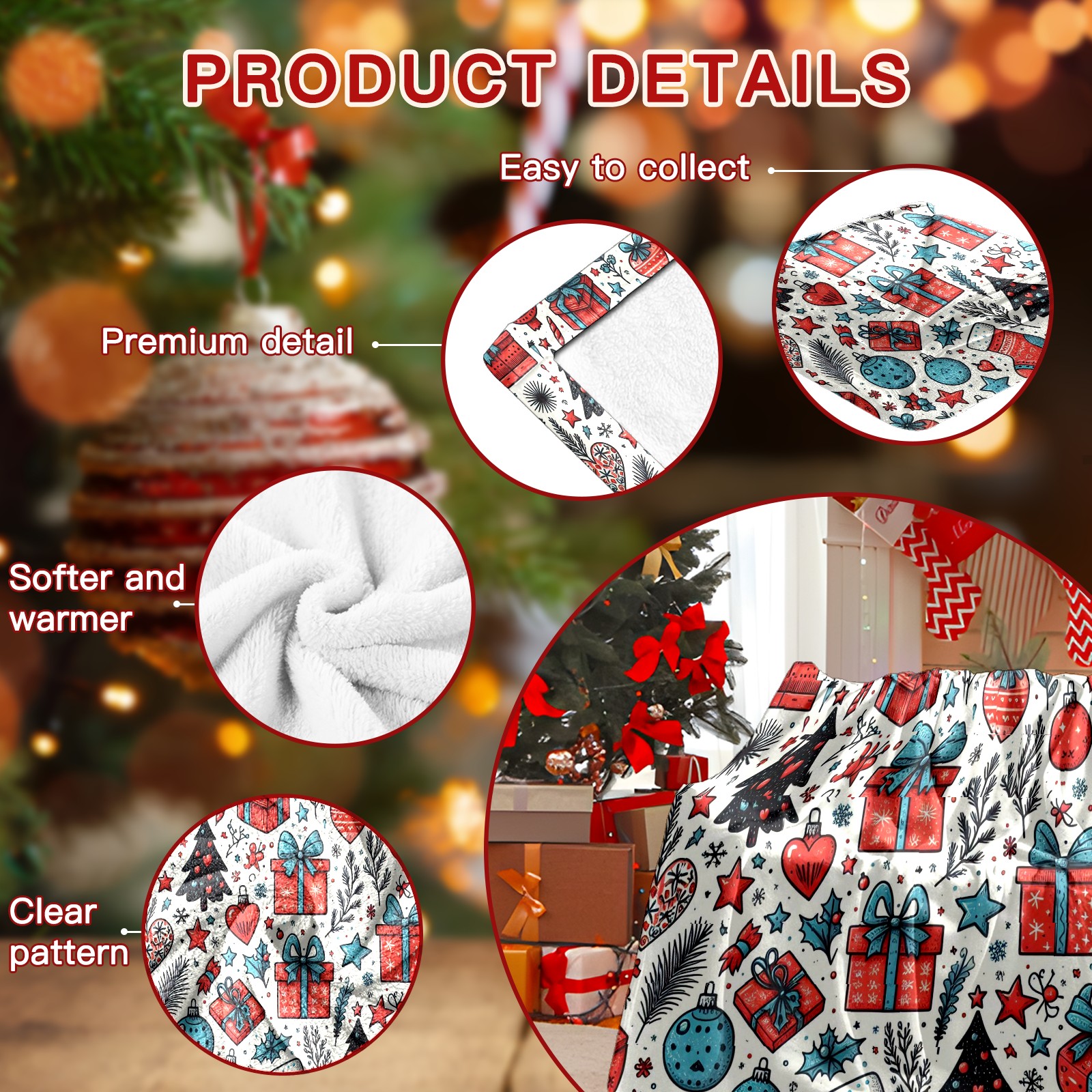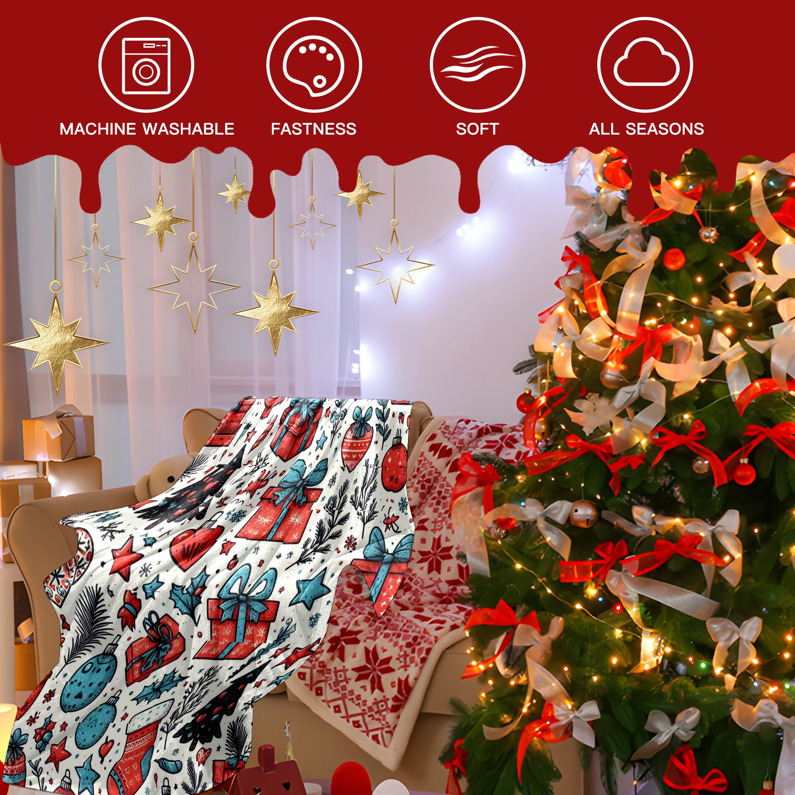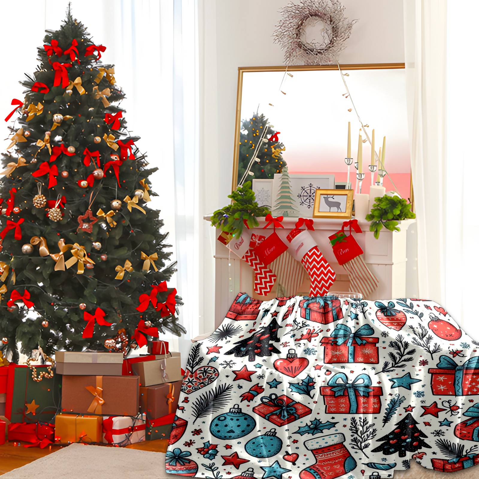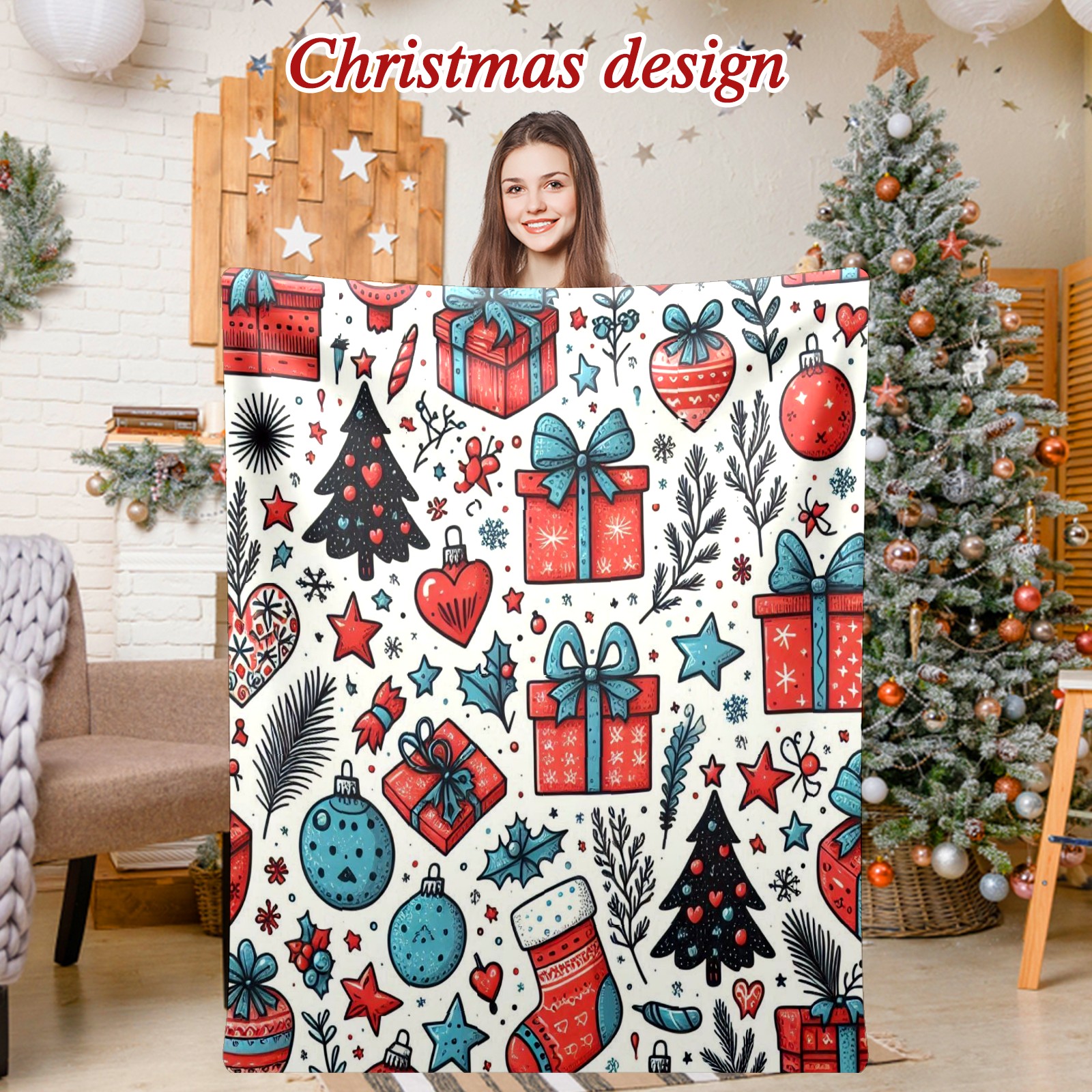 Премиальная фланелевая одеяло Blue Red Christmas Gifts Ornaments
