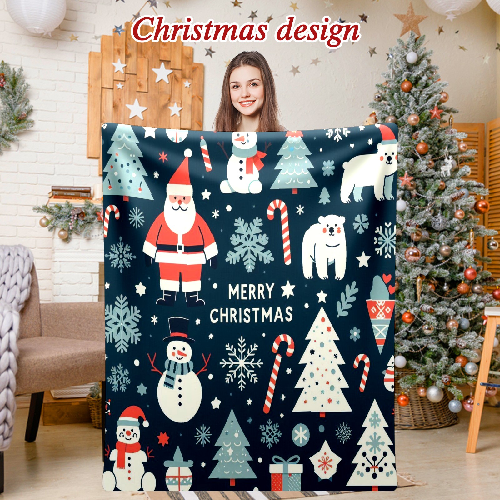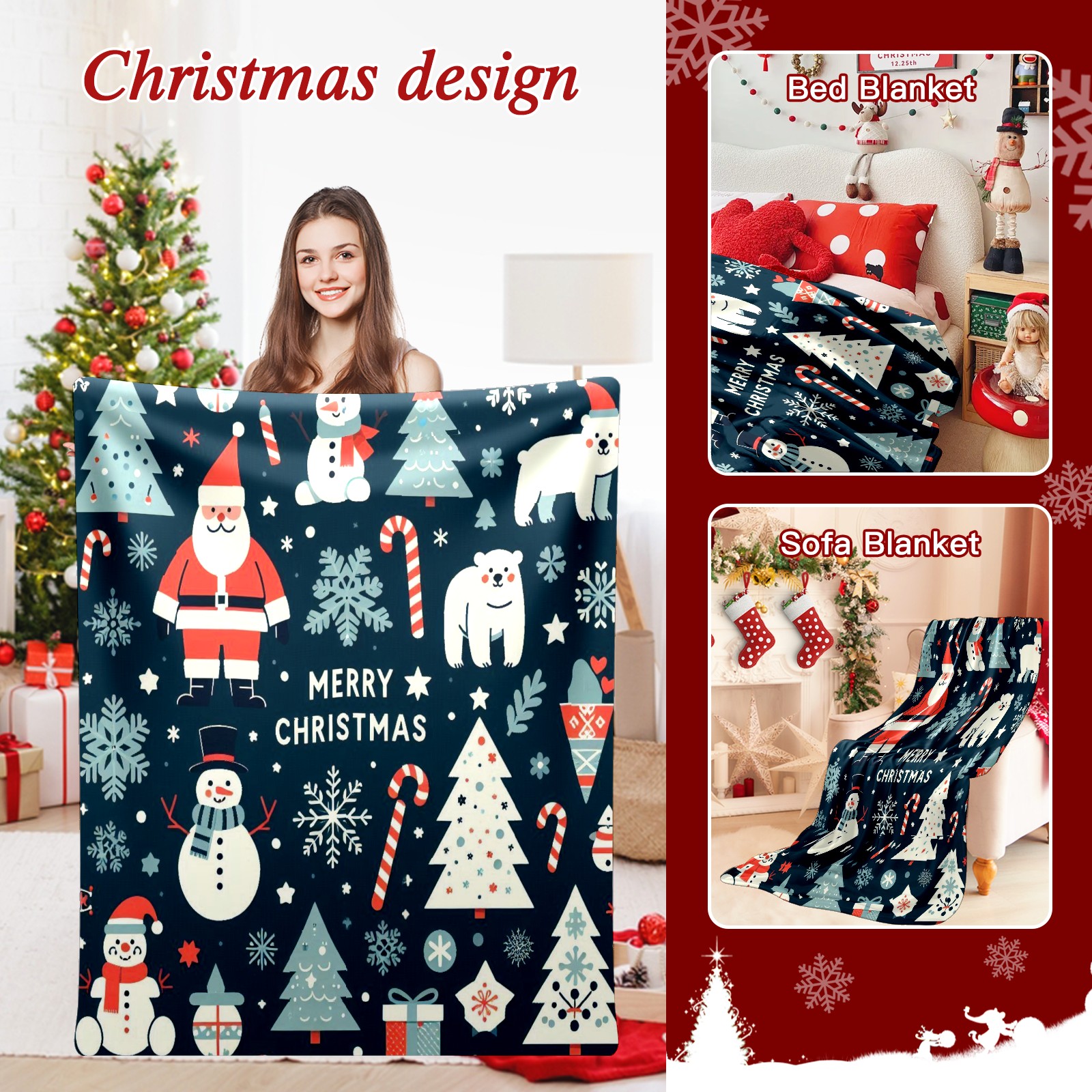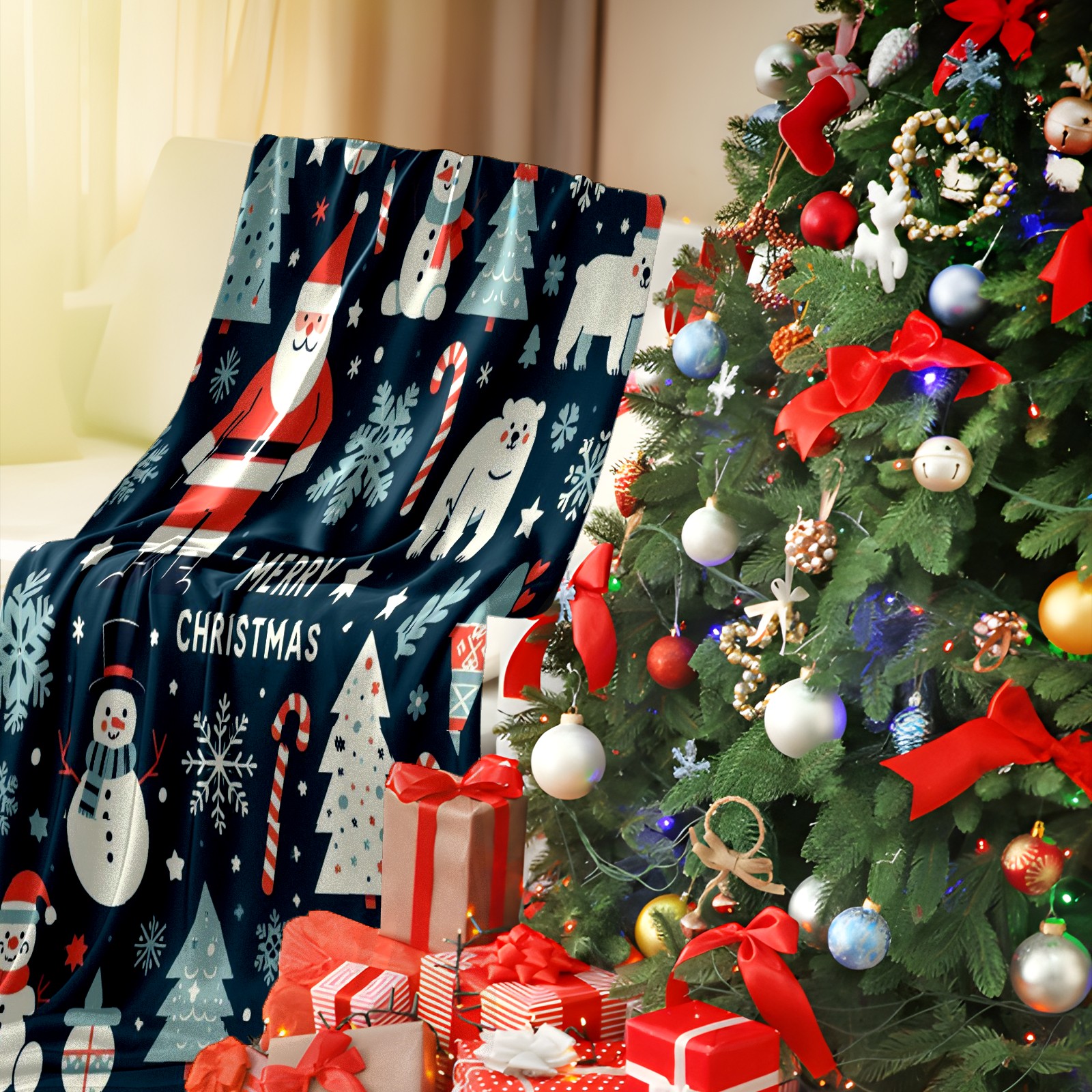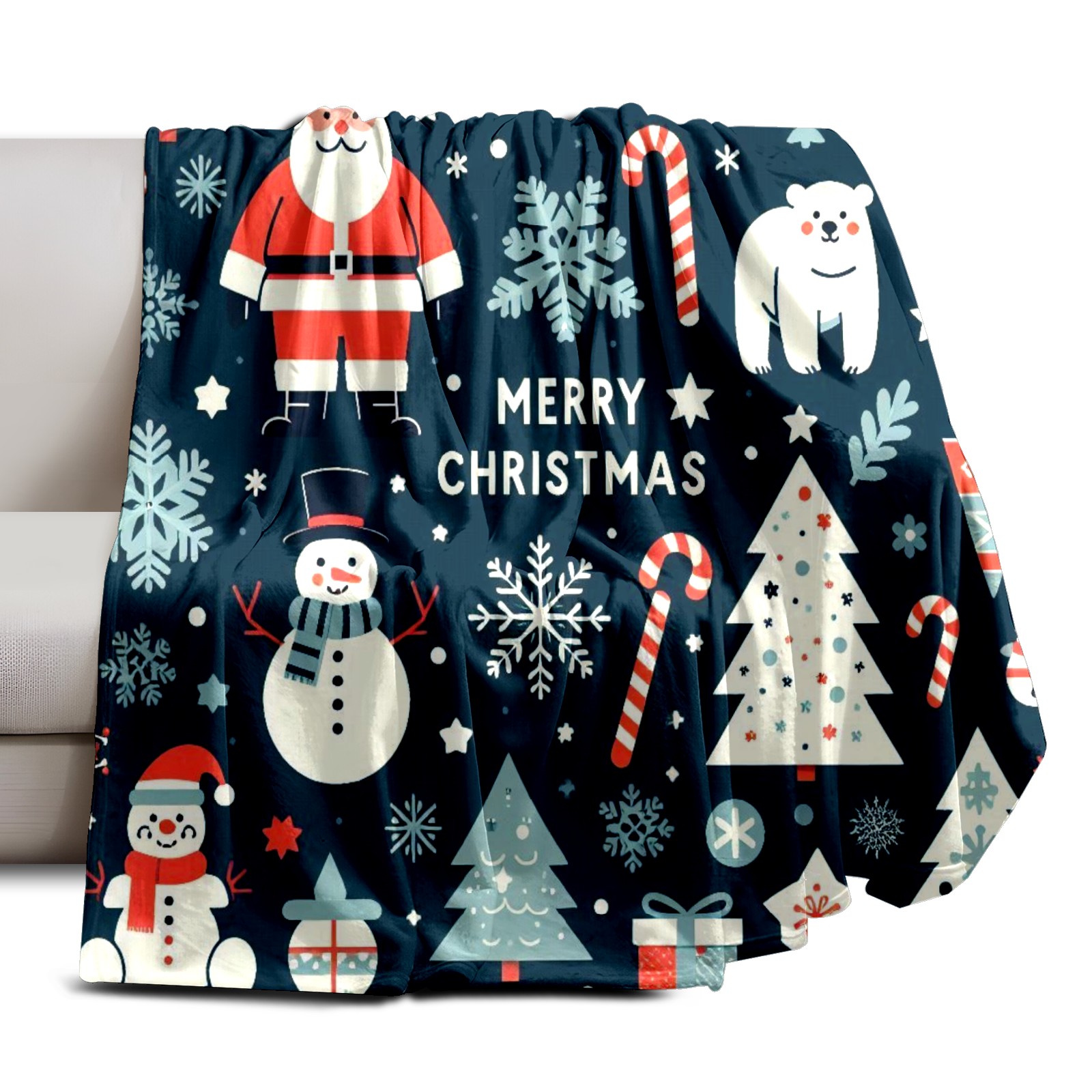 Премиальная фланелевая одеяло Dark Blue Christmas Santa Snowman Polar Bear