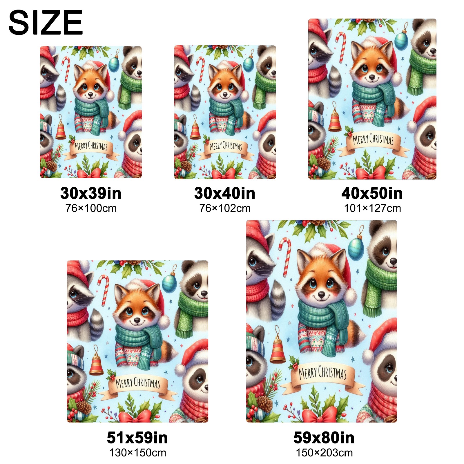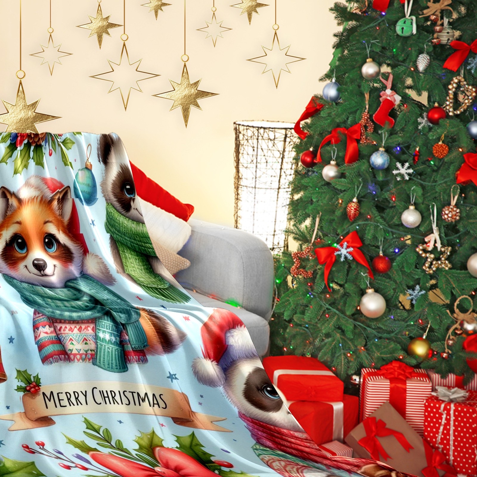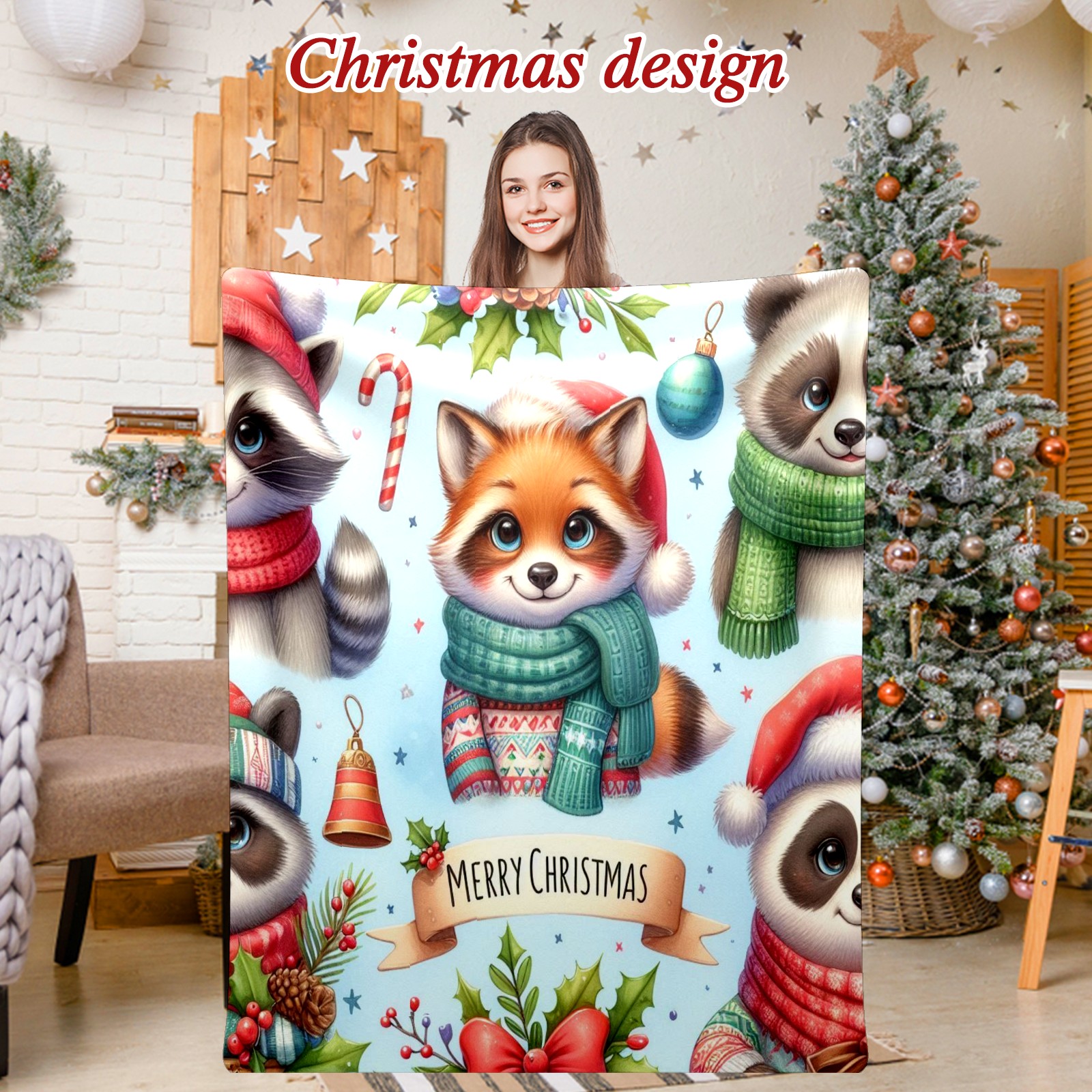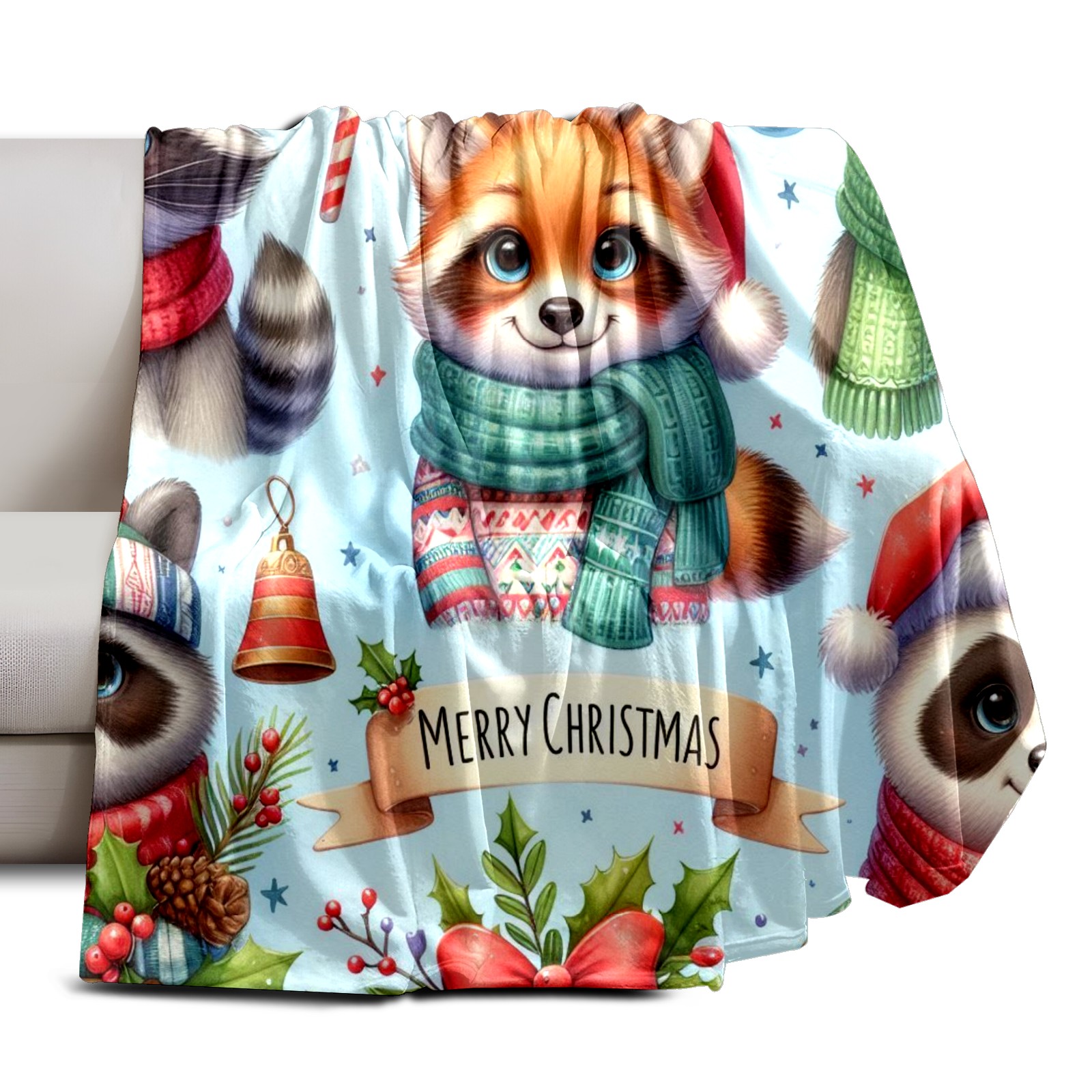 Премиальная фланелевая одеяло Light Blue Christmas Raccoon Fox Panda