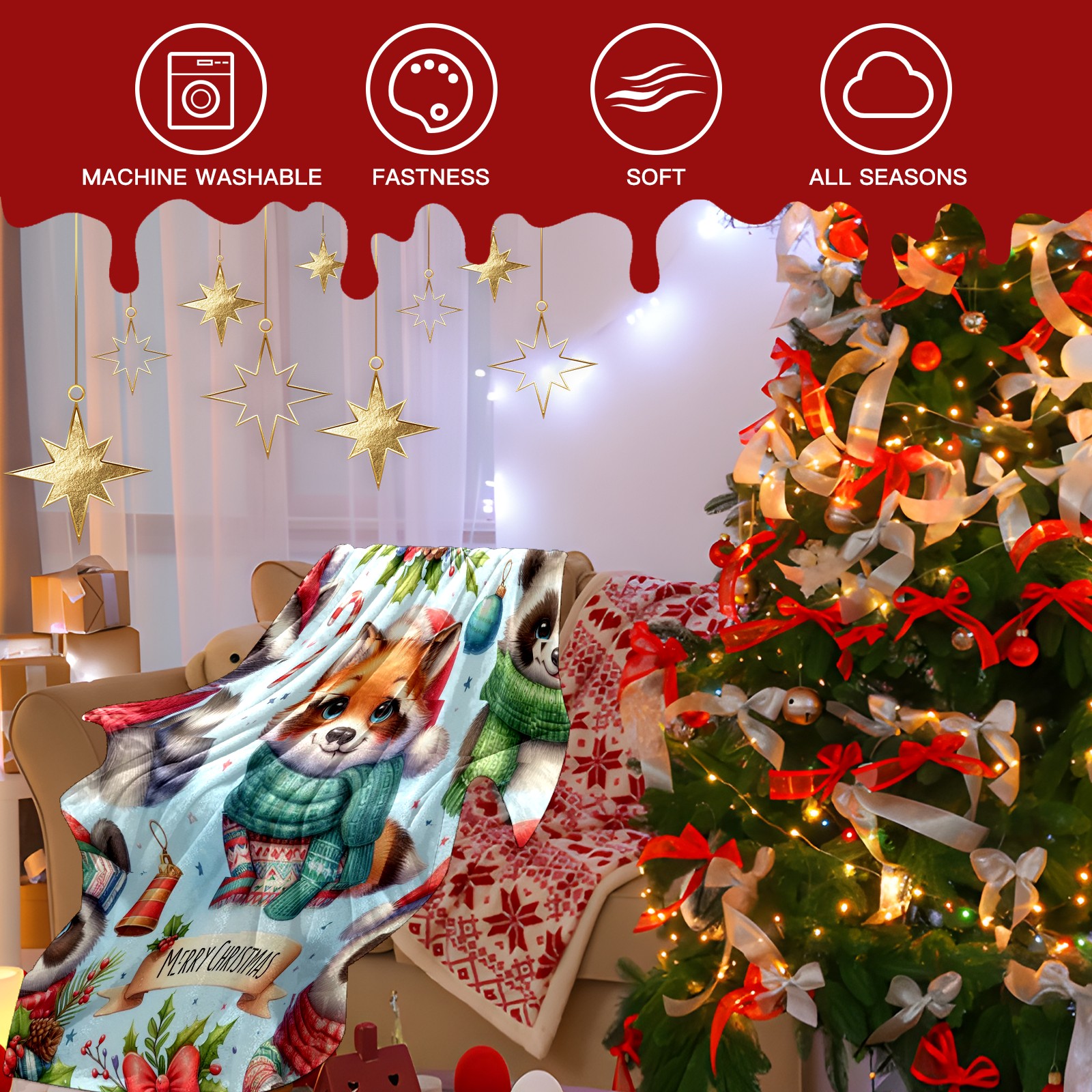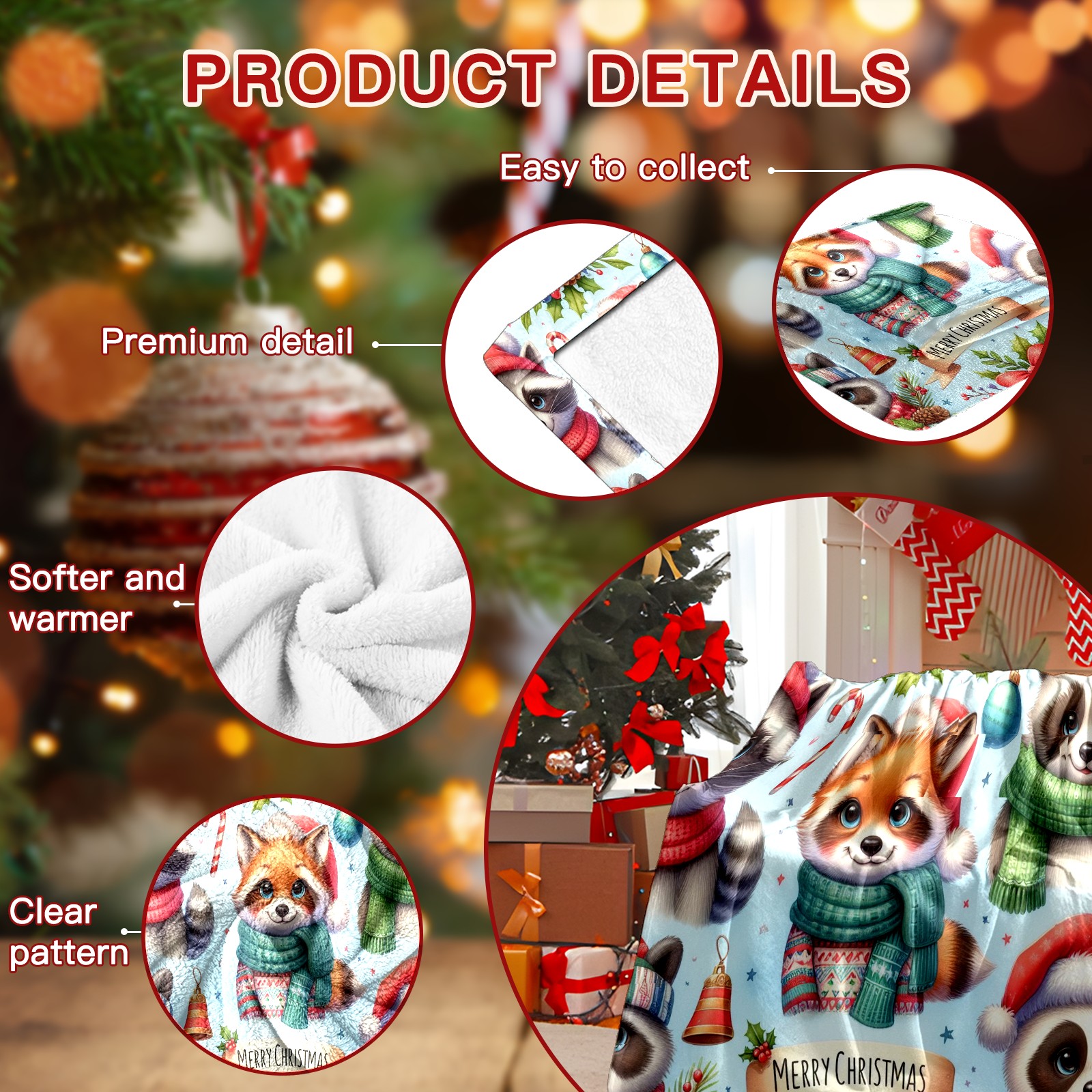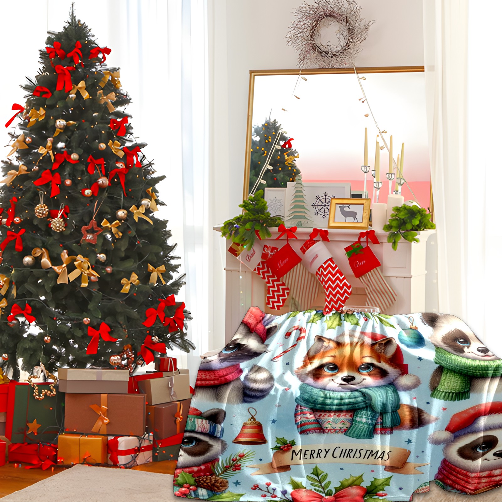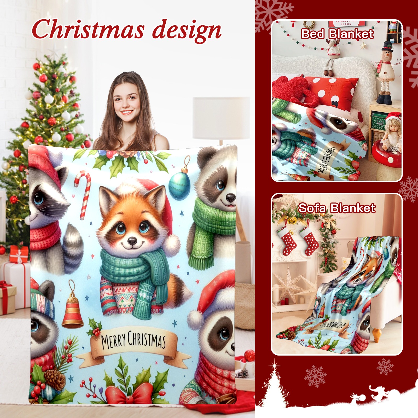 Премиальная фланелевая одеяло Light Blue Christmas Raccoon Fox Panda