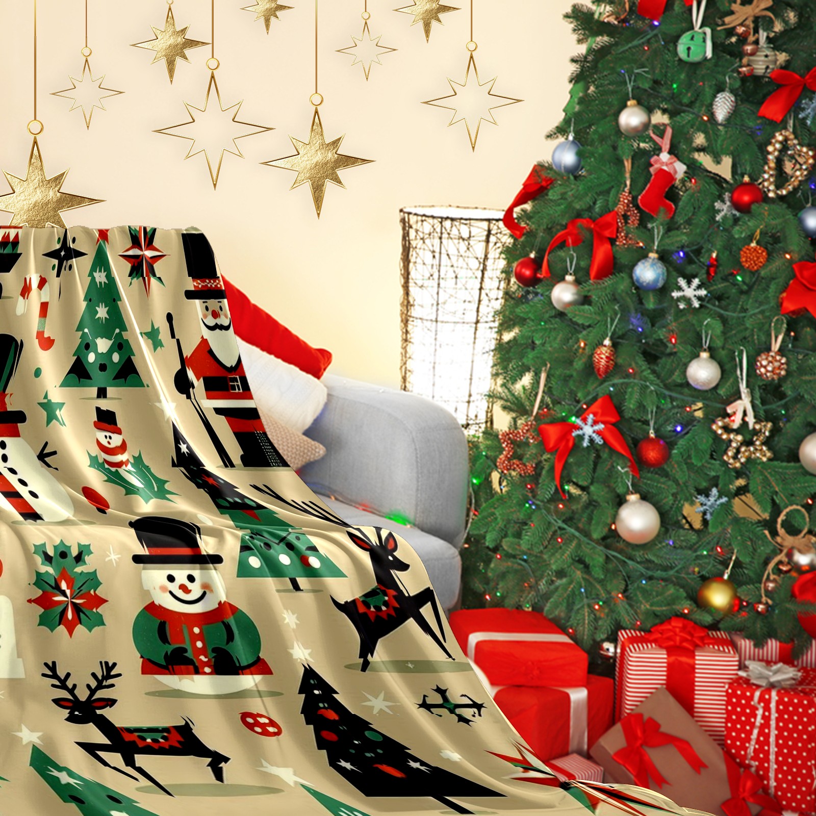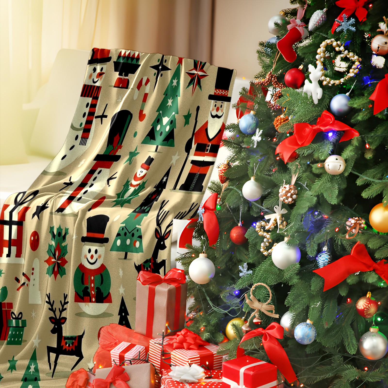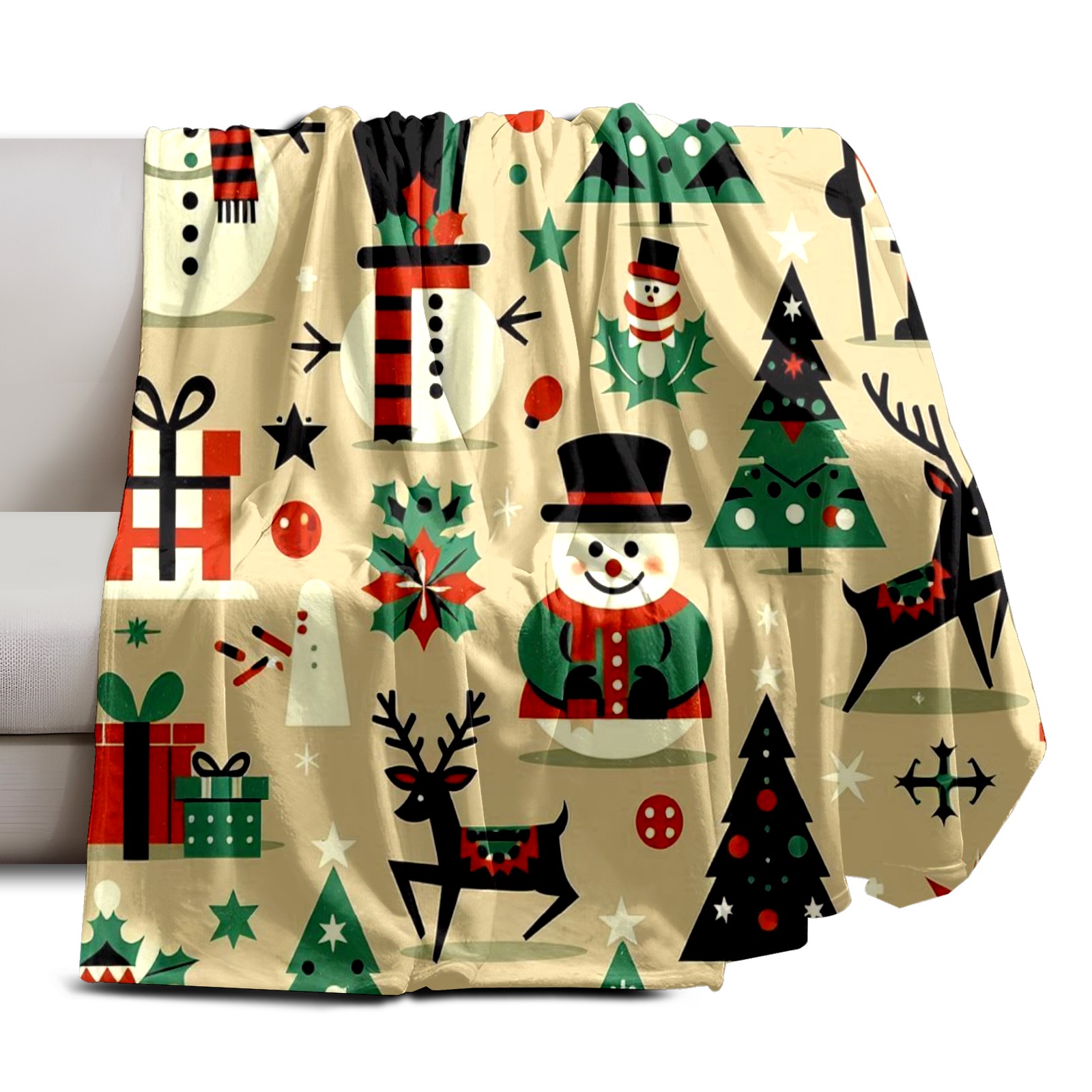 Премиальная фланелевая одеяло Beige Christmas Snowman Deer