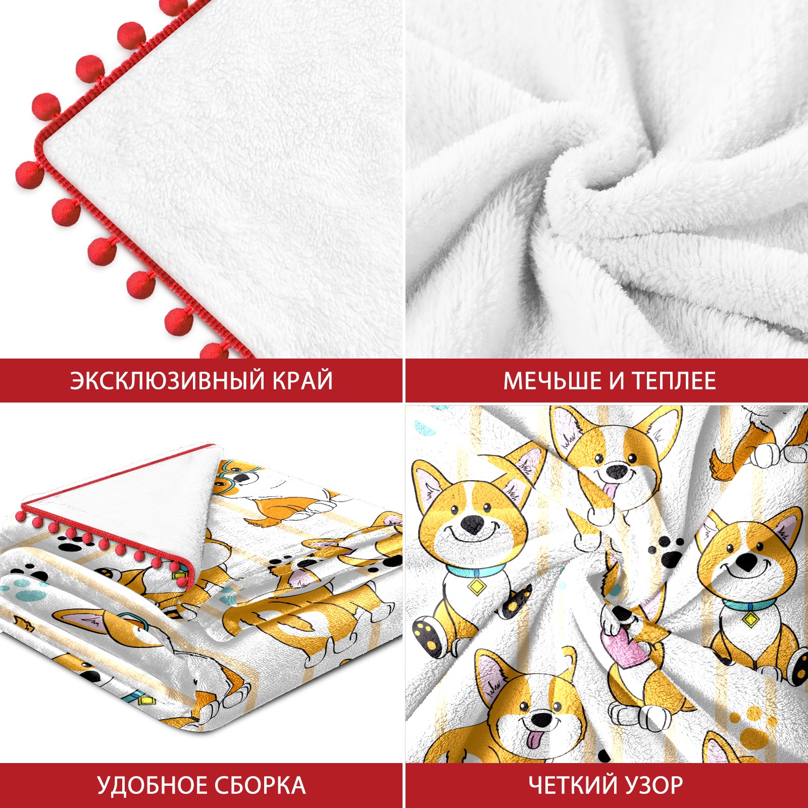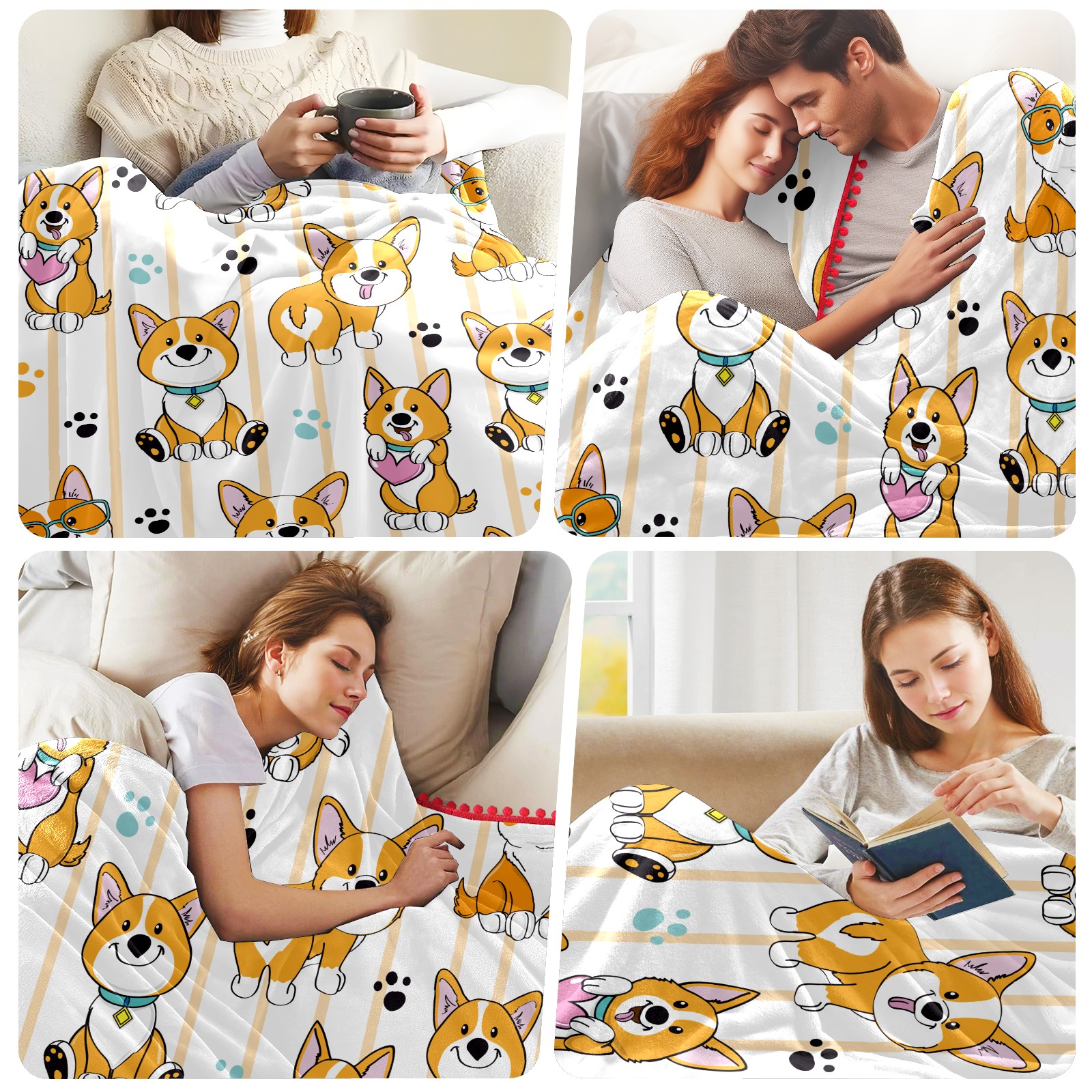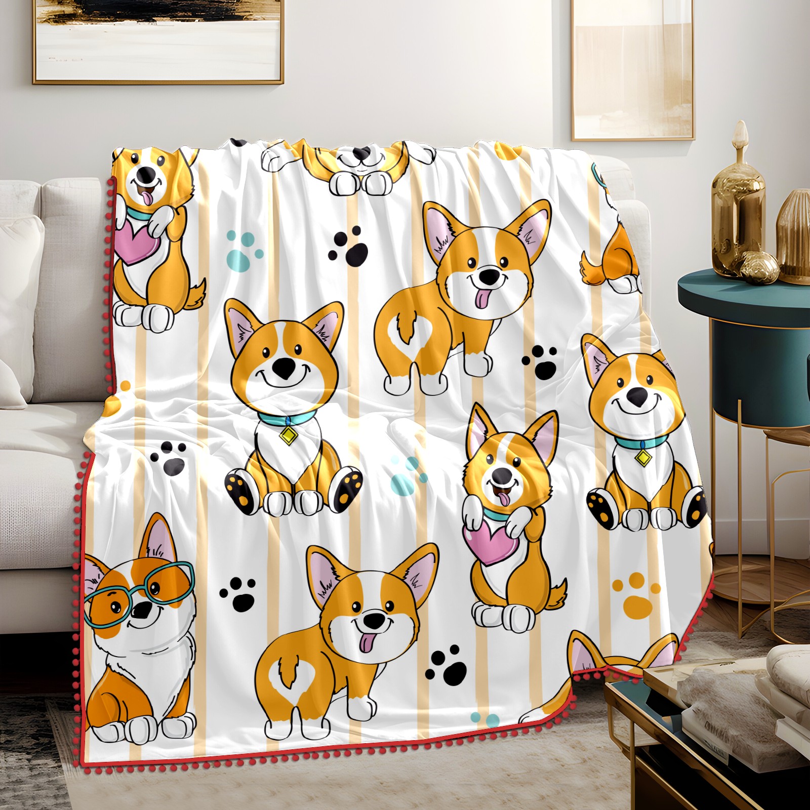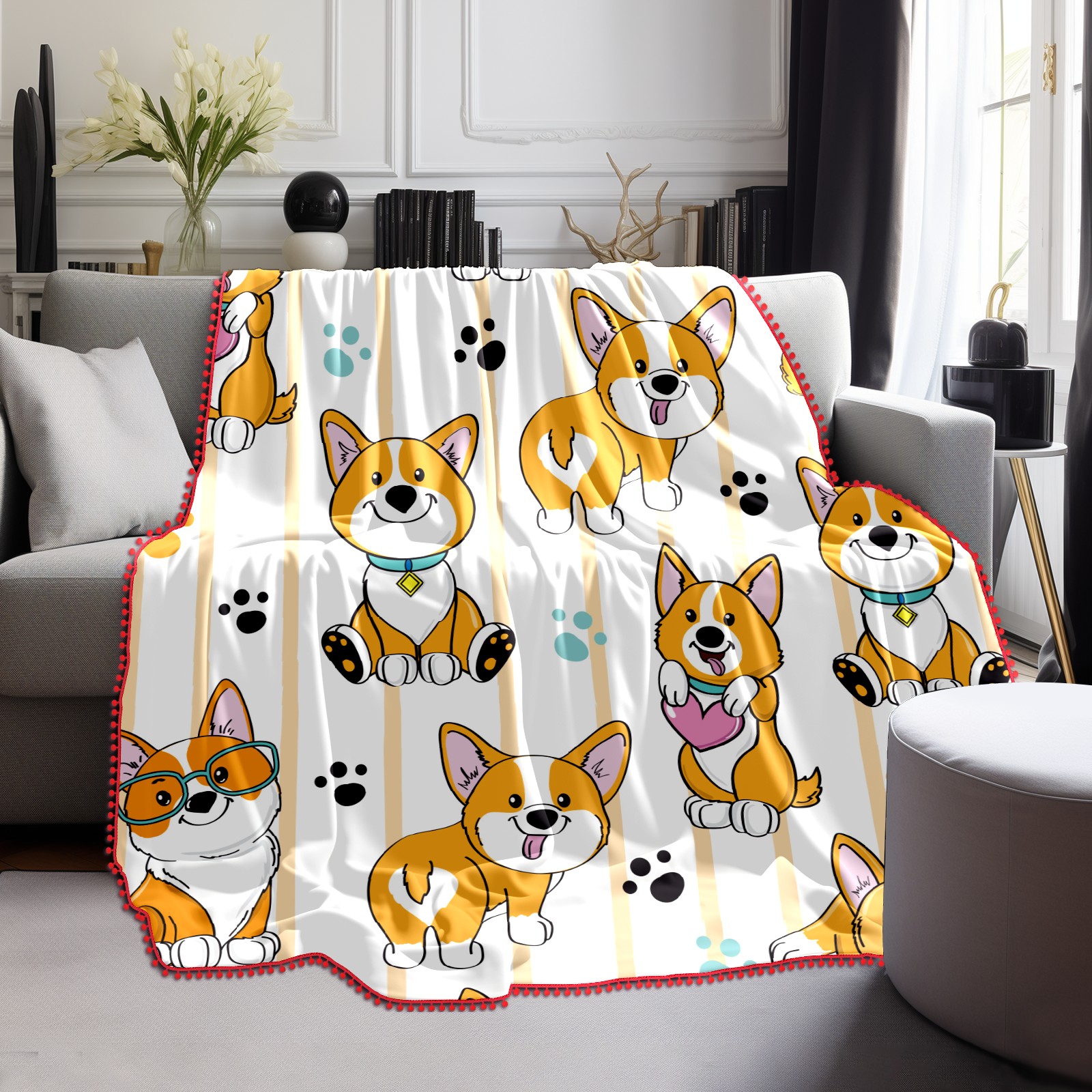 流苏毛毯 Corgi Dog Cute Paw Heart Stripe
