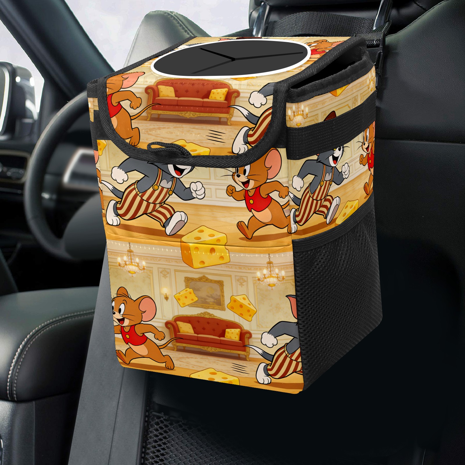 Car Trash Can with Lid, Small Portable Hanging Automotive Garbage Bin for Vehicles, Leakproof Waste Bag Container for SUV Truck Van Interior Auto Travel Road Trips(创作经典IP图 (185))