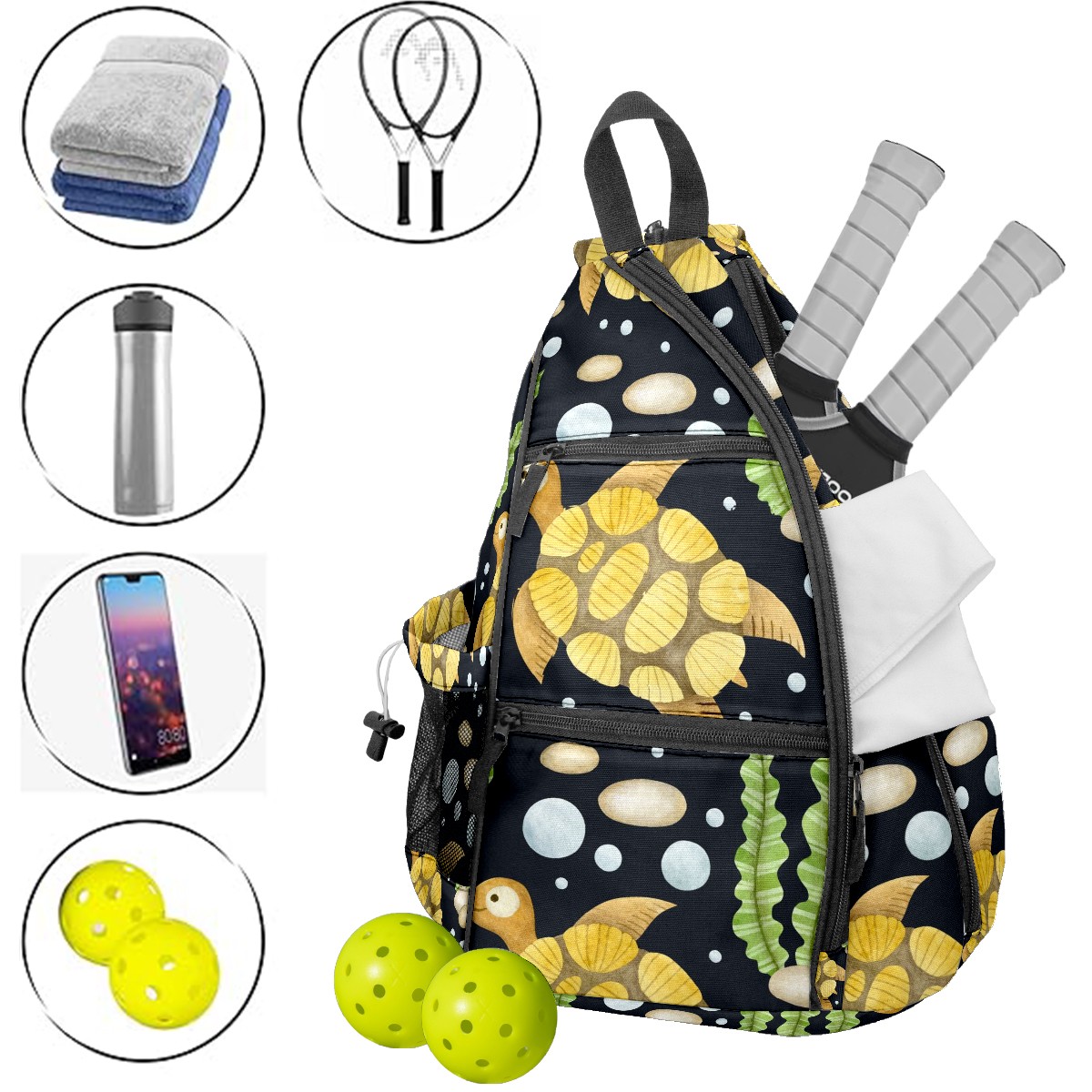 • ✅ Прочный материал Изготовлена из нейлоновой ткани + плетеного ремня + сетчатой корзины: гладкая на ощупь, приятная текстура, долговечная в использовании. ✅ Большой объем + много карманов Размер 153545см/6x13.8x17.7 дюймов, продуманная конструкция с несколькими карманами позволяет удобно разложить аксессуары для пикебола, не беспокоясь о нехватке места. ✅ Максимальный комфорт ношения Подушенное спинное отделение + регулируемые сетчатые плечевые ремни эффективно предотвращают растяжение мышц и боль в плечах, даже при длительном ношении. ✅ Универсальное использование Ремни выполнены по технологии съемного молния — регулируемый способ ношения. Подходит как повседневная поясная сумка для поездок, прогулок и других мероприятий, также является идеальным подарком для друзей и близких!