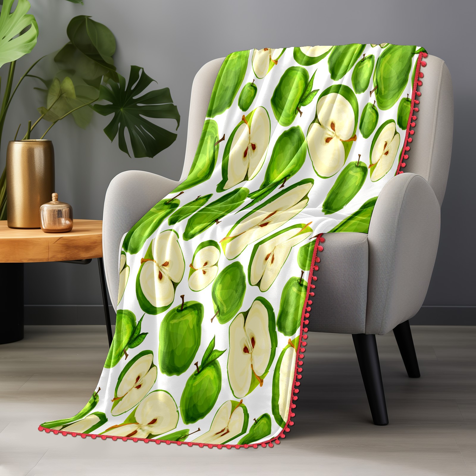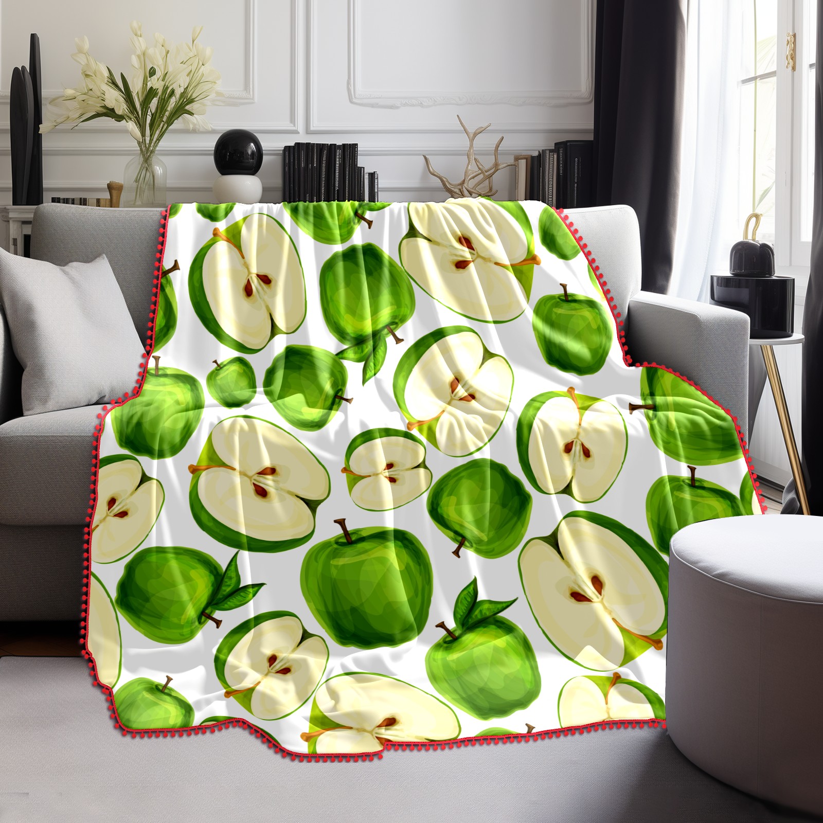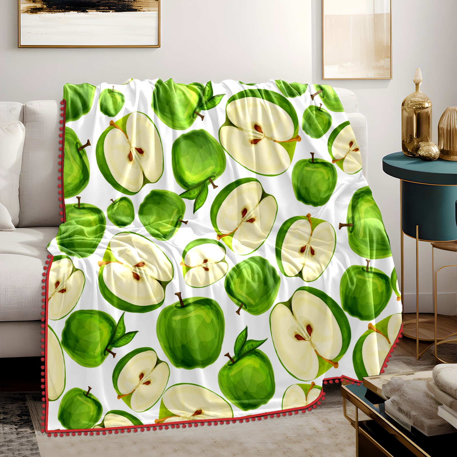 流苏毛毯 Green Apples Fruit Sliced Leaves
