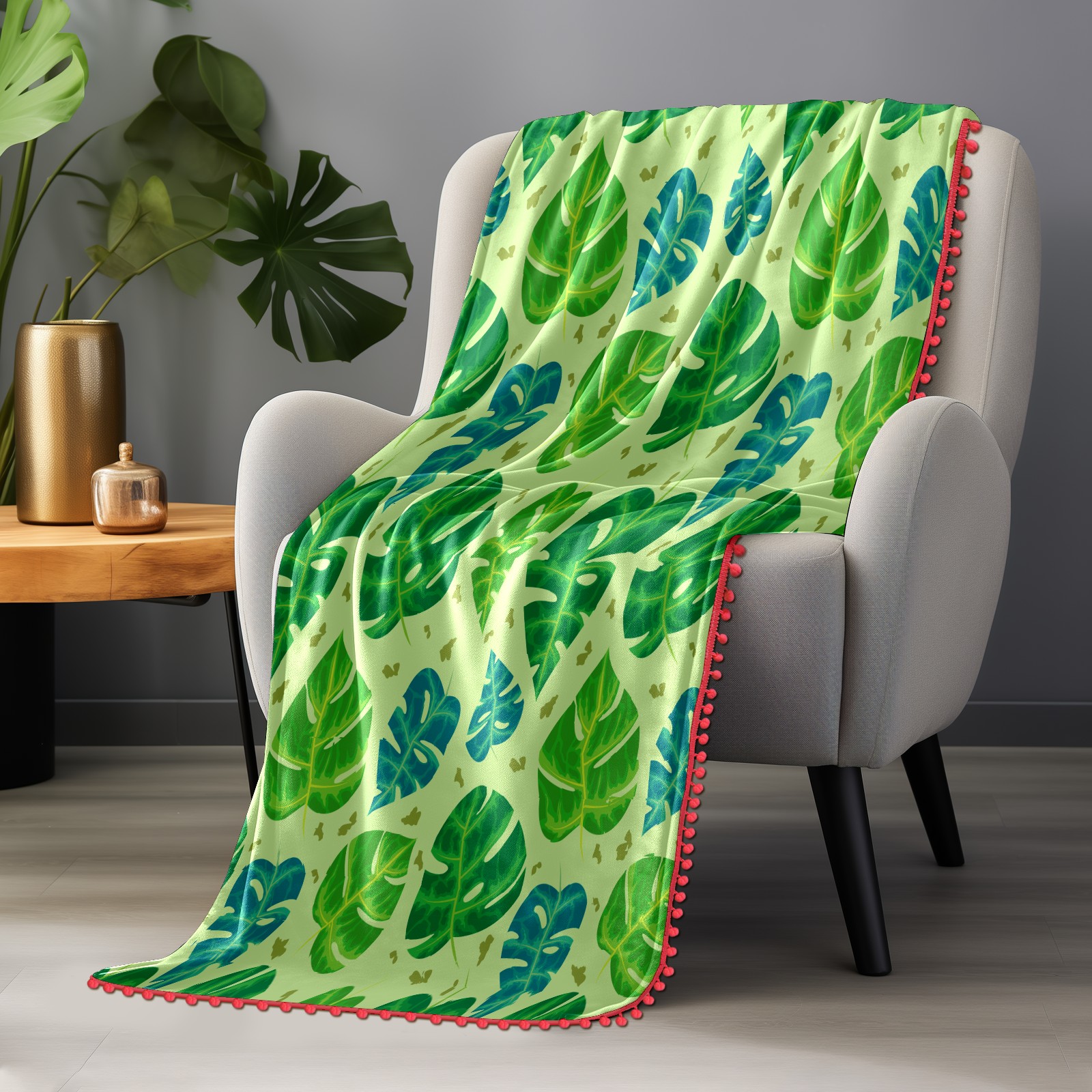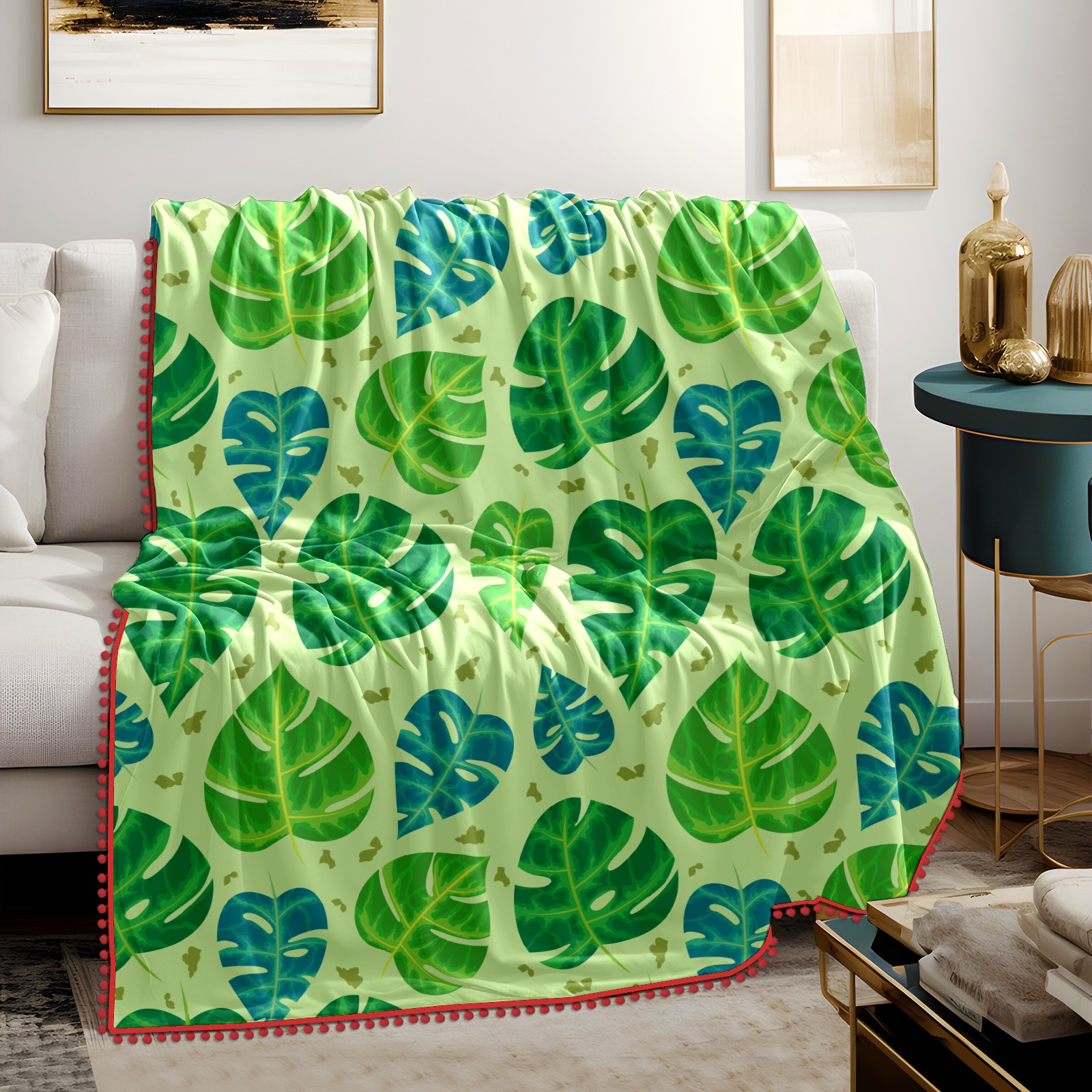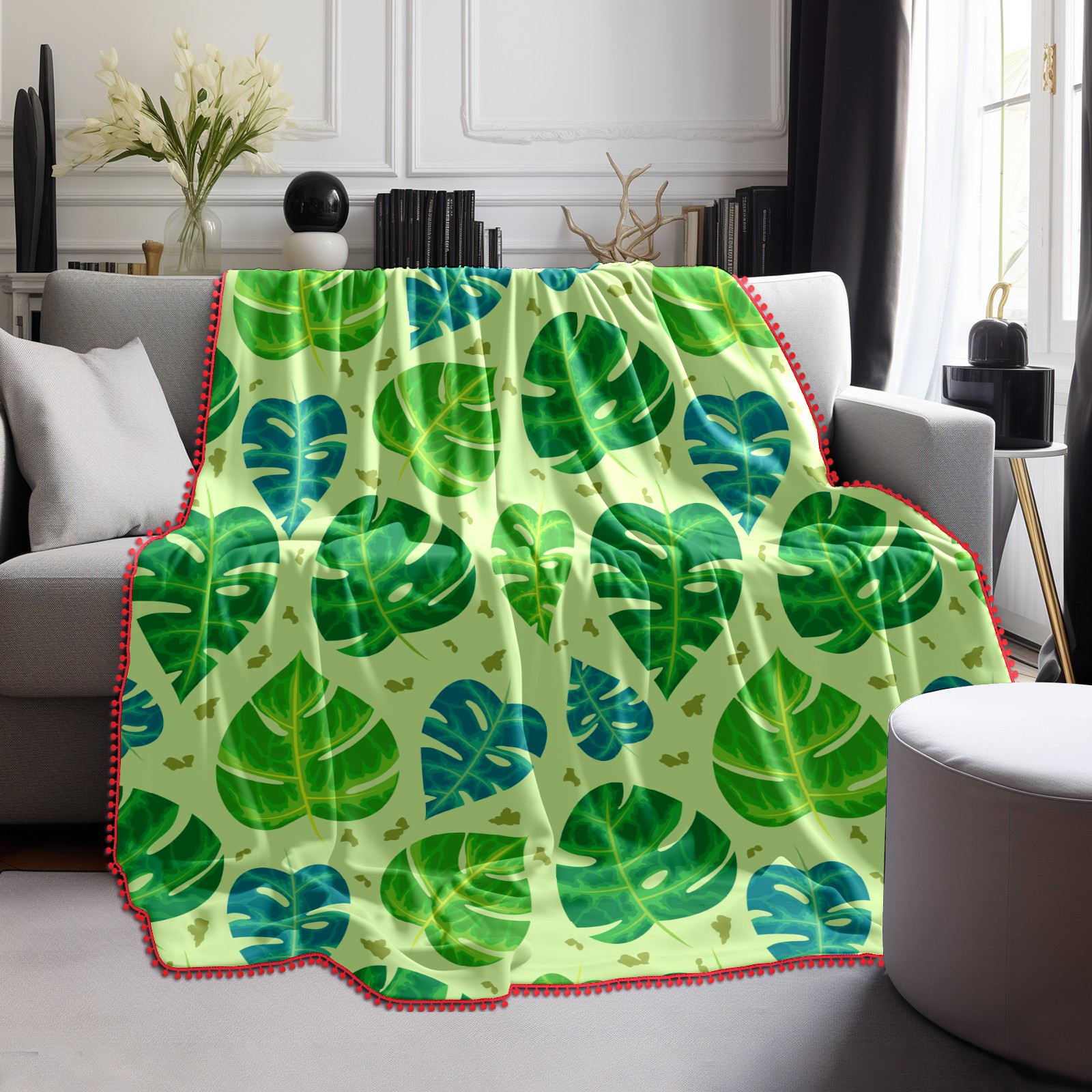 流苏毛毯 Green Blue Monstera Leaves Pattern